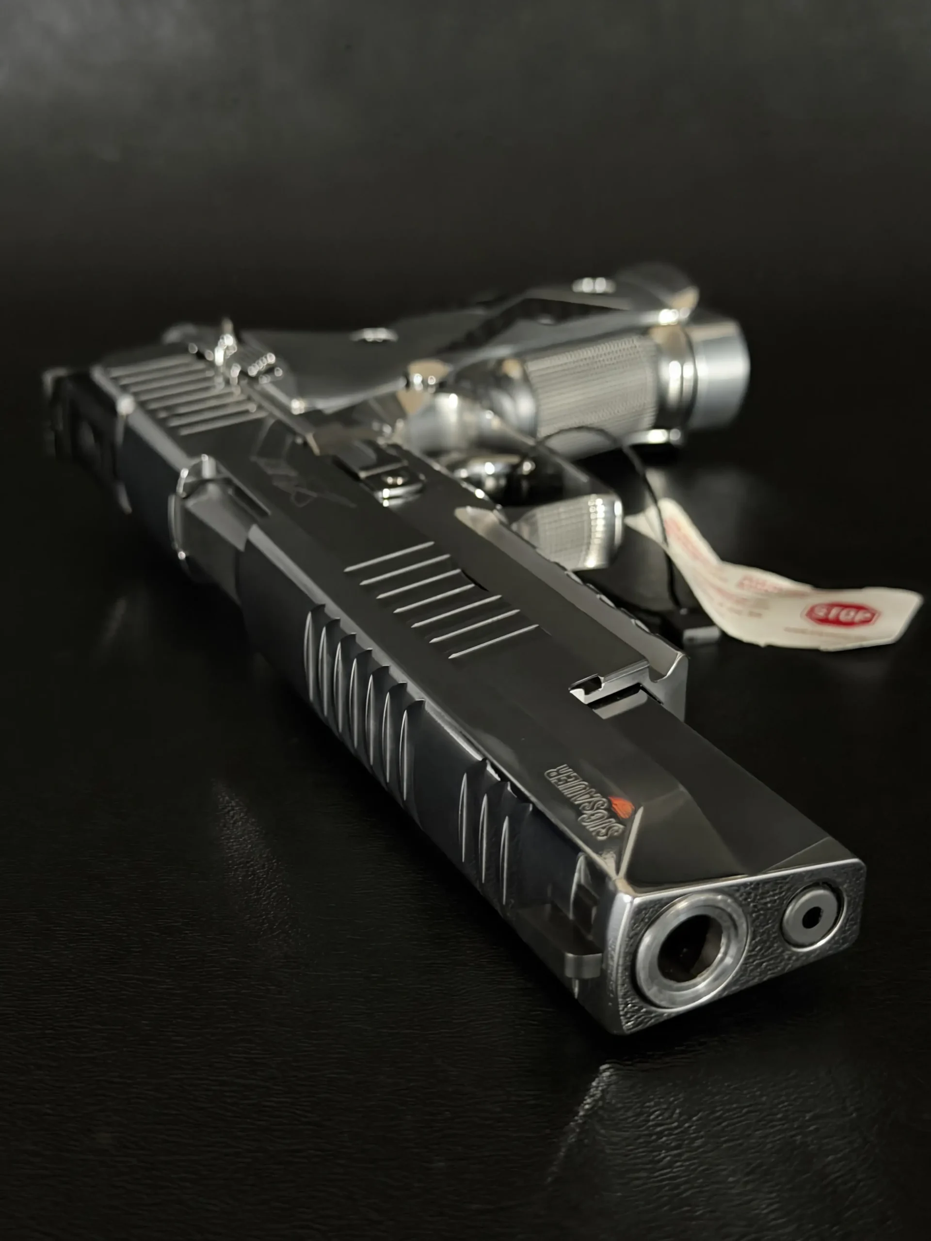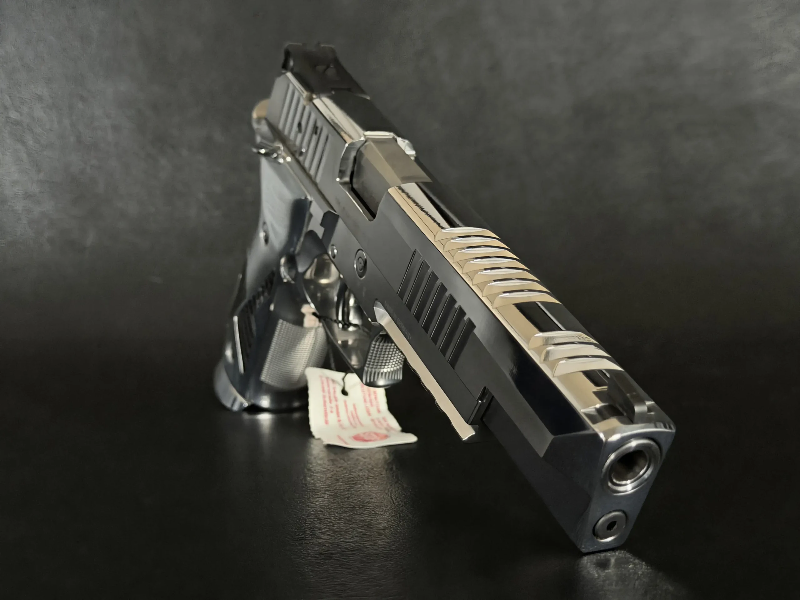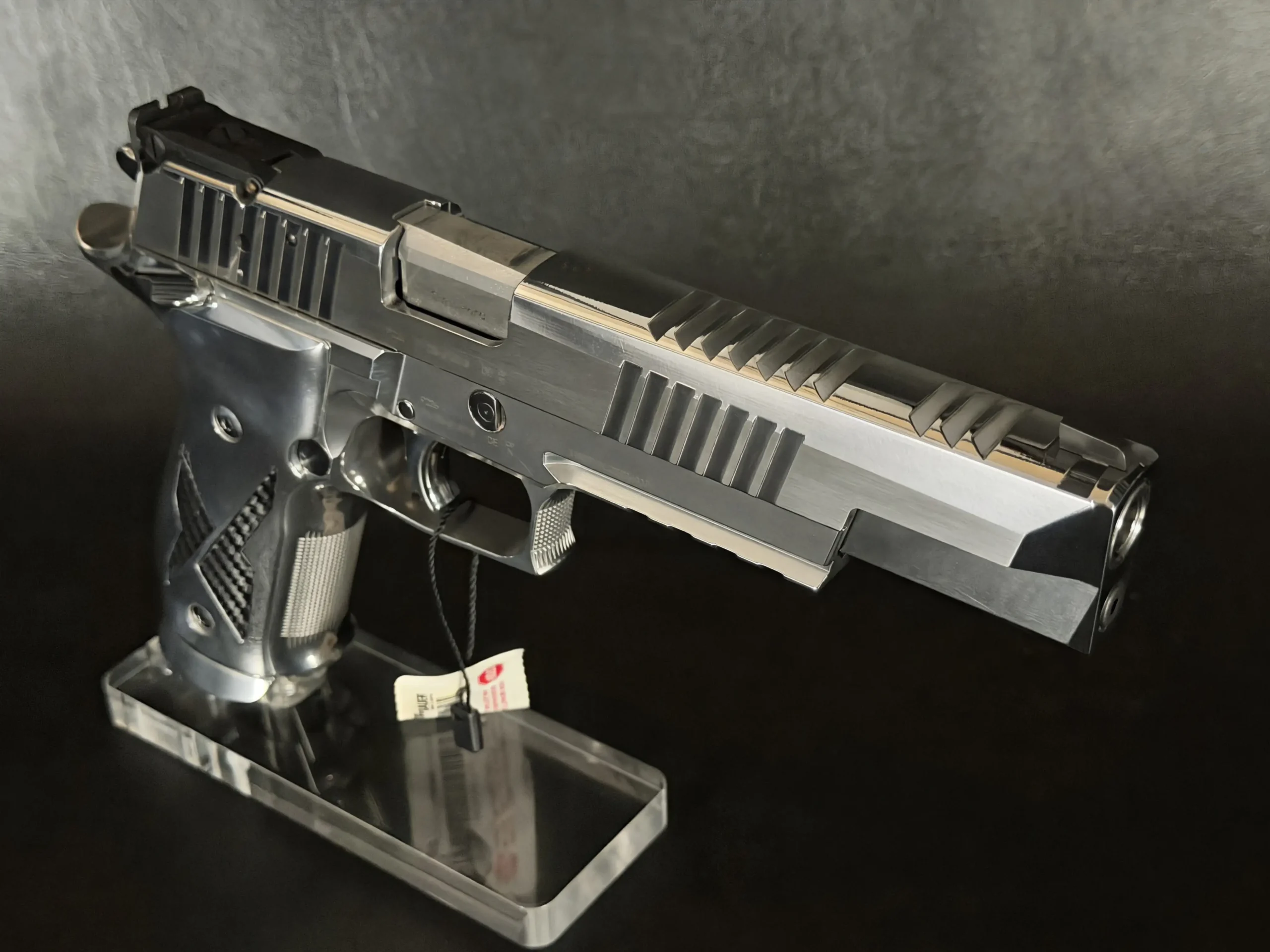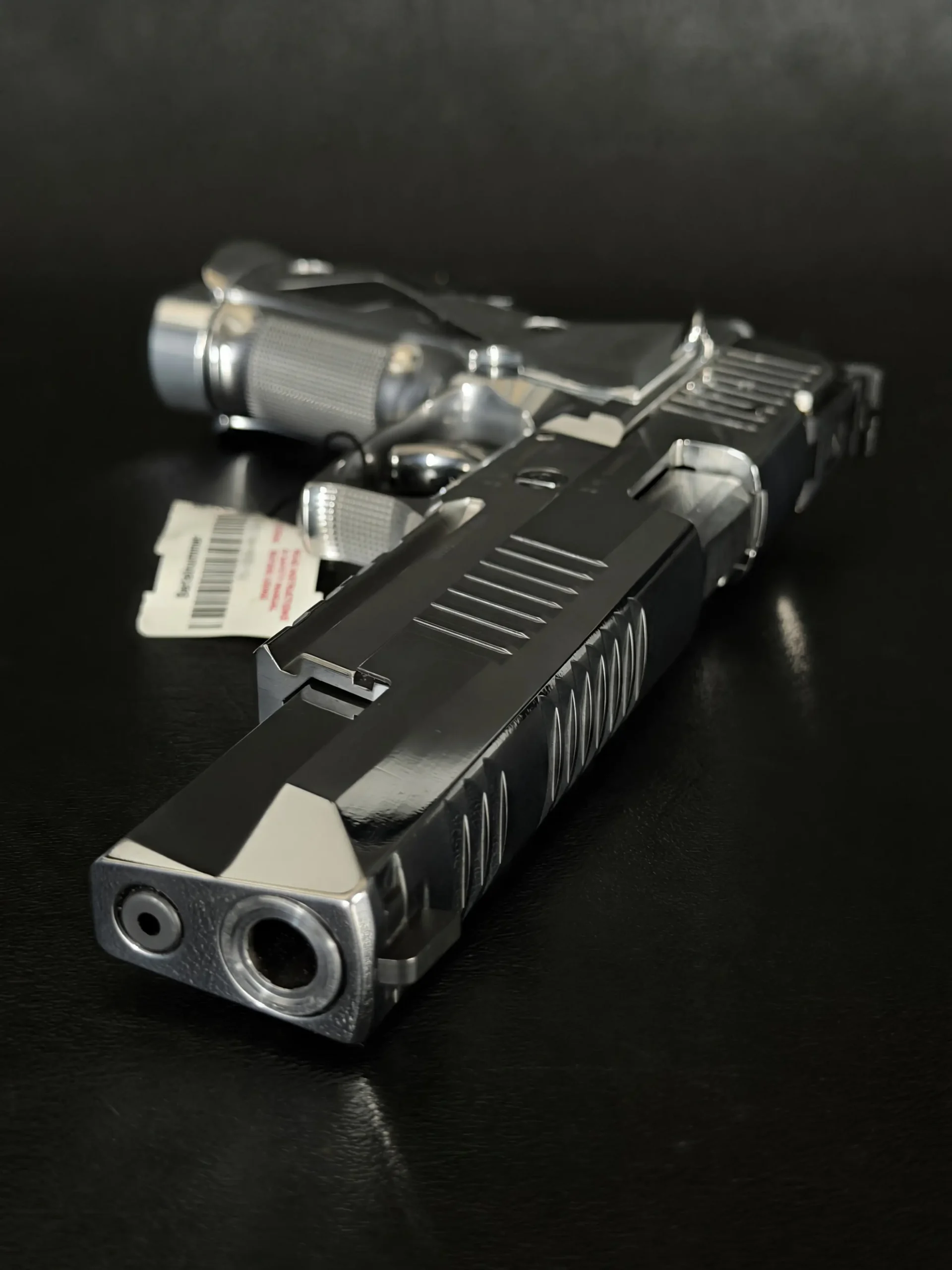 The polished chrome treatment gives the slide and frame a bright, high-contrast appearance, while the extended slide, precision-cut serrations, and full-length dust cover define the pistol’s long, balanced profile. Clean branding and restrained lines keep the overall presentation focused and cohesive.