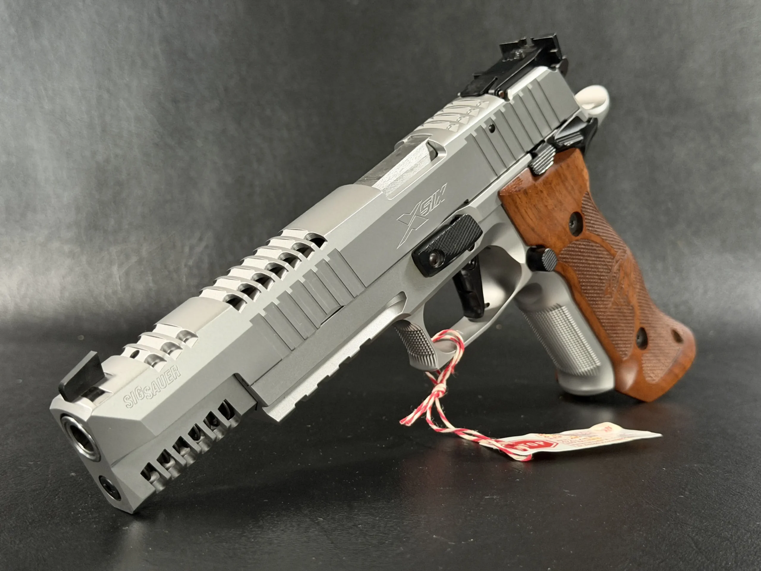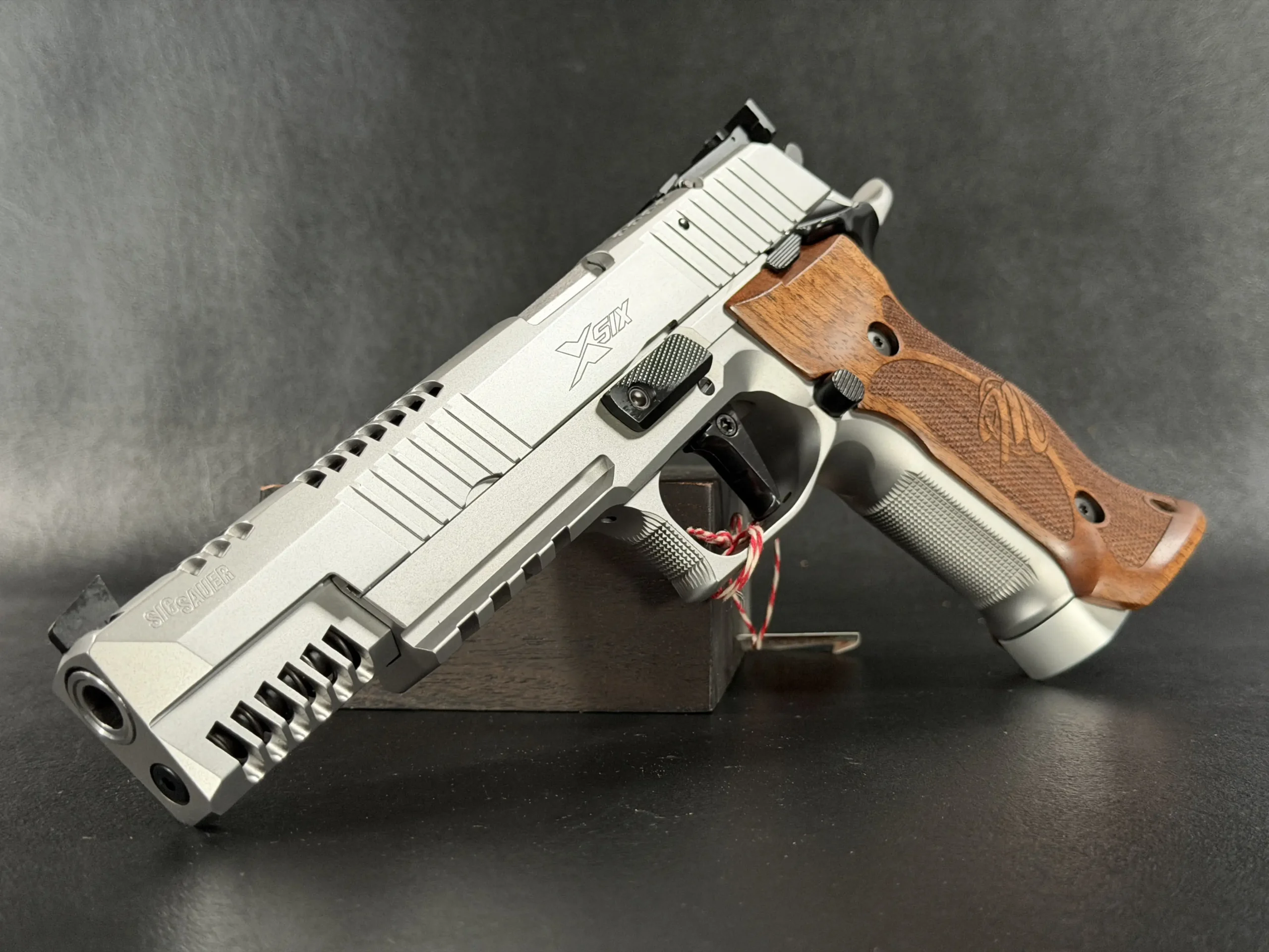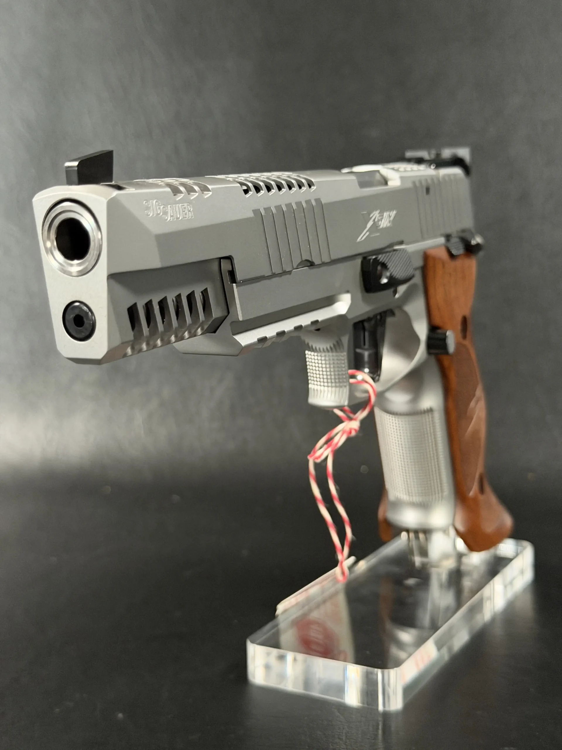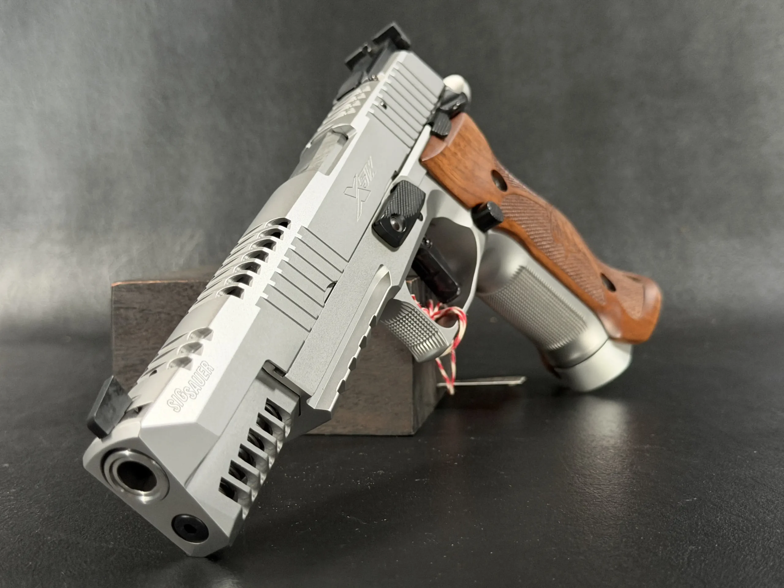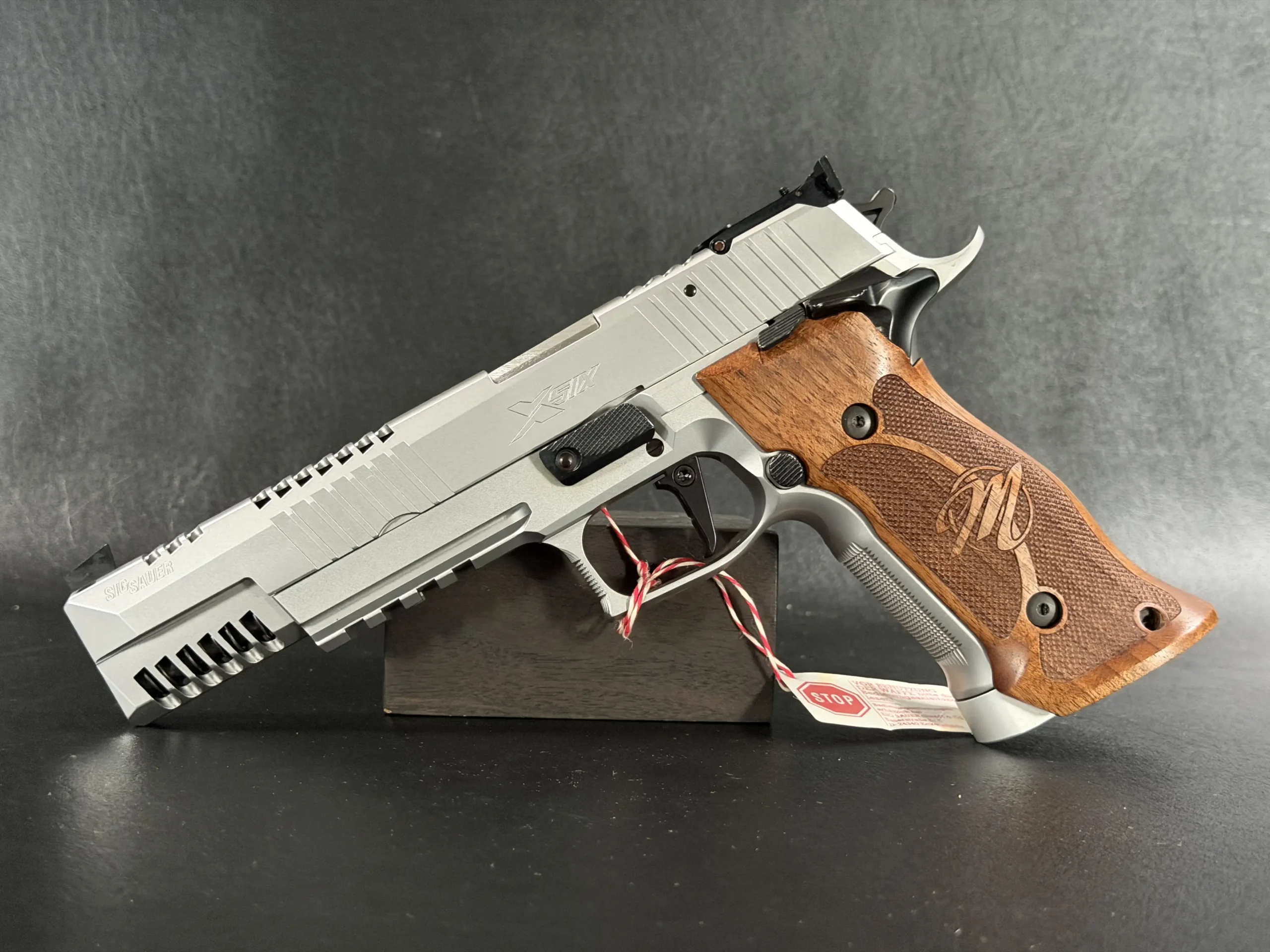 This example also features sculpted ergonomic wood grips, aggressive front-strap checkering, and a flared magazine well for secure, confident handling. Hallmark X-Series details include a smooth trigger pull and tight slide-to-frame fit, giving the pistol a highly refined feel in hand.