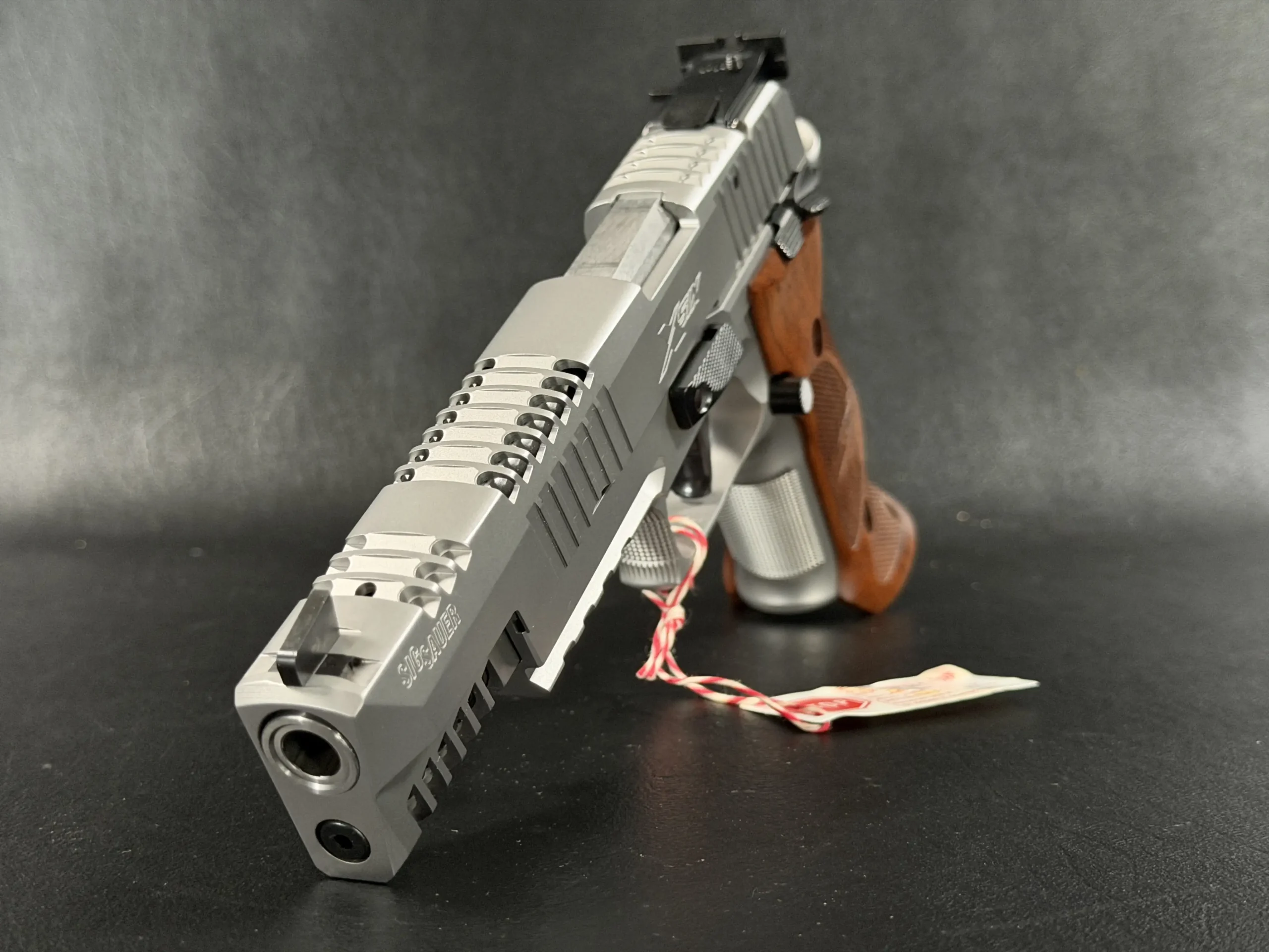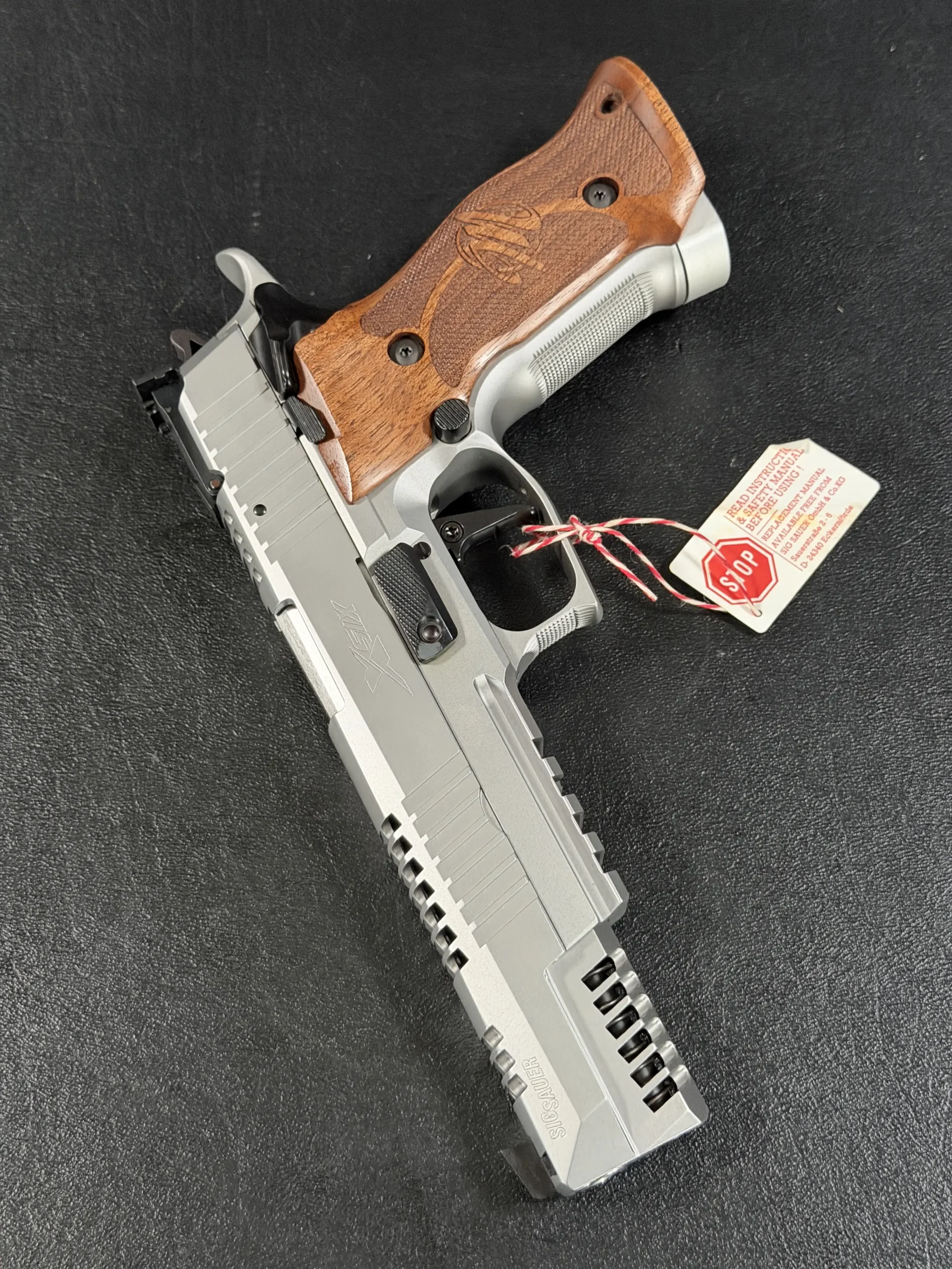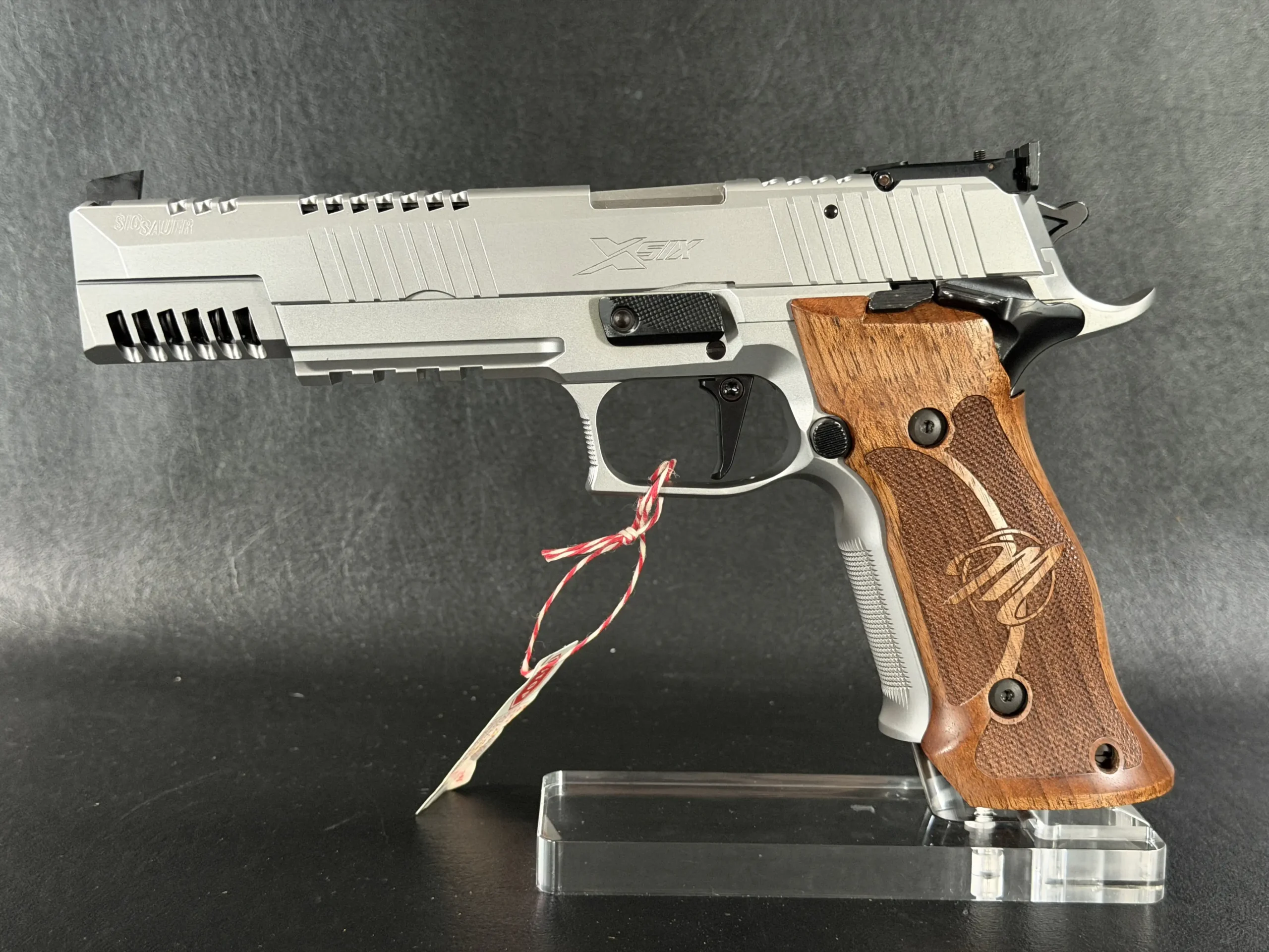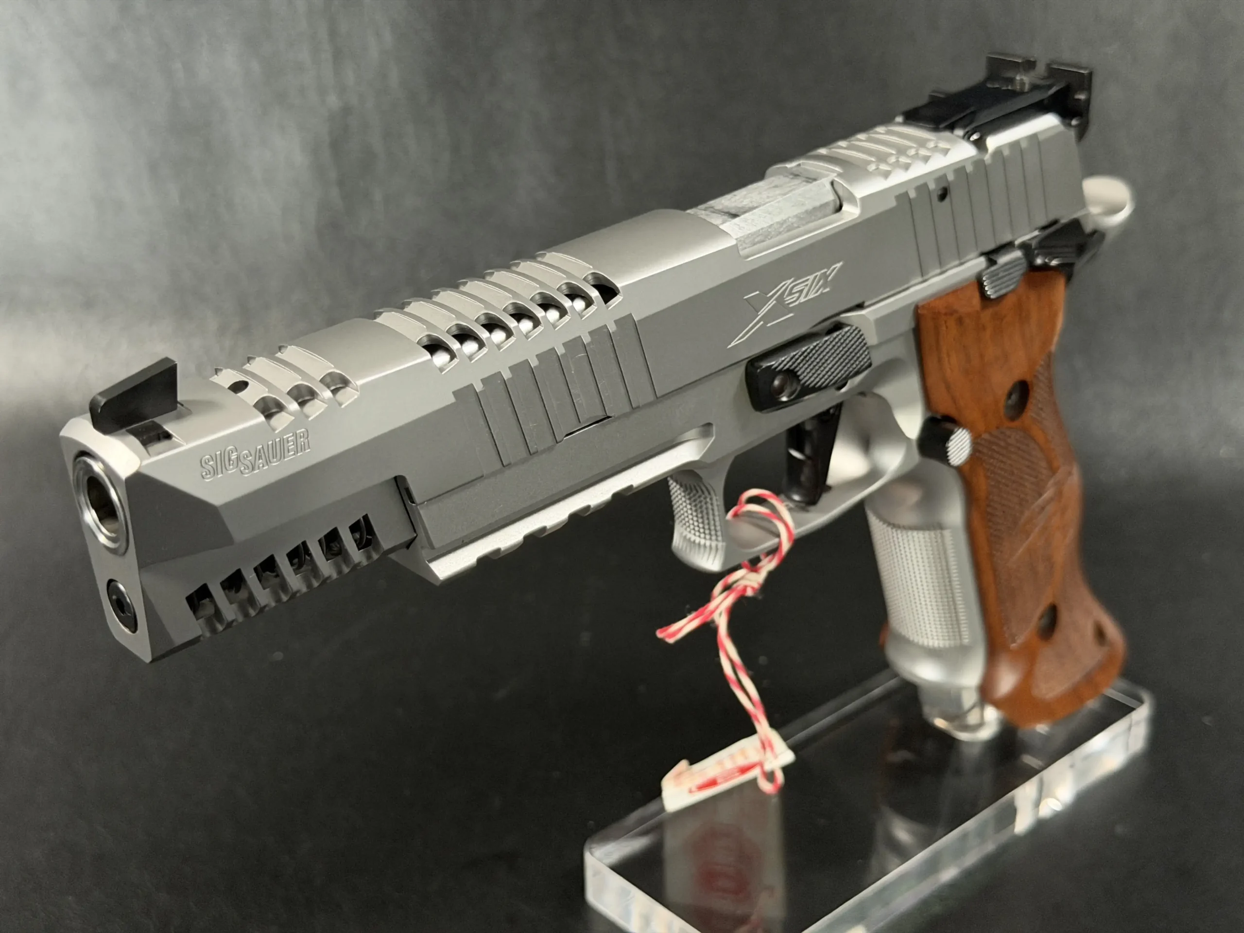This example also features sculpted ergonomic wood grips, aggressive front-strap checkering, and a flared magazine well for secure, confident handling. Hallmark X-Series details include a smooth trigger pull and tight slide-to-frame fit, giving the pistol a highly refined feel in hand.