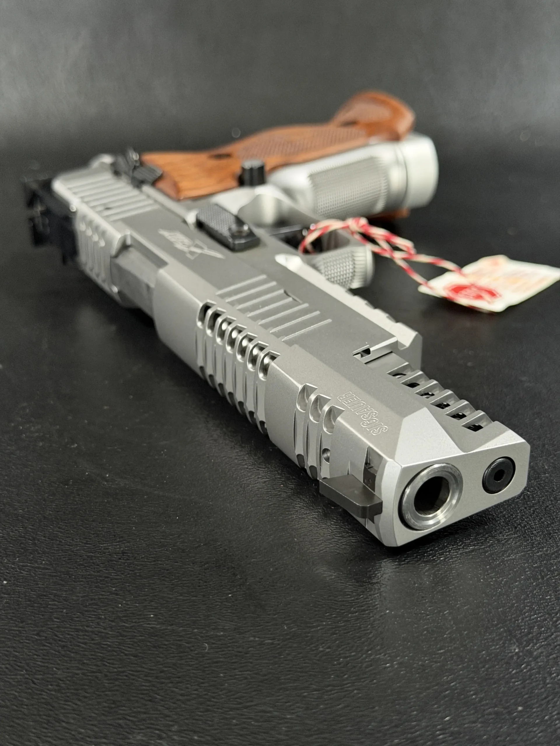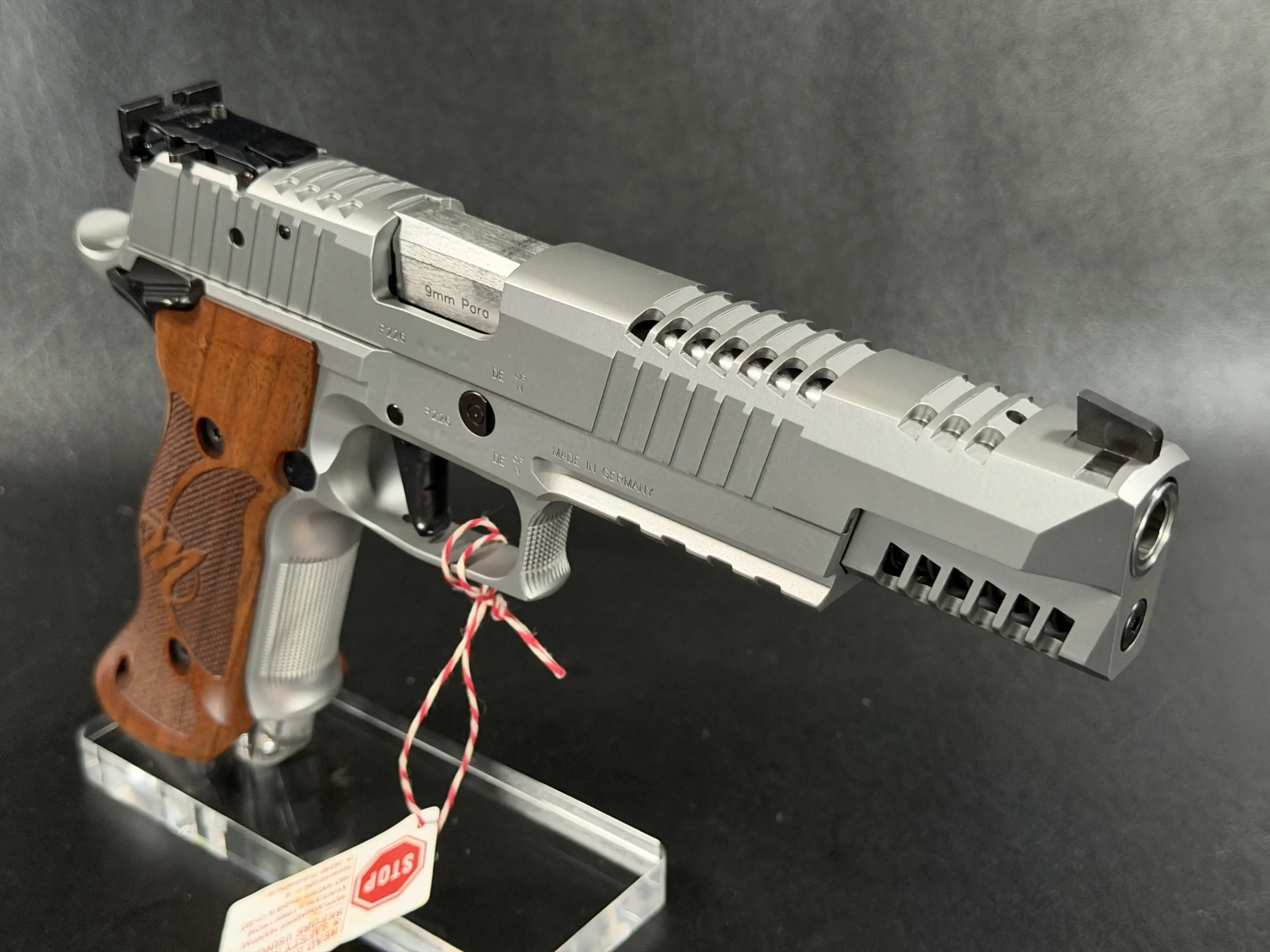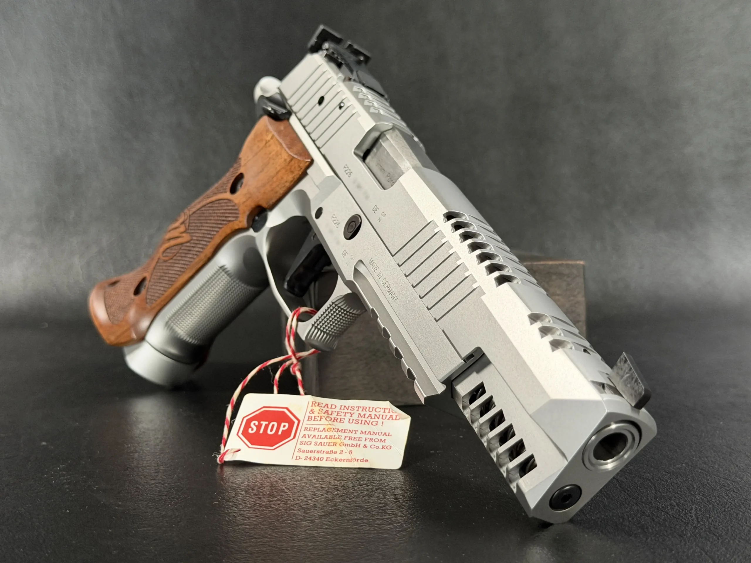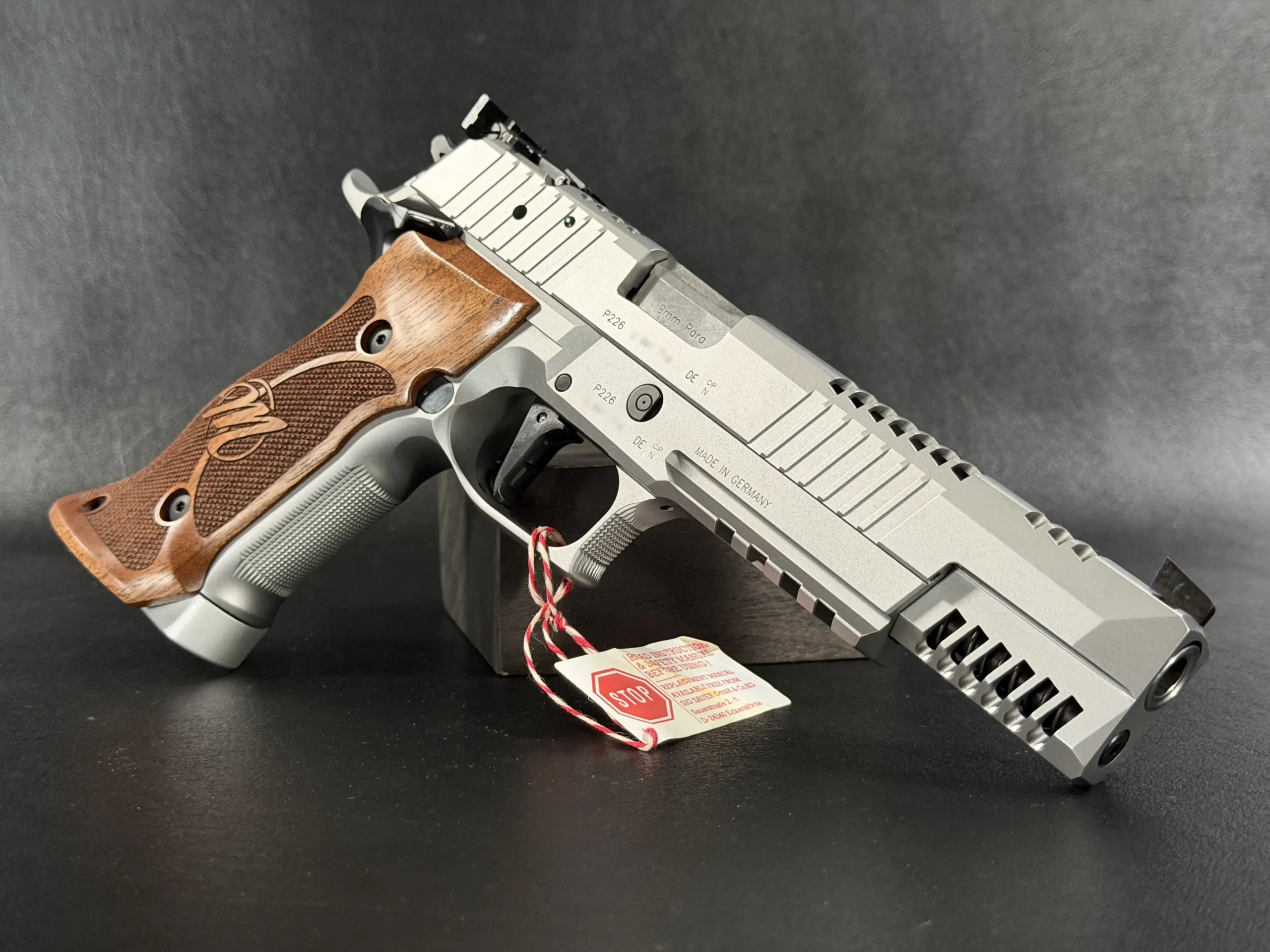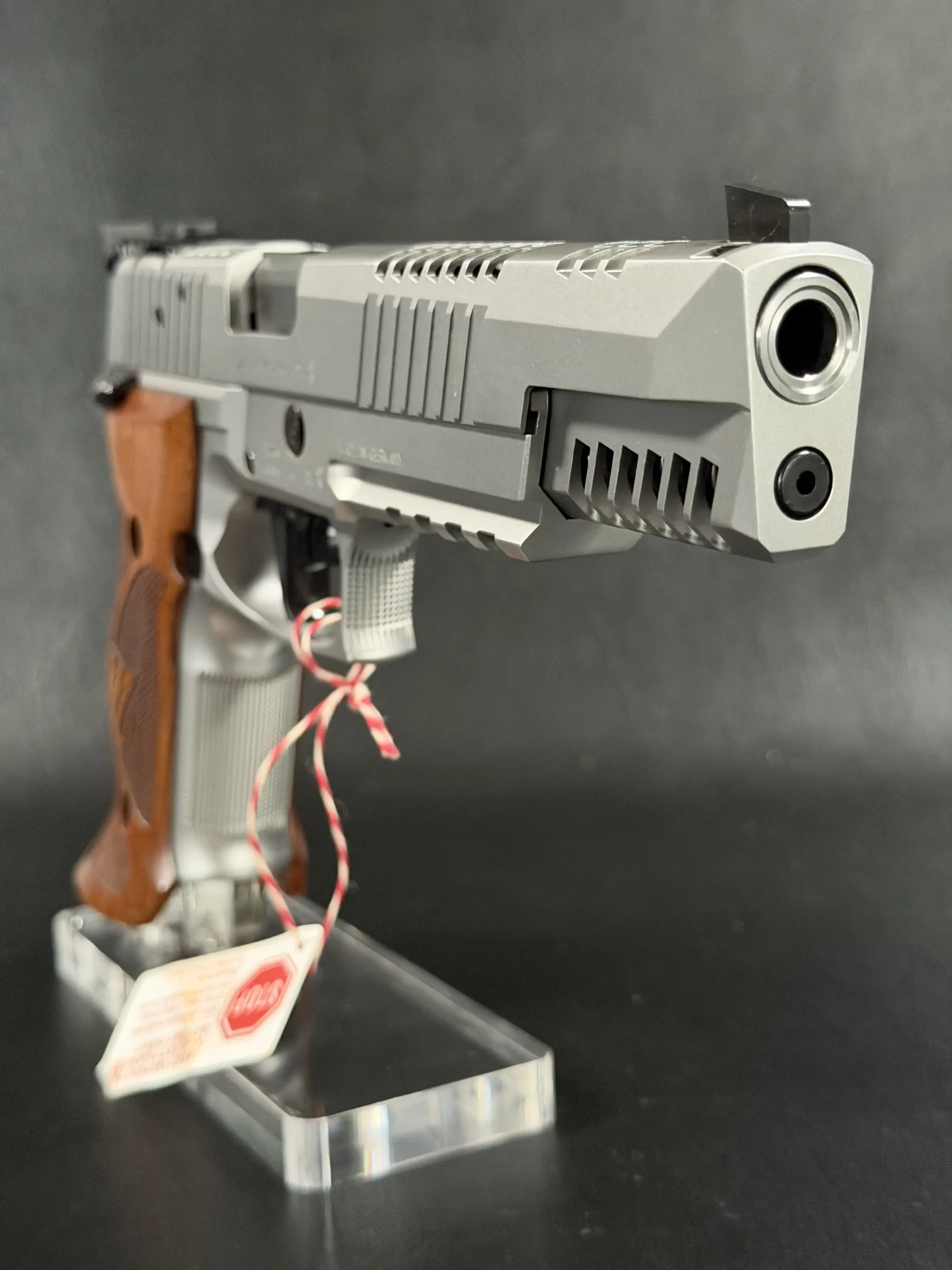 This example also features sculpted ergonomic wood grips, aggressive front-strap checkering, and a flared magazine well for secure, confident handling. Hallmark X-Series details include a smooth trigger pull and tight slide-to-frame fit, giving the pistol a highly refined feel in hand.