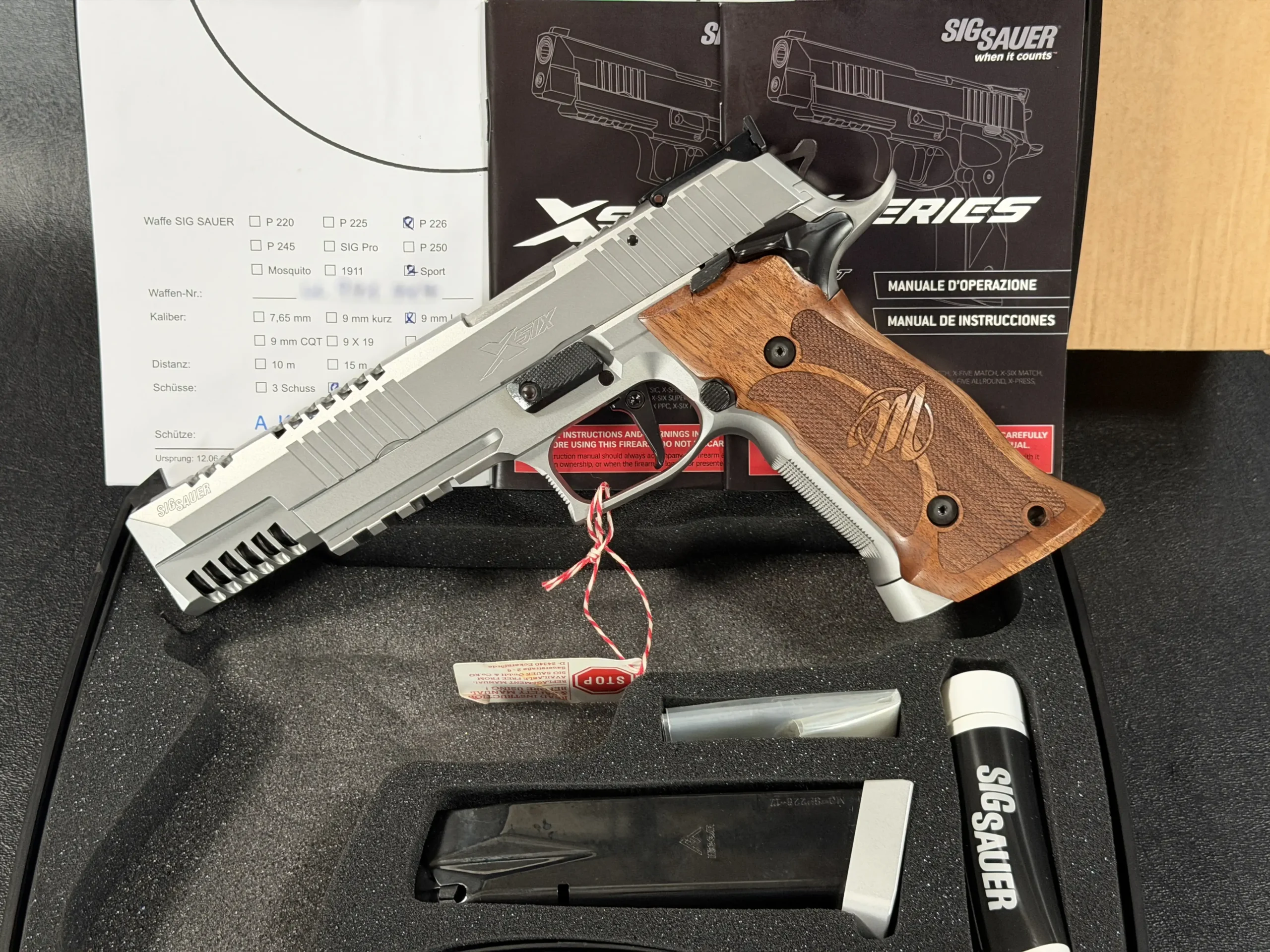 All major components display matching factory markings, reinforcing the pistol’s original configuration. Overall, the P226 X-Six PPC Skeleton presents as a thoughtfully executed target model with the distinctive fit, finish, and design language associated with German-made SIG Sauer X-Series pistols.