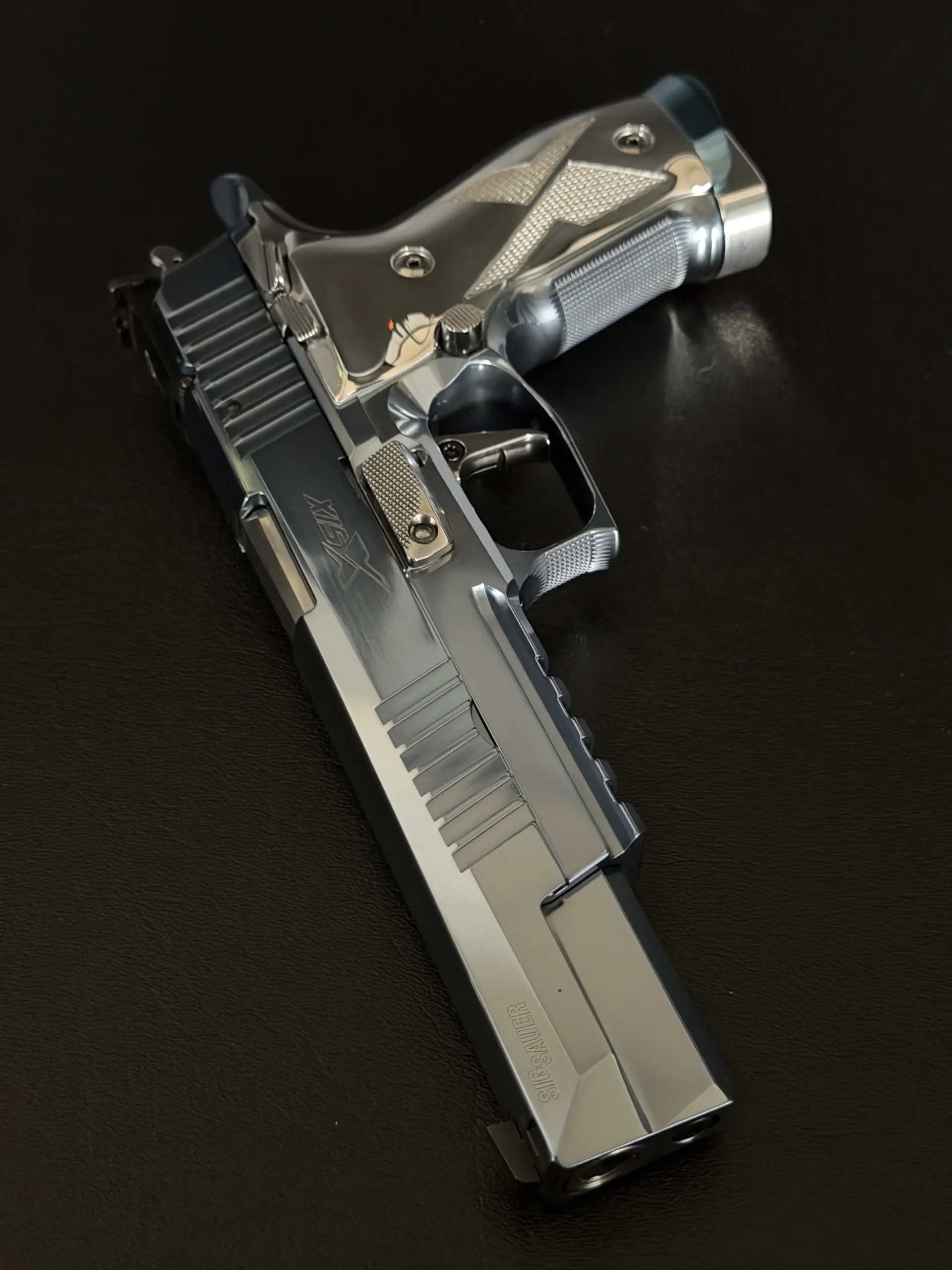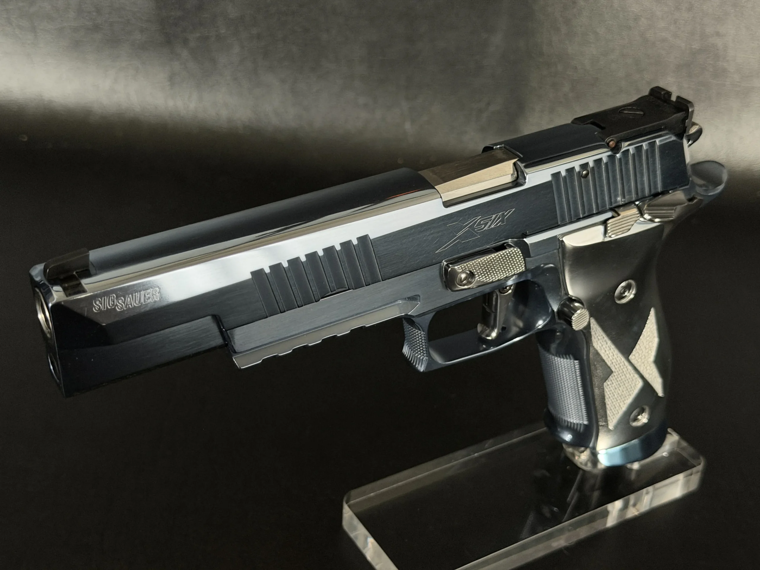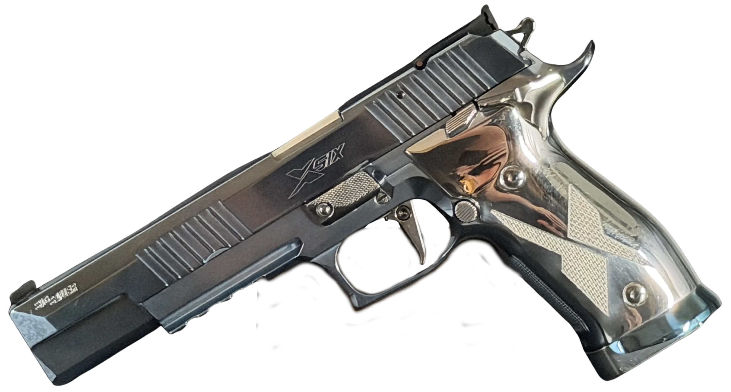 The overall presentation emphasizes careful machining, balanced proportions, and a unified appearance across the pistol’s controls and components. With its long-slide format, full-steel construction, and Super Match styling, this P226 X-Six offers a distinctive interpretation of a competition-oriented SIG Sauer design.