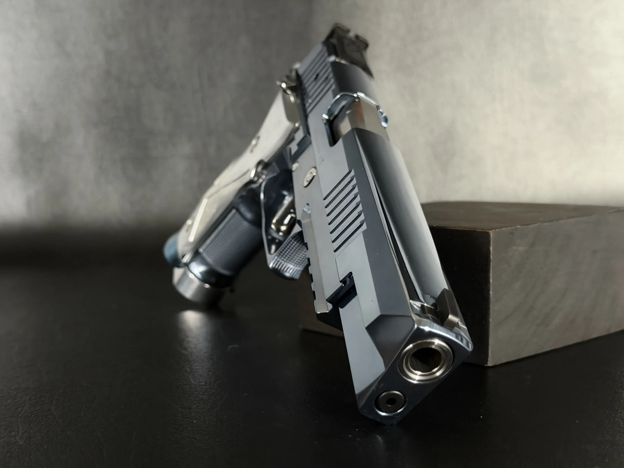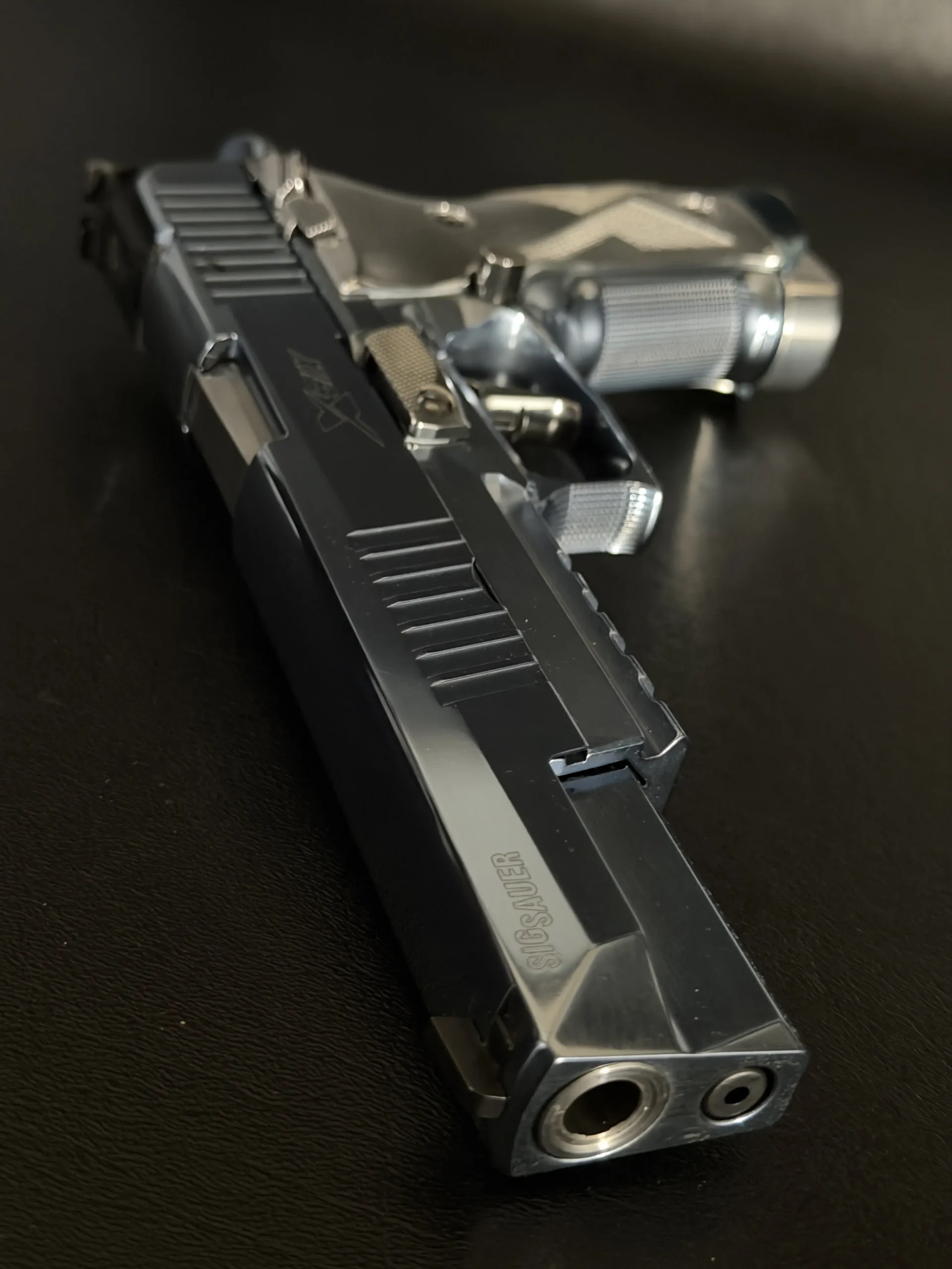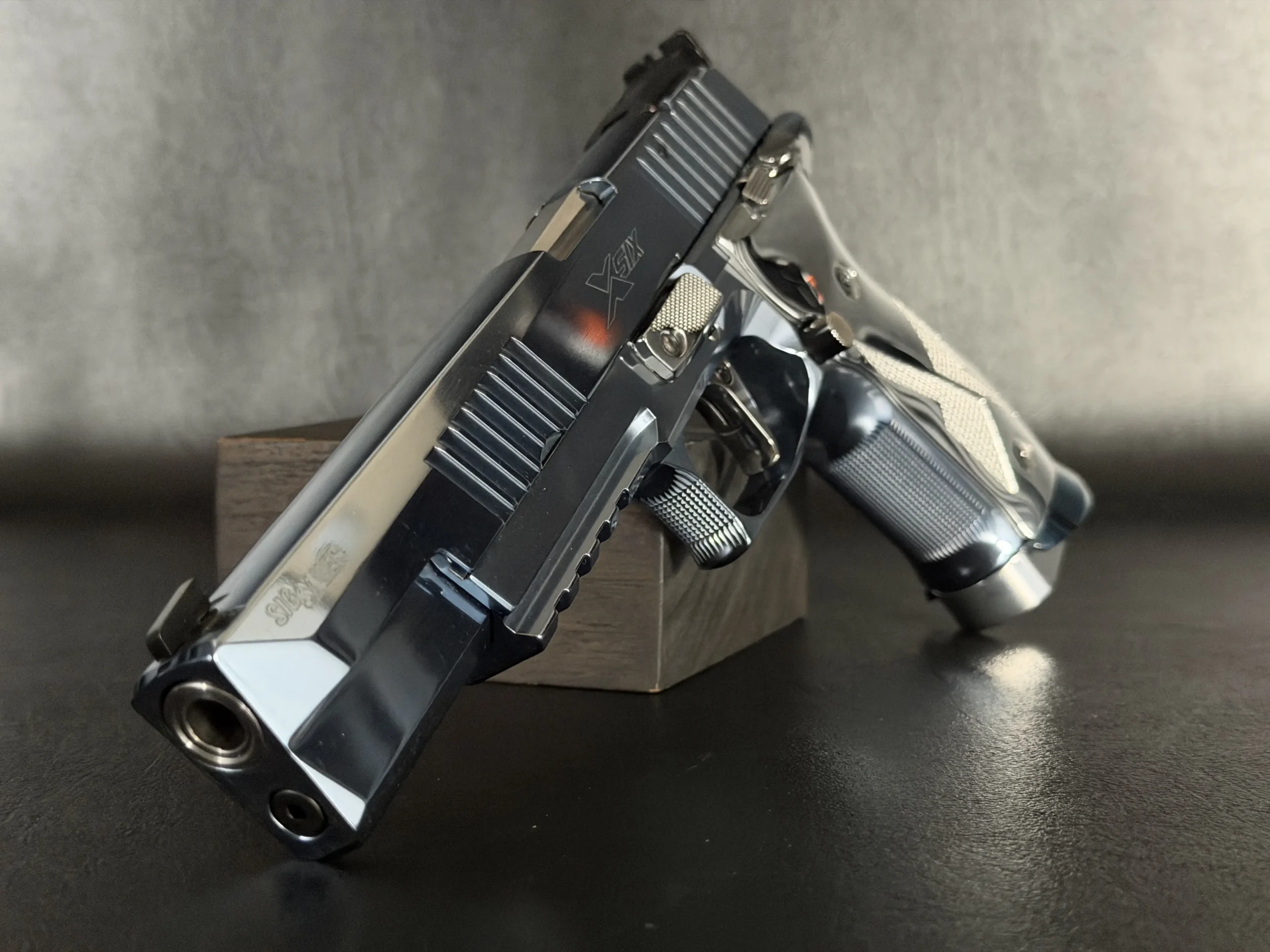 The overall presentation emphasizes careful machining, balanced proportions, and a unified appearance across the pistol’s controls and components. With its long-slide format, full-steel construction, and Super Match styling, this P226 X-Six offers a distinctive interpretation of a competition-oriented SIG Sauer design.
