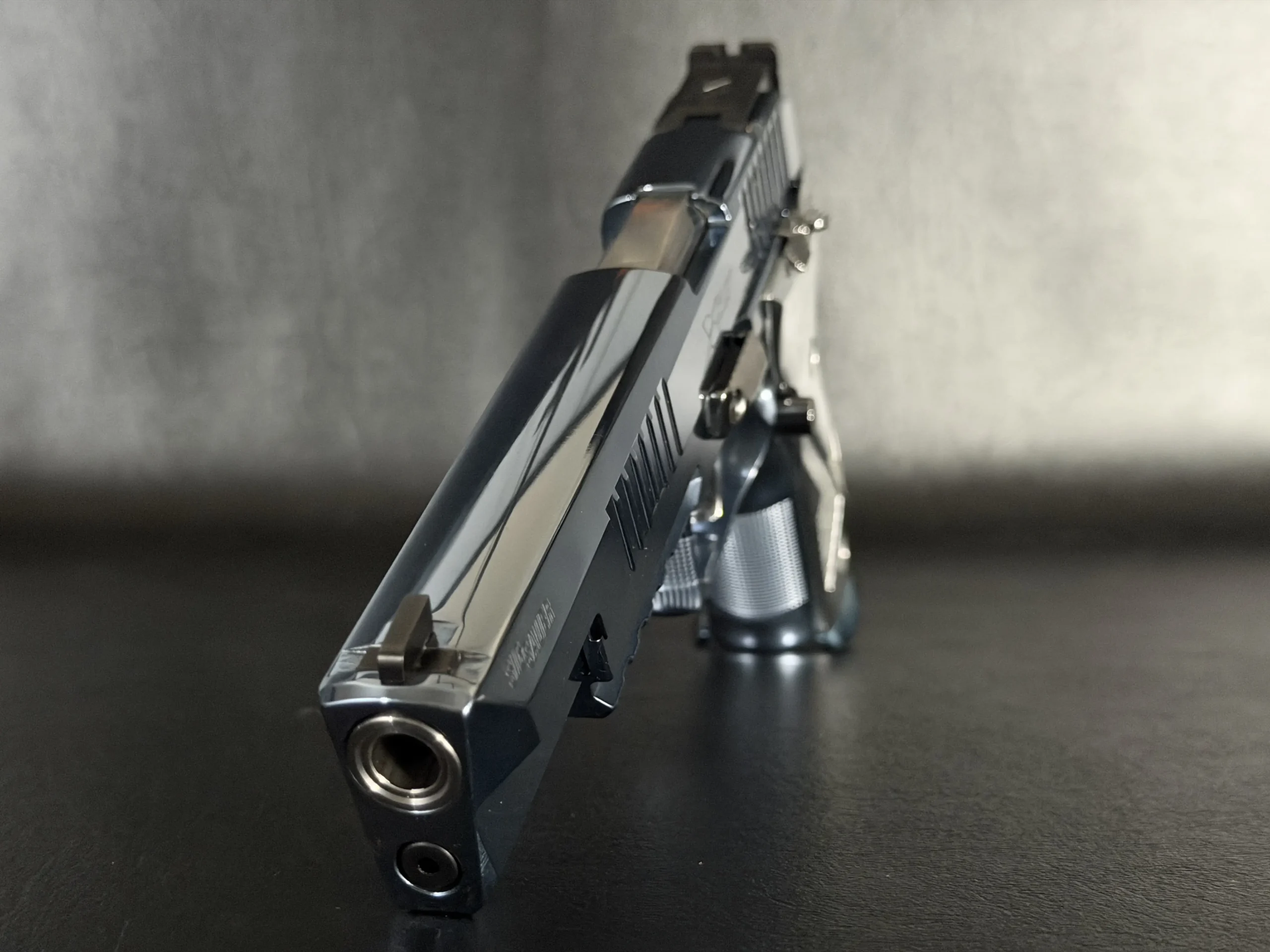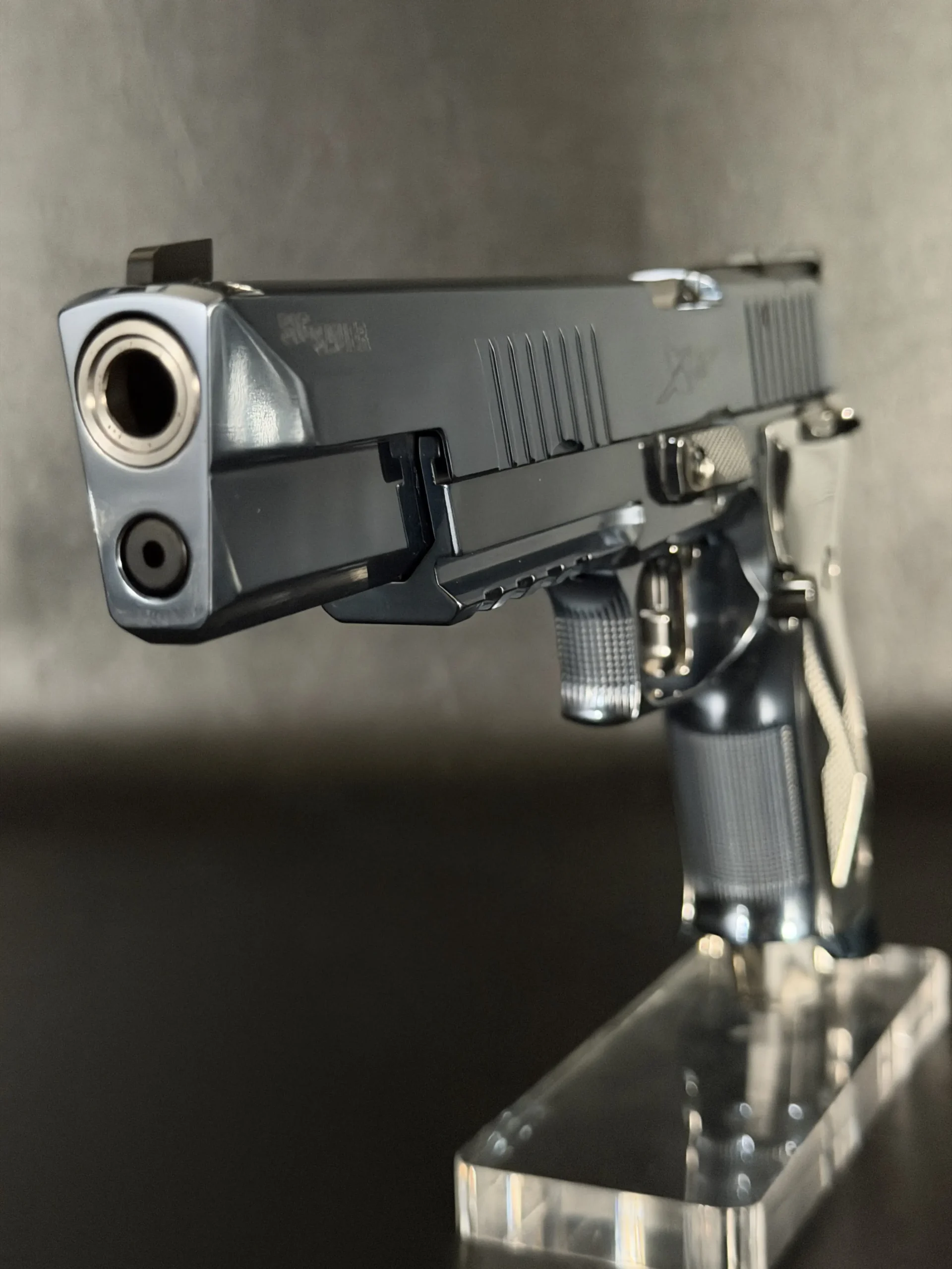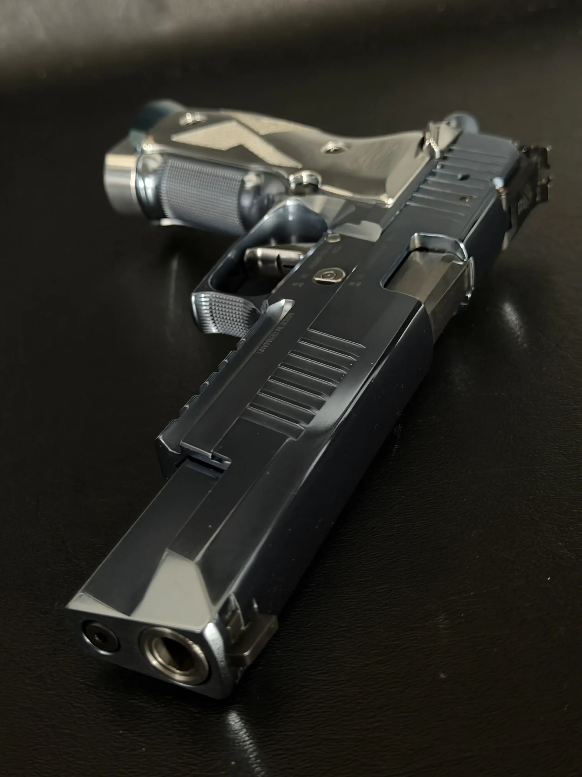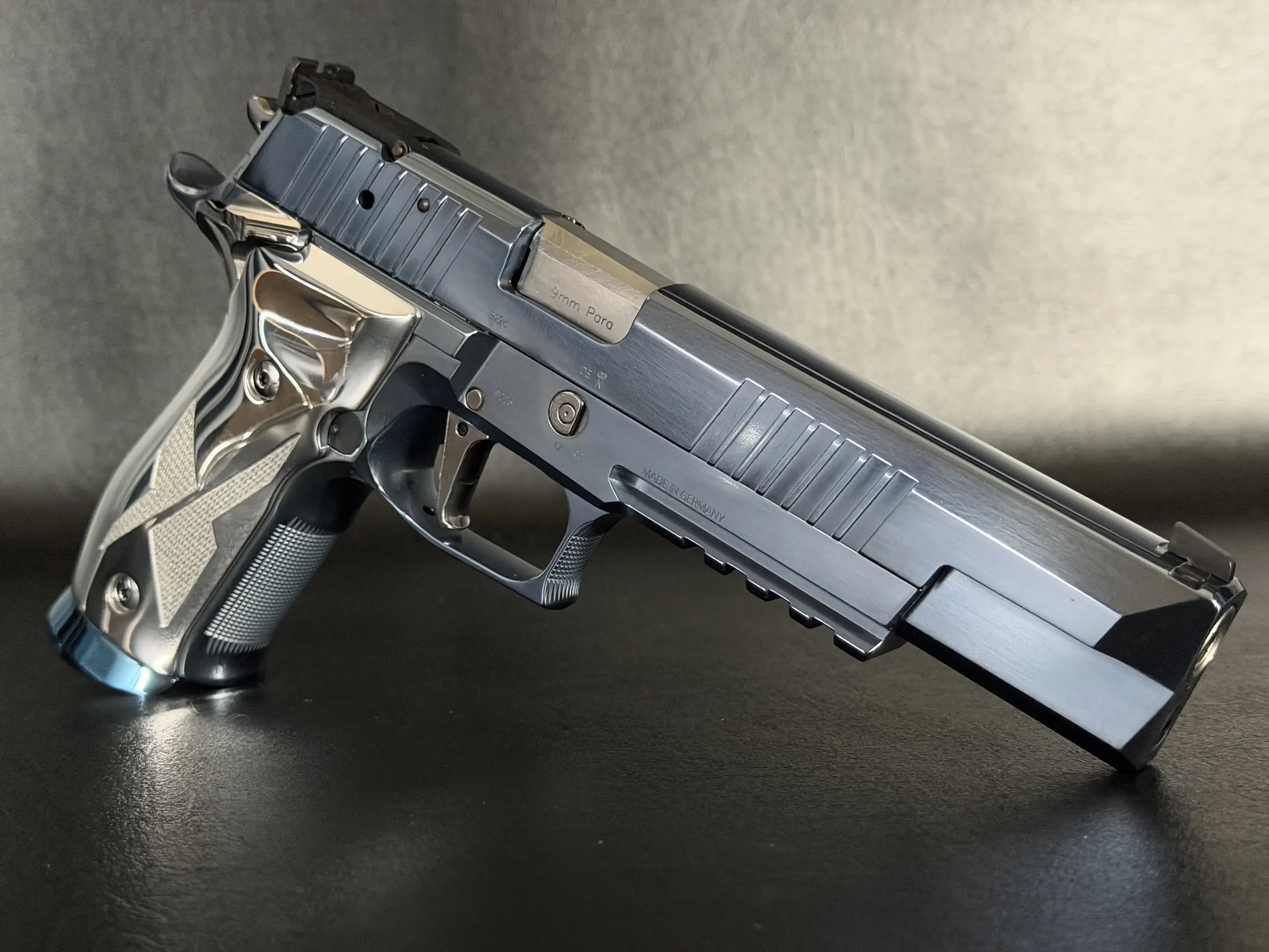 This example stands out for its Blue Ice finish, a cool-toned treatment that gives the pistol a crisp, modern look. It is paired with high-polish sculpted grip panels that create strong visual contrast while maintaining the model’s clean, cohesive design language.