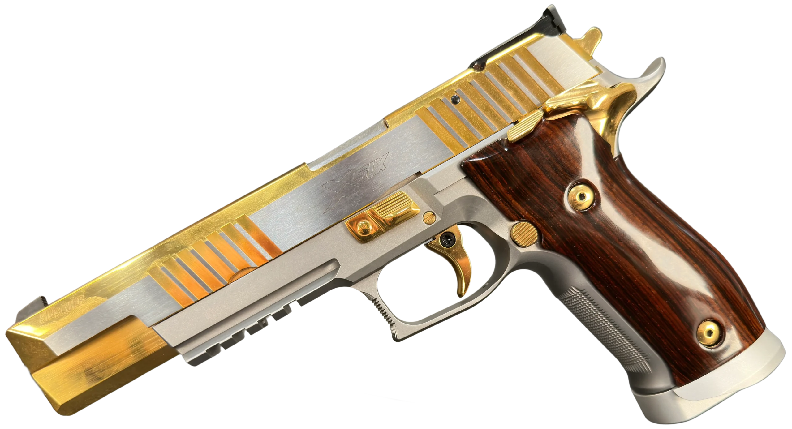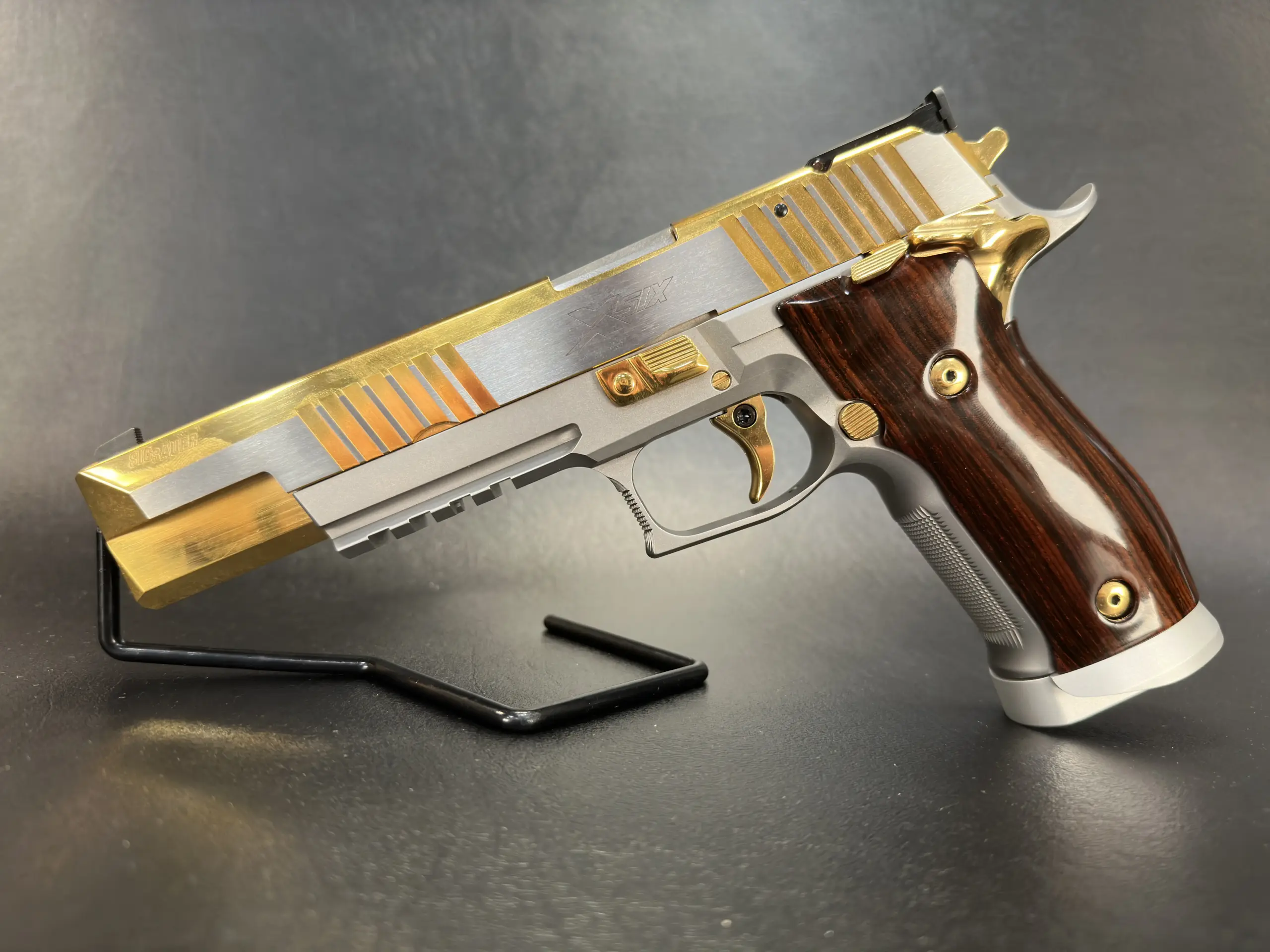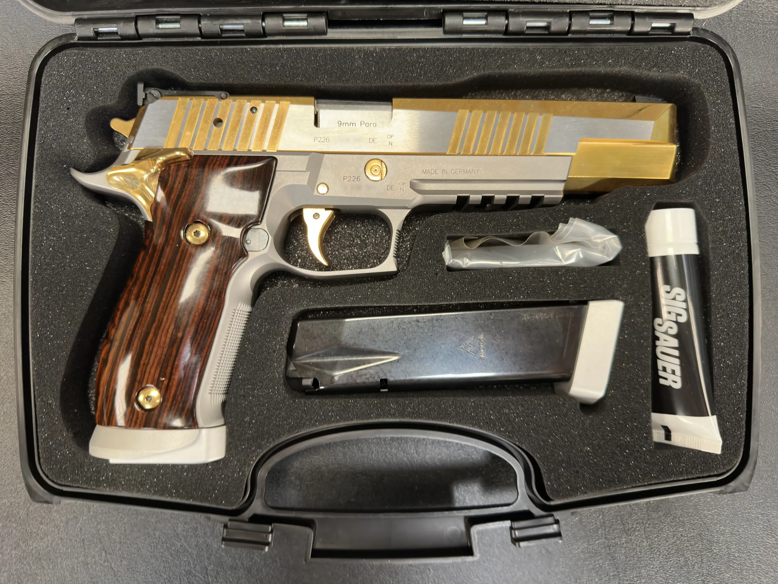 The SIG Sauer P226 X-Six Violine is a full-size 9mm X-Series pistol with an extended slide and barrel configuration, gold-tone controls, and sculpted wooden grips. This example includes the original factory case, manuals, test target, and accessories.