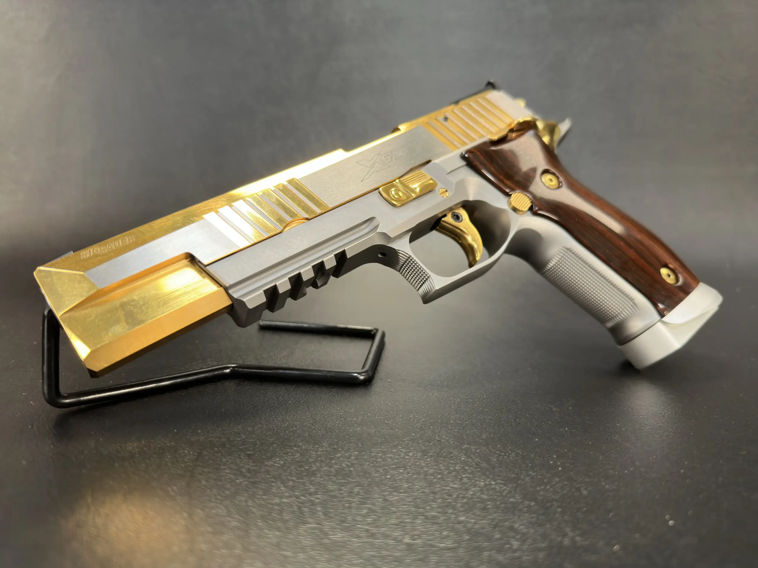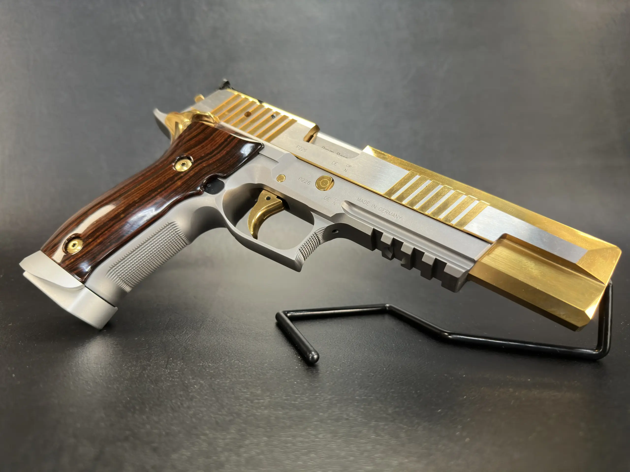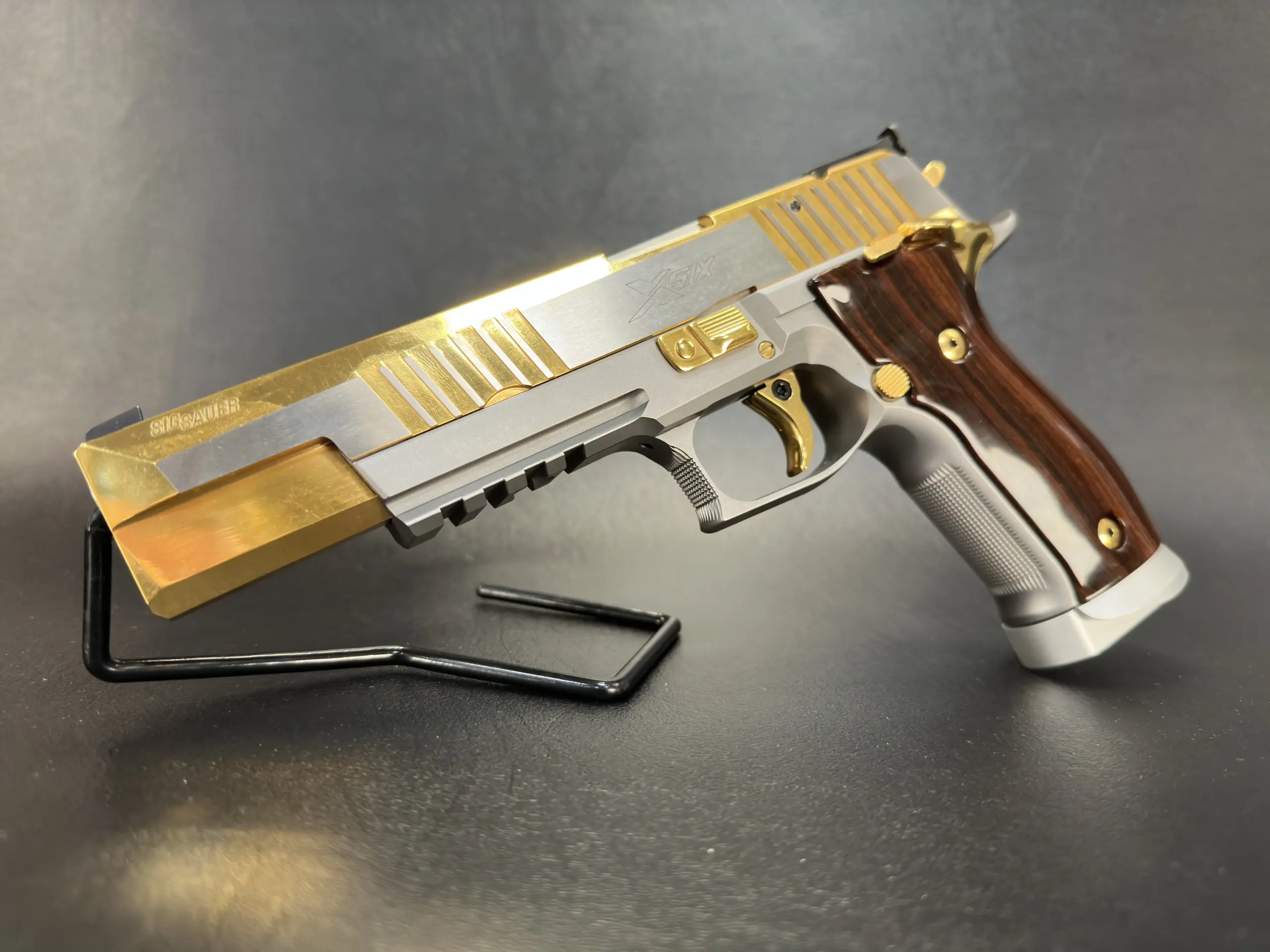 The SIG Sauer P226 X-Six Violine is a full-size 9mm X-Series pistol with an extended slide and barrel configuration, gold-tone controls, and sculpted wooden grips. This example includes the original factory case, manuals, test target, and accessories.