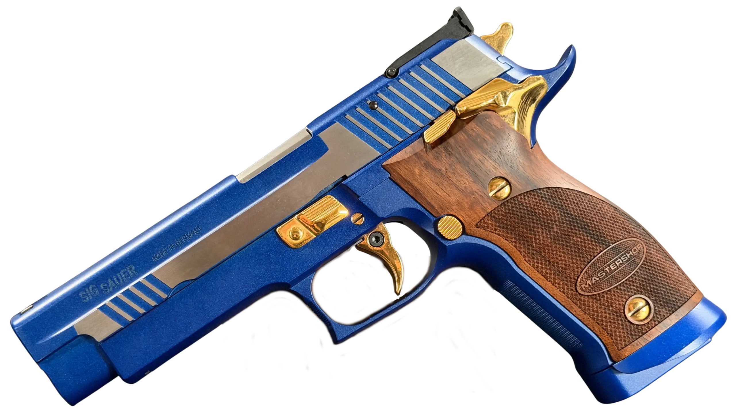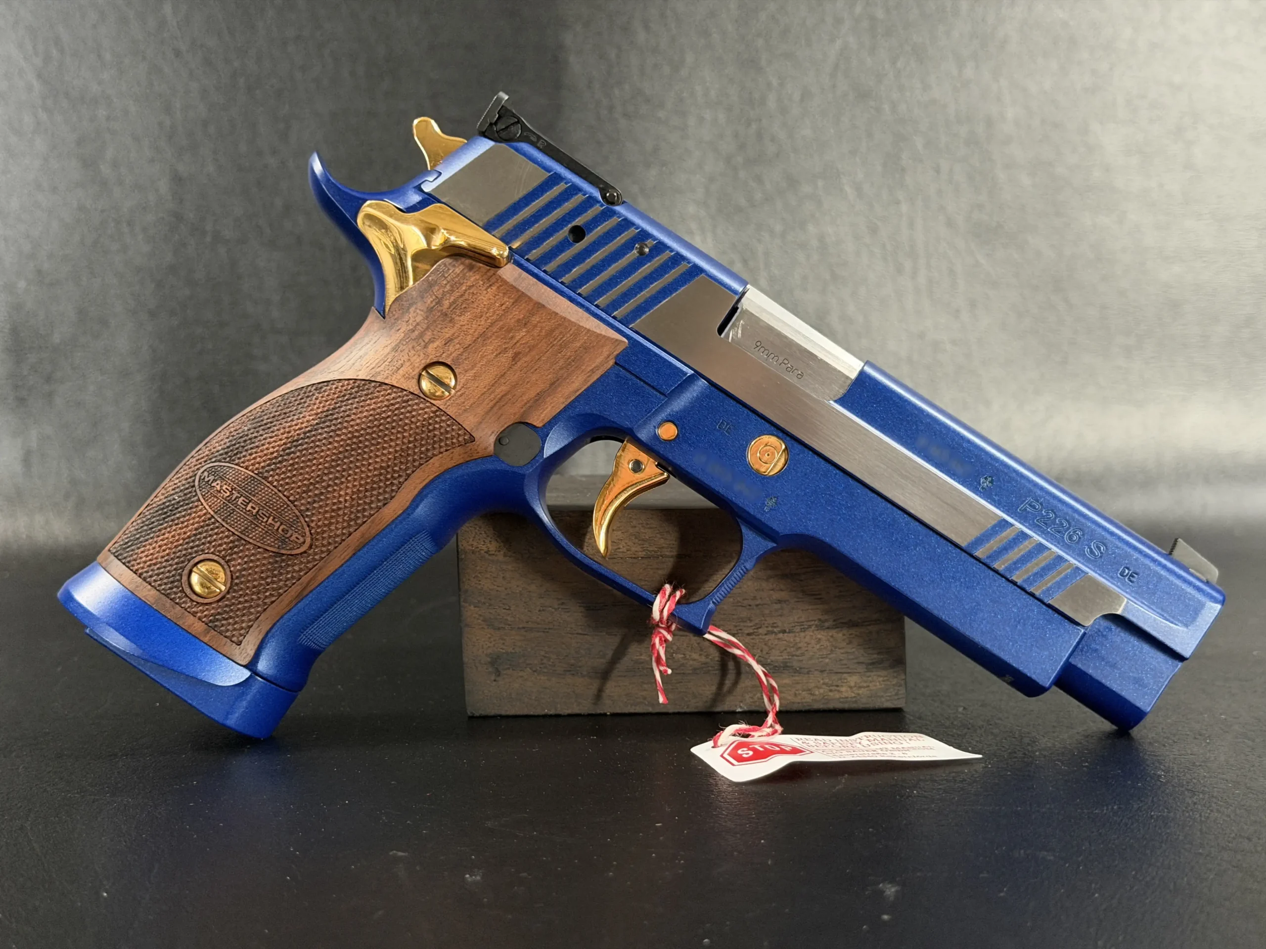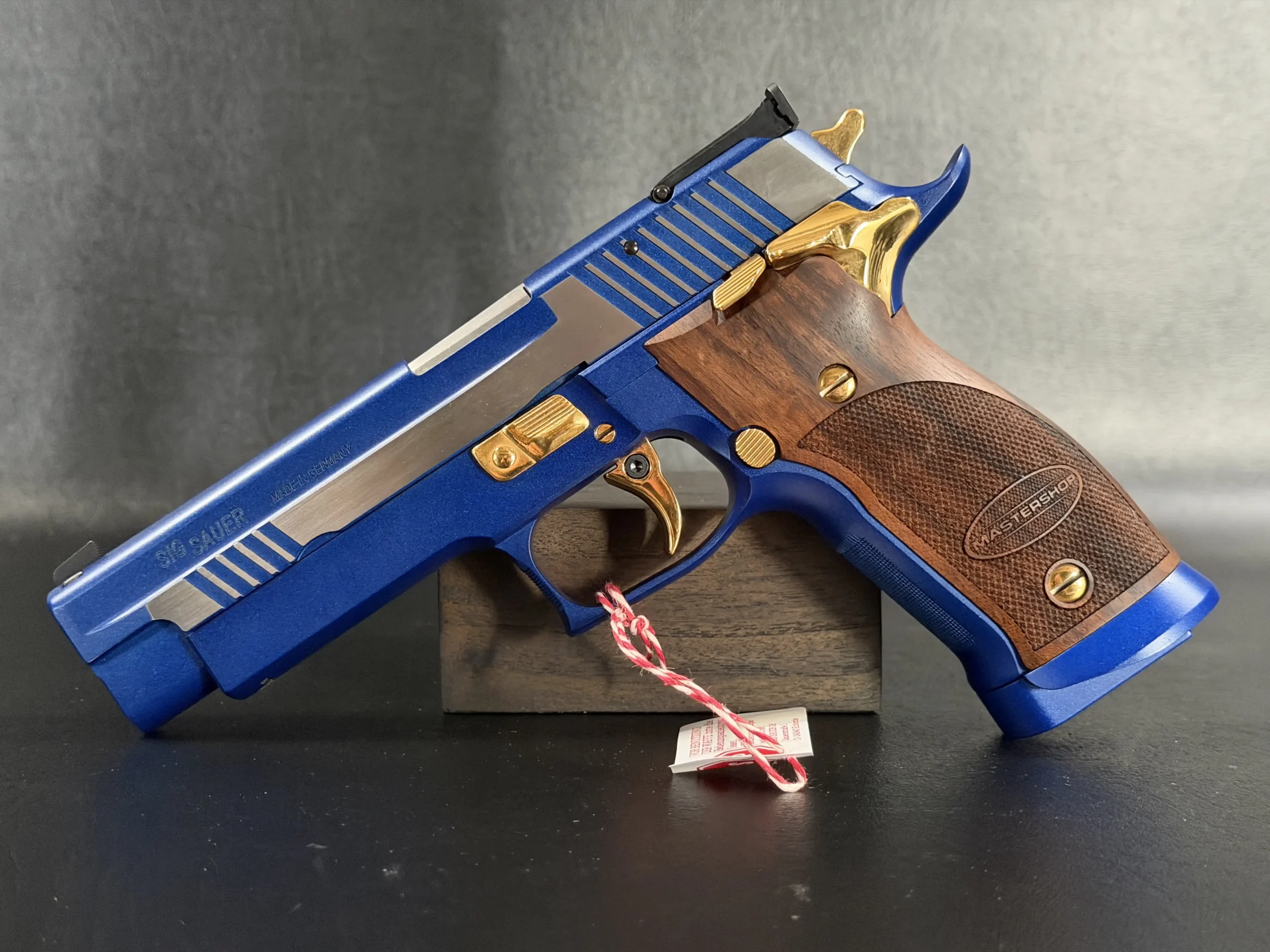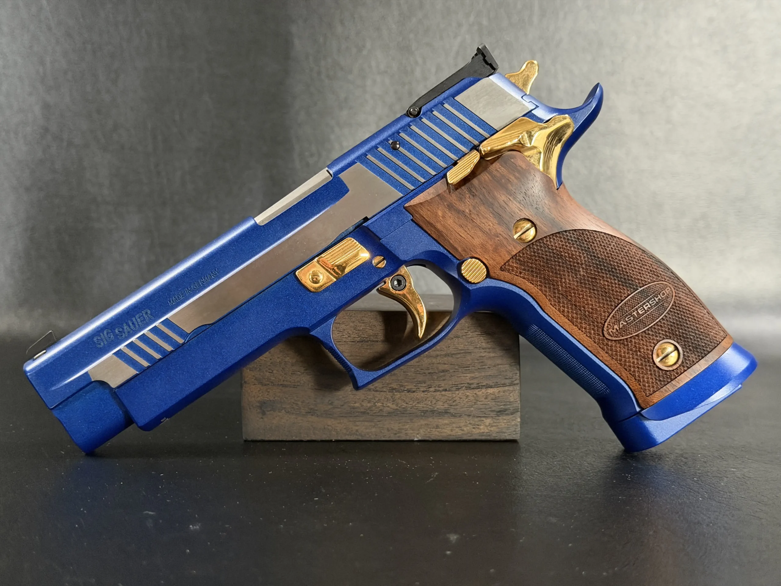 This example is fitted with Mastershop-marked wooden grips, contoured and checkered for a secure, comfortable hold. The combination of steel, wood, and contrasting control finishes gives the pistol a cohesive look that stands apart within the P226 X-Five line.