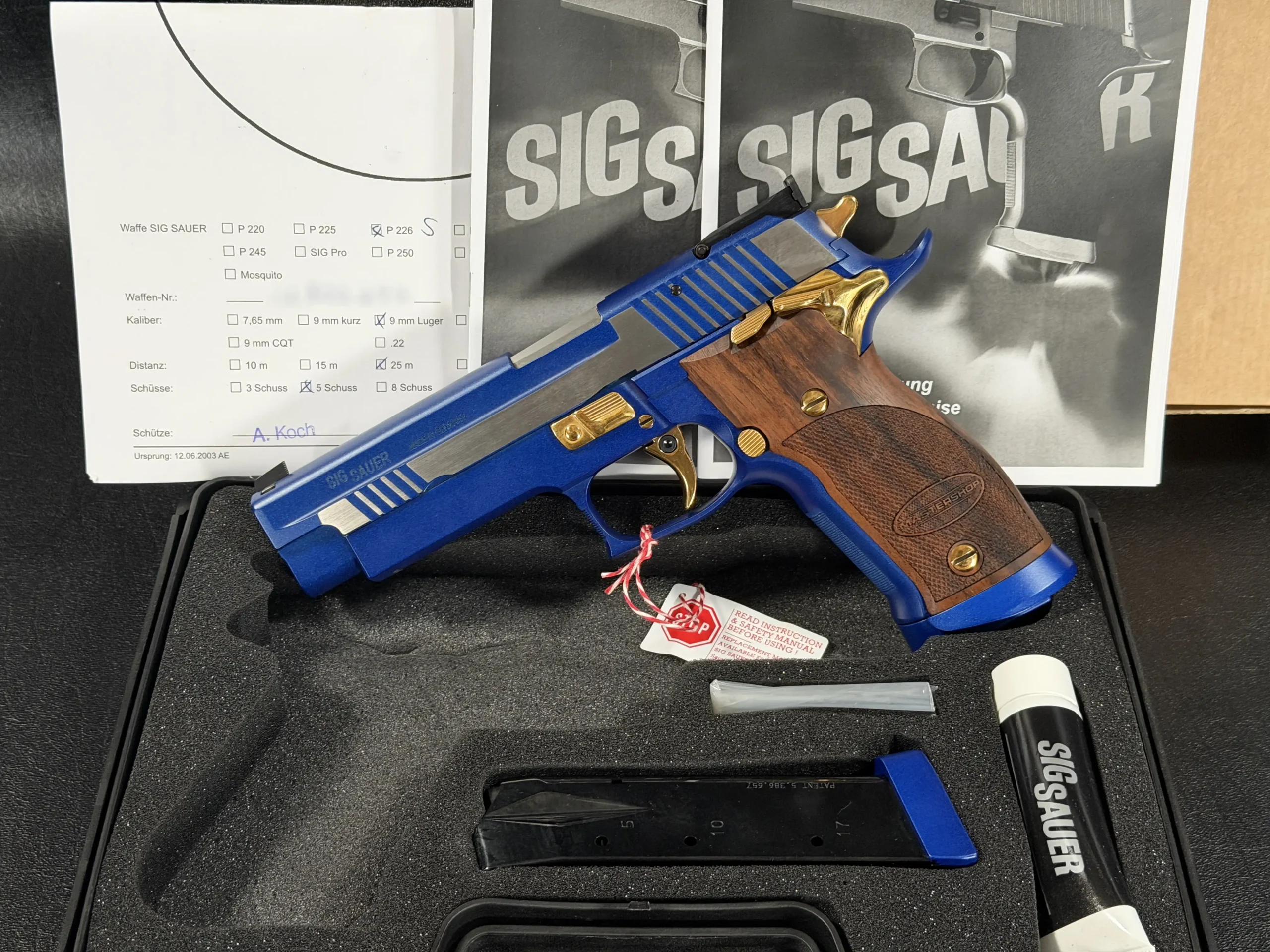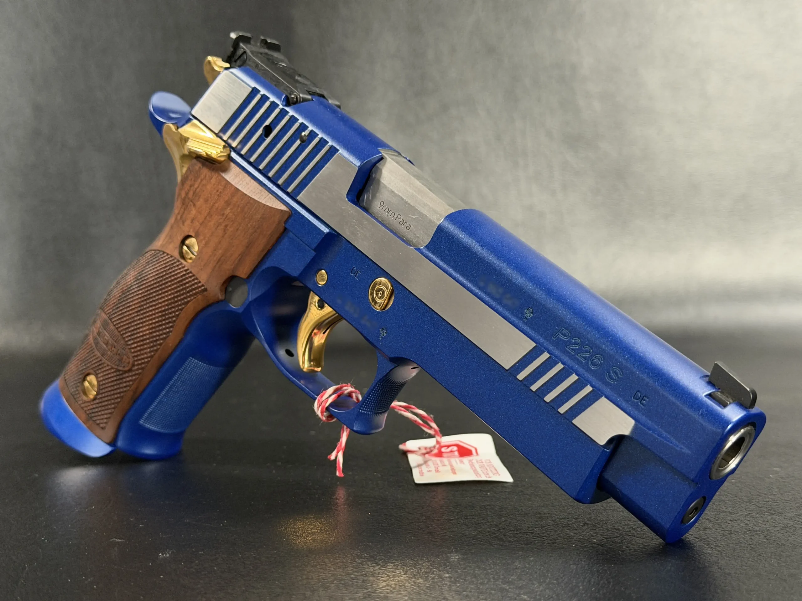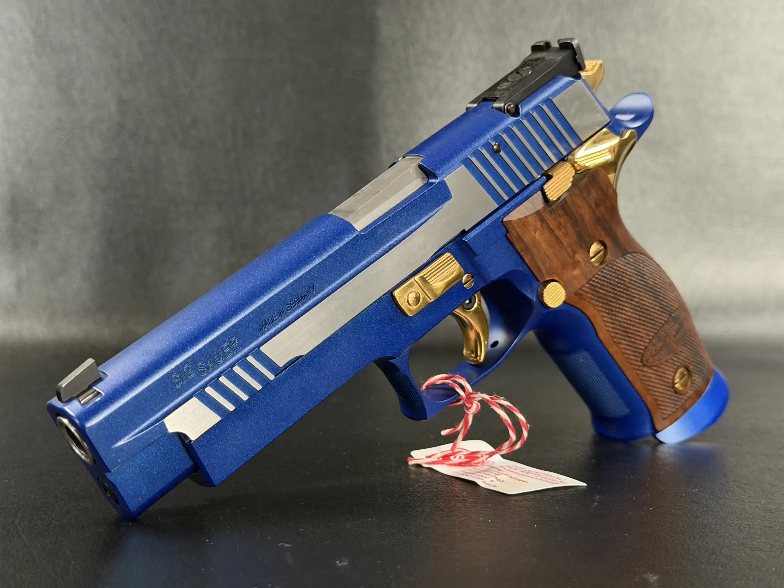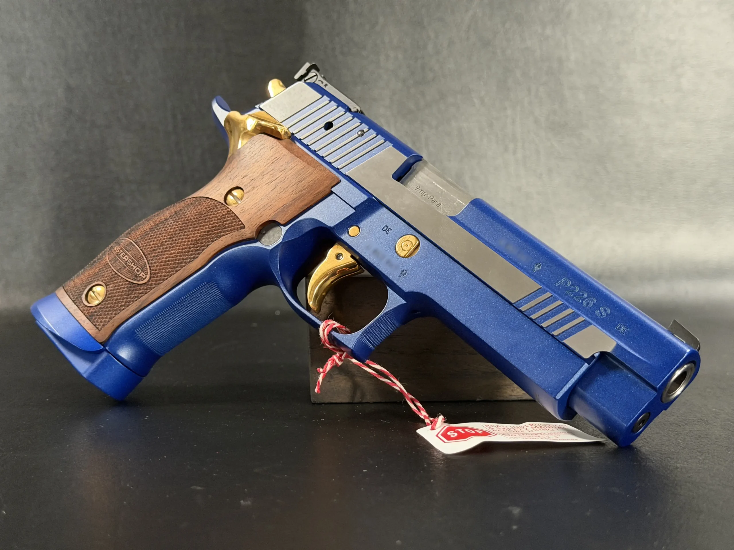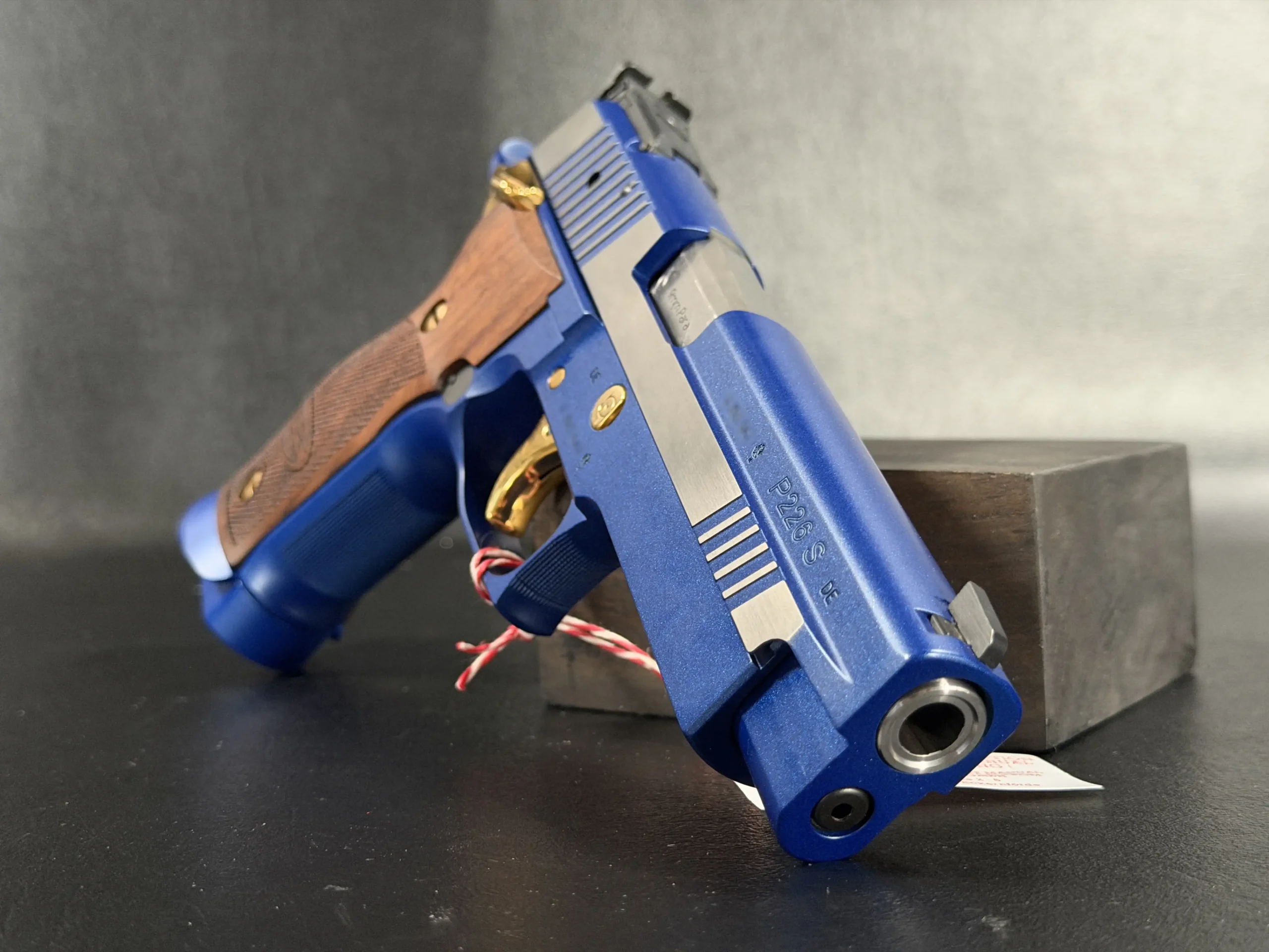 This example is fitted with Mastershop-marked wooden grips, contoured and checkered for a secure, comfortable hold. The combination of steel, wood, and contrasting control finishes gives the pistol a cohesive look that stands apart within the P226 X-Five line.