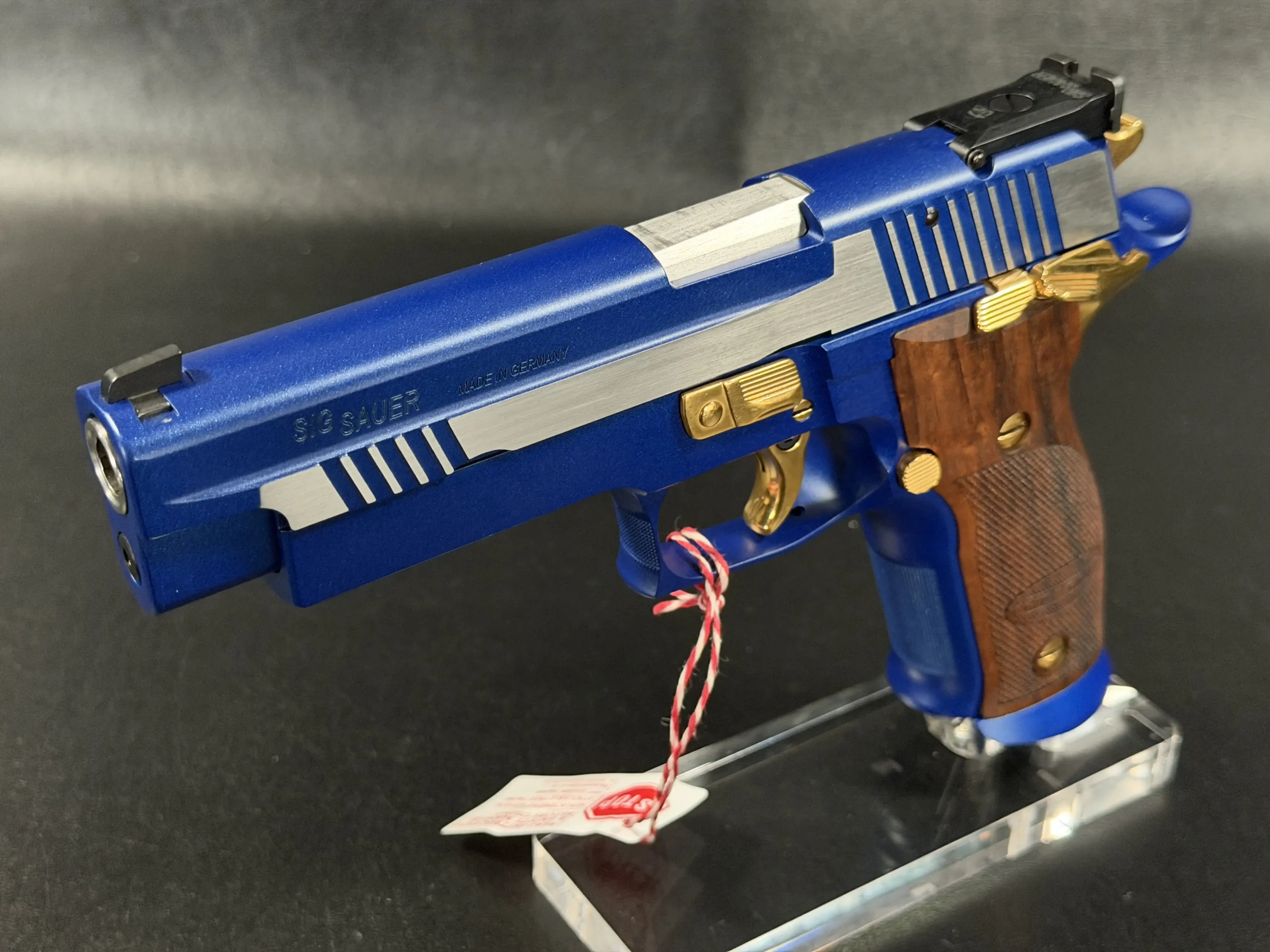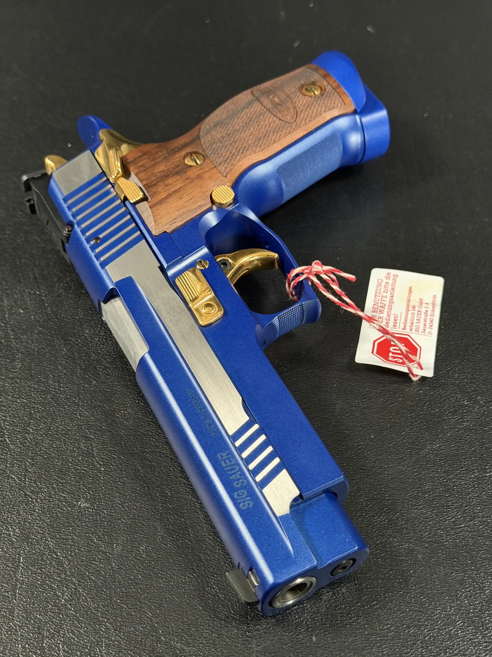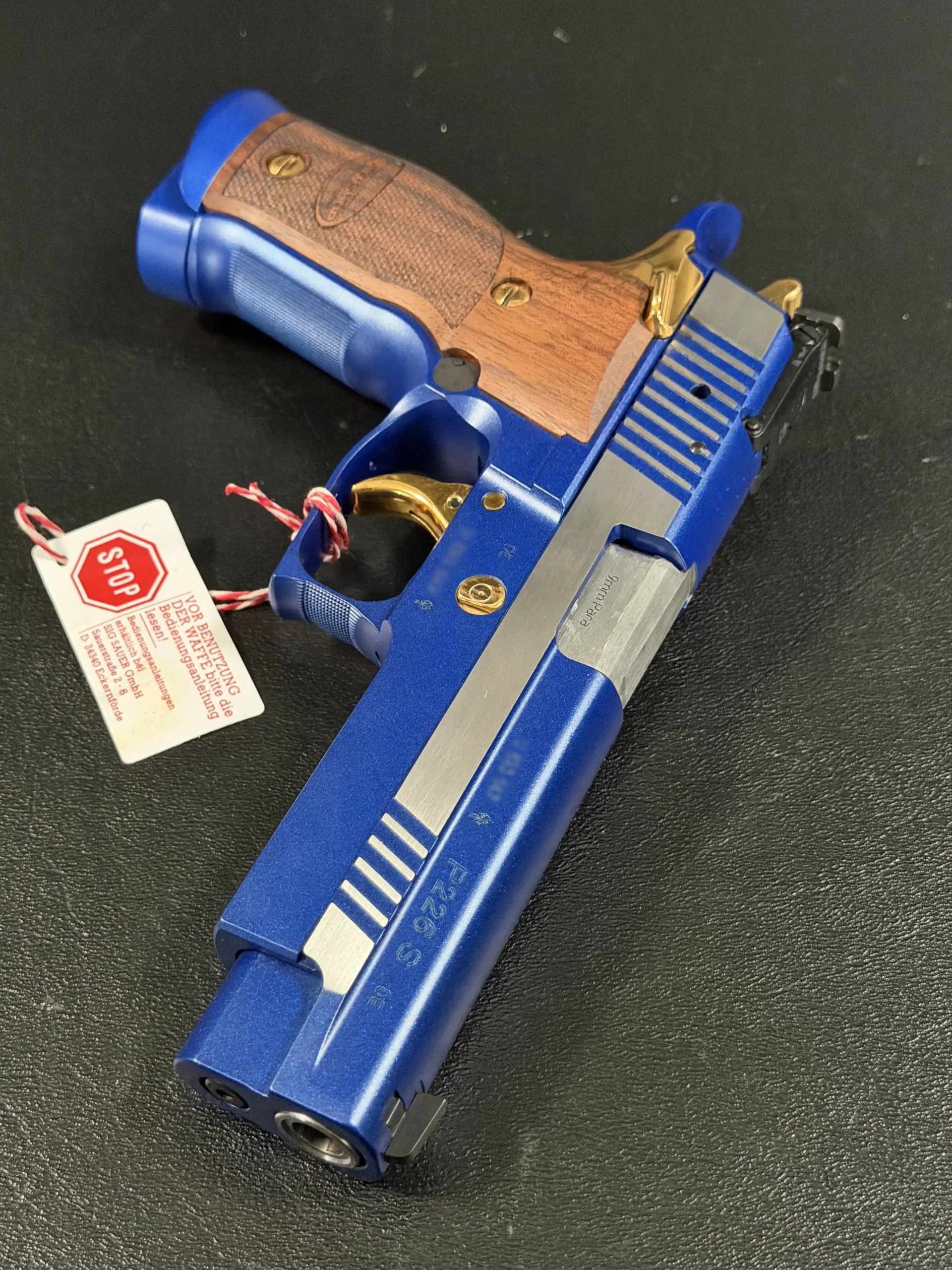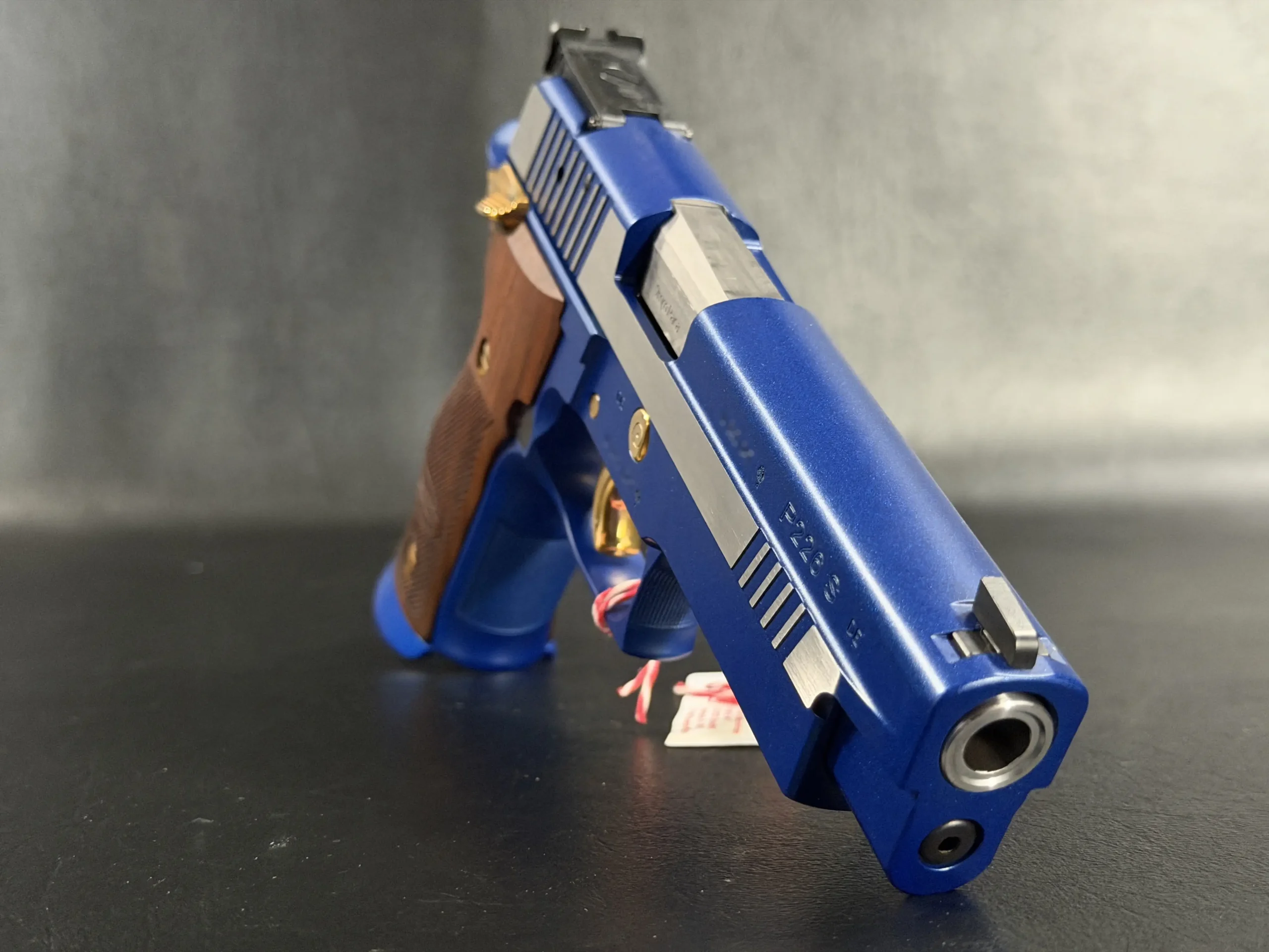 This example is fitted with Mastershop-marked wooden grips, contoured and checkered for a secure, comfortable hold. The combination of steel, wood, and contrasting control finishes gives the pistol a cohesive look that stands apart within the P226 X-Five line.
