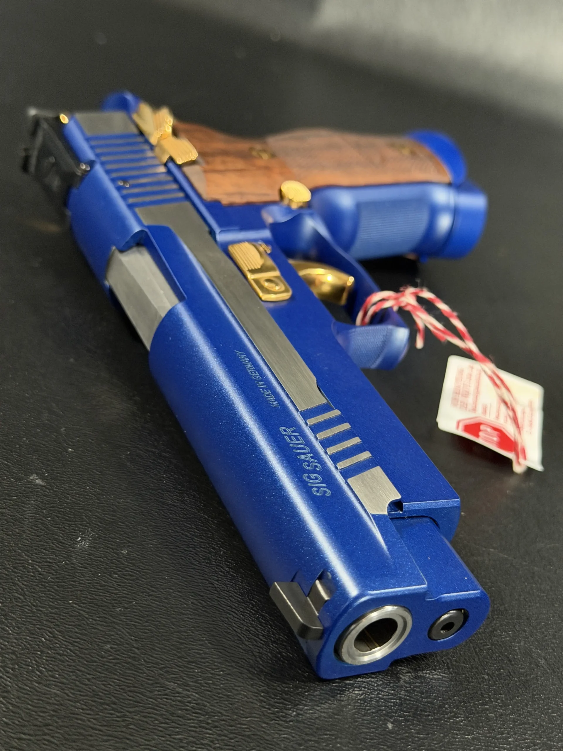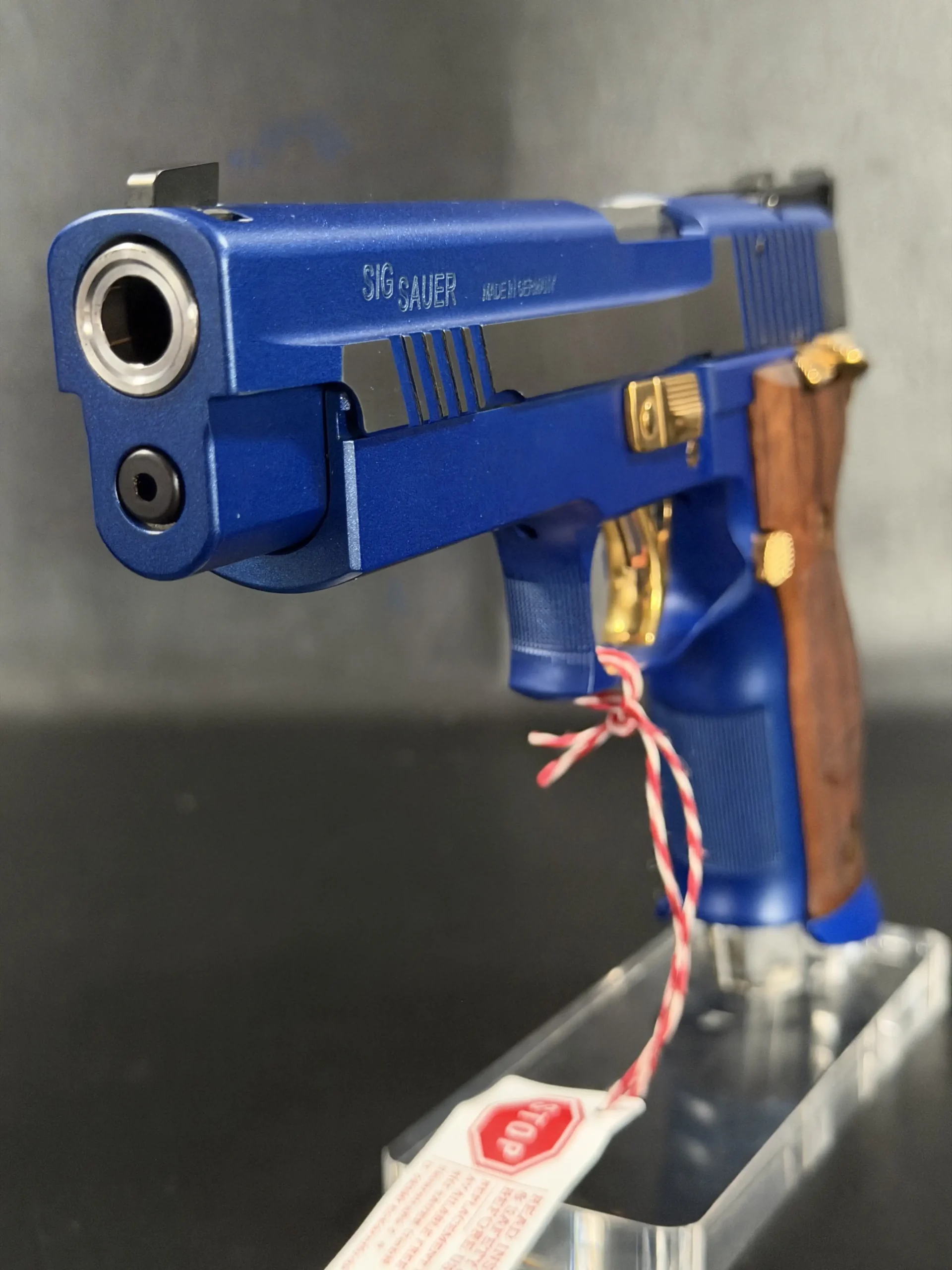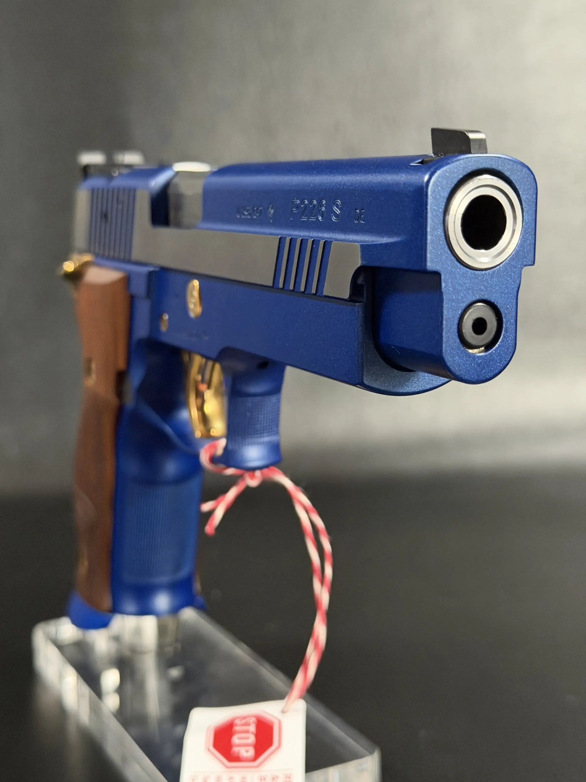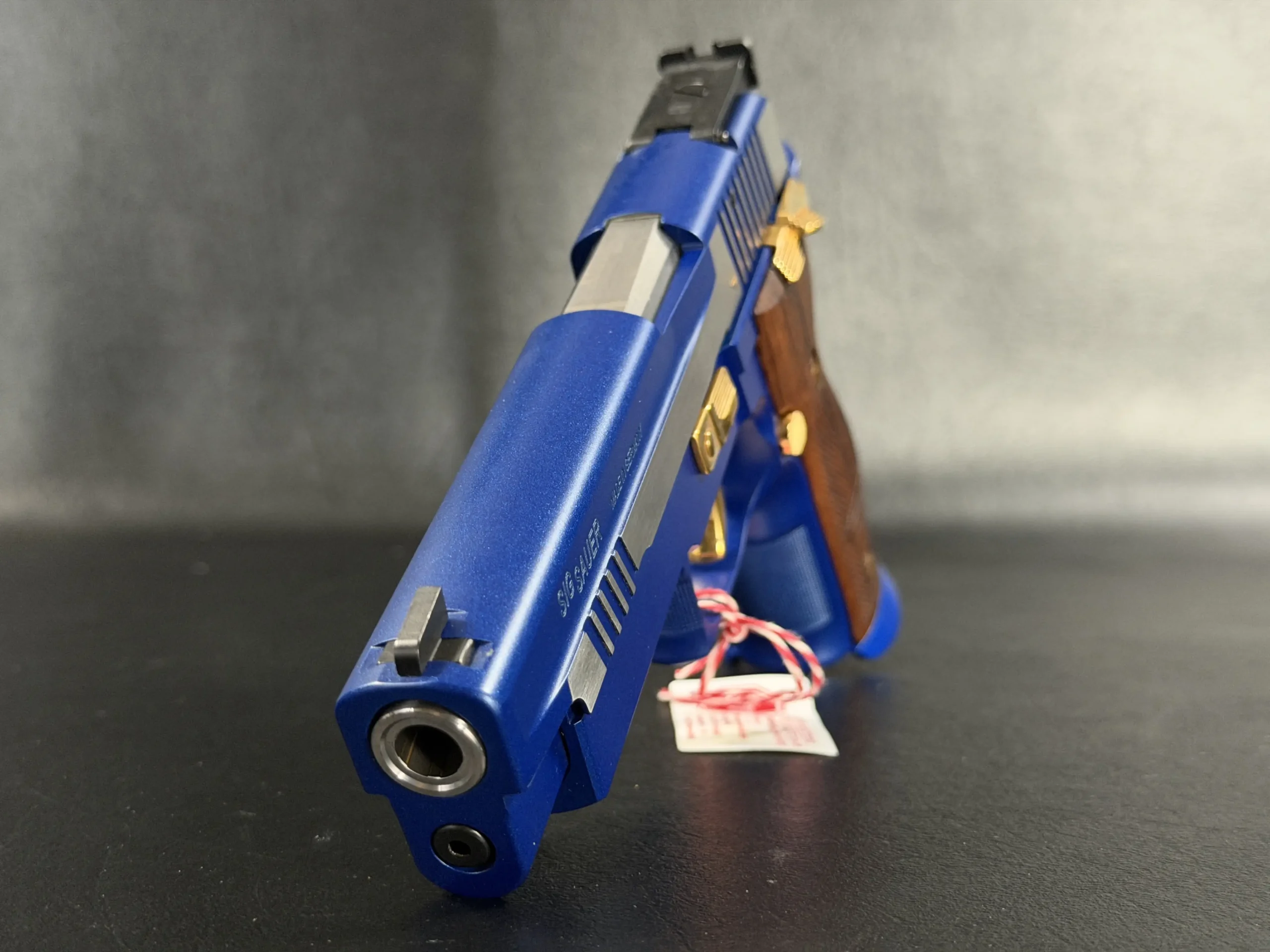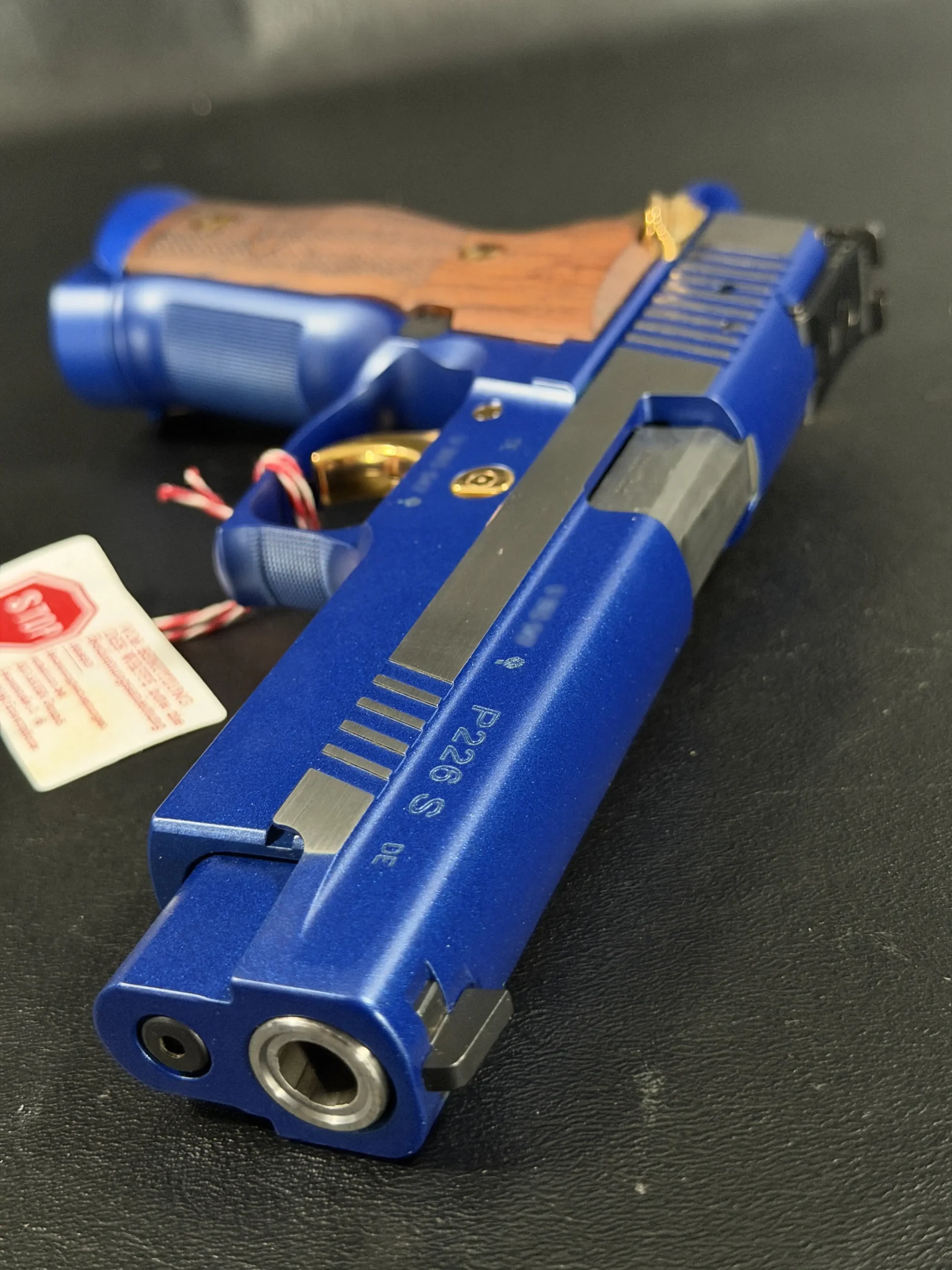 This example is fitted with Mastershop-marked wooden grips, contoured and checkered for a secure, comfortable hold. The combination of steel, wood, and contrasting control finishes gives the pistol a cohesive look that stands apart within the P226 X-Five line.