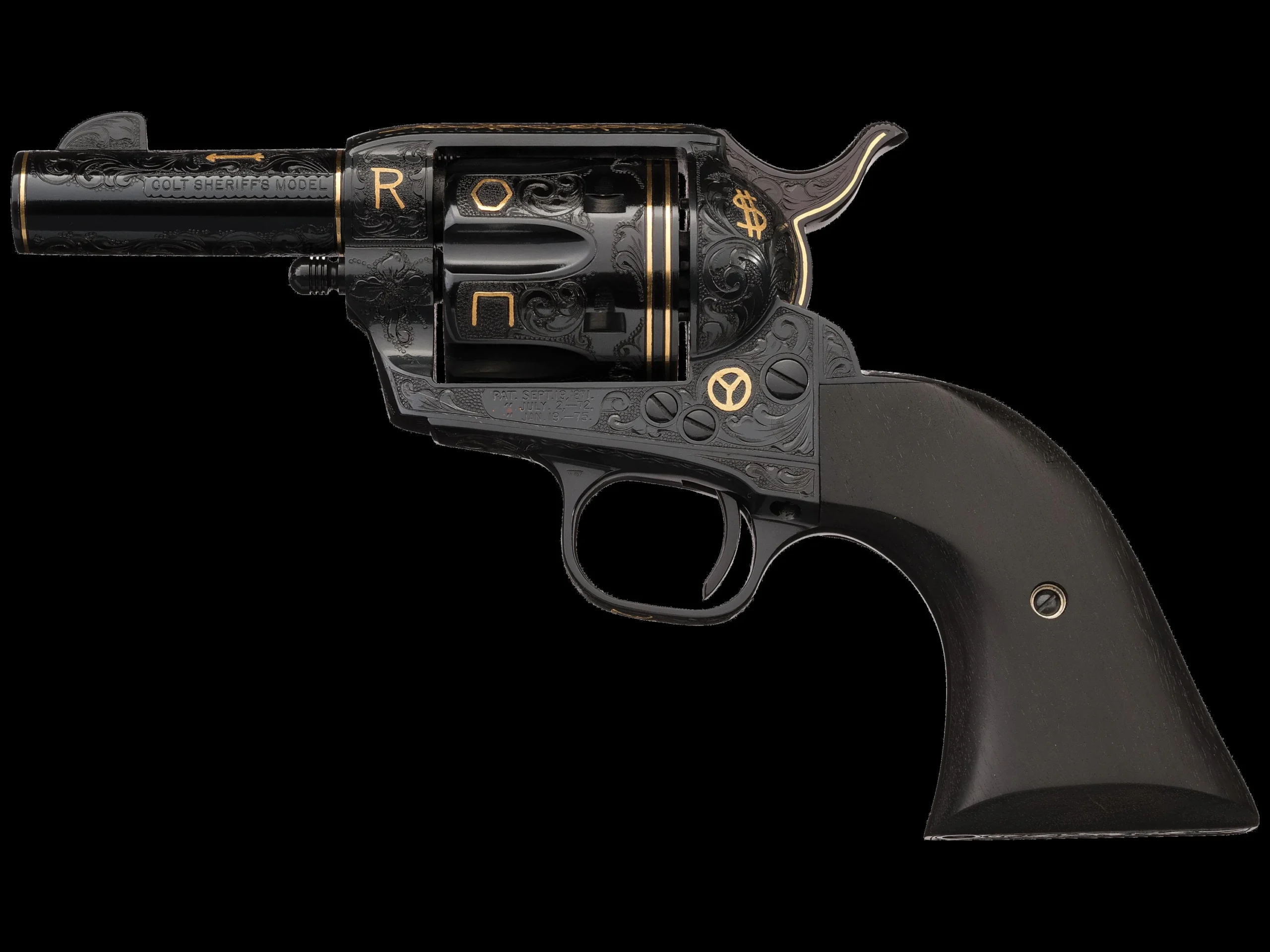 A 2009 Colt Sheriff’s Model Single Action Army signed by Master Engraver John Adams Sr., with approximately 85% floral scroll engraving, 22-karat gold inlay, and sixteen cattle brand motifs. Includes a 2011 Adams & Adams Engravers authentication letter and carved ebony grips by Dan Chesiak.