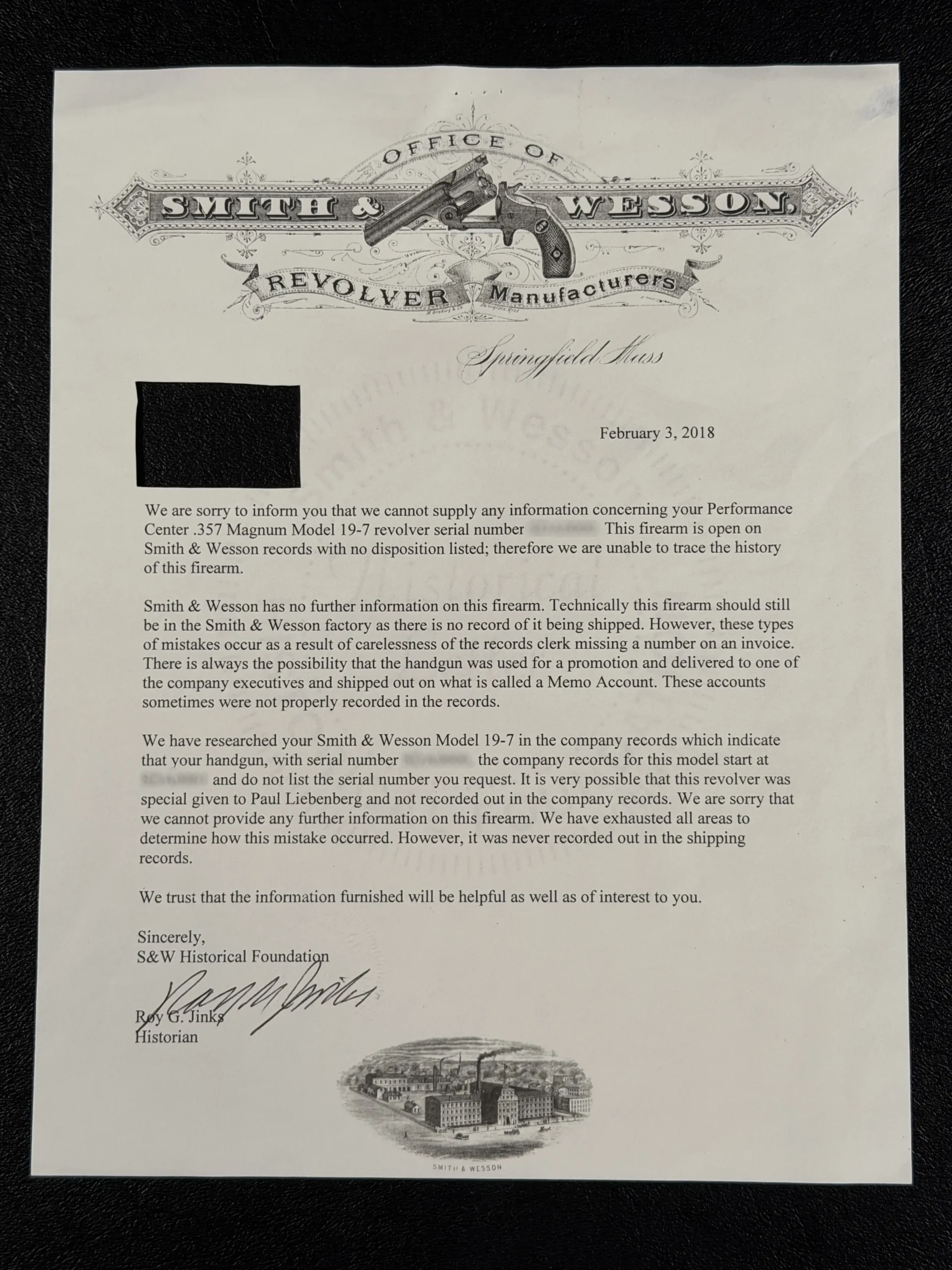 Included with the revolver is documentation from the Smith & Wesson Historical Foundation referencing its place at the beginning of the Model 19-7 Performance Center production run and noting that it stands apart from standard production records. The letter also indicates that examples of this type were at times distributed through internal channels or memo accounts rather than conventional shipping records.