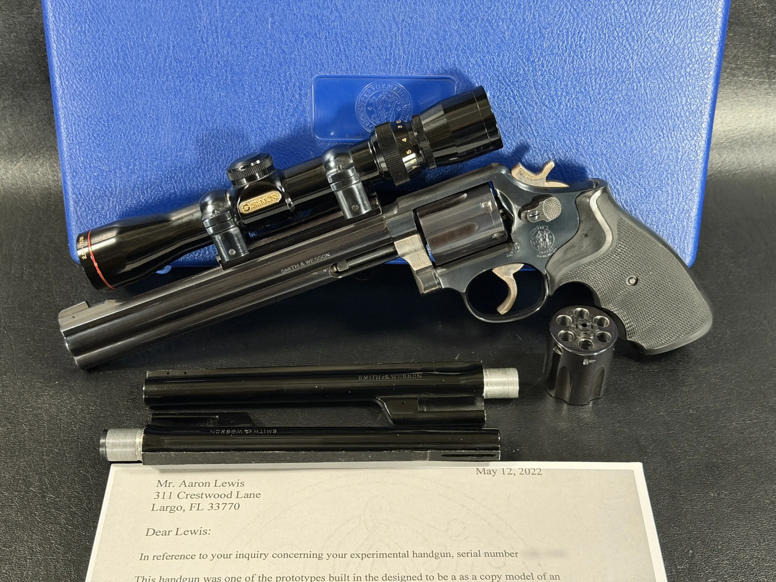 Also included are interchangeable barrels and an additional cylinder, further reflecting the modular, developmental nature of the project. For collectors and enthusiasts interested in Smith & Wesson experimental arms, this prototype presents a distinctive documented configuration with clear ties to the company’s engineering exploration.