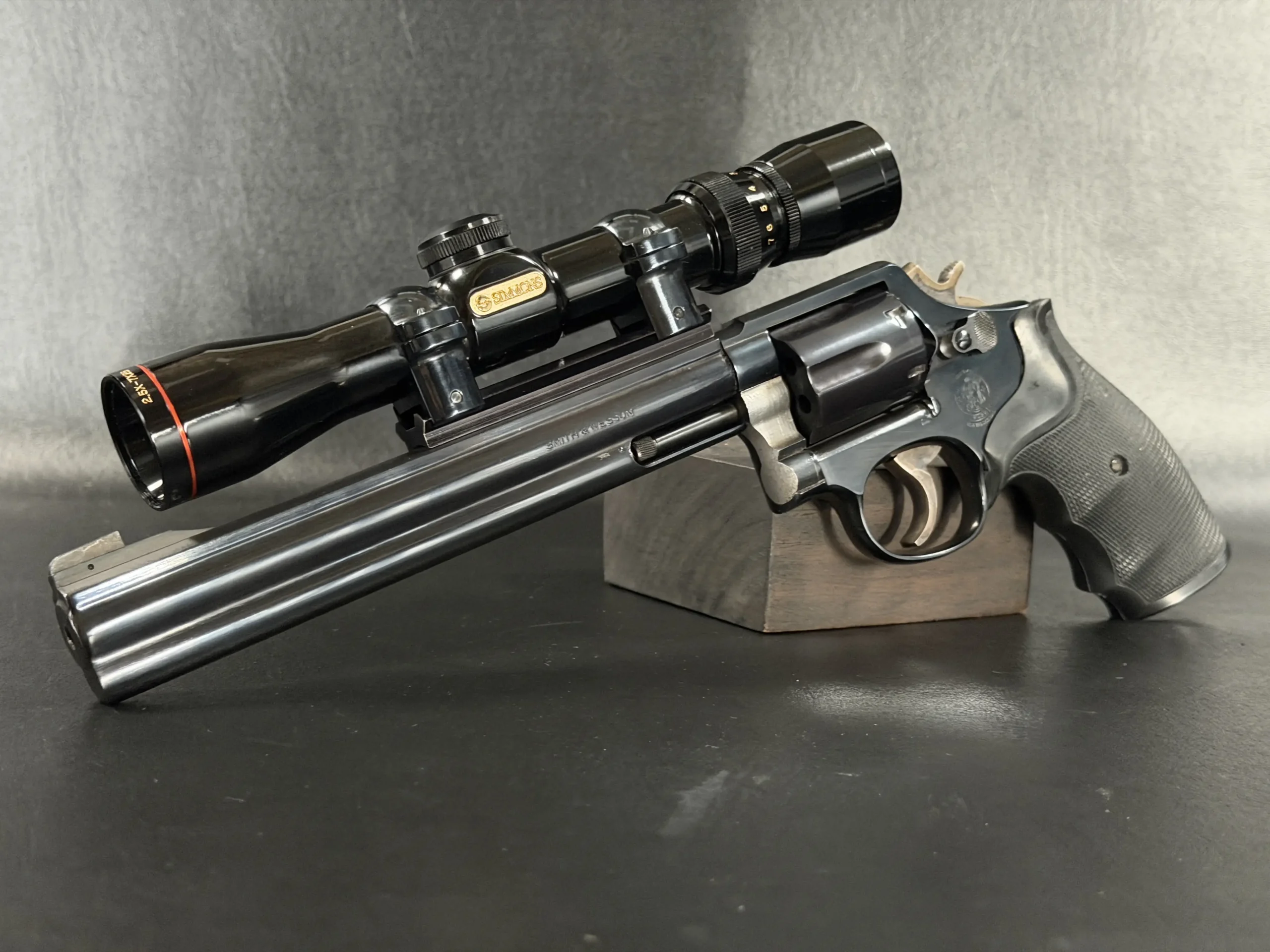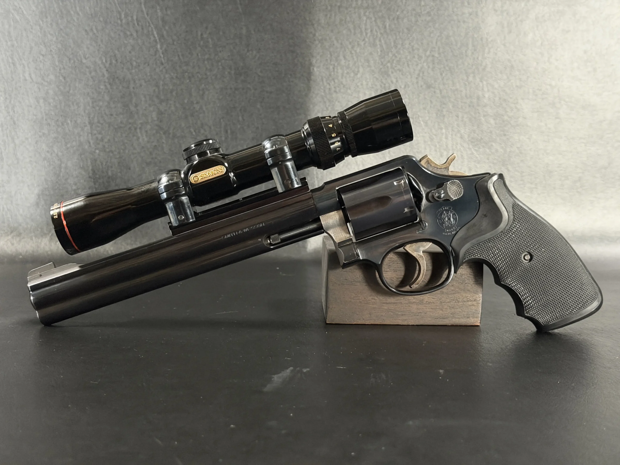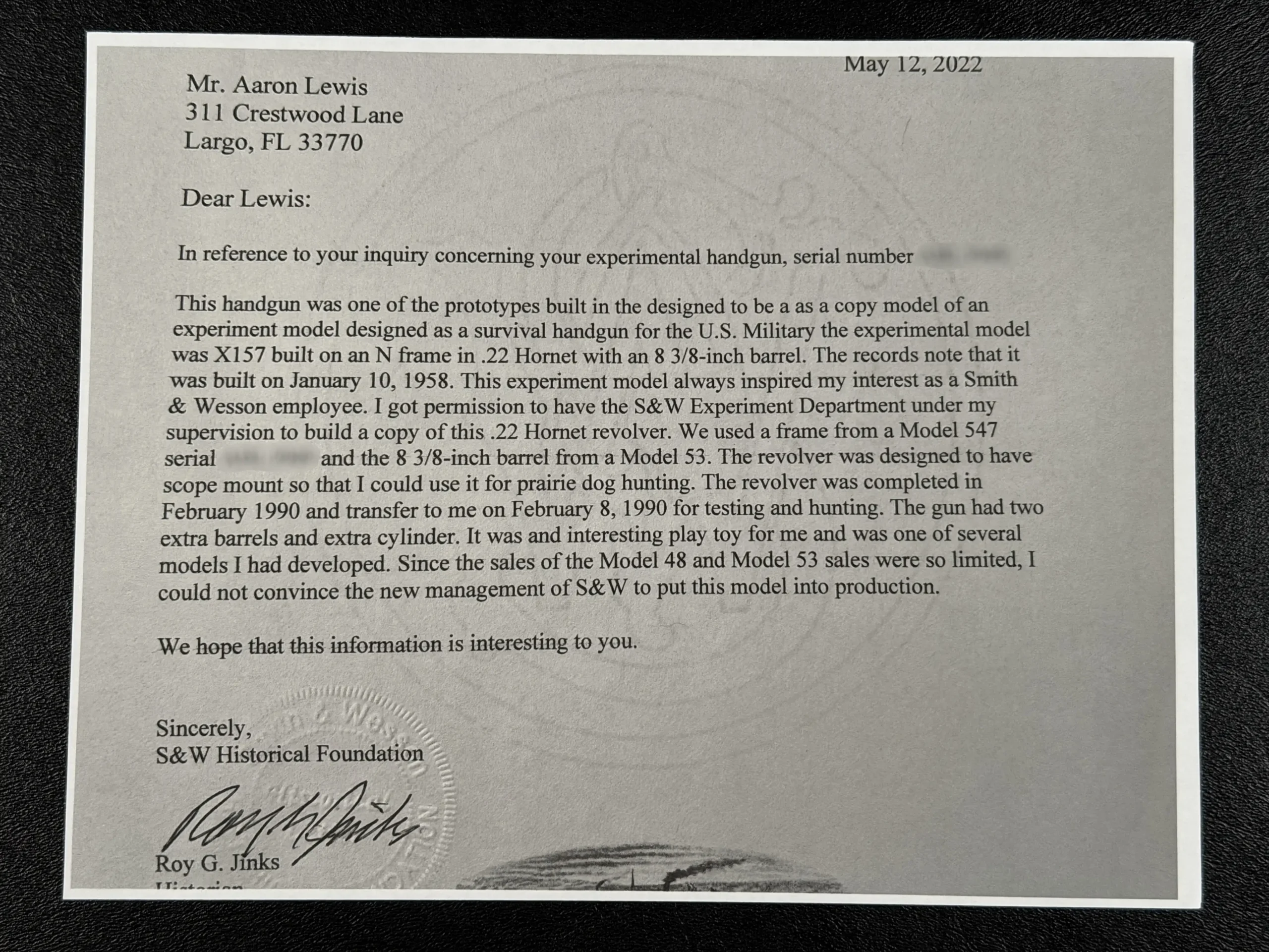 According to the accompanying documentation, this prototype was built on a Model 547 frame and fitted with an 8 3/8-inch barrel sourced from a Model 53. The long-barreled configuration was intended to accommodate a scope mount for varmint and prairie-dog hunting, and the revolver was completed in February 1990 before being transferred to the developer for testing and field use.
