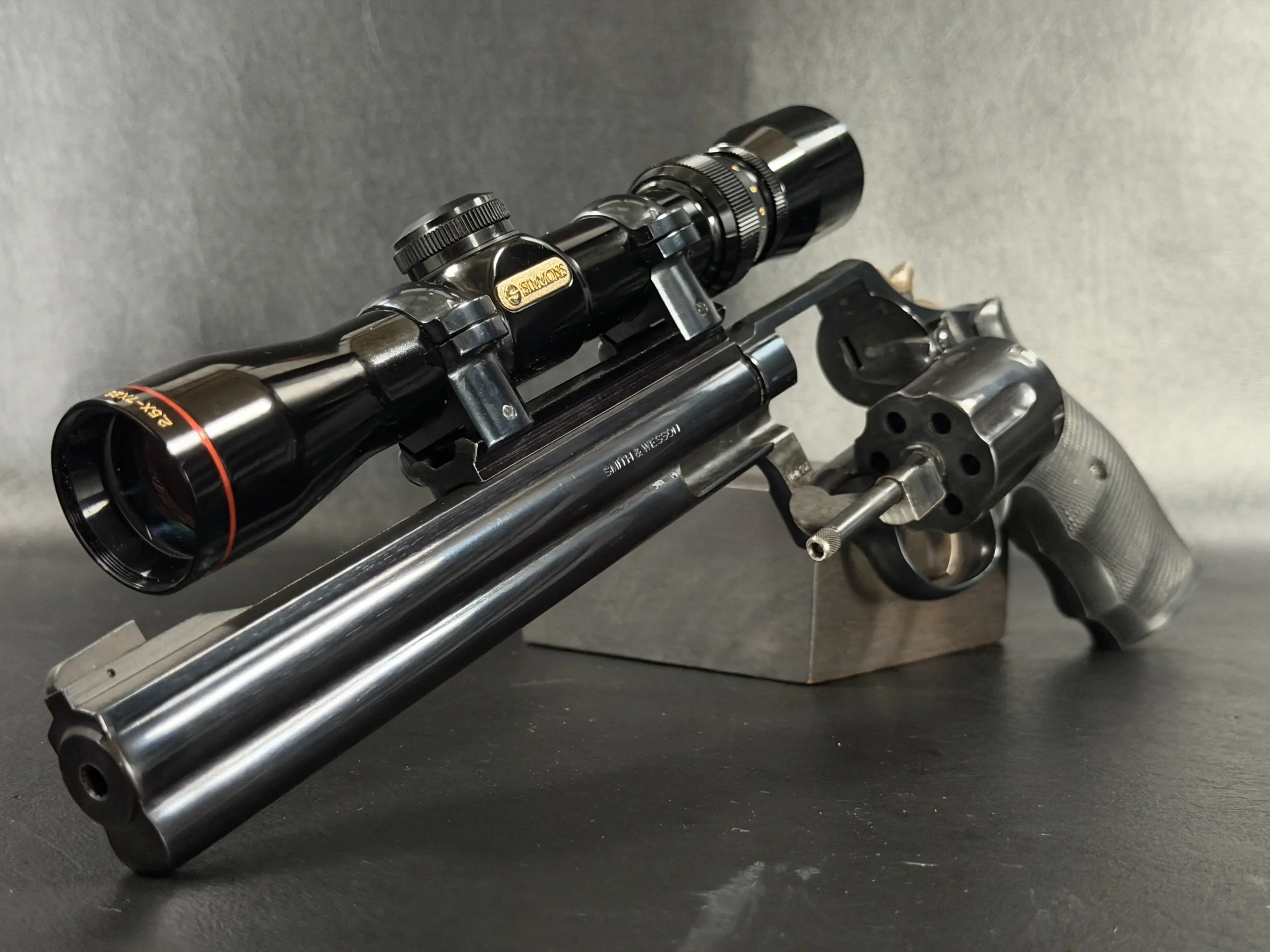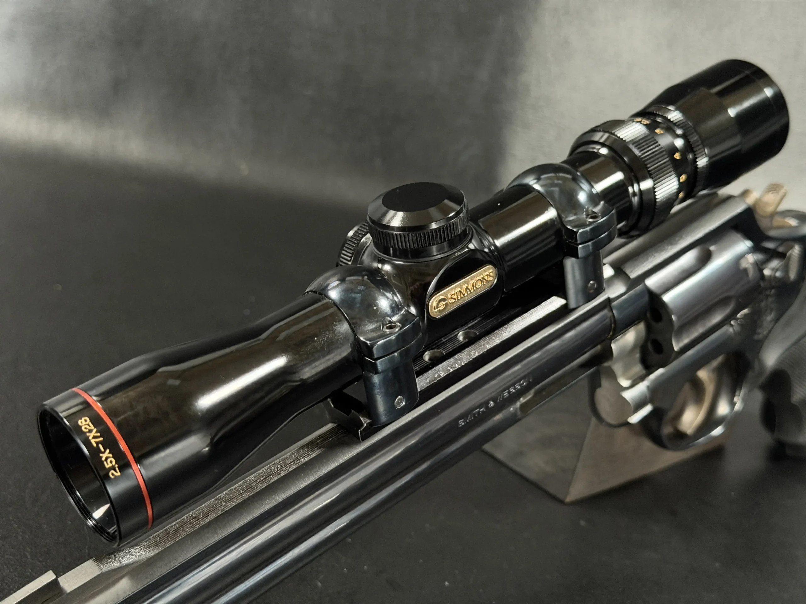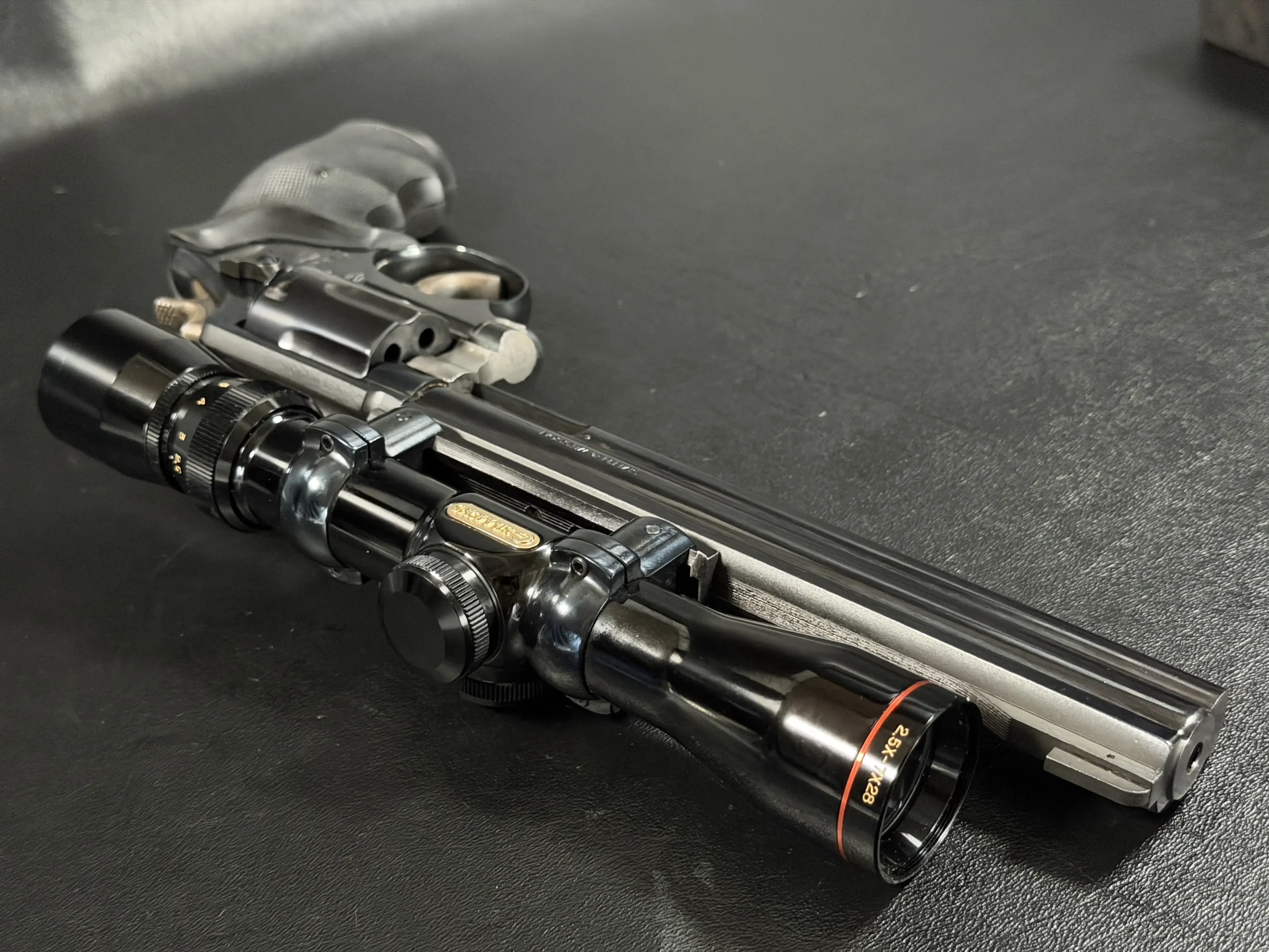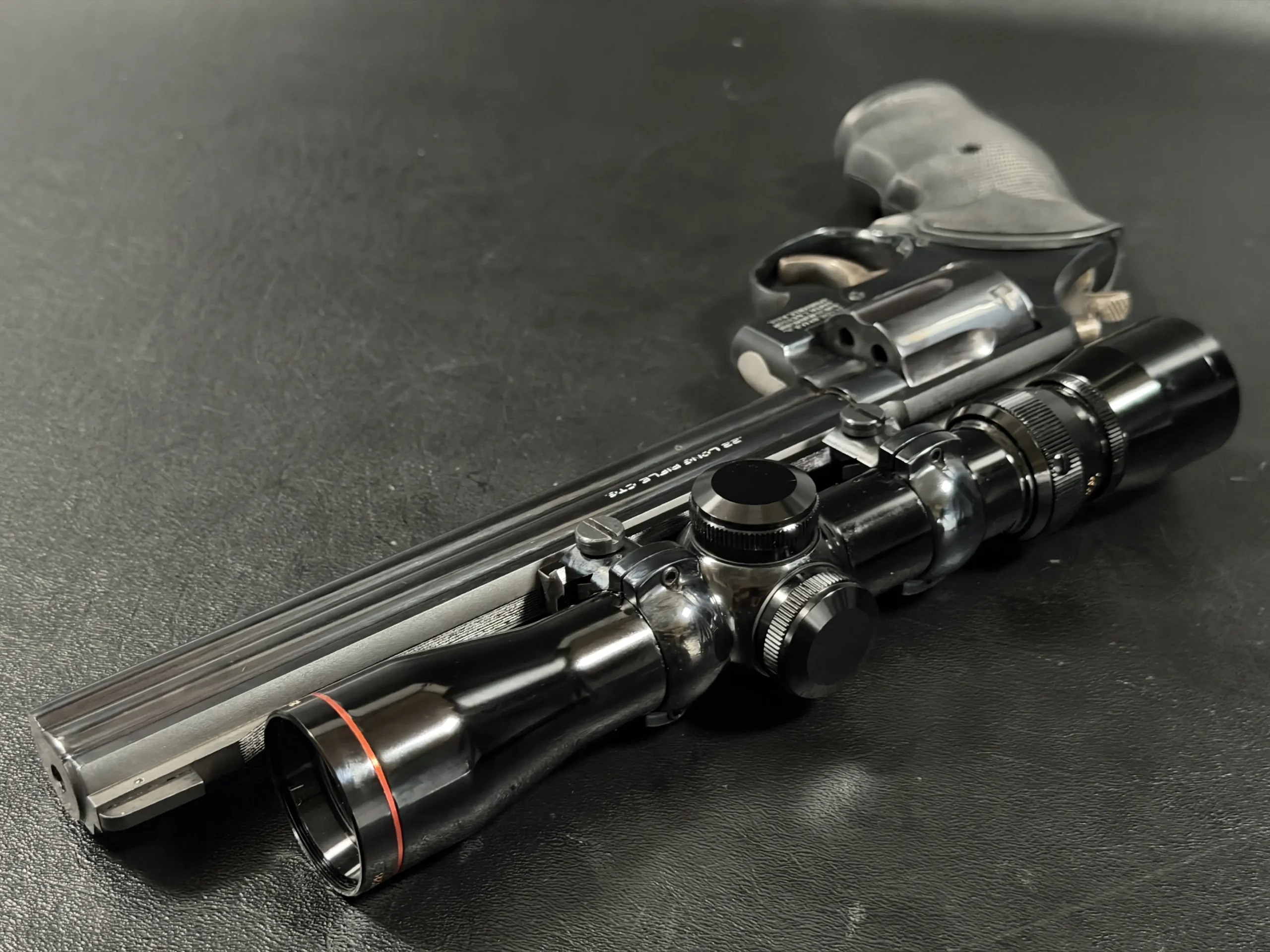 The revolver features a deep polished blue finish and an extended barrel profile with an integrated scope rail that highlights its experimental layout. Mounted on the barrel rib is a vintage Simmons 2.5x scope secured by a custom mount, matching the project’s goal of combining revolver portability with a scoped small-caliber hunting setup.