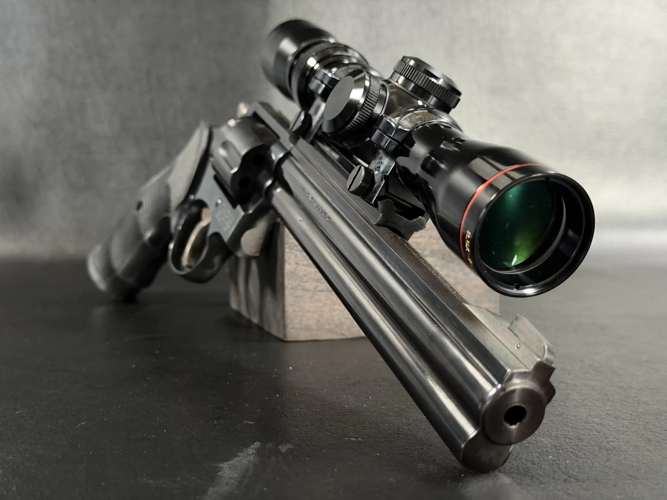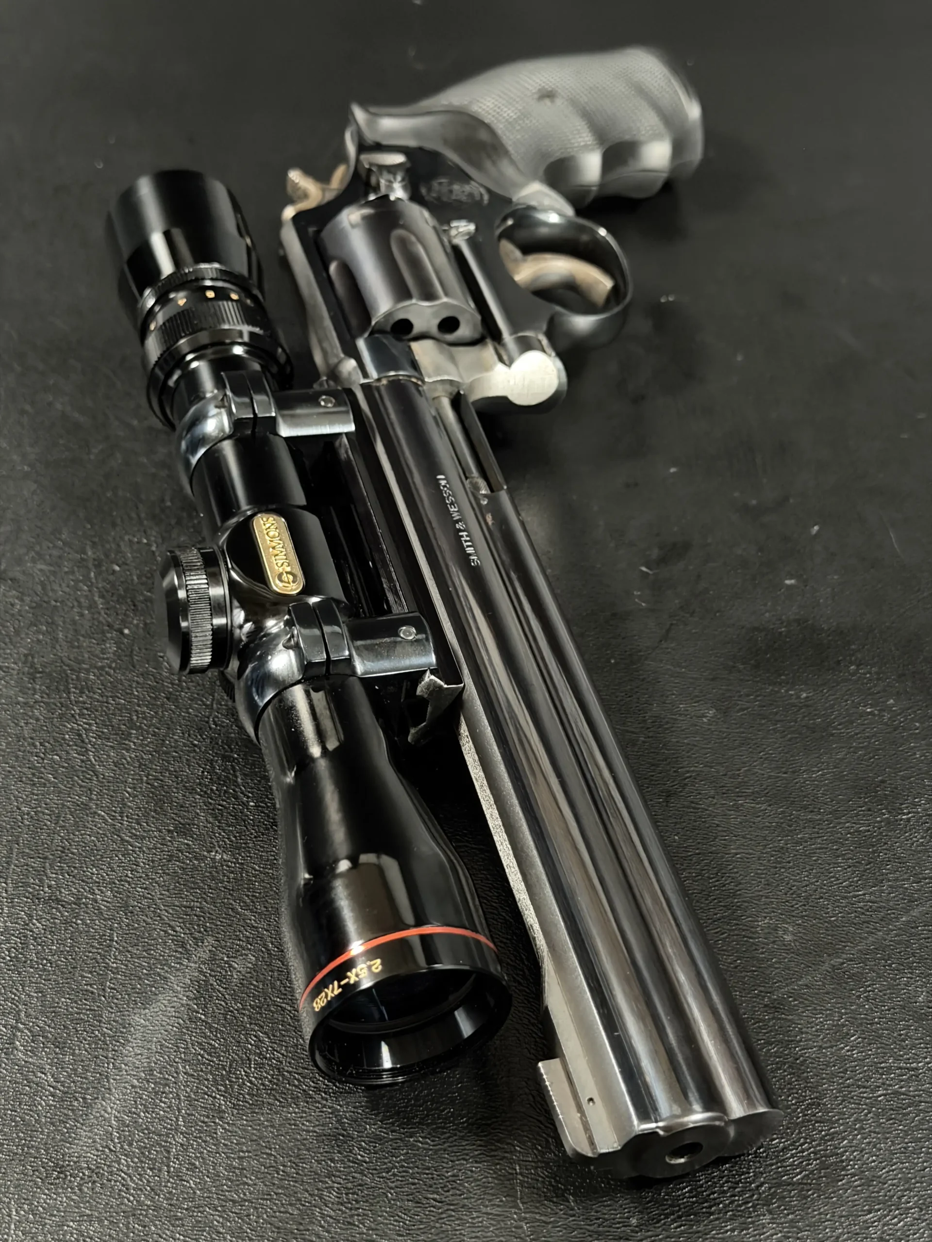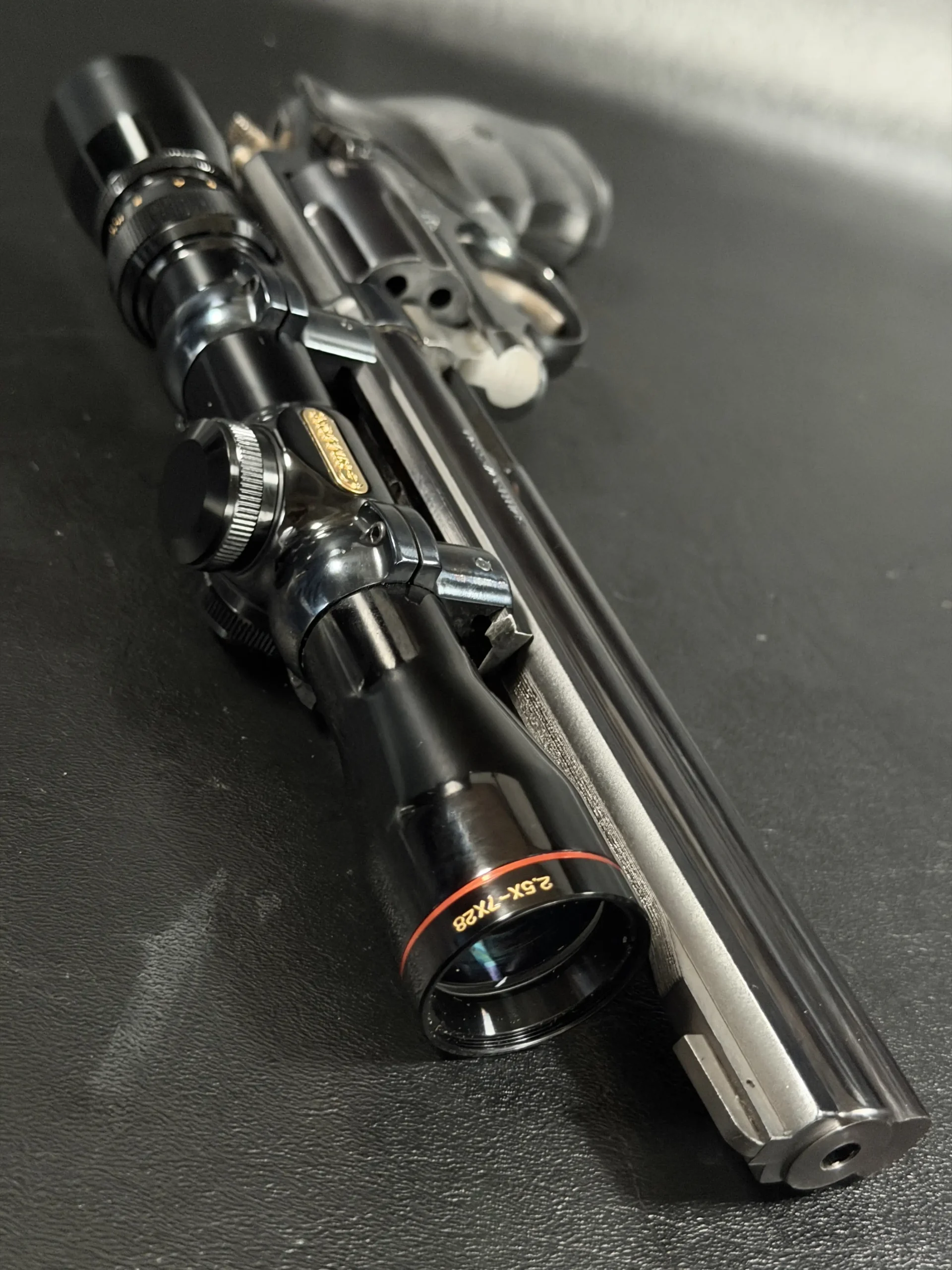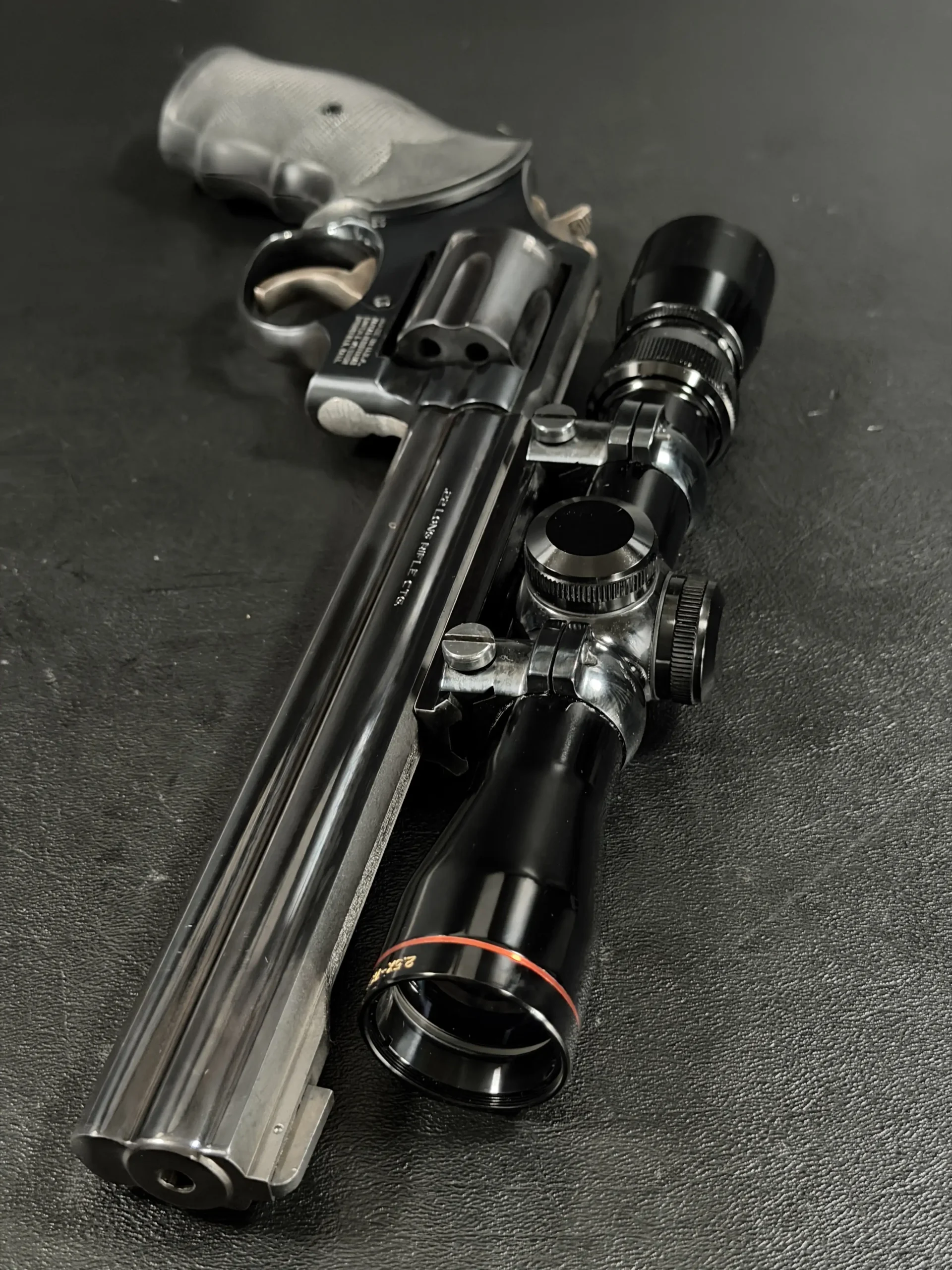 The revolver features a deep polished blue finish and an extended barrel profile with an integrated scope rail that highlights its experimental layout. Mounted on the barrel rib is a vintage Simmons 2.5x scope secured by a custom mount, matching the project’s goal of combining revolver portability with a scoped small-caliber hunting setup.