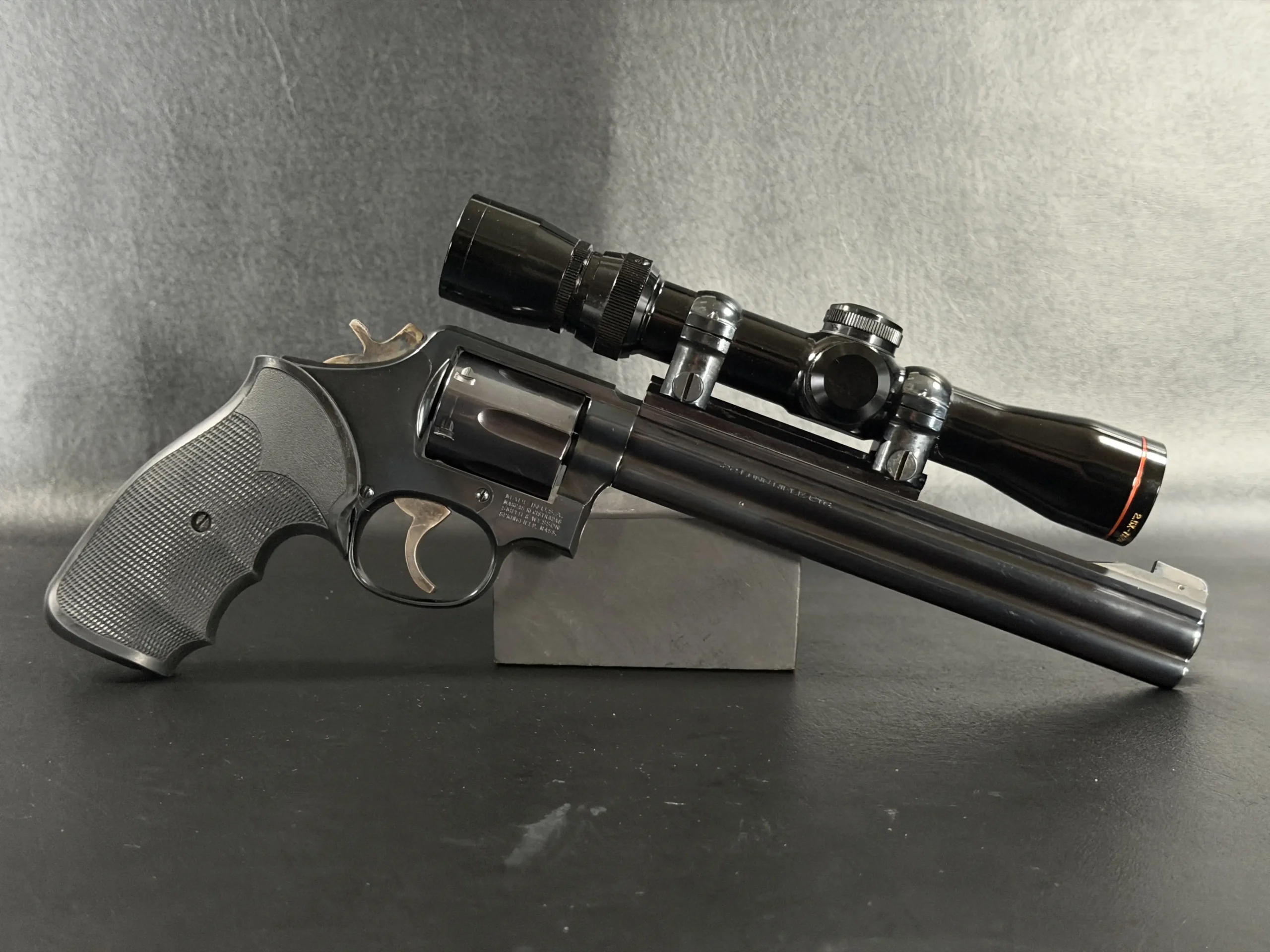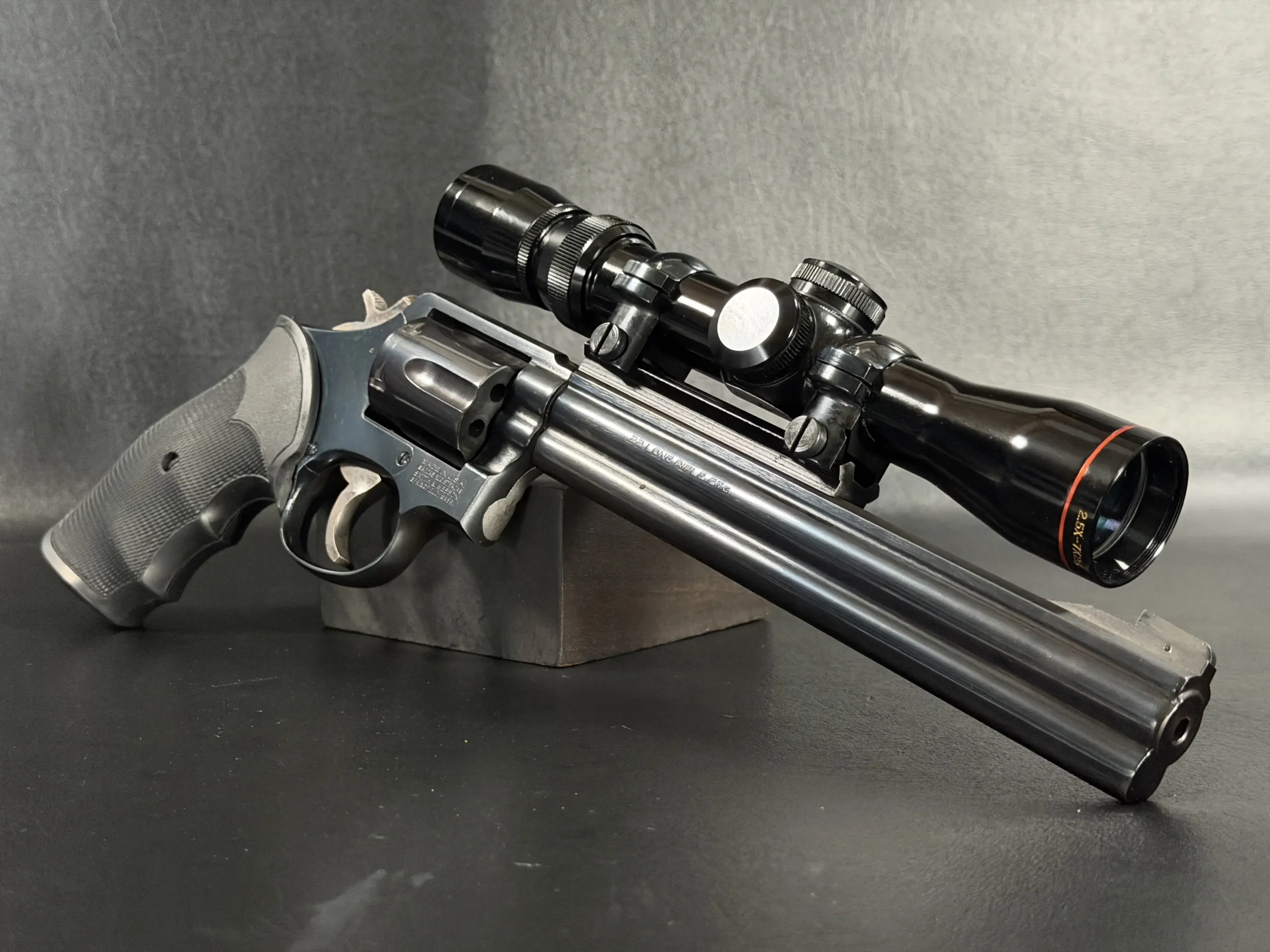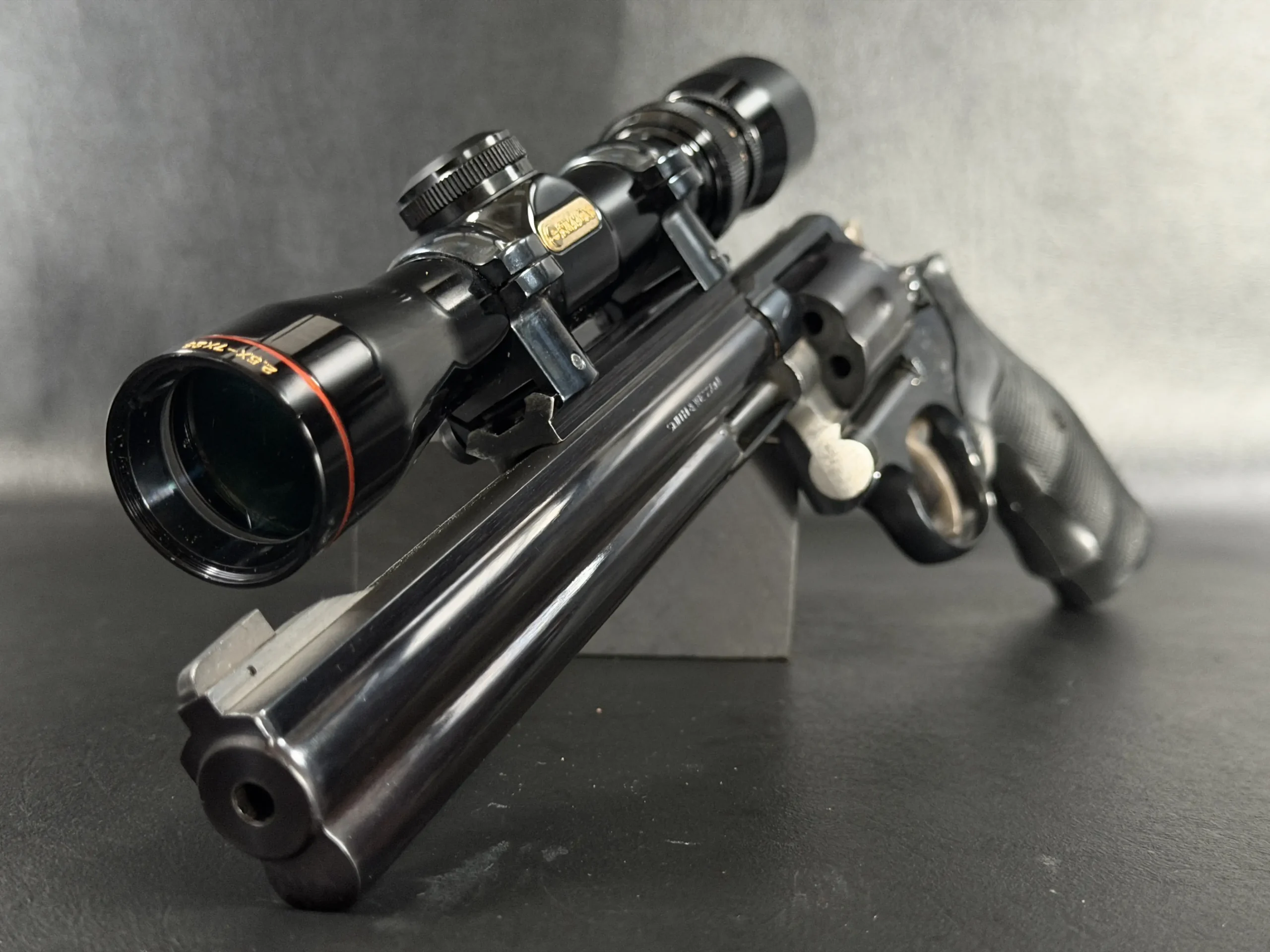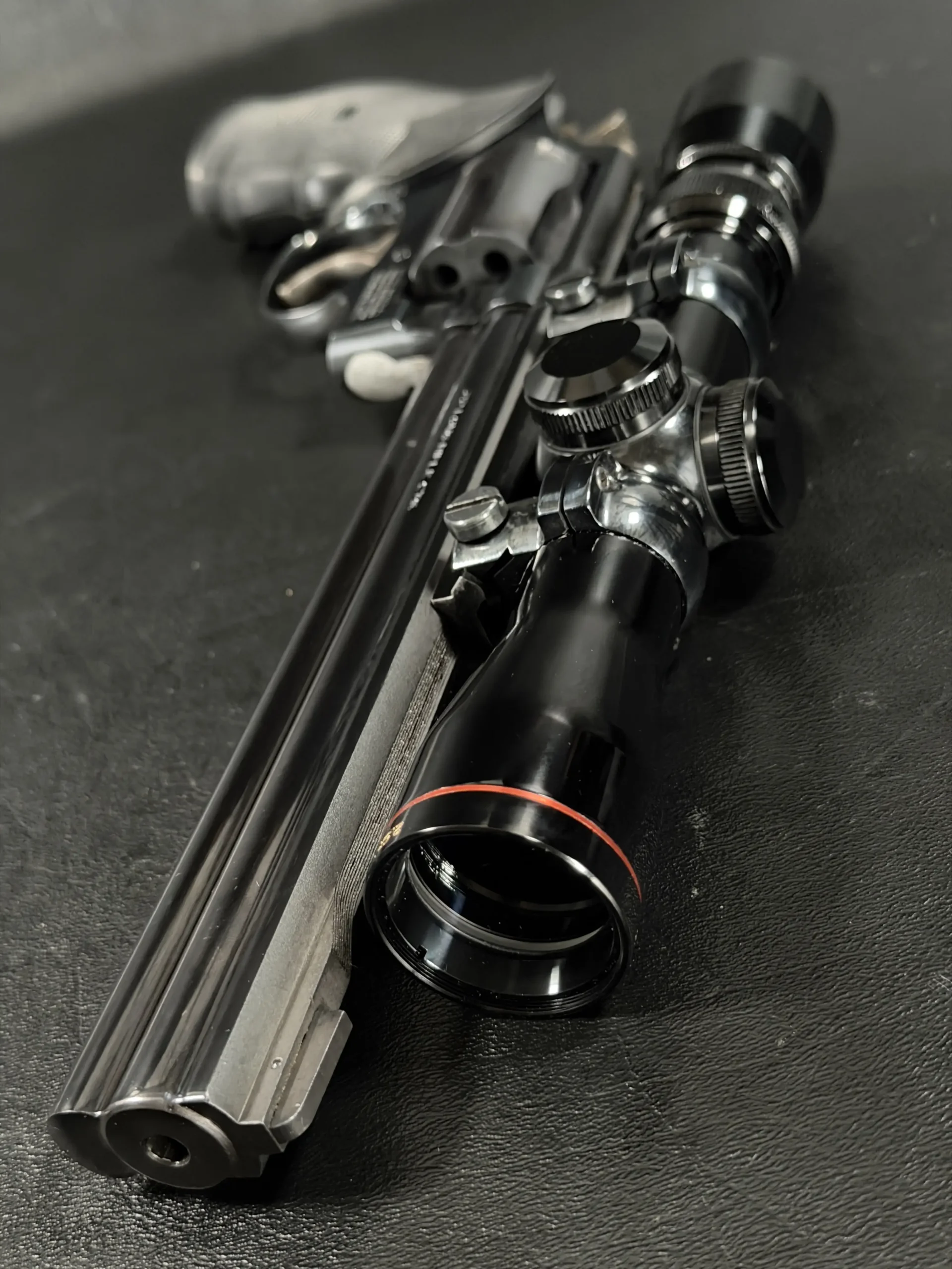 The revolver features a deep polished blue finish and an extended barrel profile with an integrated scope rail that highlights its experimental layout. Mounted on the barrel rib is a vintage Simmons 2.5x scope secured by a custom mount, matching the project’s goal of combining revolver portability with a scoped small-caliber hunting setup.