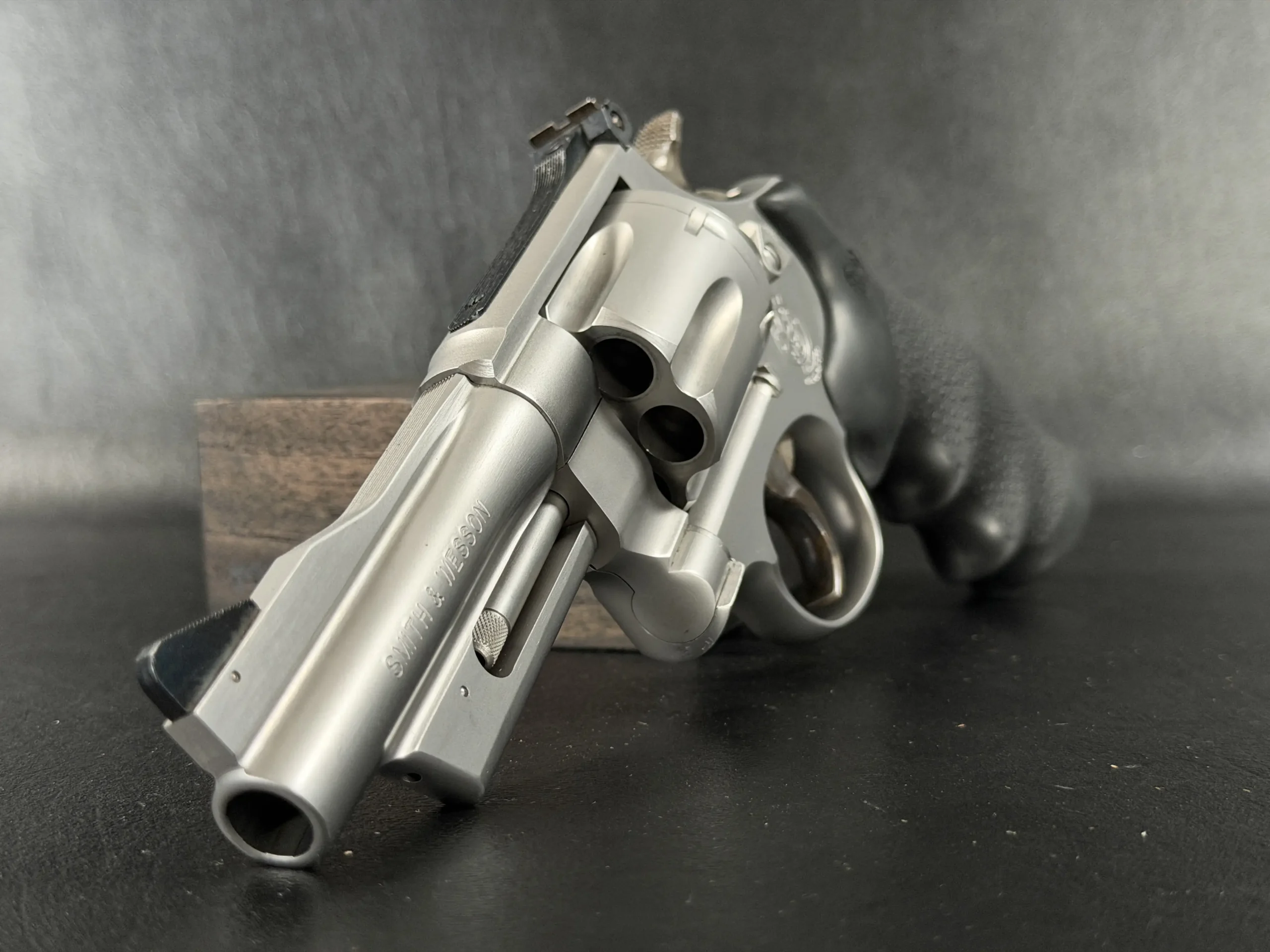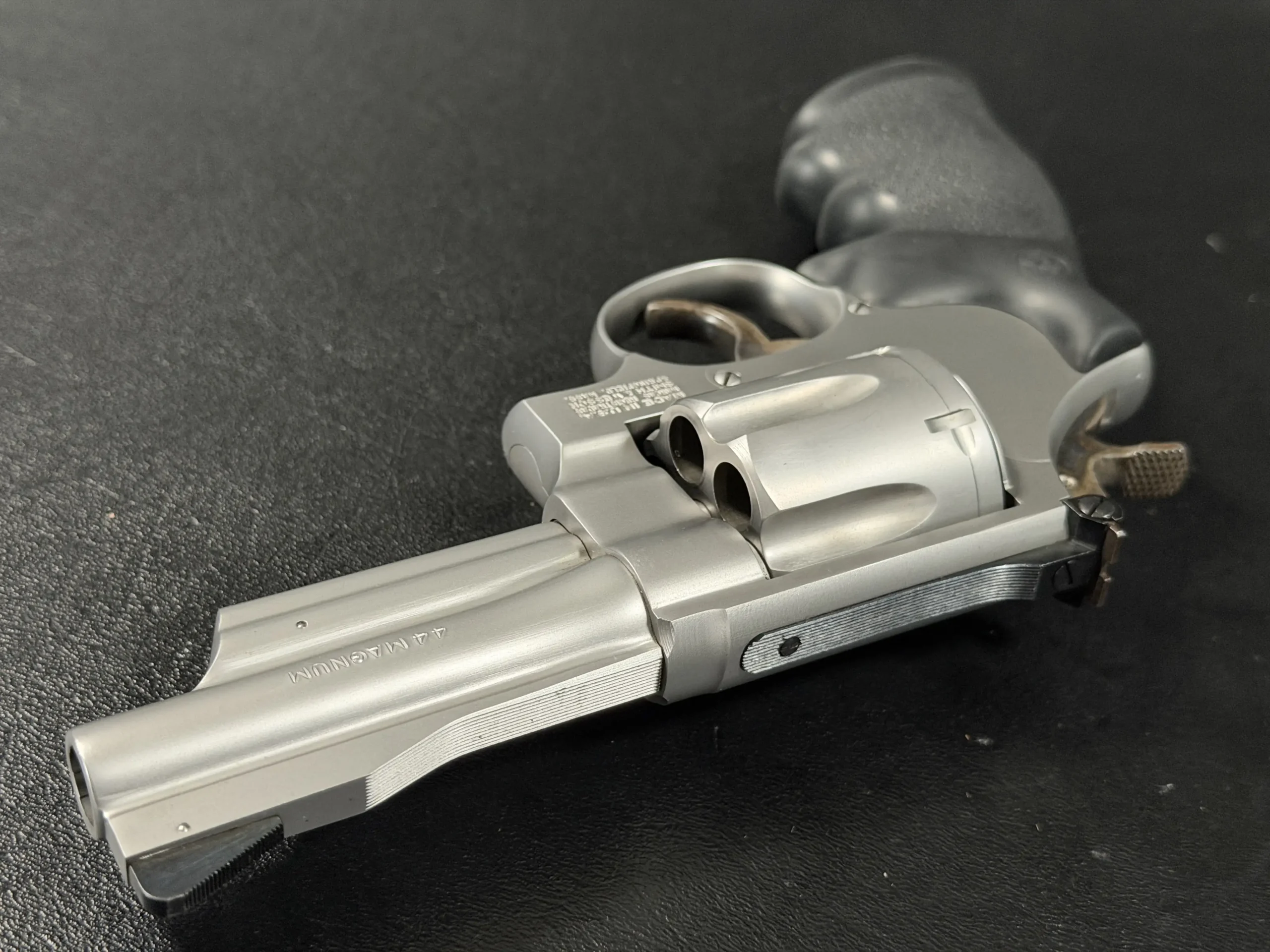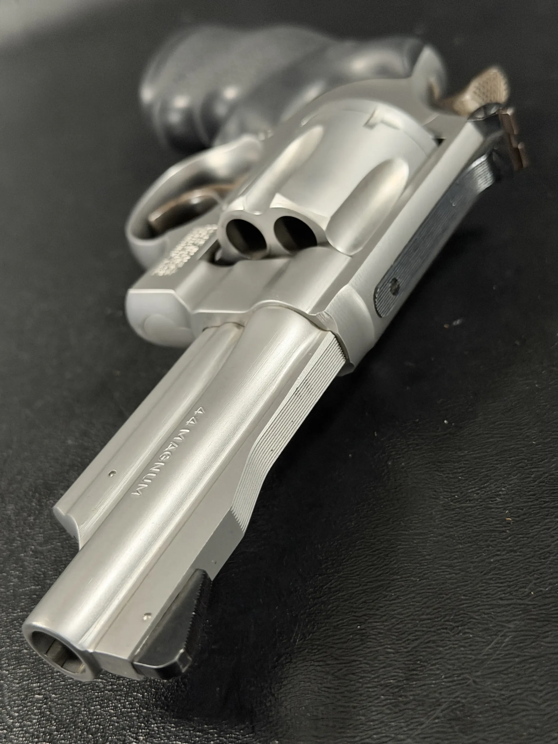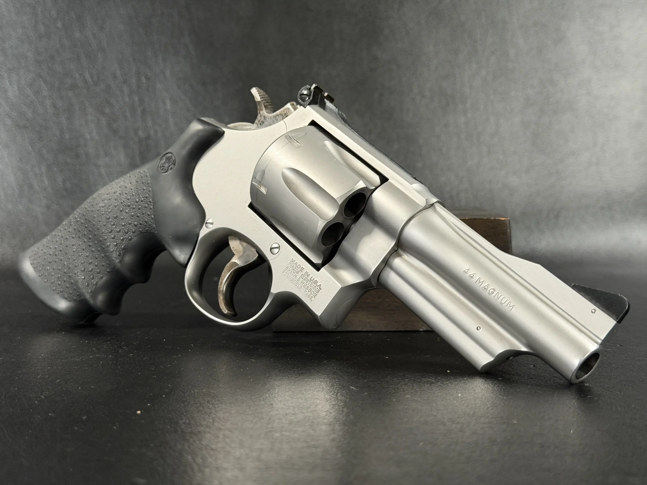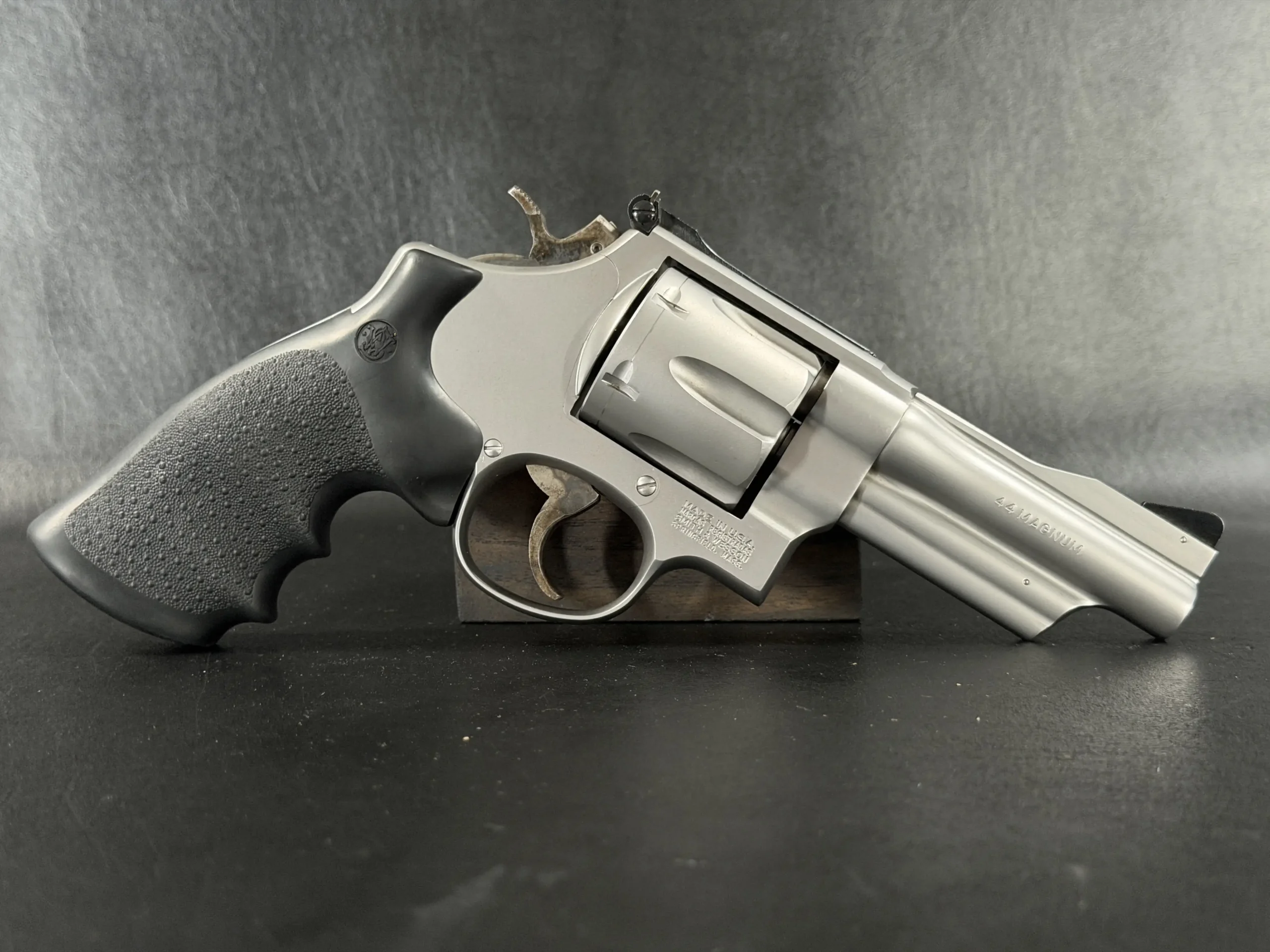 Chambered in .44 Magnum and built on Smith & Wesson’s large N-frame, this revolver features a 4-inch barrel, satin stainless steel finish, and full underlug. The fluted cylinder, clean barrel profile, and substantial frame give it the classic look and feel associated with the Model 629 line.