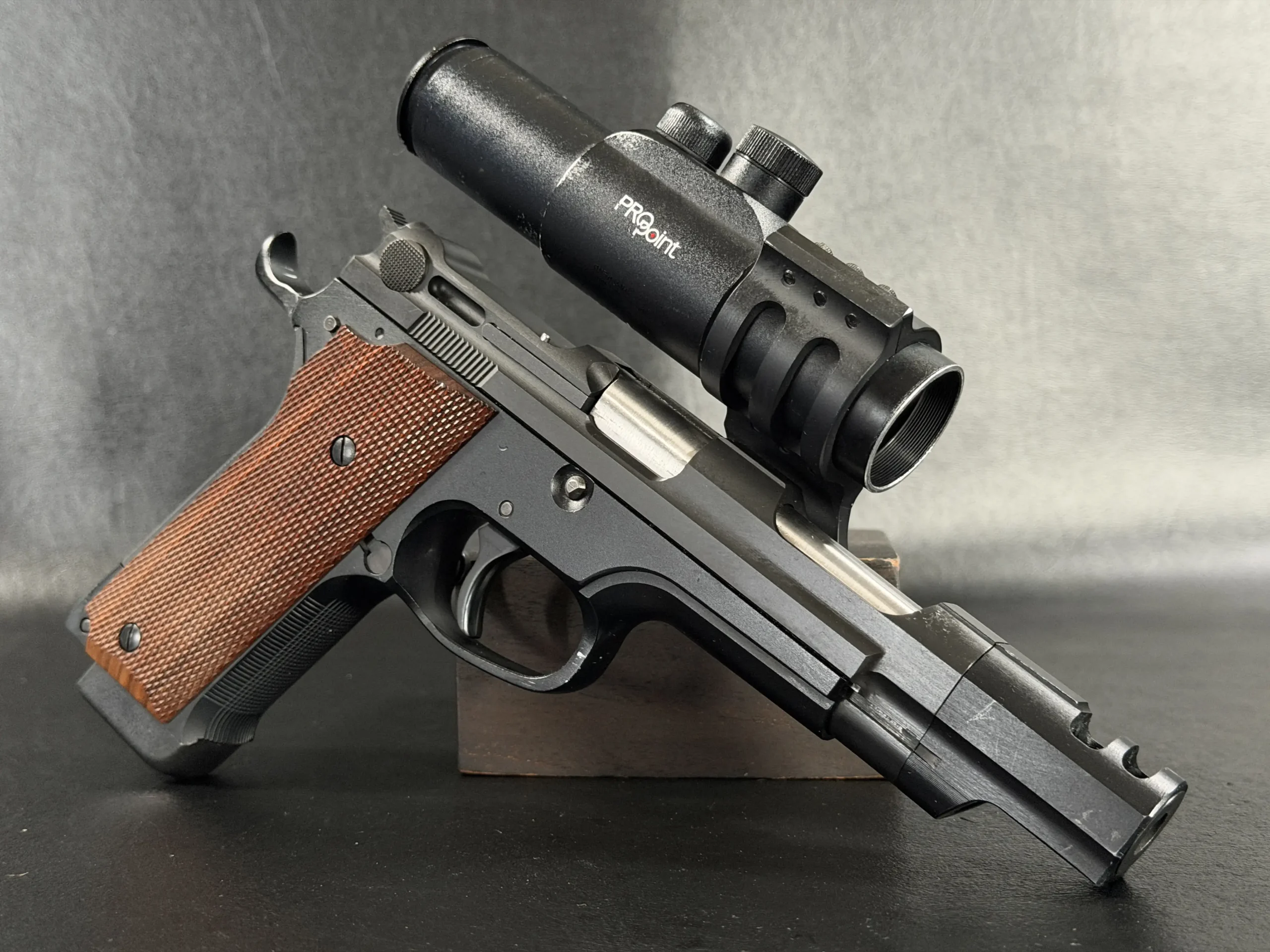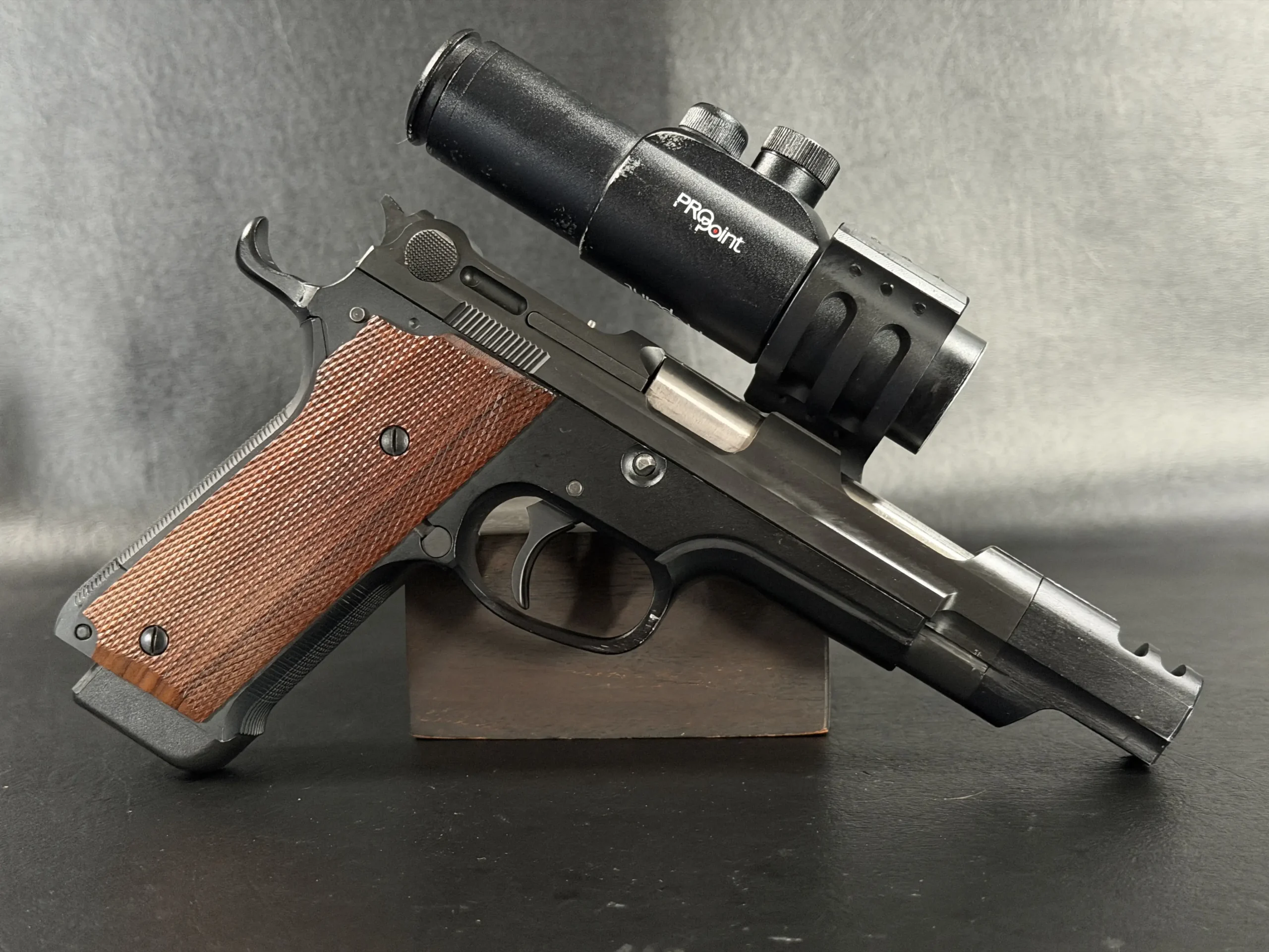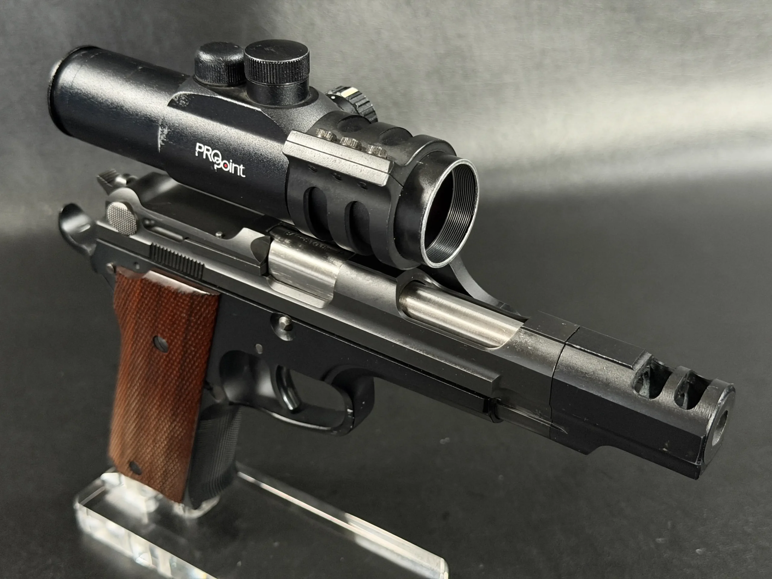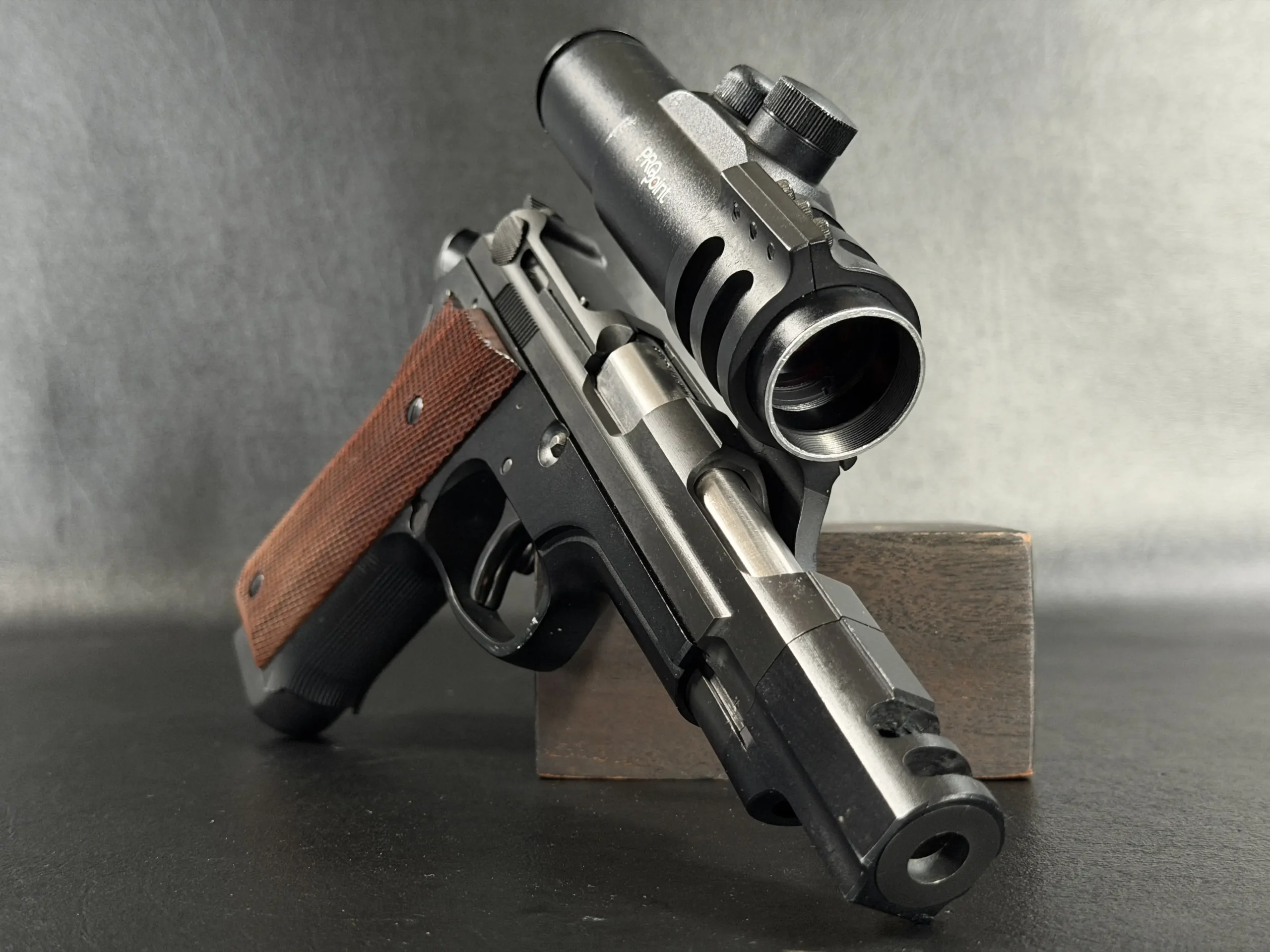 This example features a 4.5-inch barrel with an integrated compensator, along with a scope rail system fitted with a period ProPoint optic. The setup reflects the competition-oriented approach of the era, when practical shooting pistols were increasingly being configured for faster follow-up shots and optical sights.
