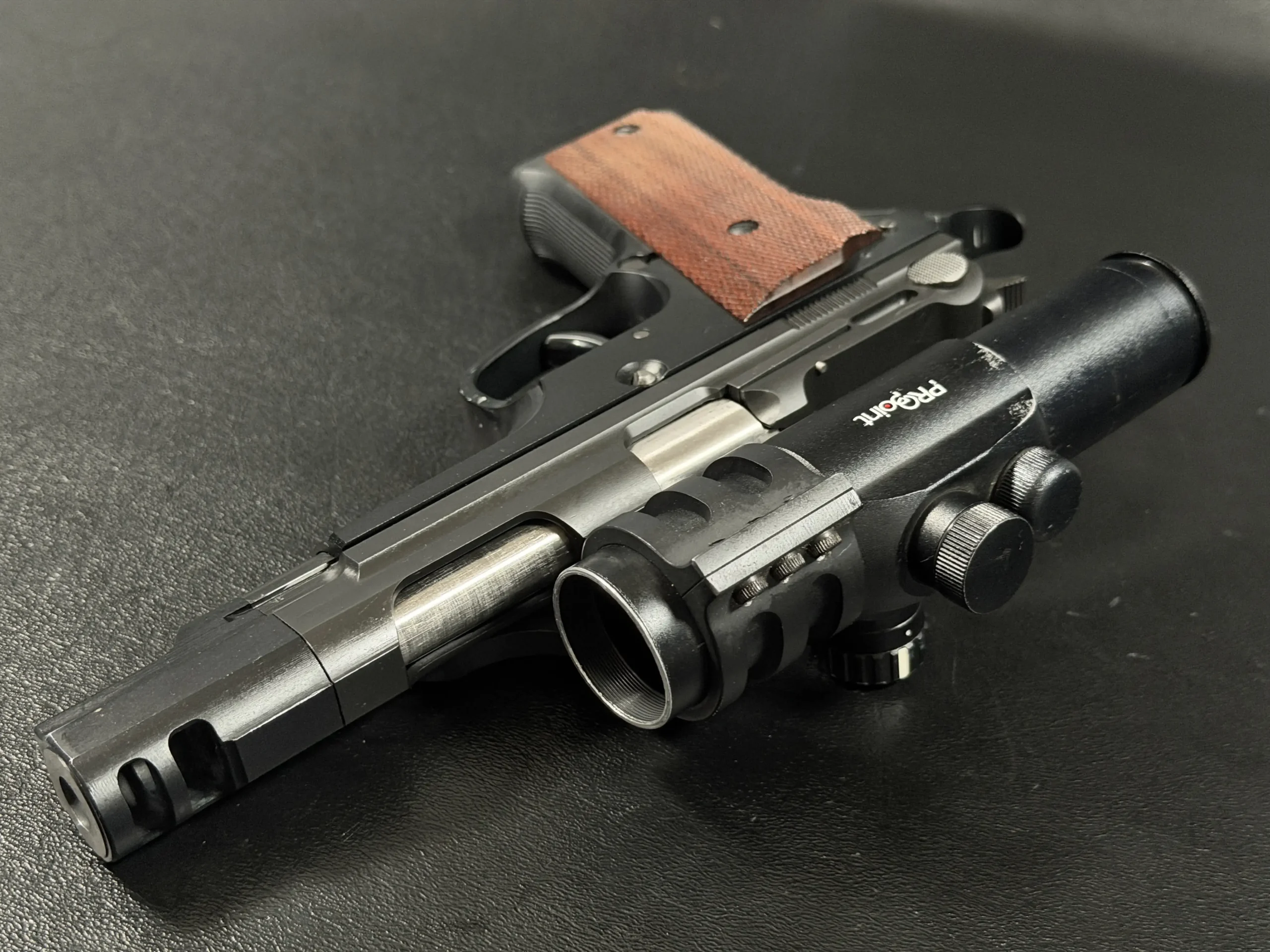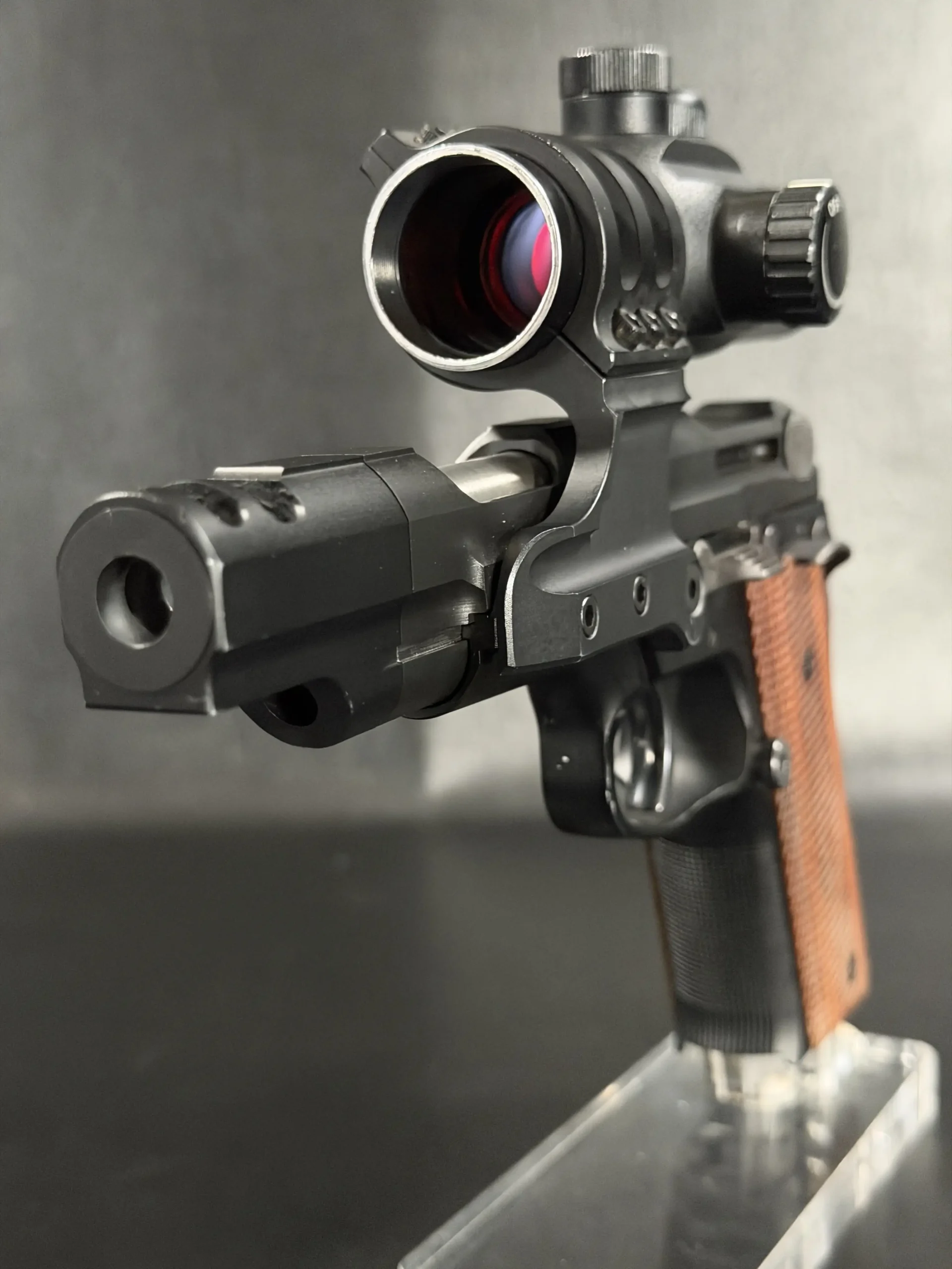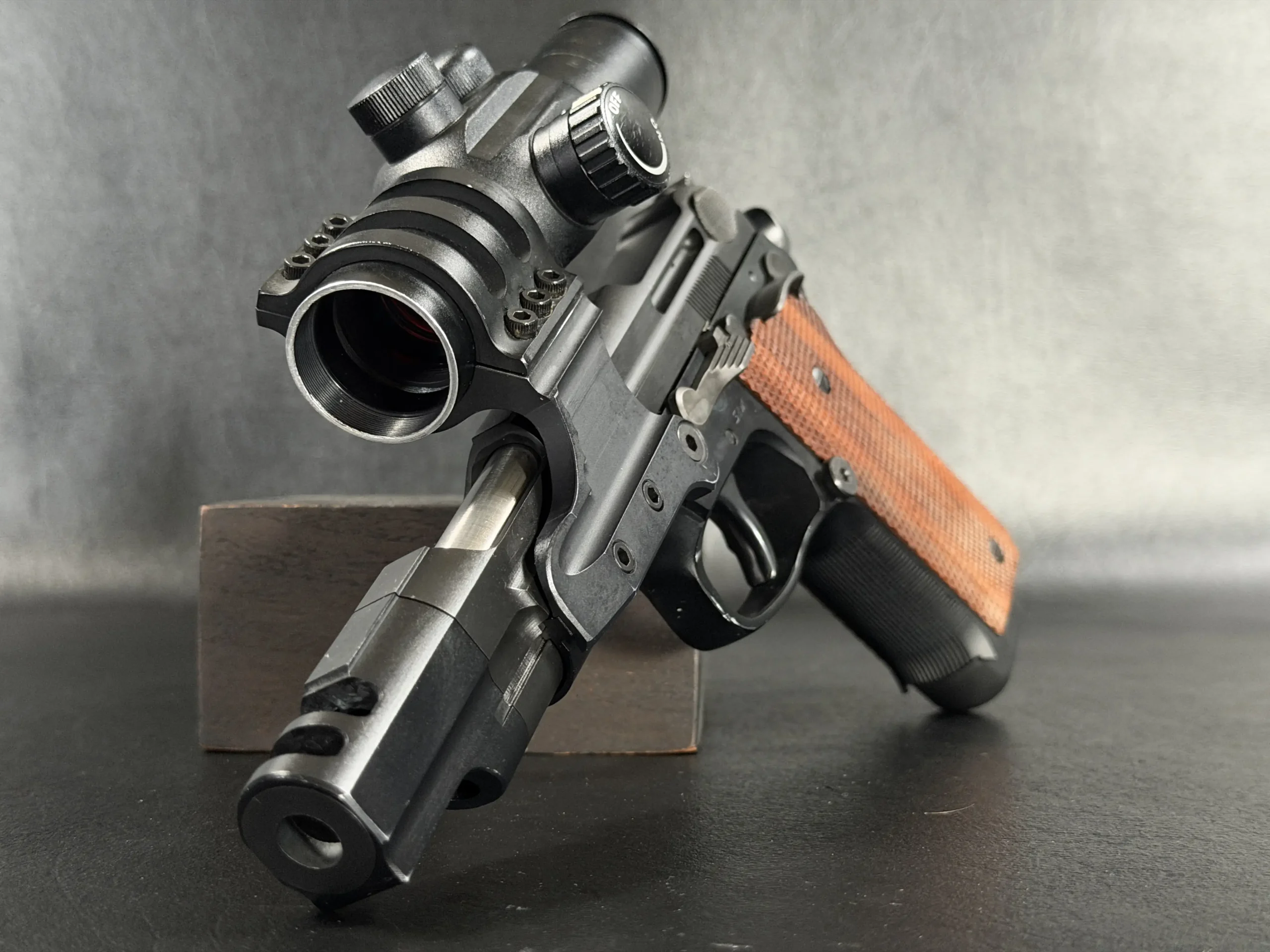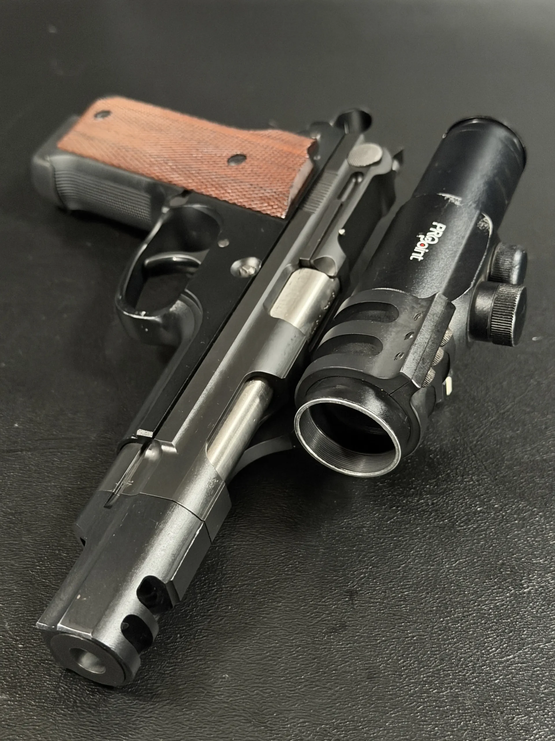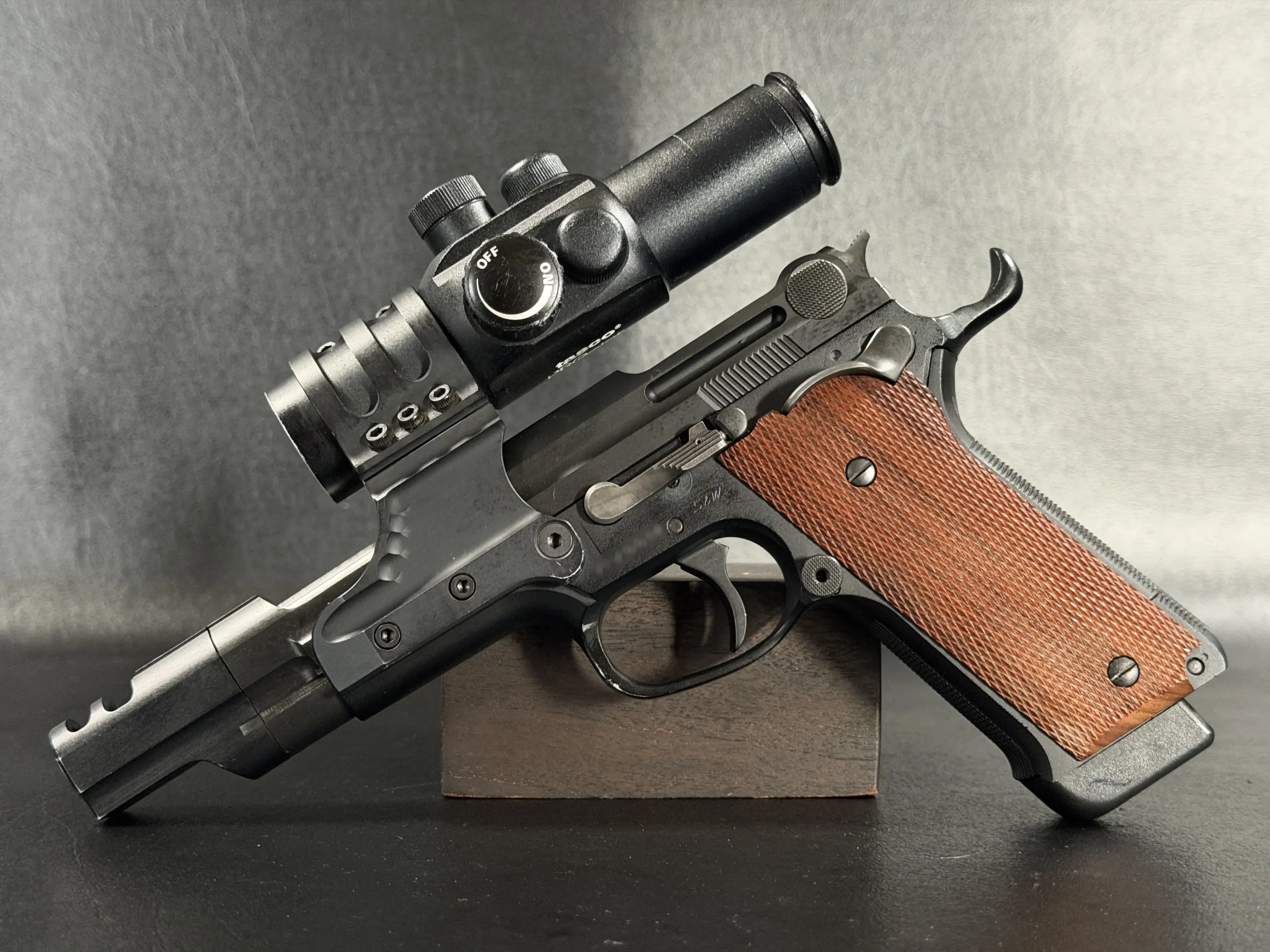 This example features a 4.5-inch barrel with an integrated compensator, along with a scope rail system fitted with a period ProPoint optic. The setup reflects the competition-oriented approach of the era, when practical shooting pistols were increasingly being configured for faster follow-up shots and optical sights.