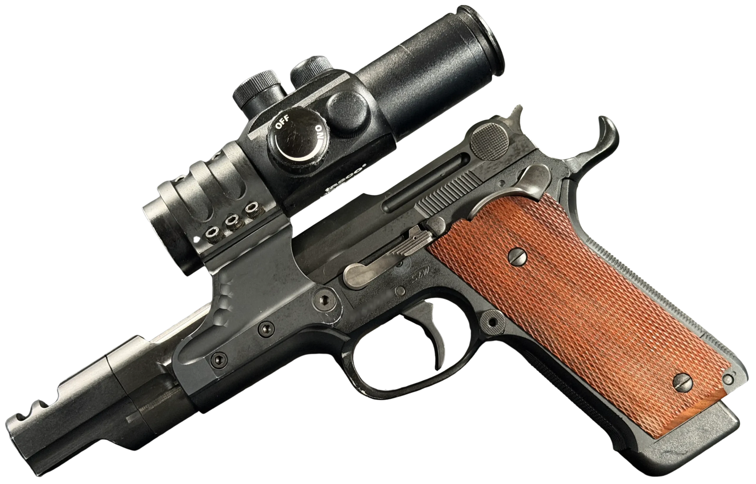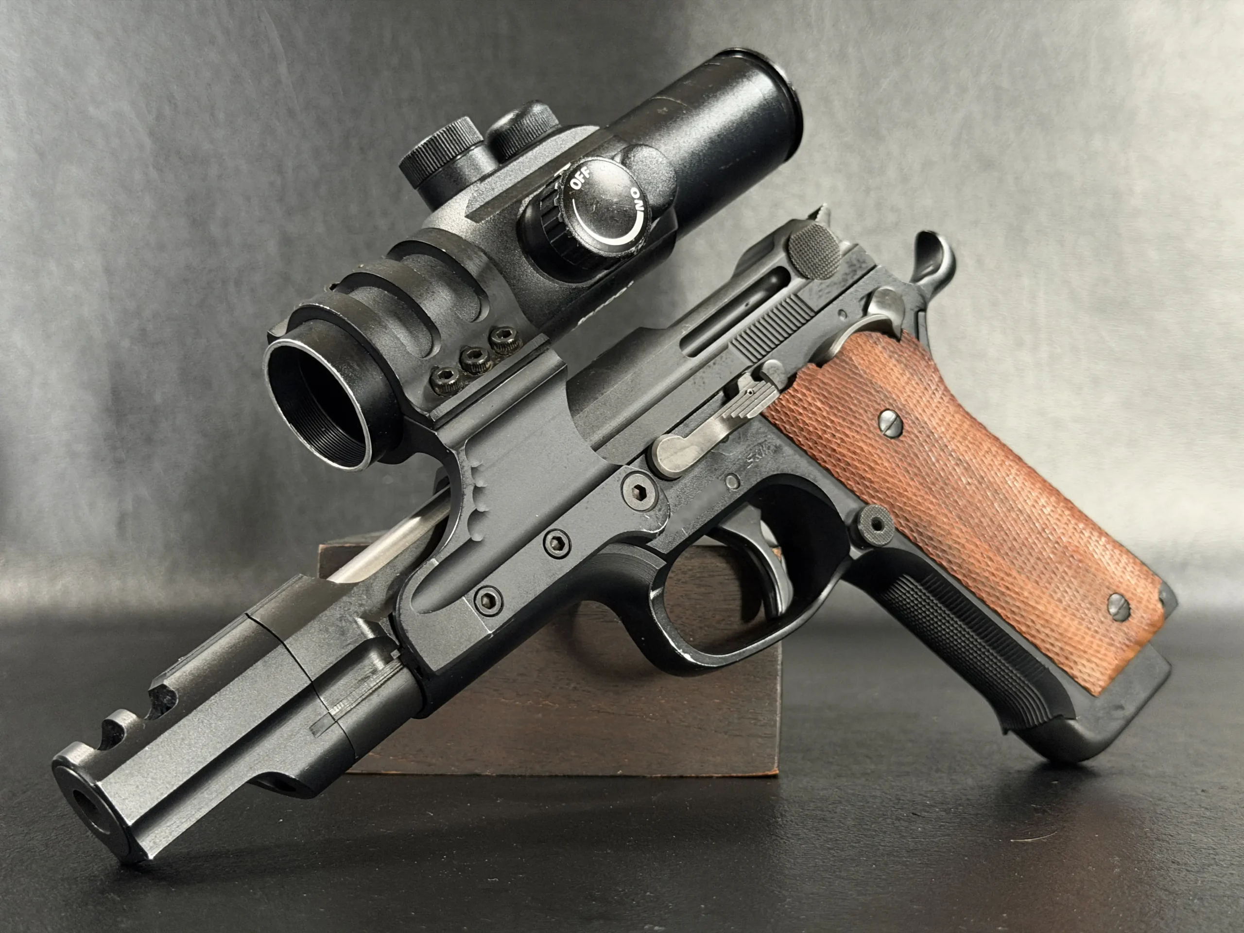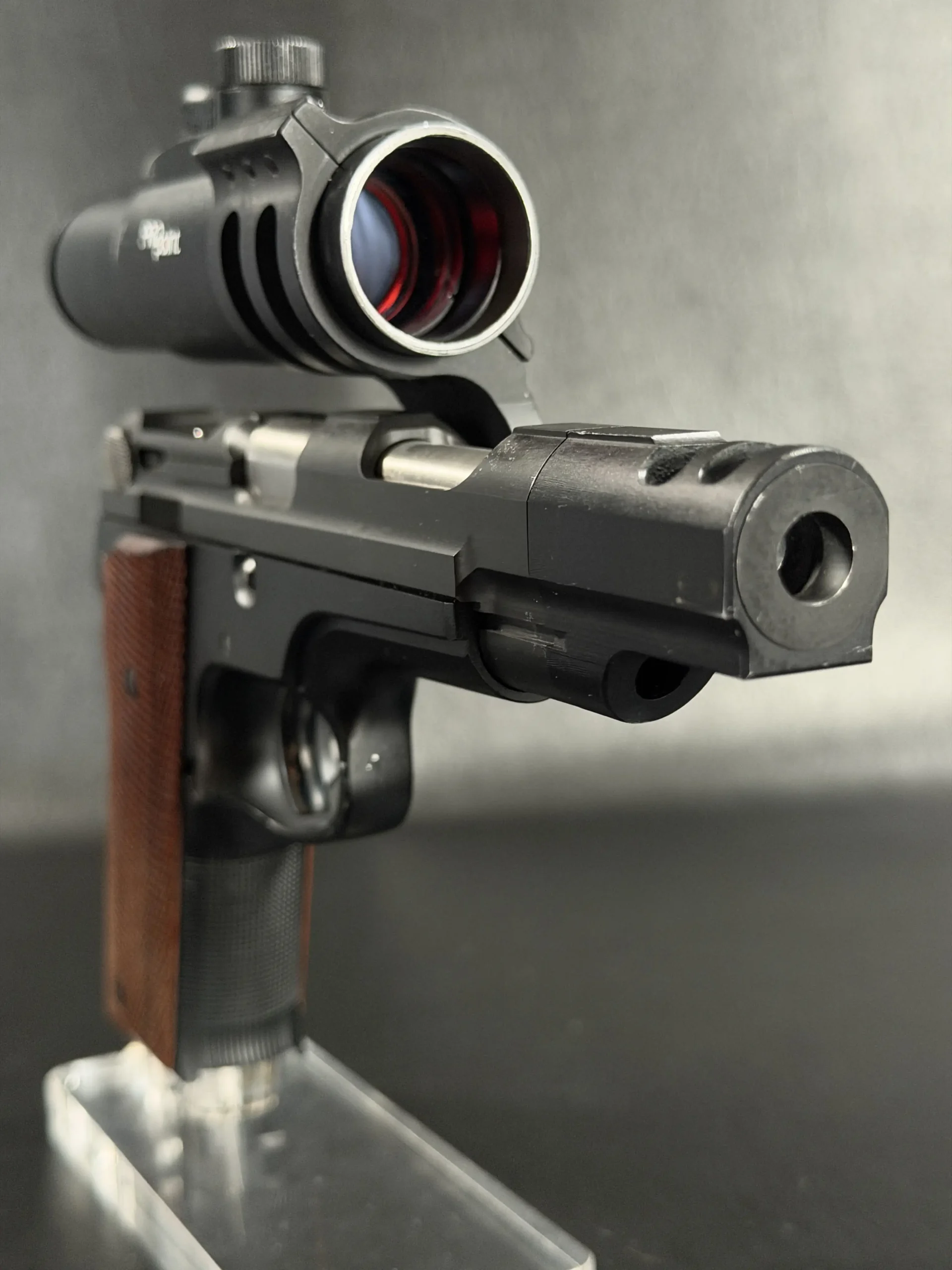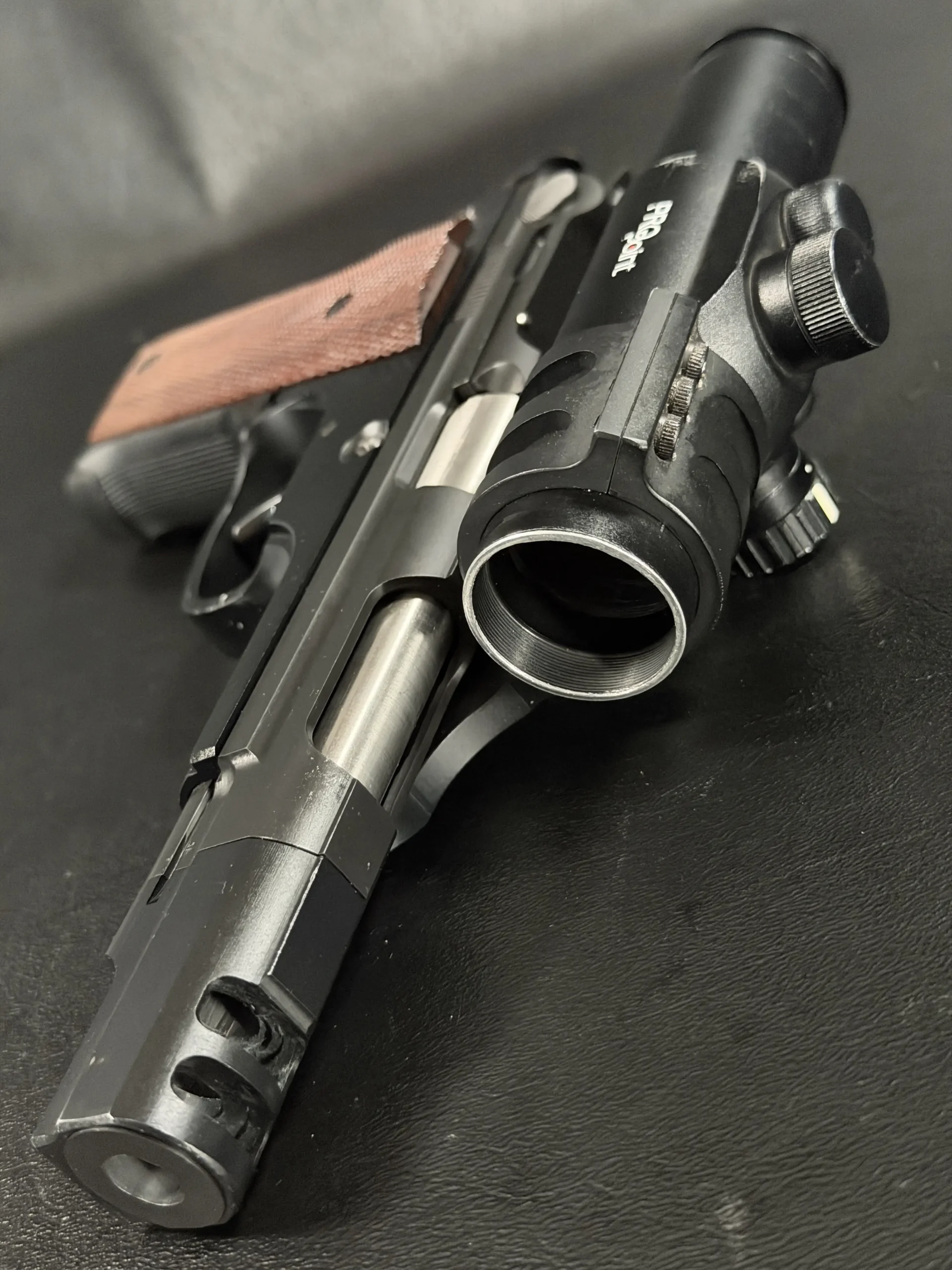 This example features a 4.5-inch barrel with an integrated compensator, along with a scope rail system fitted with a period ProPoint optic. The setup reflects the competition-oriented approach of the era, when practical shooting pistols were increasingly being configured for faster follow-up shots and optical sights.
