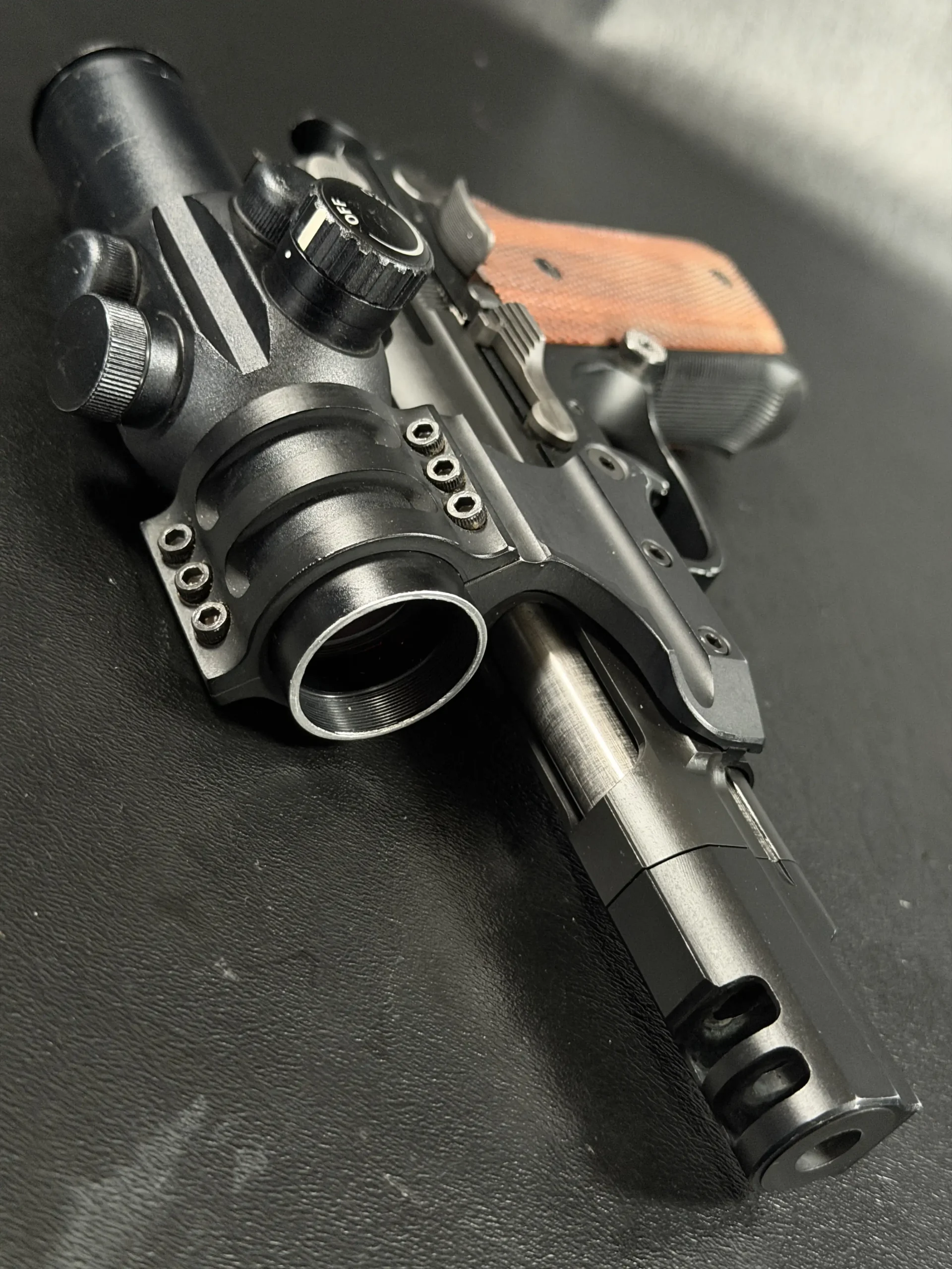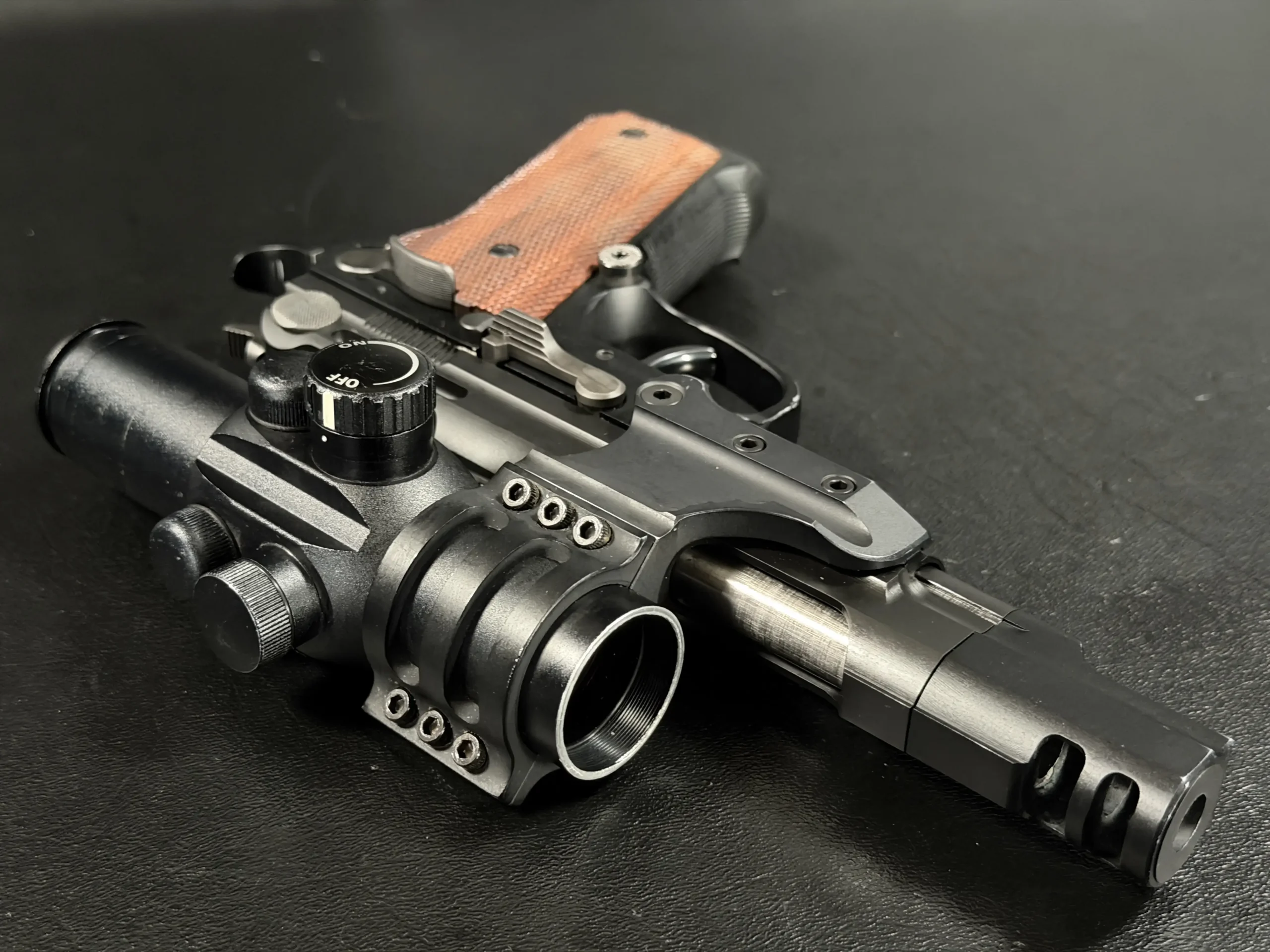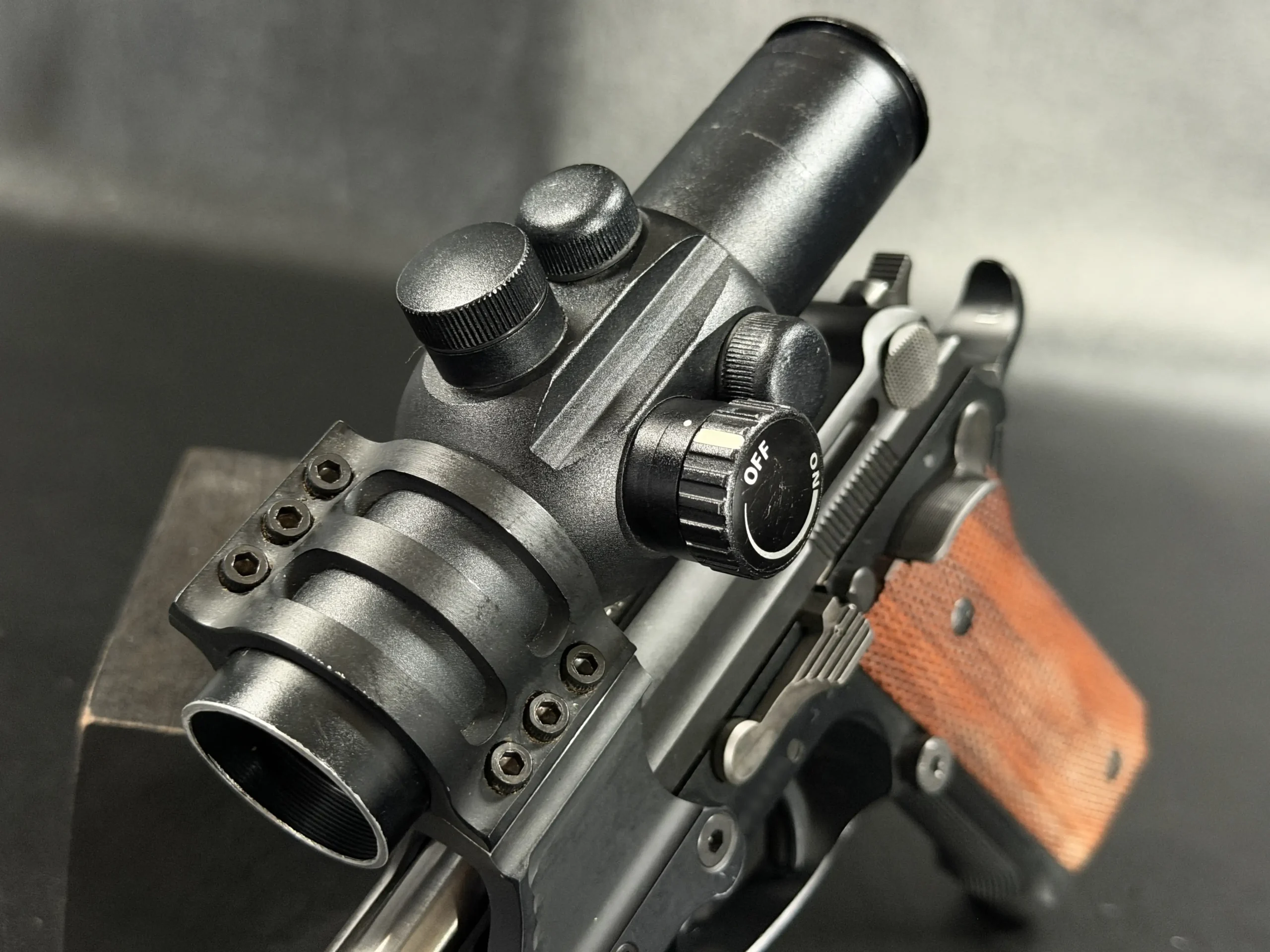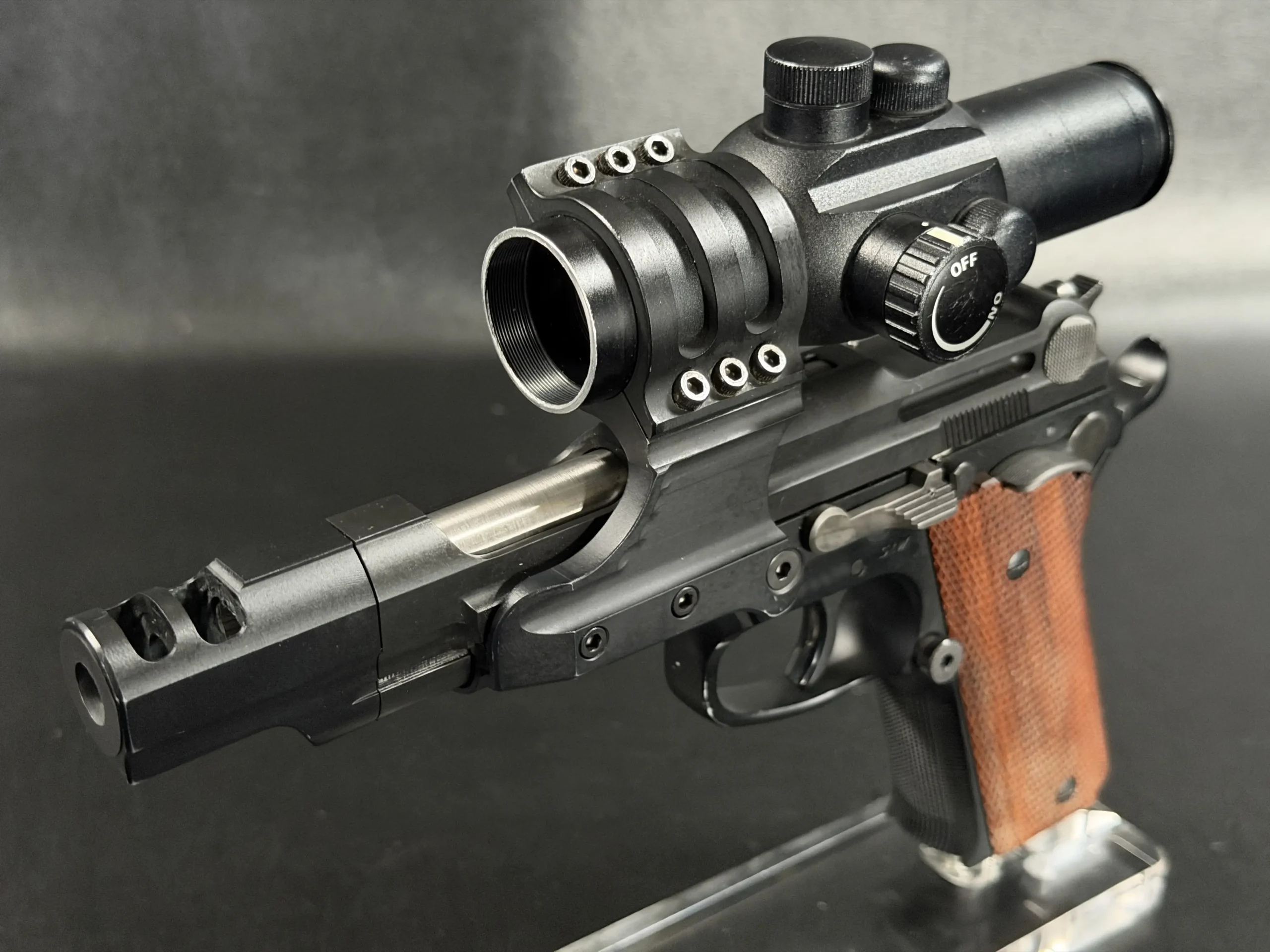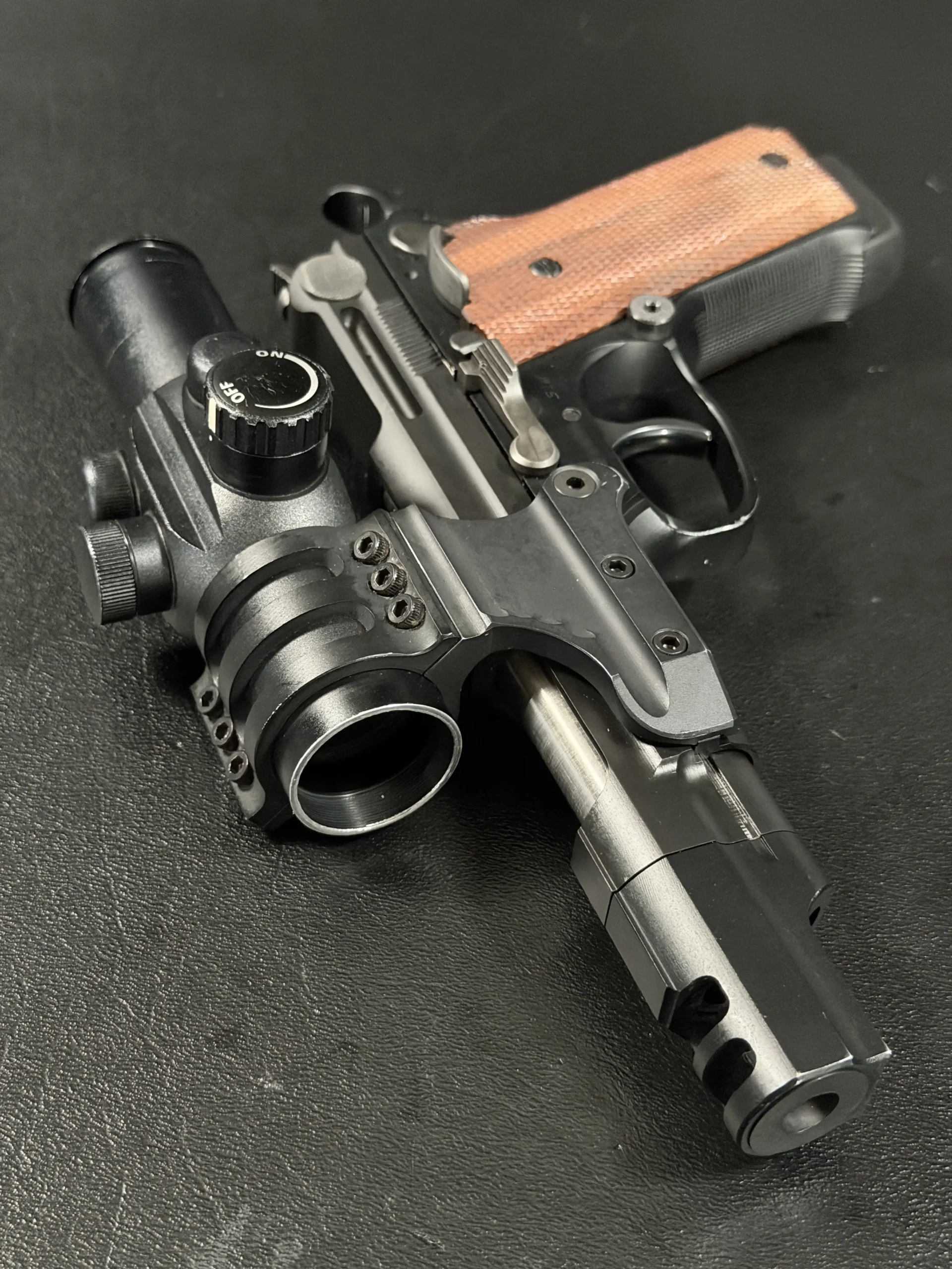 This example features a 4.5-inch barrel with an integrated compensator, along with a scope rail system fitted with a period ProPoint optic. The setup reflects the competition-oriented approach of the era, when practical shooting pistols were increasingly being configured for faster follow-up shots and optical sights.