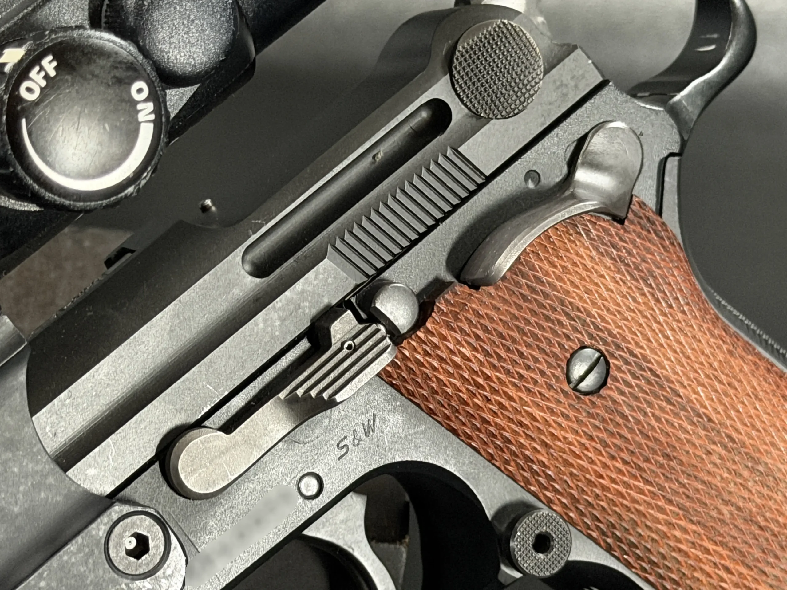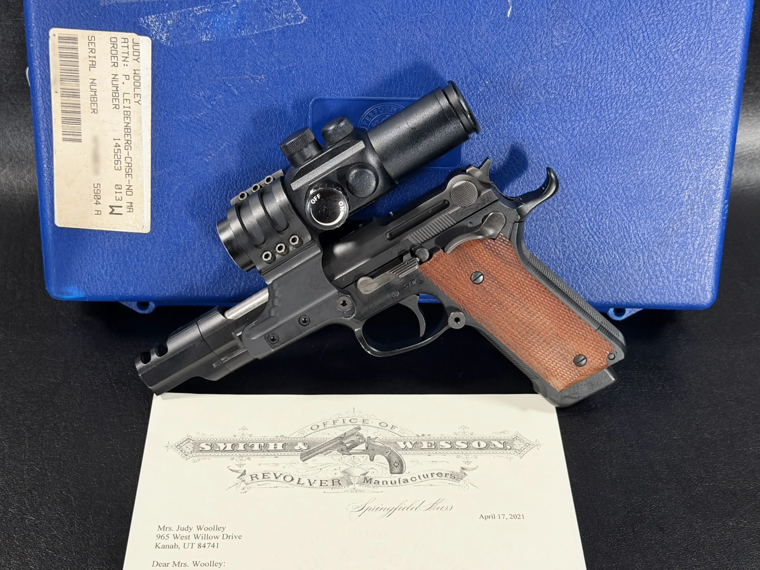Additional details include a tuned single- and double-action trigger, matte black finish, two-piece checkered wood grips, and a precision-machined mount system. Altogether, it is a distinctive Performance Center prototype tied to an important period in Smith & Wesson competition pistol development.