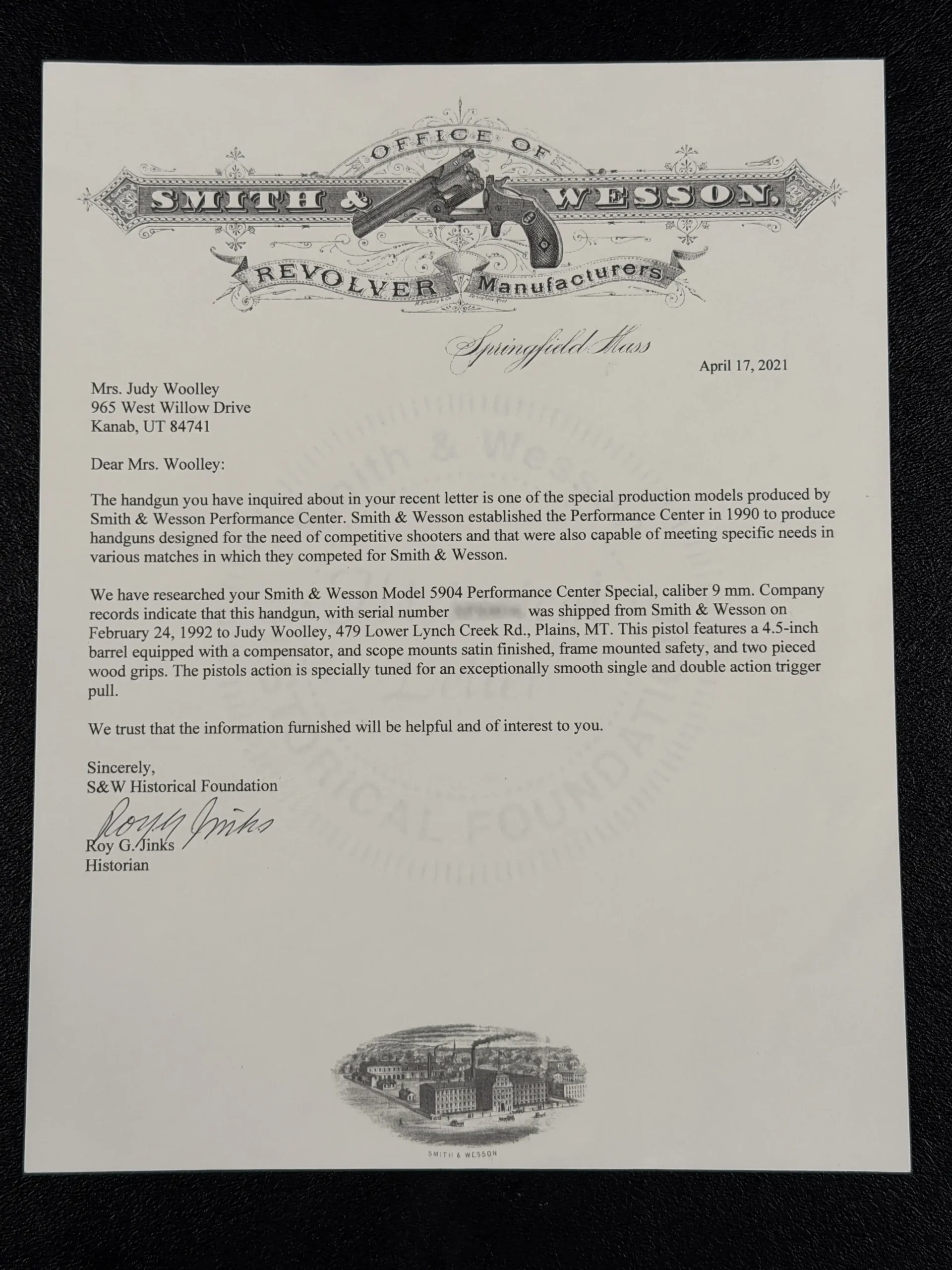 The Smith & Wesson Model 5904 Performance Center prototype is a 9mm pistol from the early years of the Performance Center, built in a special configuration for competitive shooting. A Smith & Wesson Historical Foundation letter confirms that it was shipped in 1992 to champion shooter Judy Woolley.