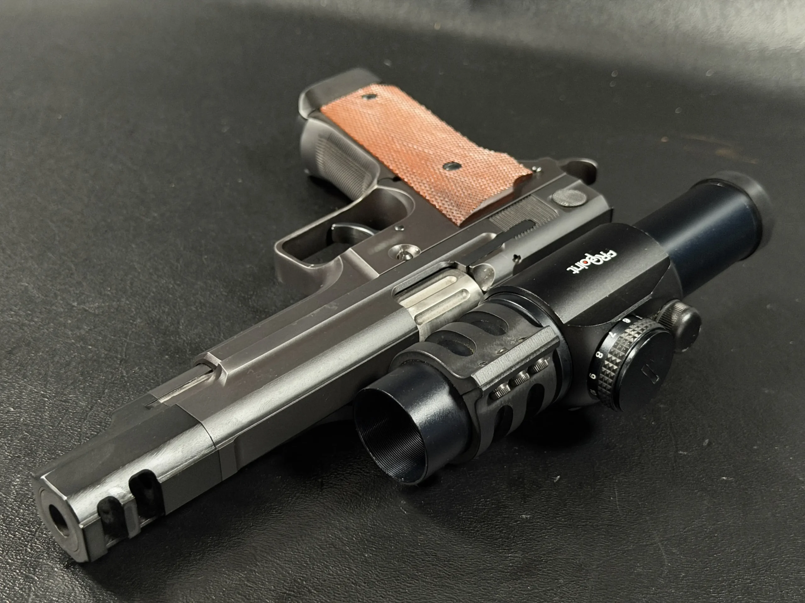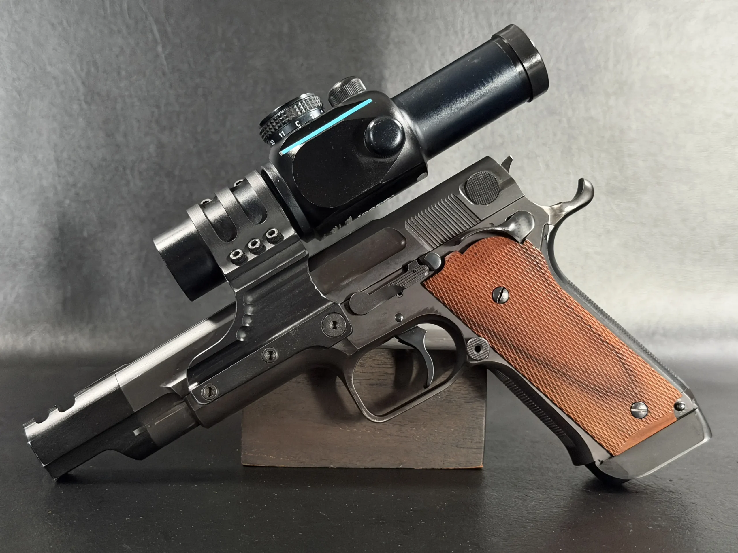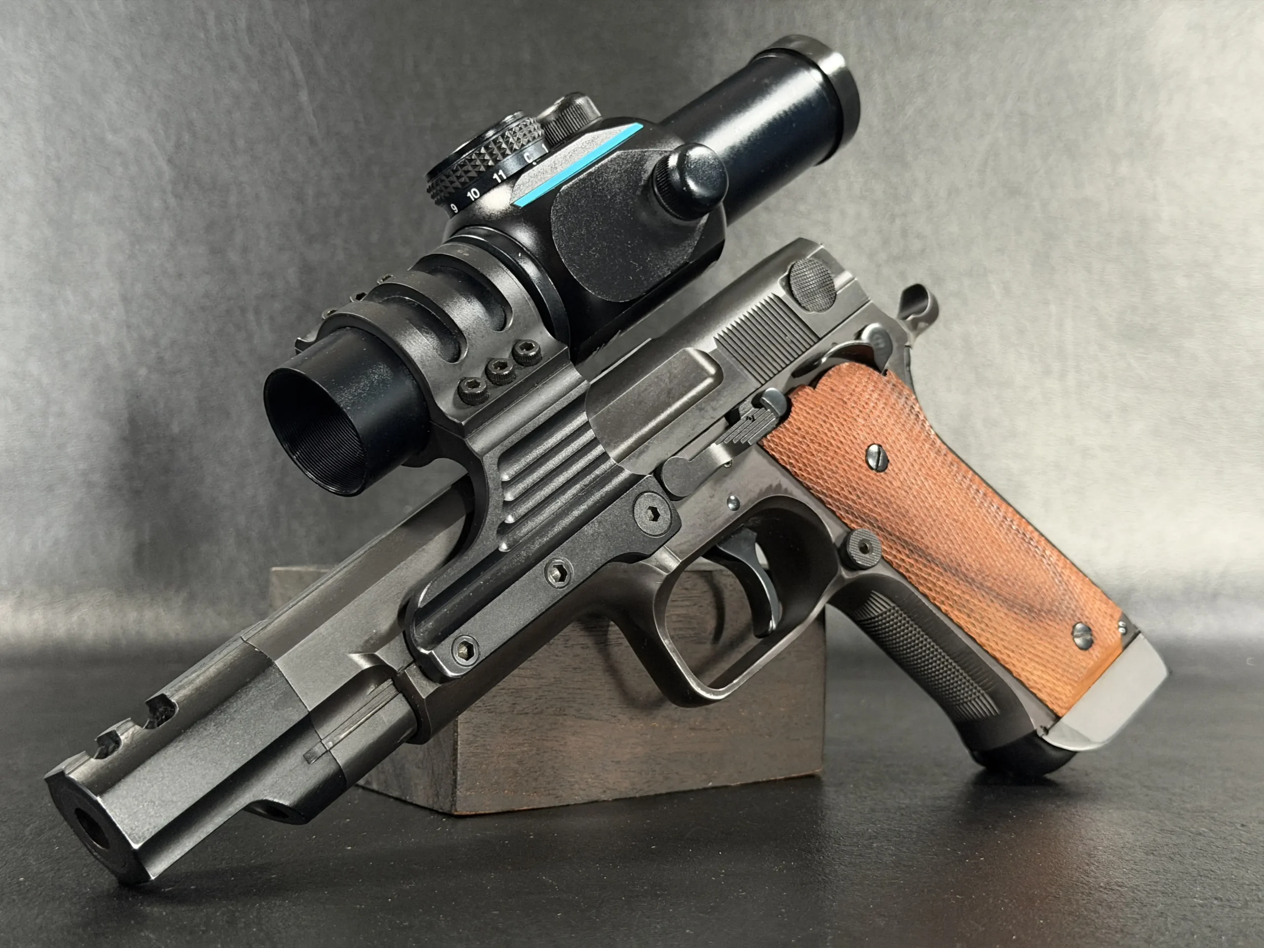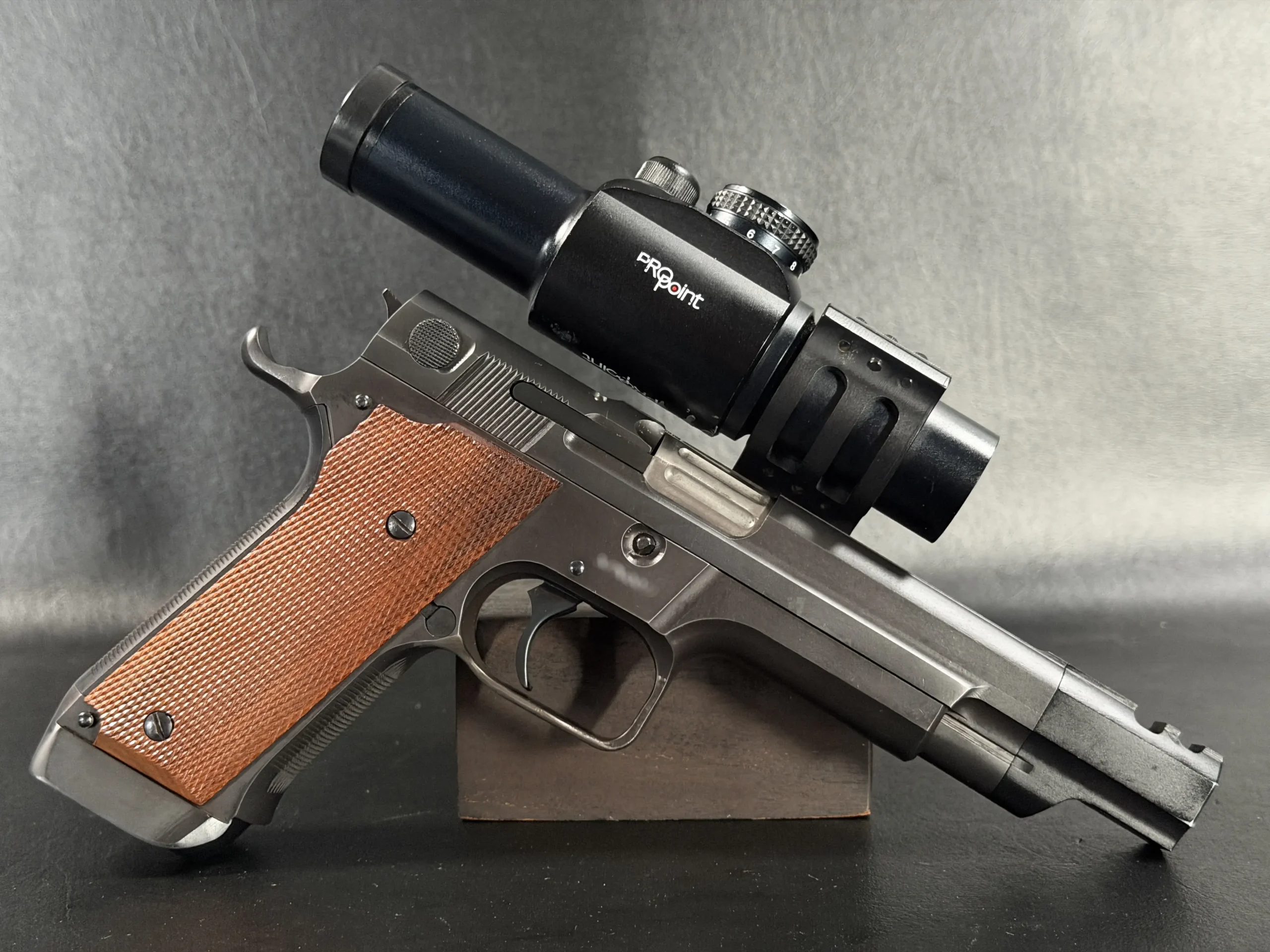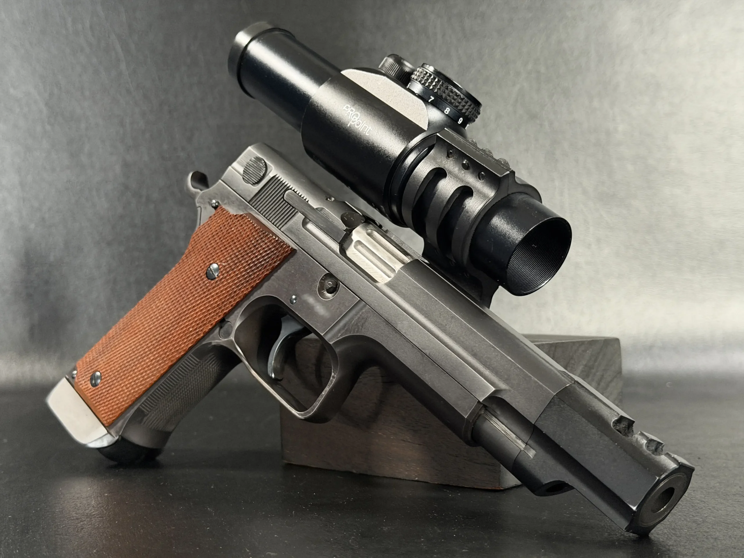 Features include a 5-inch barrel with an integrated compensator, a frame-mounted optic system, an Aimpoint ProPoint electronic sight, black-finished steel construction, and checkered wood grips. The frame-mounted optic arrangement keeps the sight fixed to the frame rather than the slide, a period competition configuration associated with early IPSC race guns.