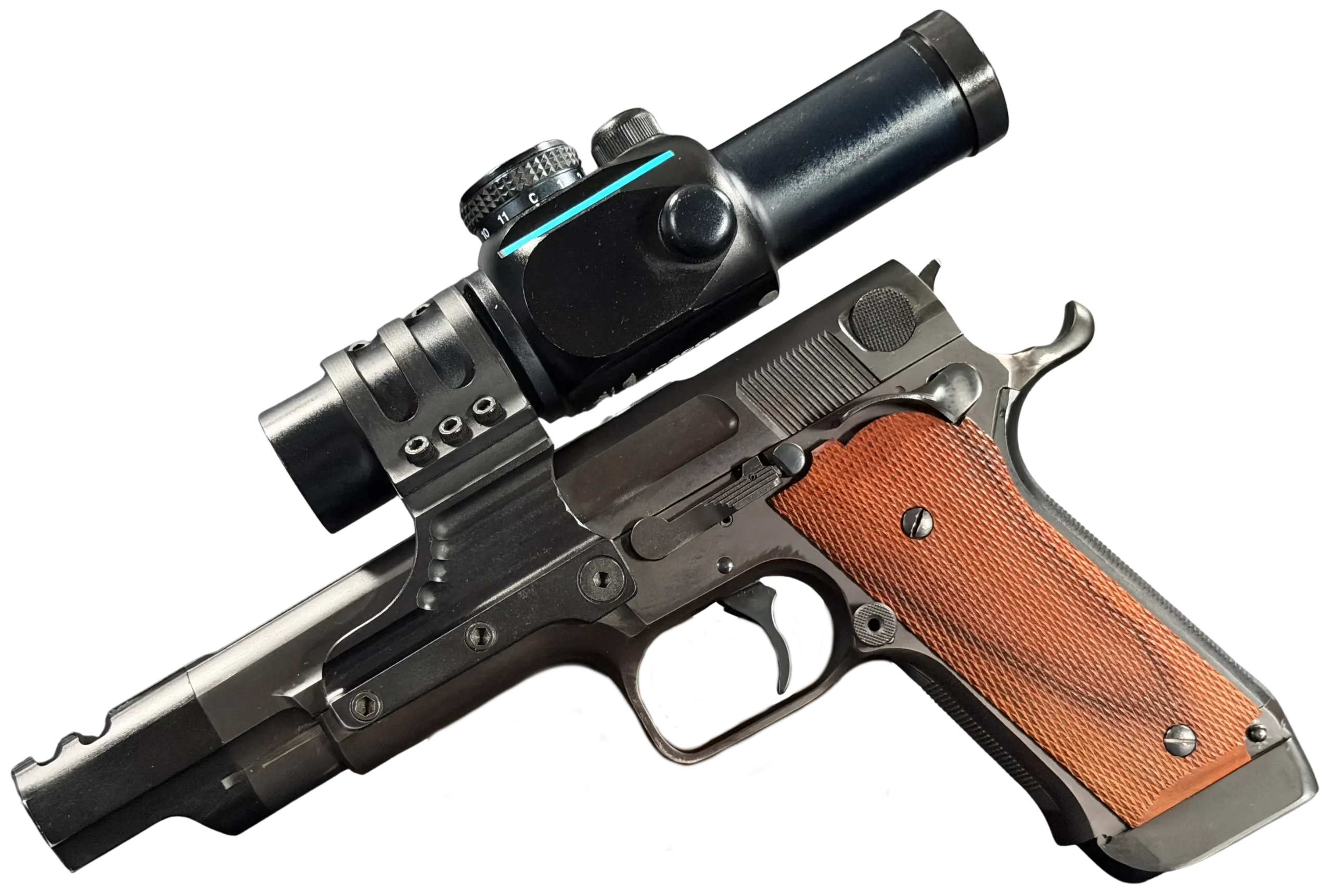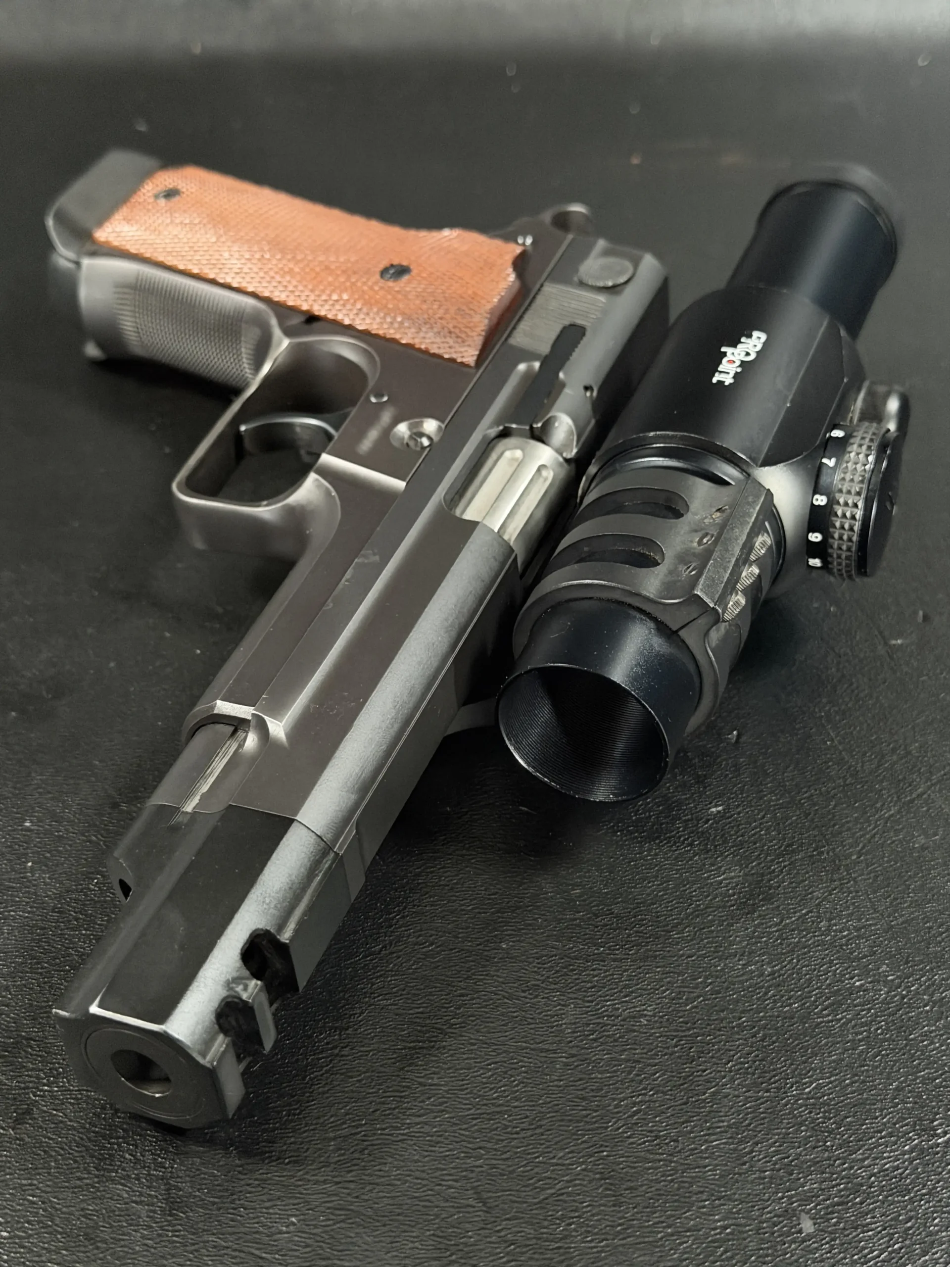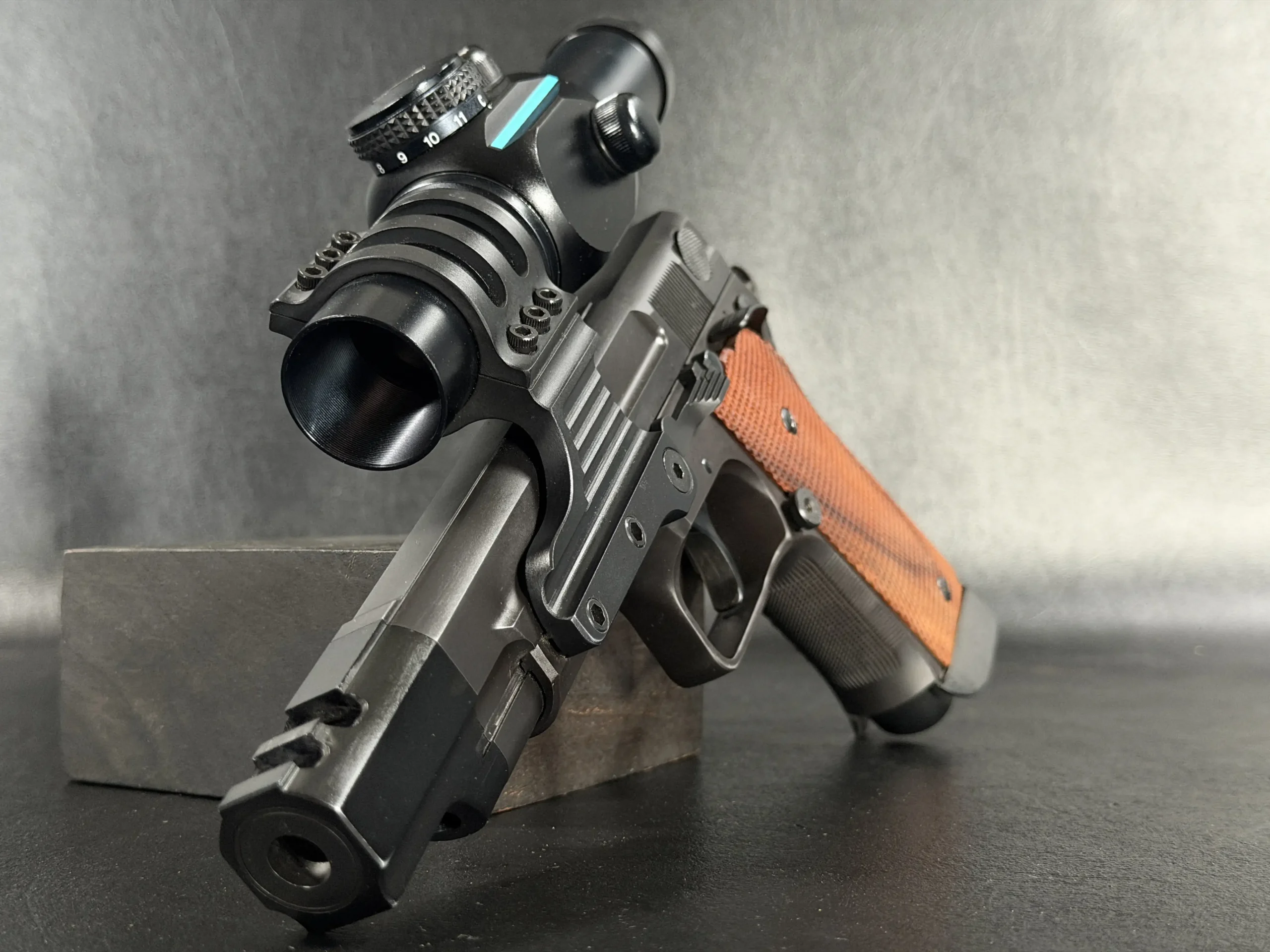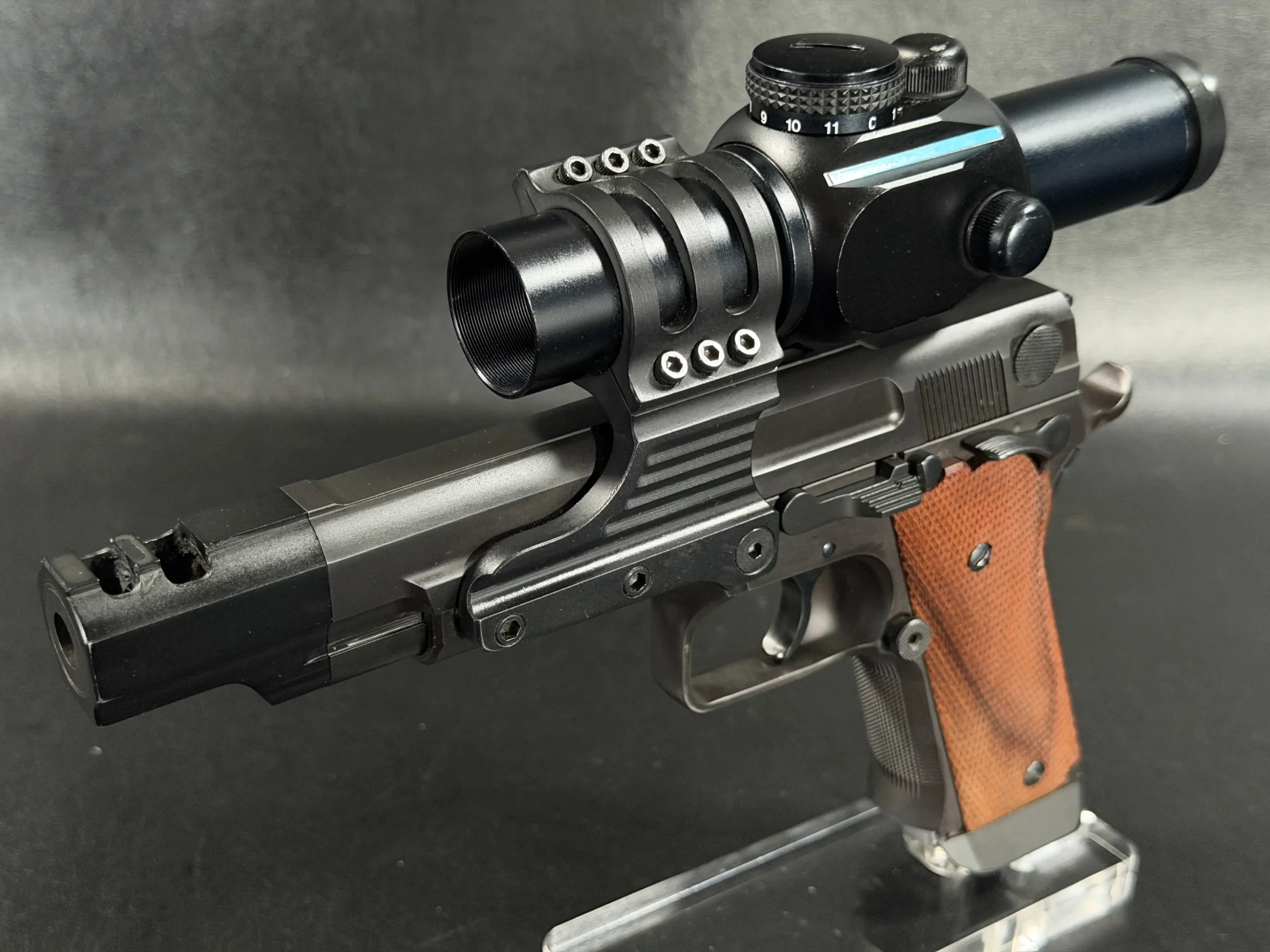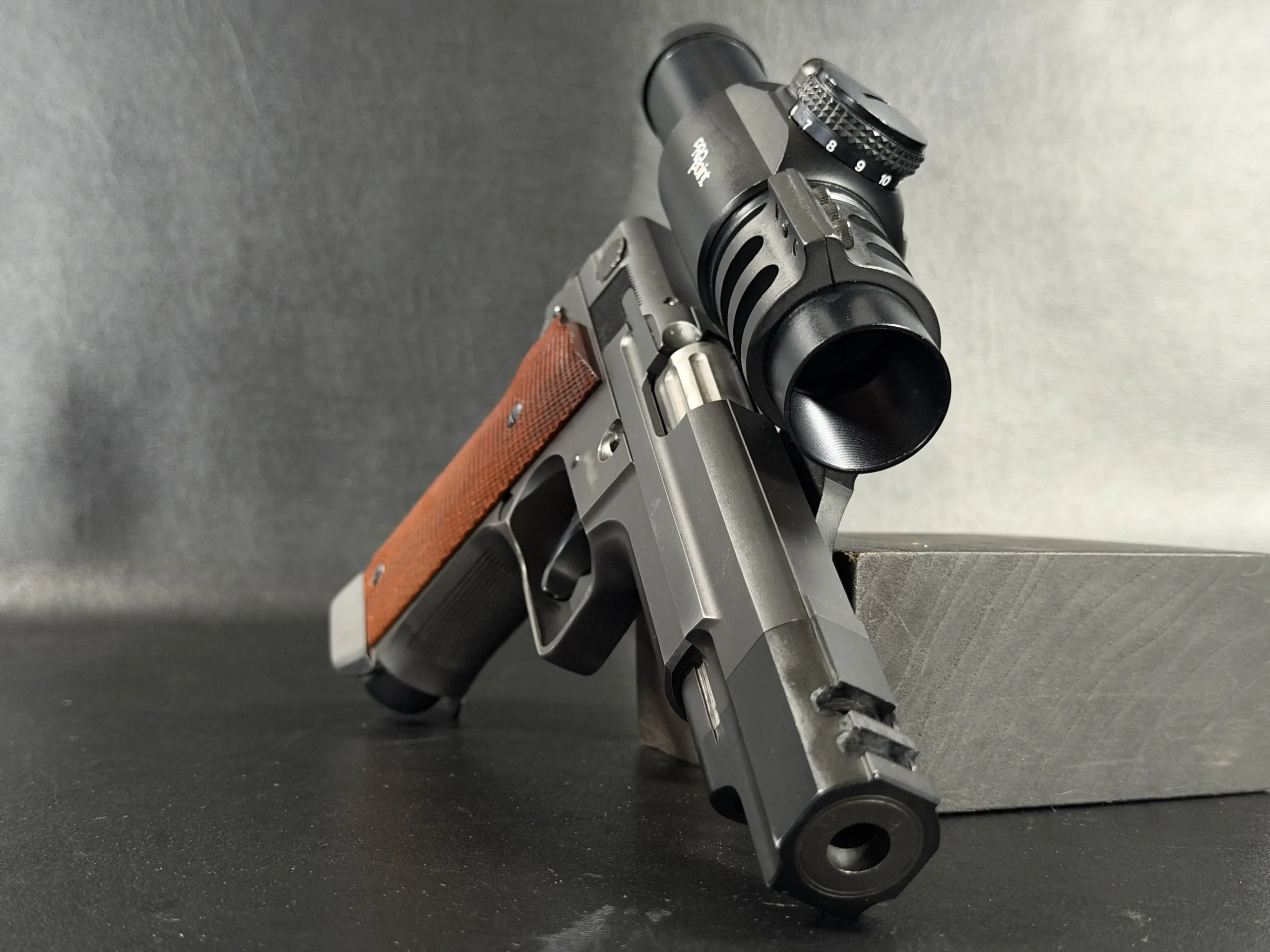 Features include a 5-inch barrel with an integrated compensator, a frame-mounted optic system, an Aimpoint ProPoint electronic sight, black-finished steel construction, and checkered wood grips. The frame-mounted optic arrangement keeps the sight fixed to the frame rather than the slide, a period competition configuration associated with early IPSC race guns.