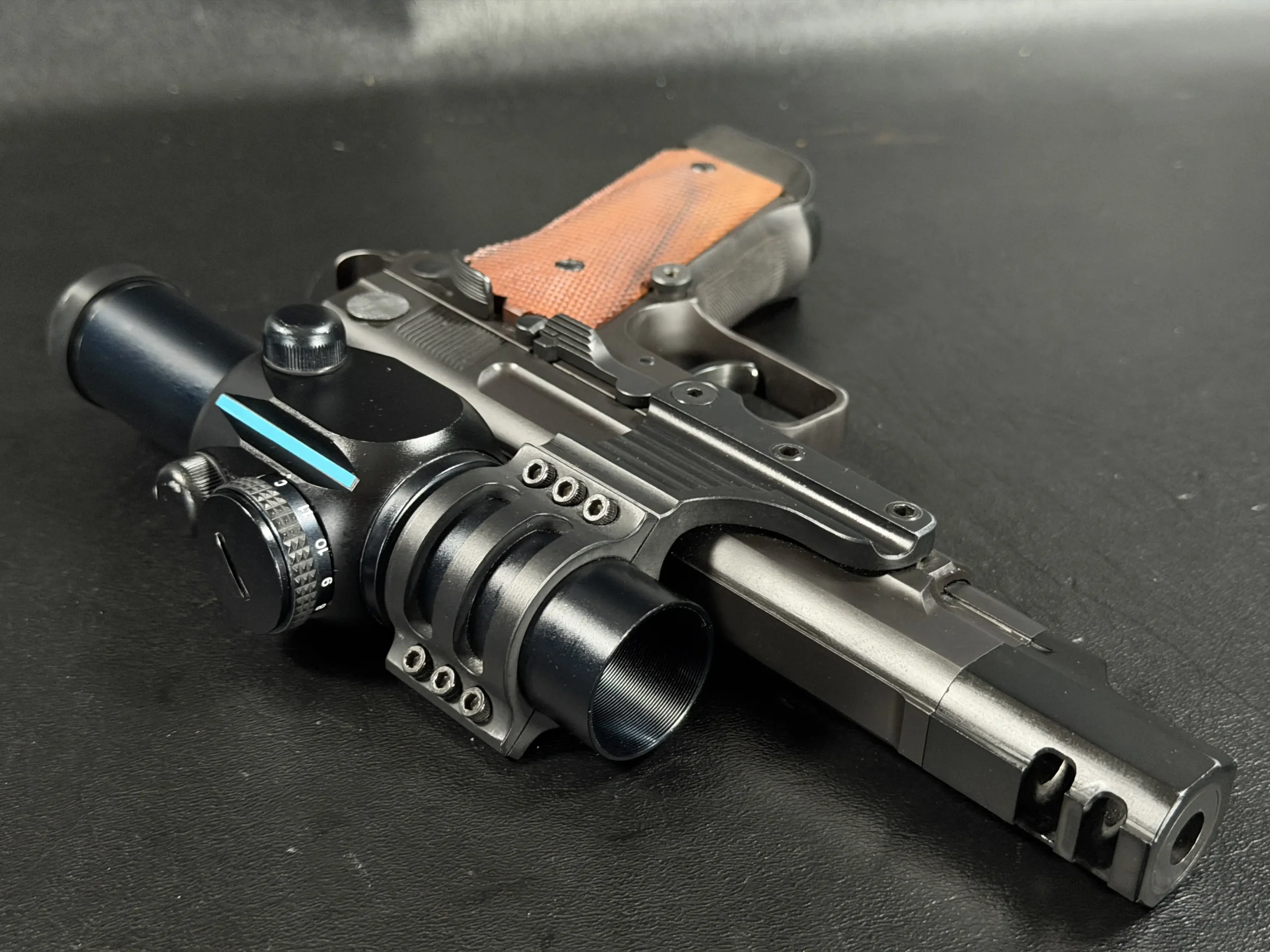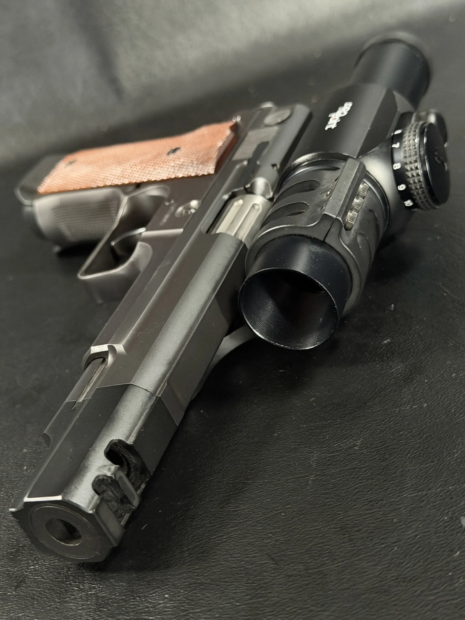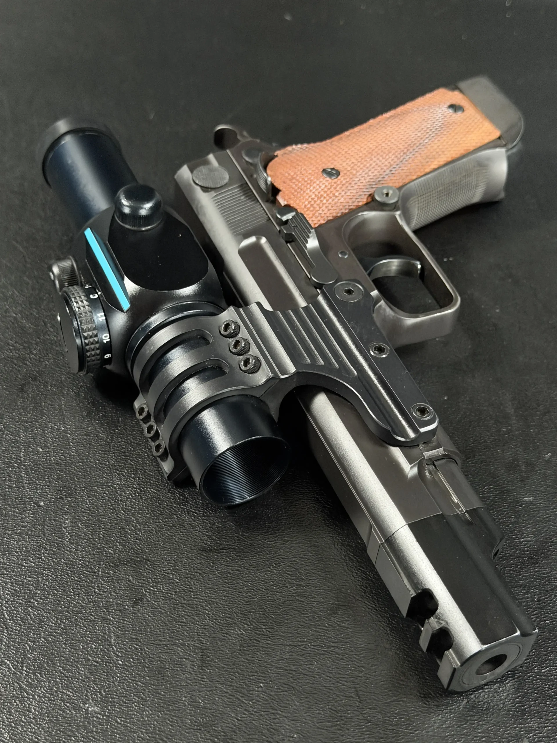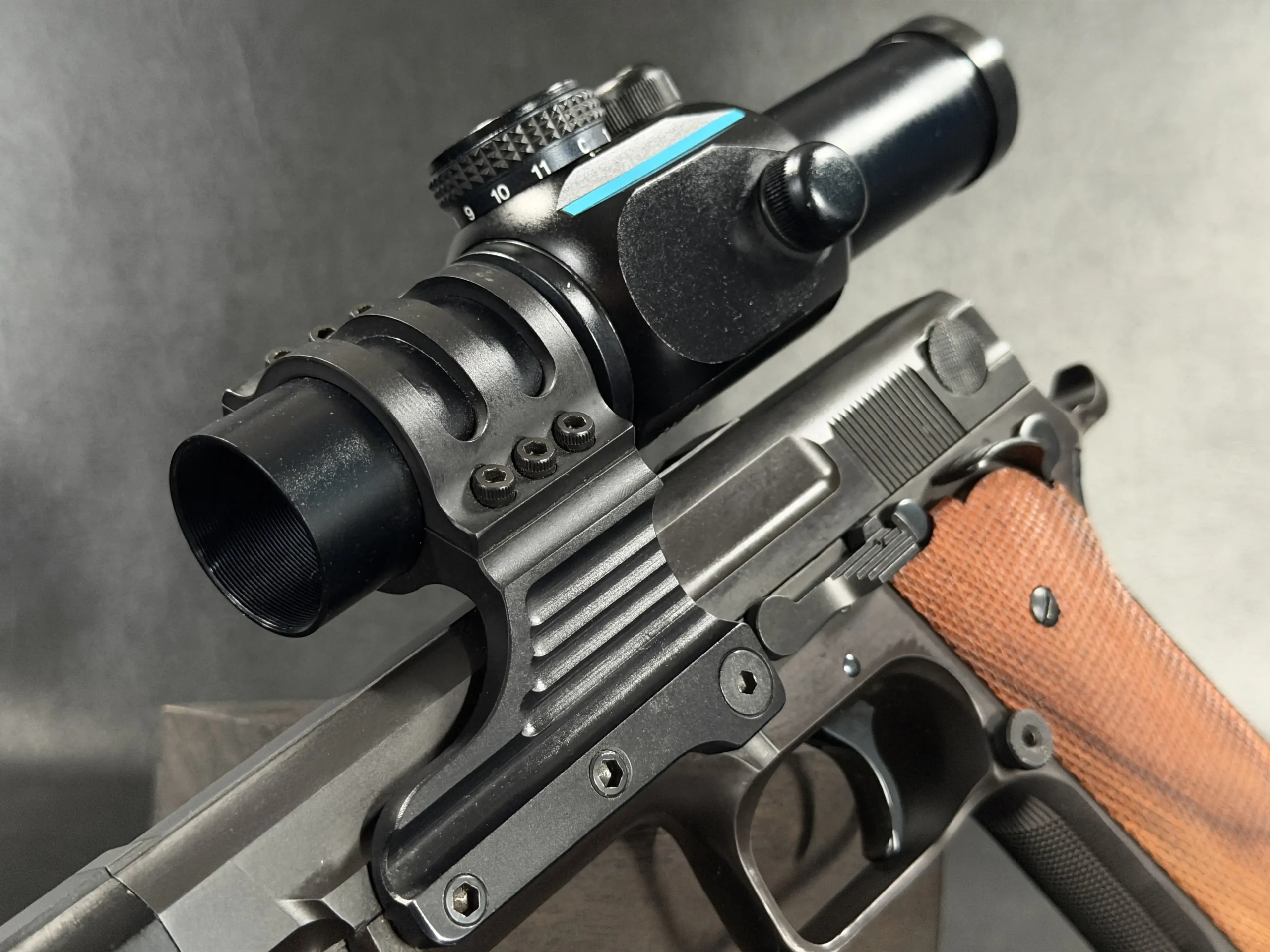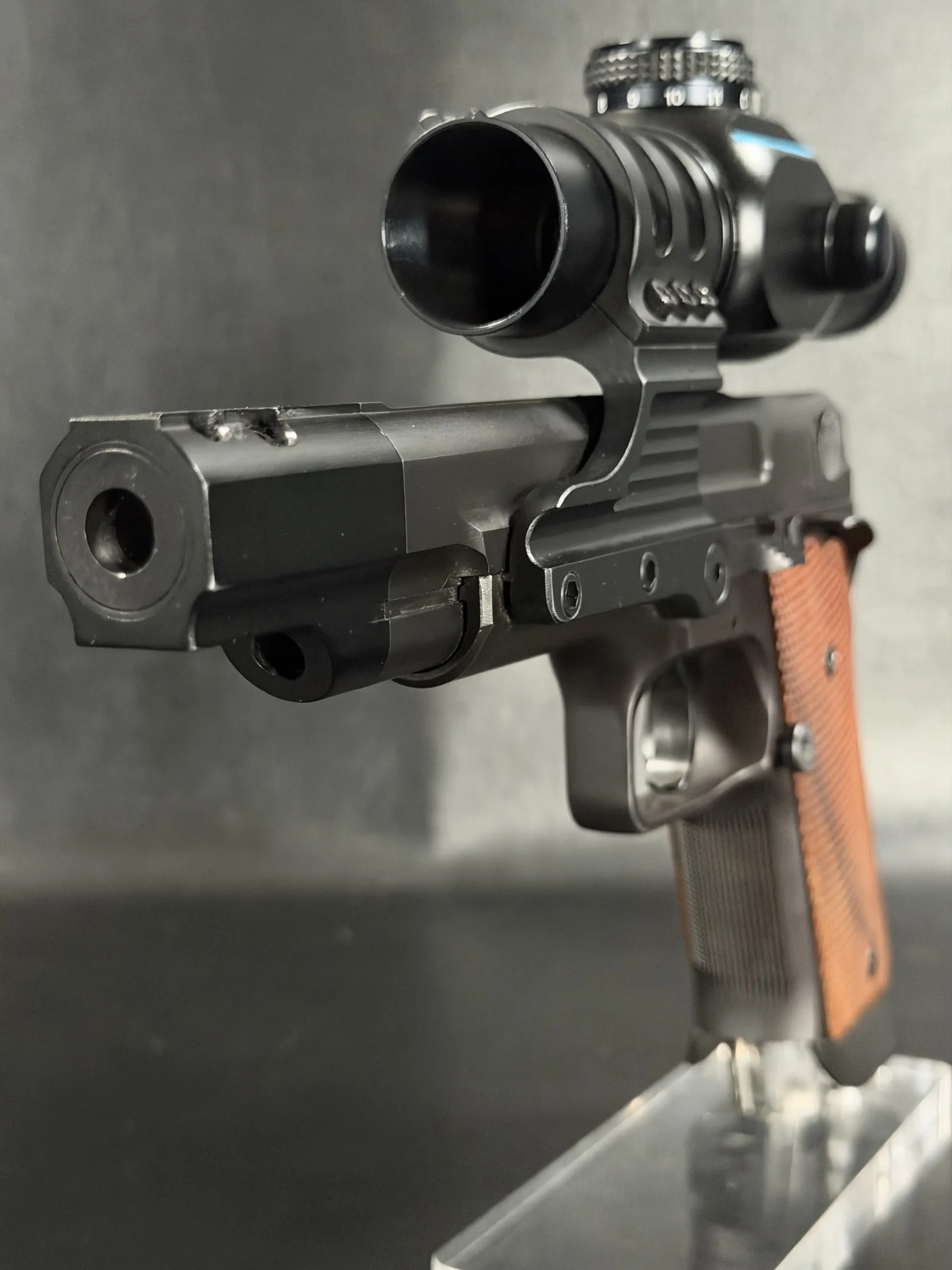 Features include a 5-inch barrel with an integrated compensator, a frame-mounted optic system, an Aimpoint ProPoint electronic sight, black-finished steel construction, and checkered wood grips. The frame-mounted optic arrangement keeps the sight fixed to the frame rather than the slide, a period competition configuration associated with early IPSC race guns.