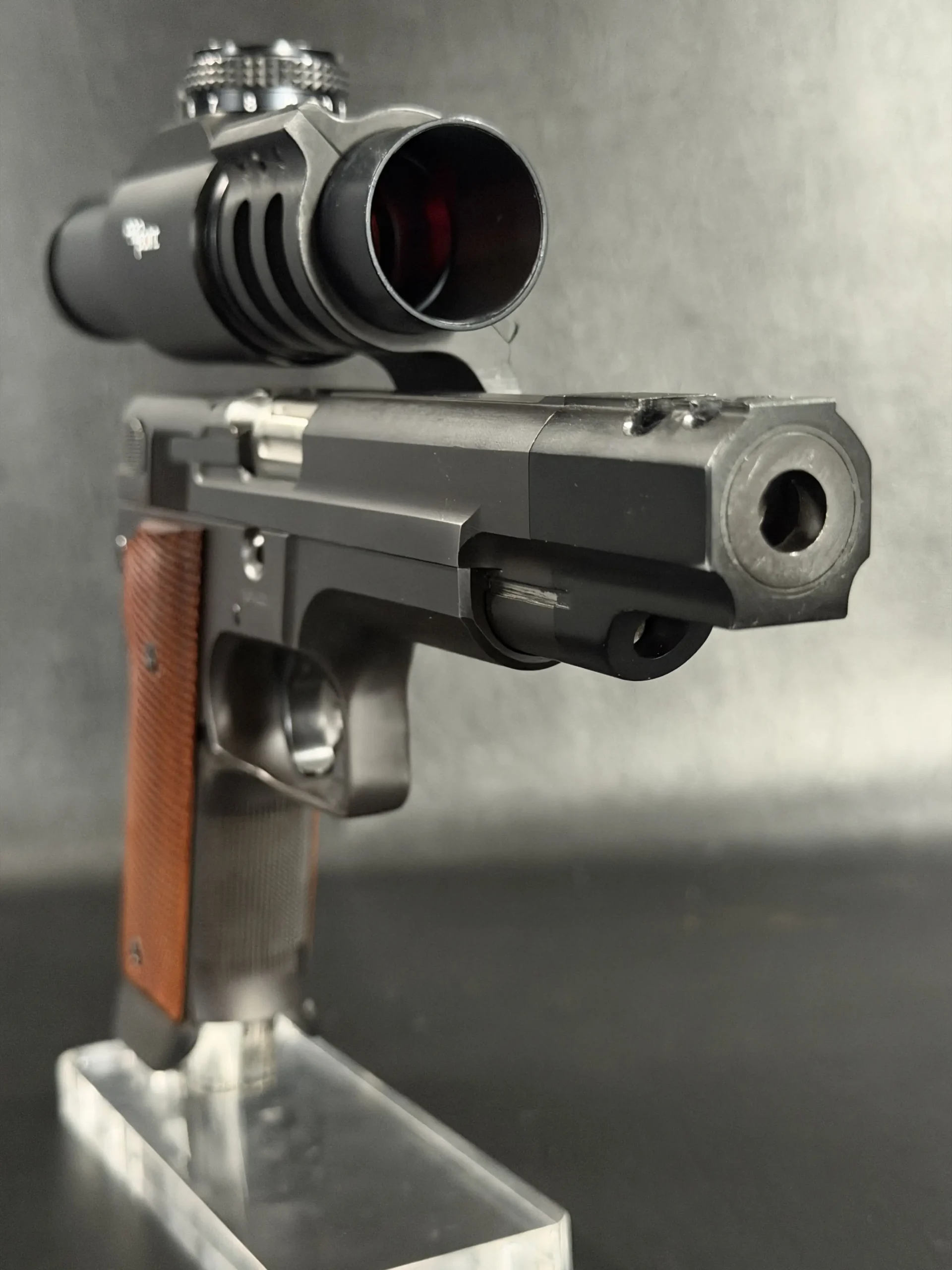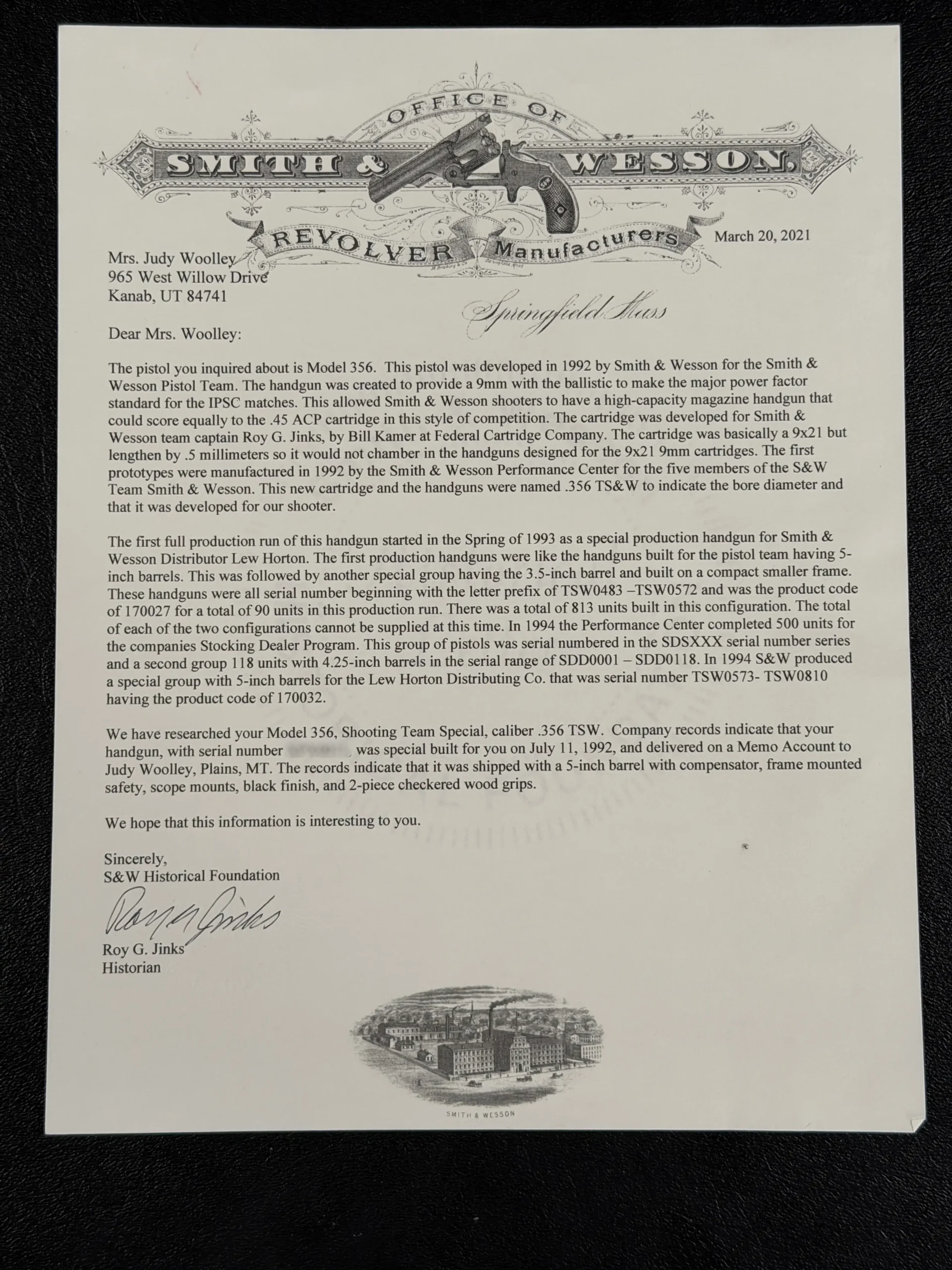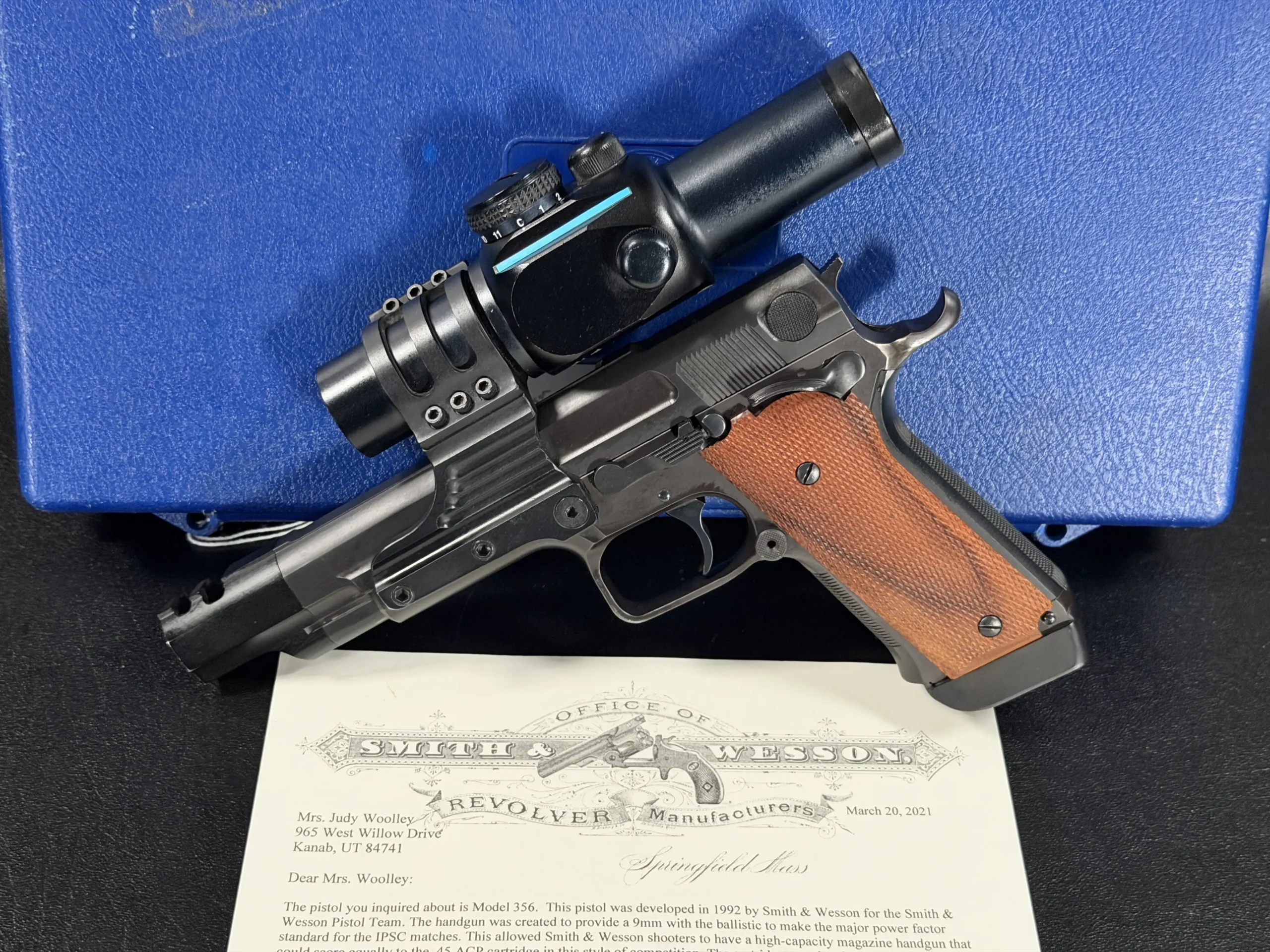 According to Smith & Wesson historical records, this example was specially built in July 1992 for champion shooter Judy Woolley. As a prototype Performance Center build from the model’s early development, it represents a notable example of Smith & Wesson’s competition-driven design work from the period.