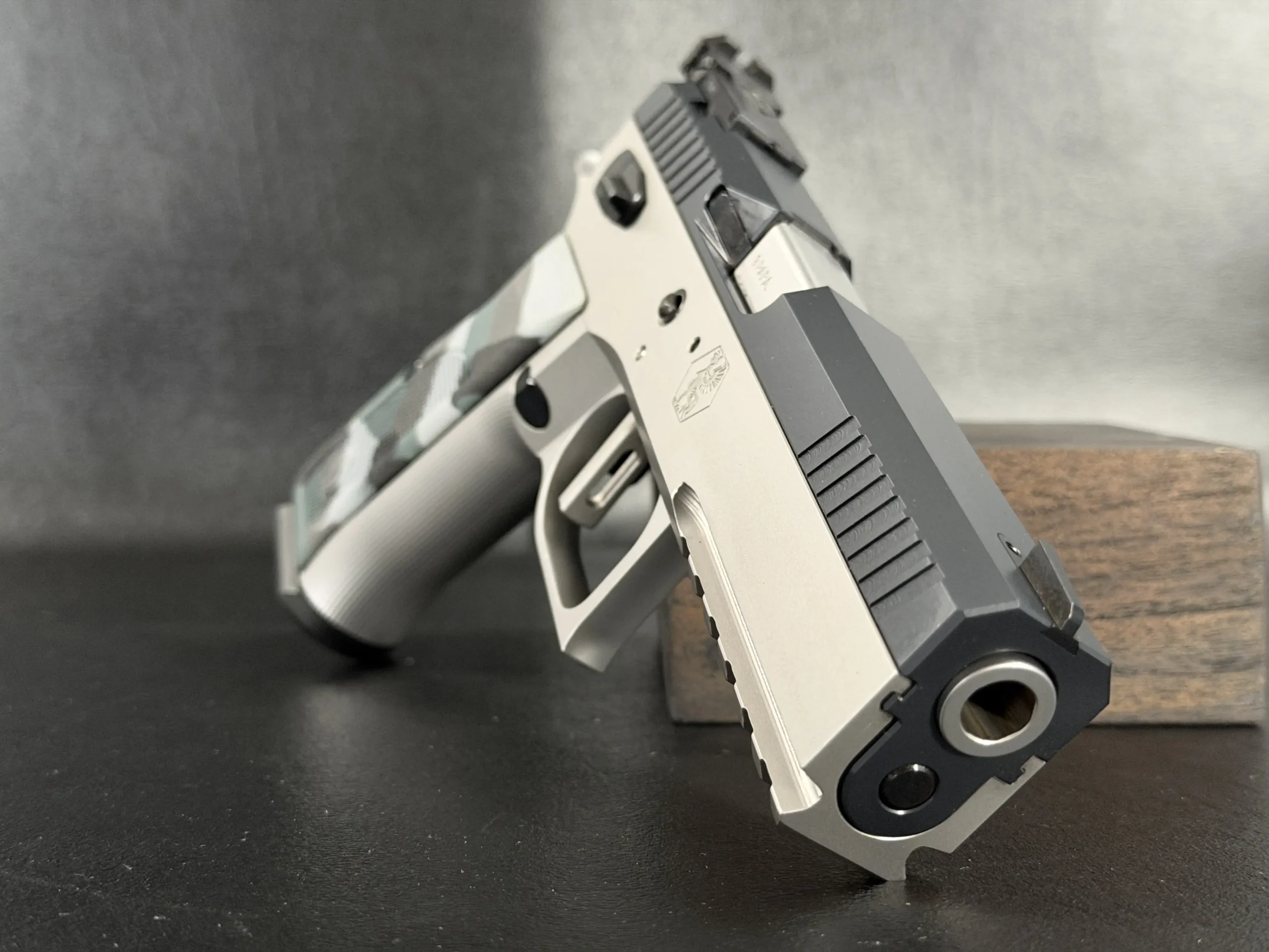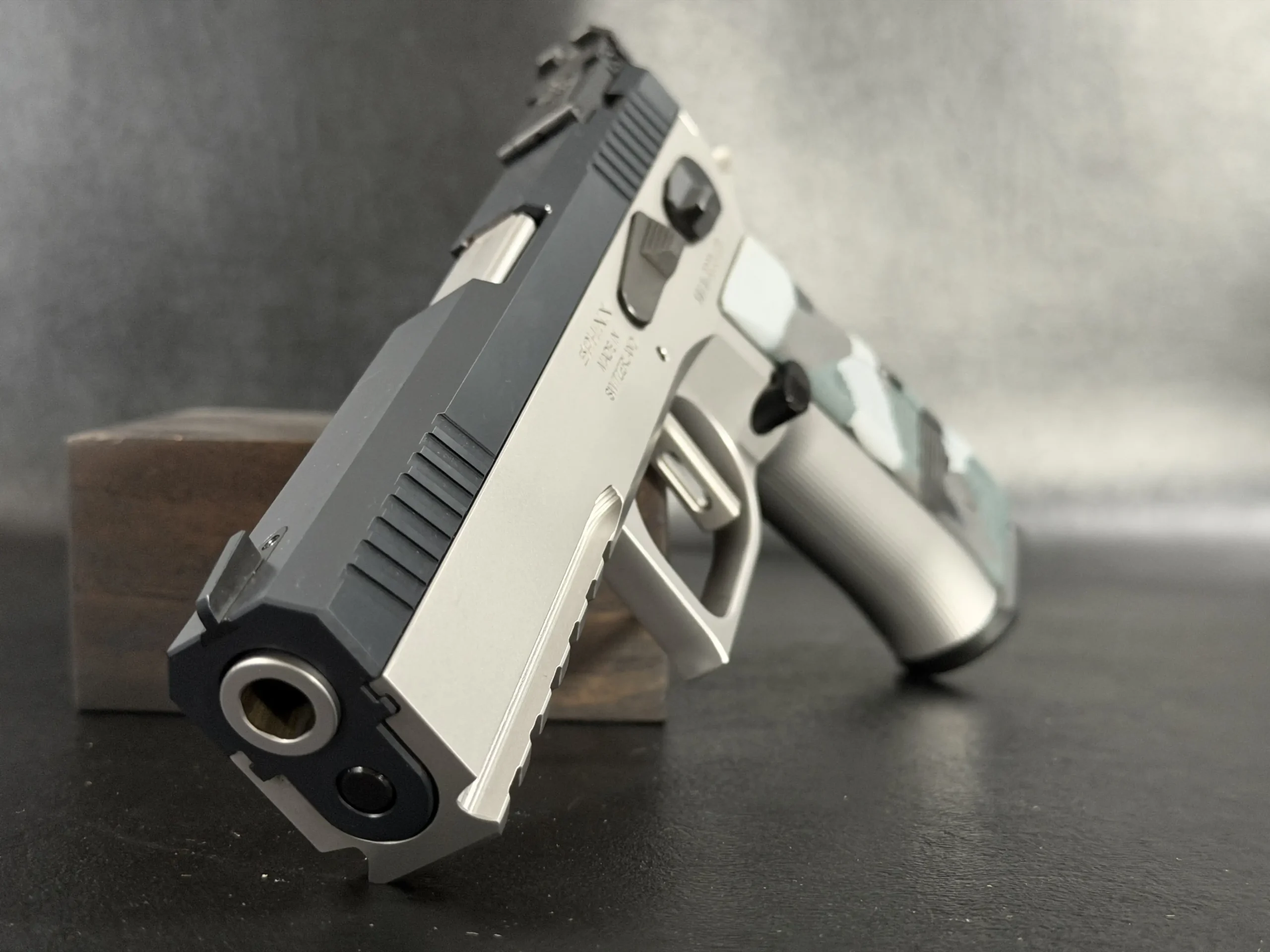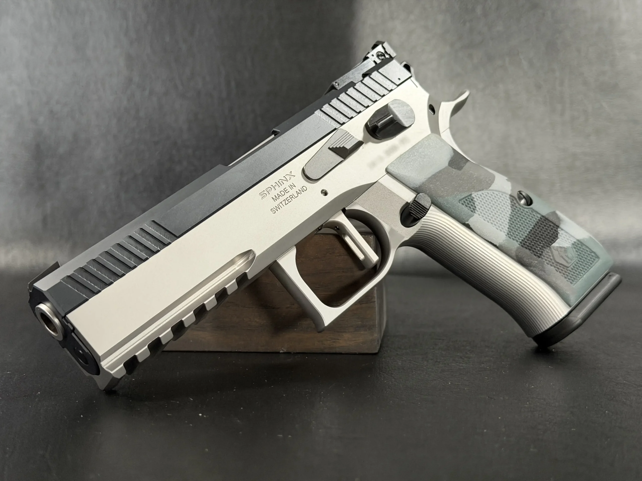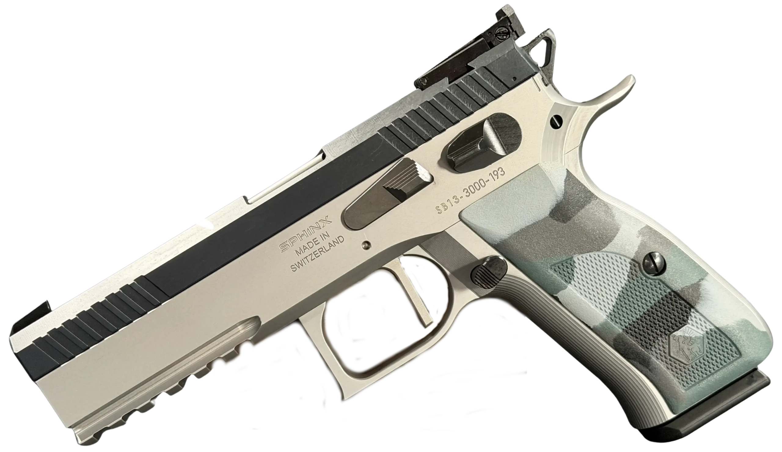 Camo-finished composite grips add visual character and provide a textured, ergonomic hold. Subtle Sphinx crest markings throughout the frame further distinguish the pistol without overwhelming its restrained styling.