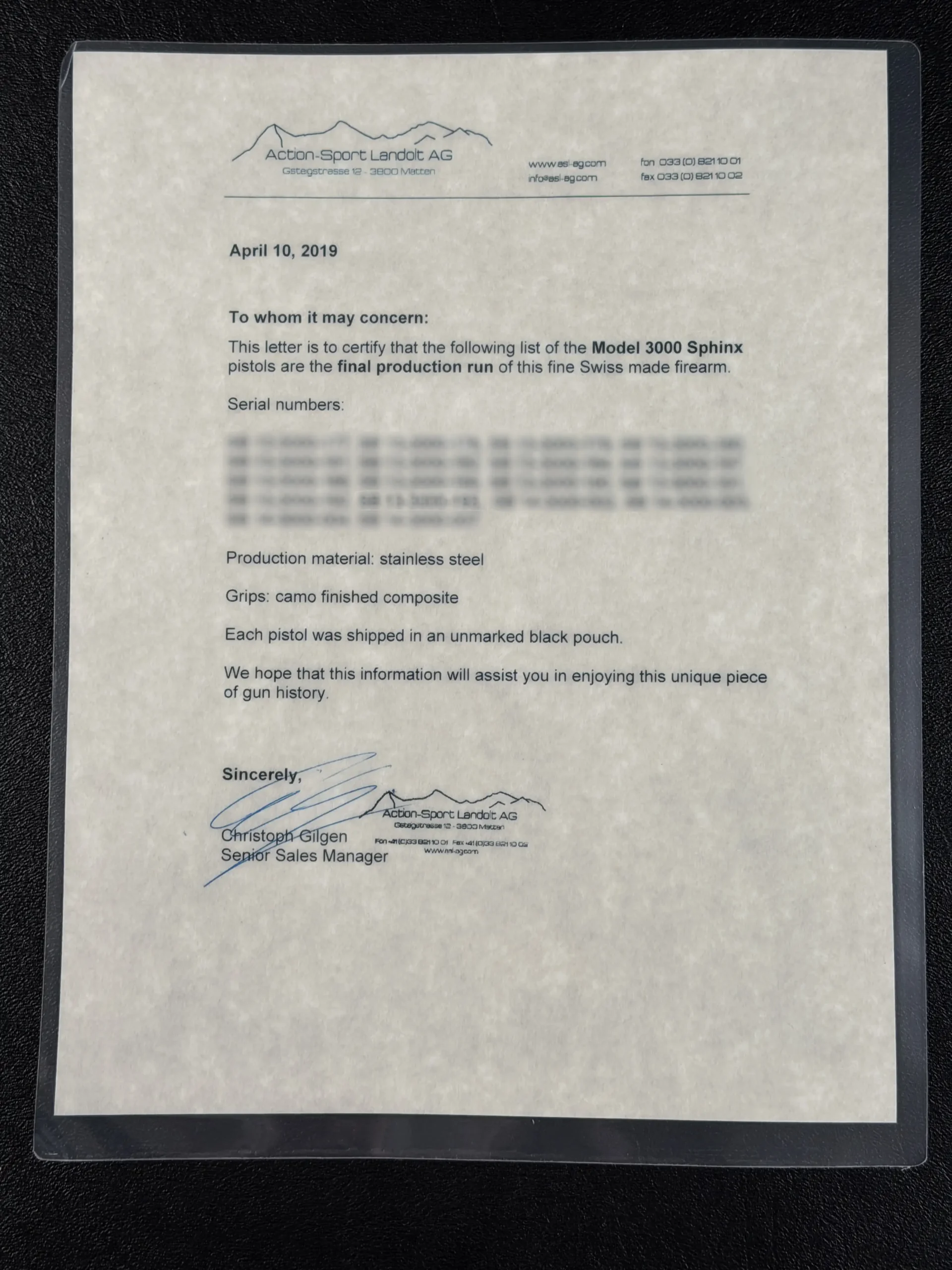 Included factory documentation confirms this pistol’s inclusion in the final production series of Model 3000 pistols, adding an important layer of factory-documented context to an already notable variant. For buyers drawn to Swiss firearms and significant production milestones, the Sphinx Model 3000 Final Production Run offers a compelling combination of design, engineering, and documented production history.