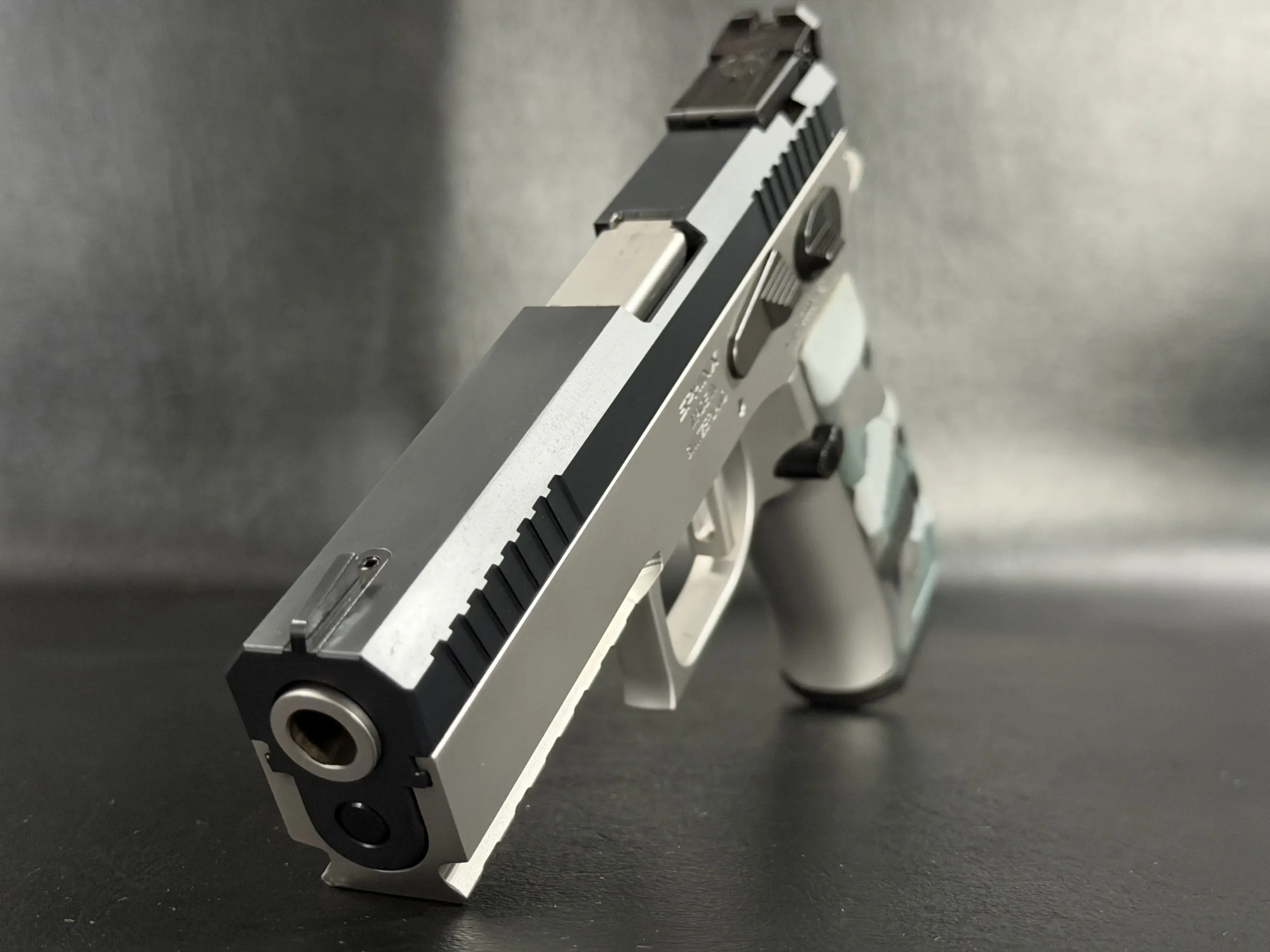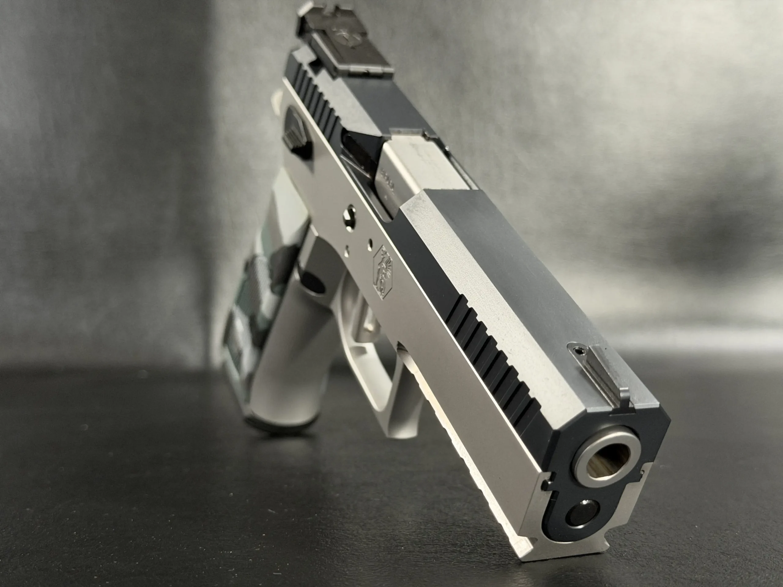 This example features a distinctive two-tone configuration, pairing a matte stainless frame with a darker slide for a clean, purposeful look. Forward slide serrations, an accessory rail, and a sculpted dust cover give the pistol a modern profile while maintaining the balanced lines of the design.