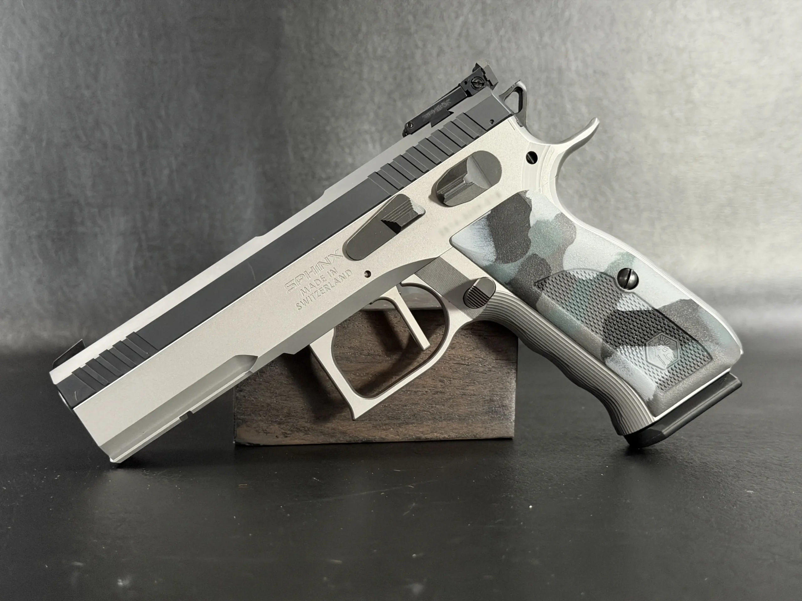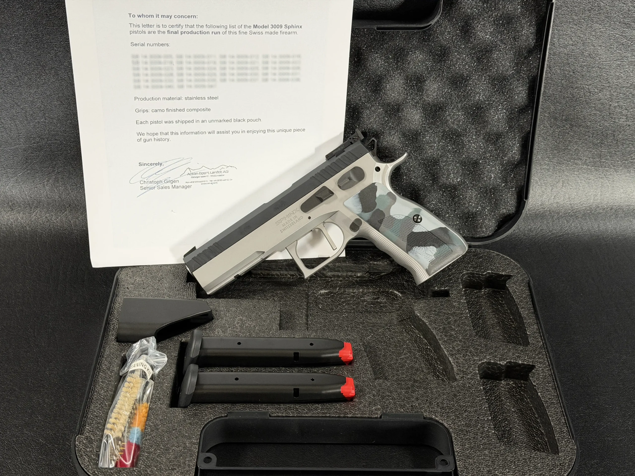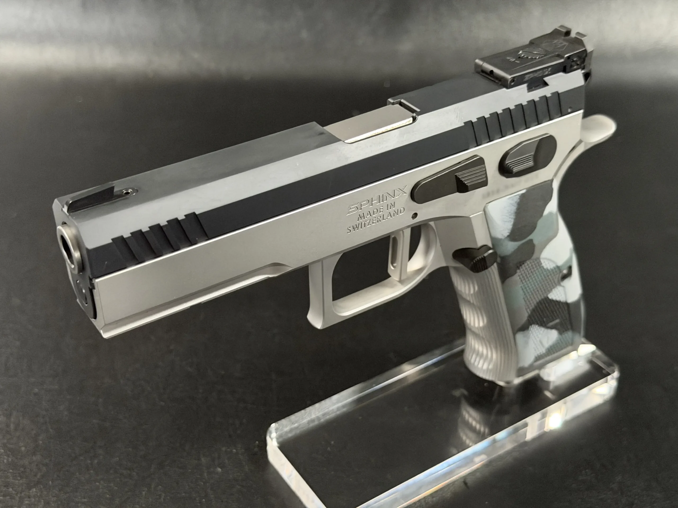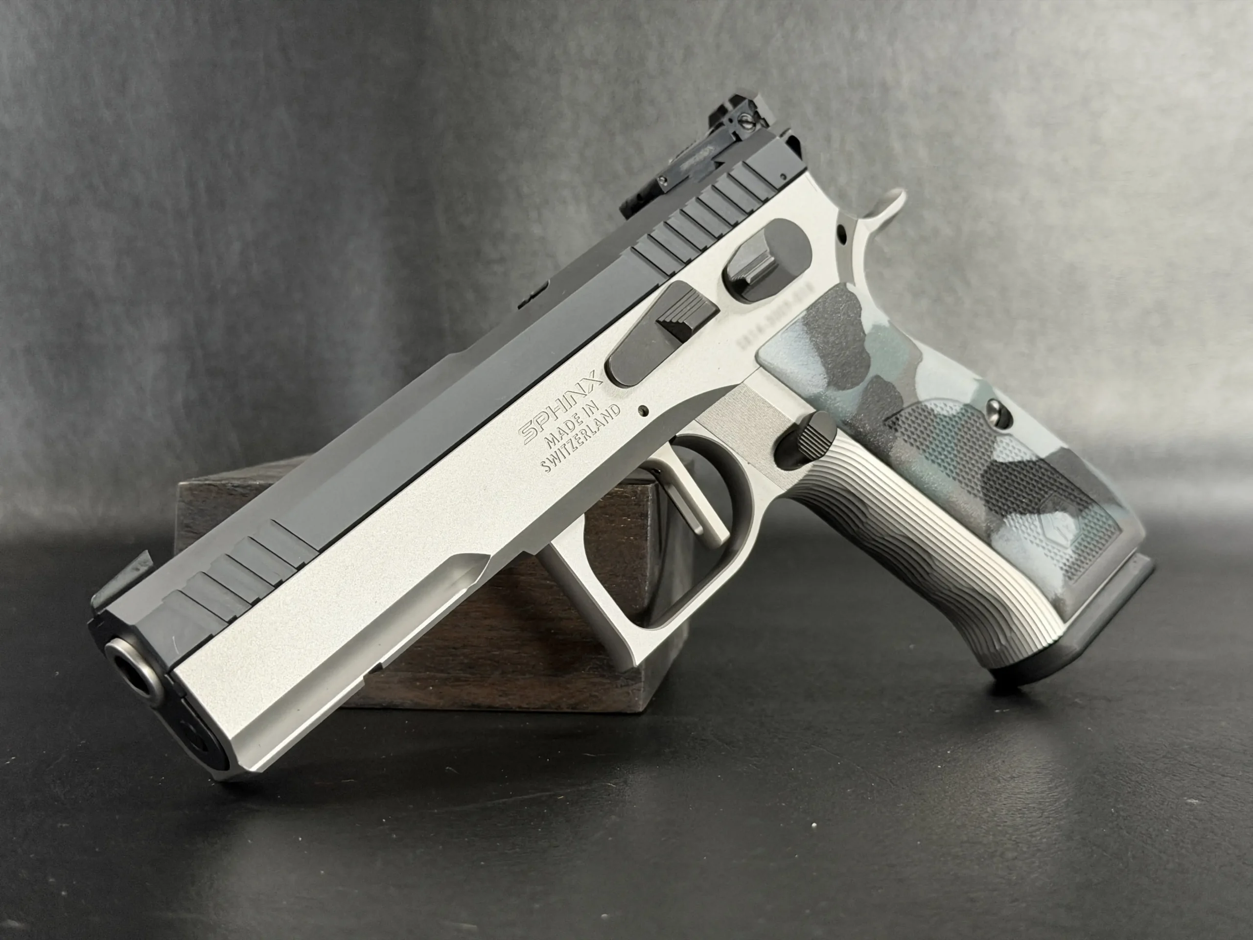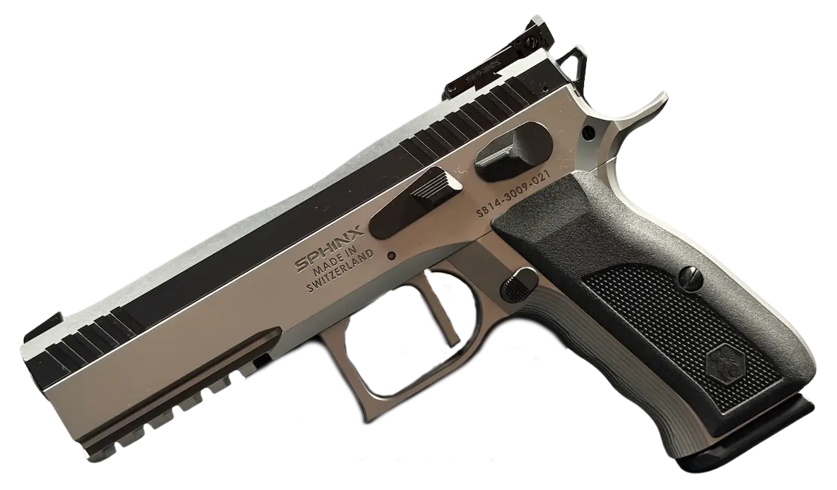 The Sphinx Model 3009 is a Swiss-made pistol from the final production run of the Sphinx factory. Built from stainless steel, it reflects the precise machining and careful fitment associated with the model.
