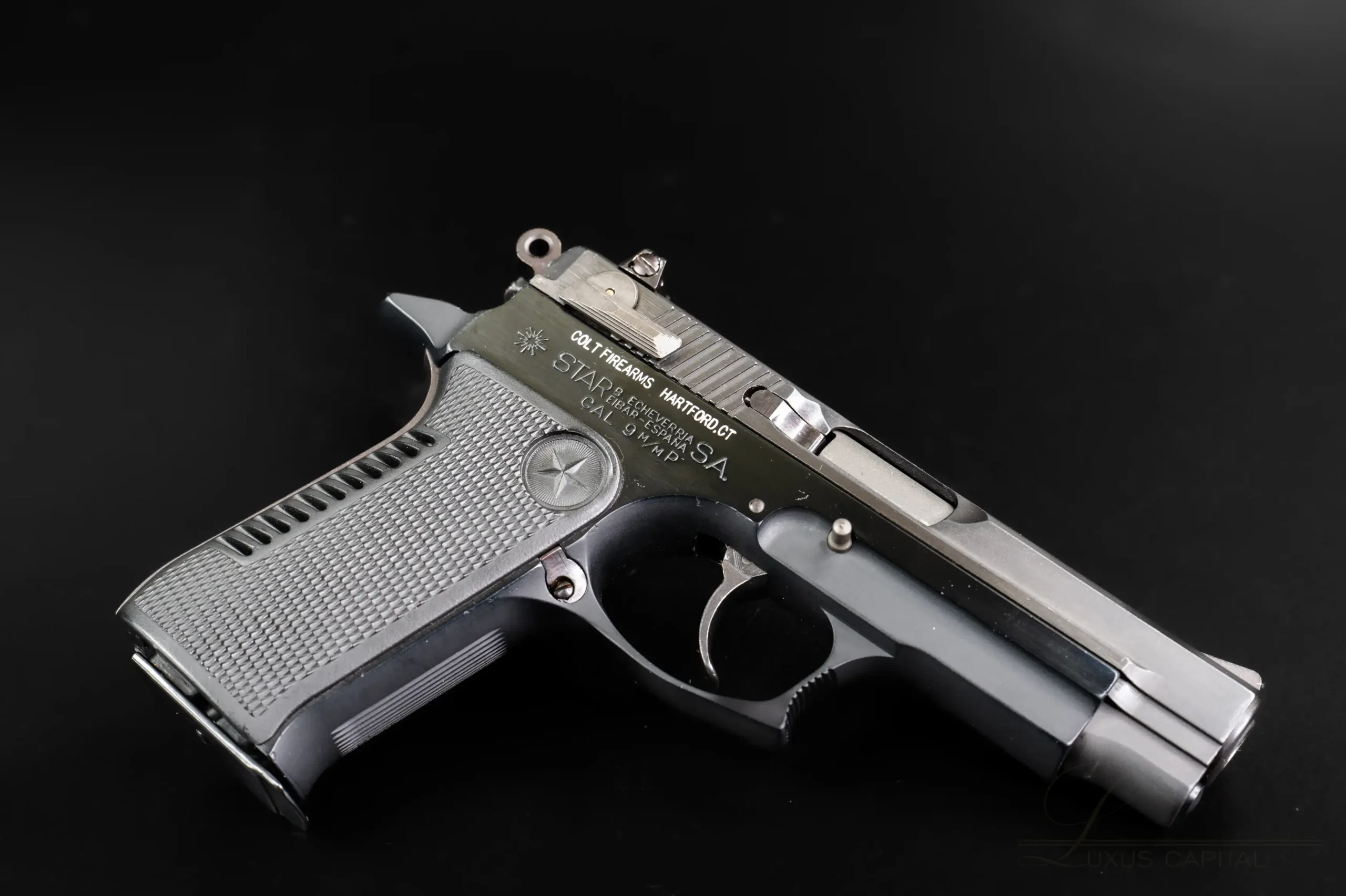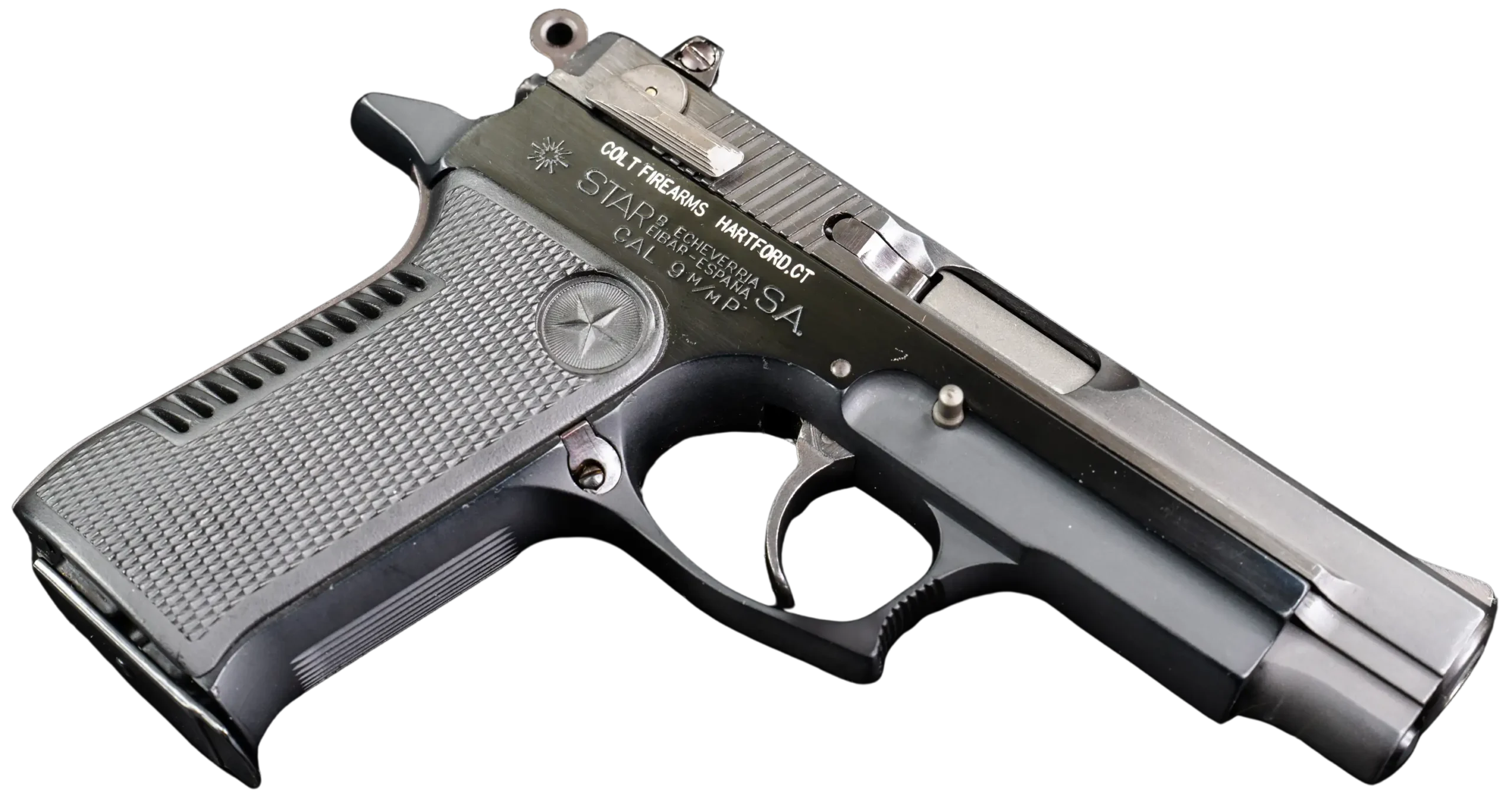 The pistol features a matte black finish with satin-finished controls, along with sharply checkered grip panels set with Star medallions. Its ergonomic frame, double-action trigger system, and slide-mounted safety reflect the service-pistol design language of the period while maintaining the distinct character of Star’s styling.