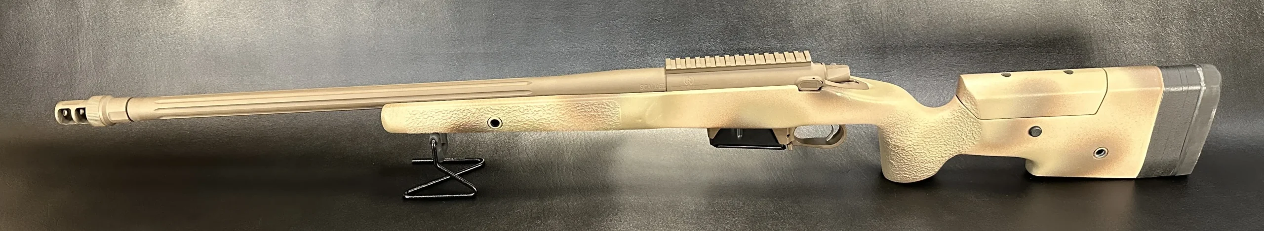 The bolt body features shallow spiral fluting and a tactical frag pattern bolt handle. The barreled action is set in a McMillan A5 fiberglass stock finished in three-tone desert camouflage Cerakote, combining a distinctive look with a practical, field-oriented layout.