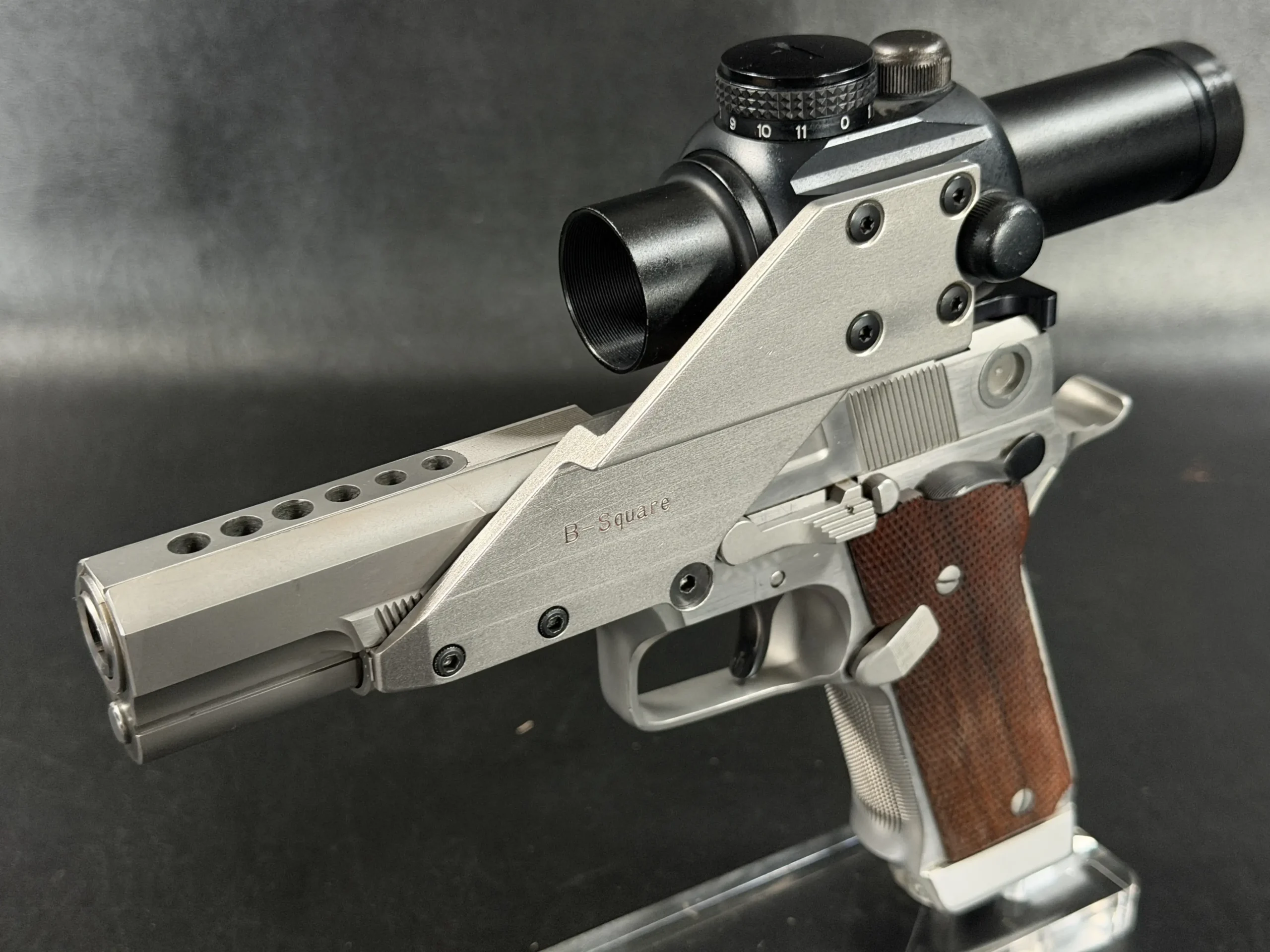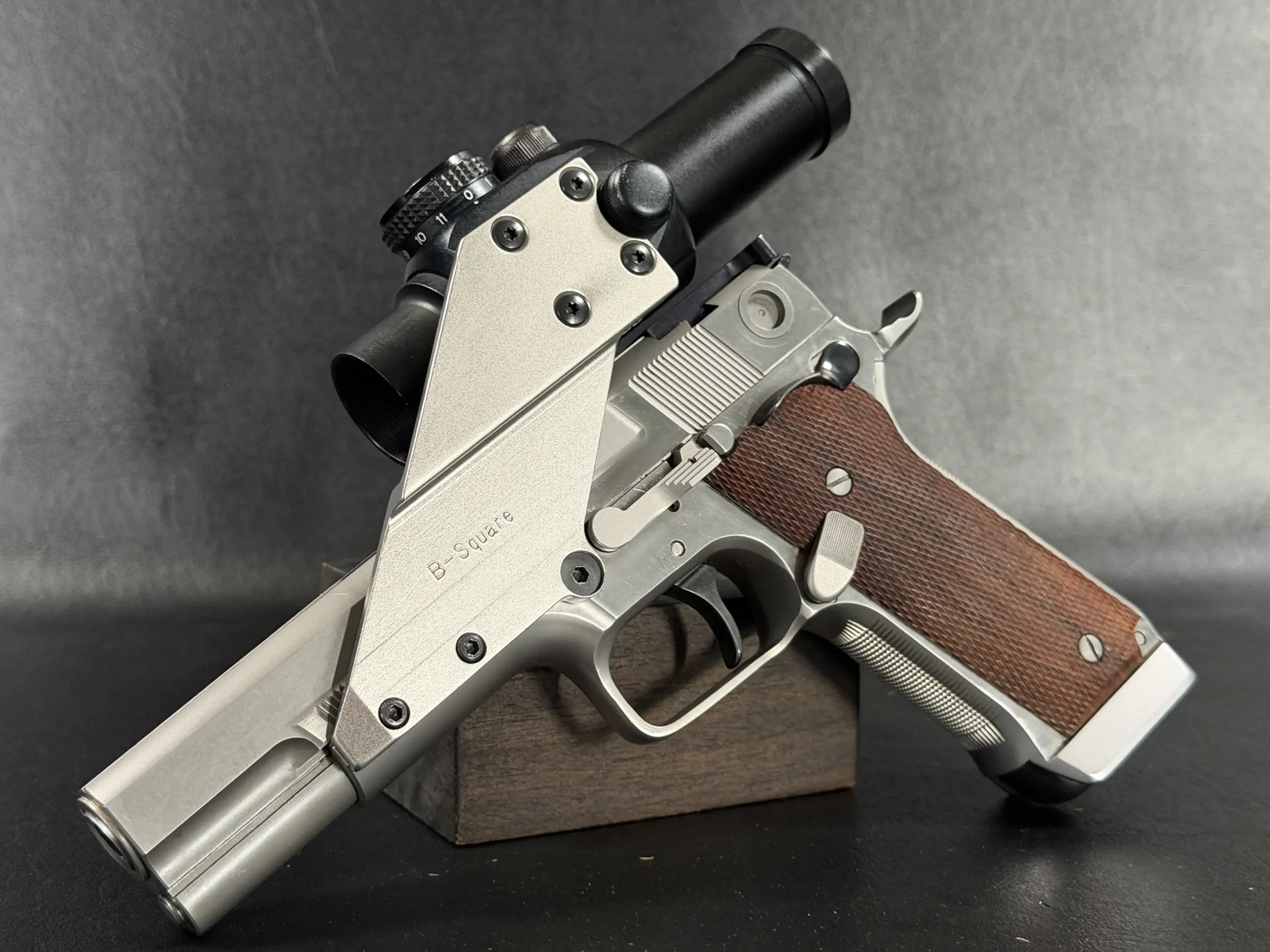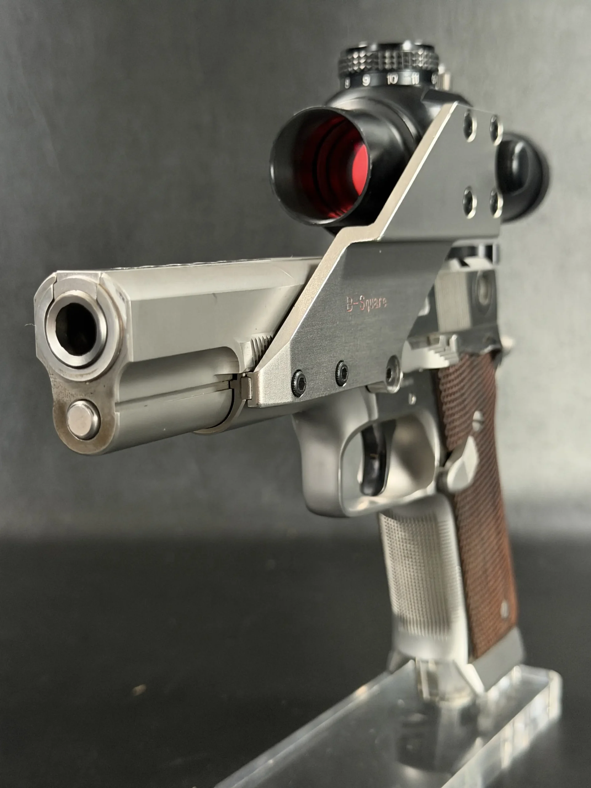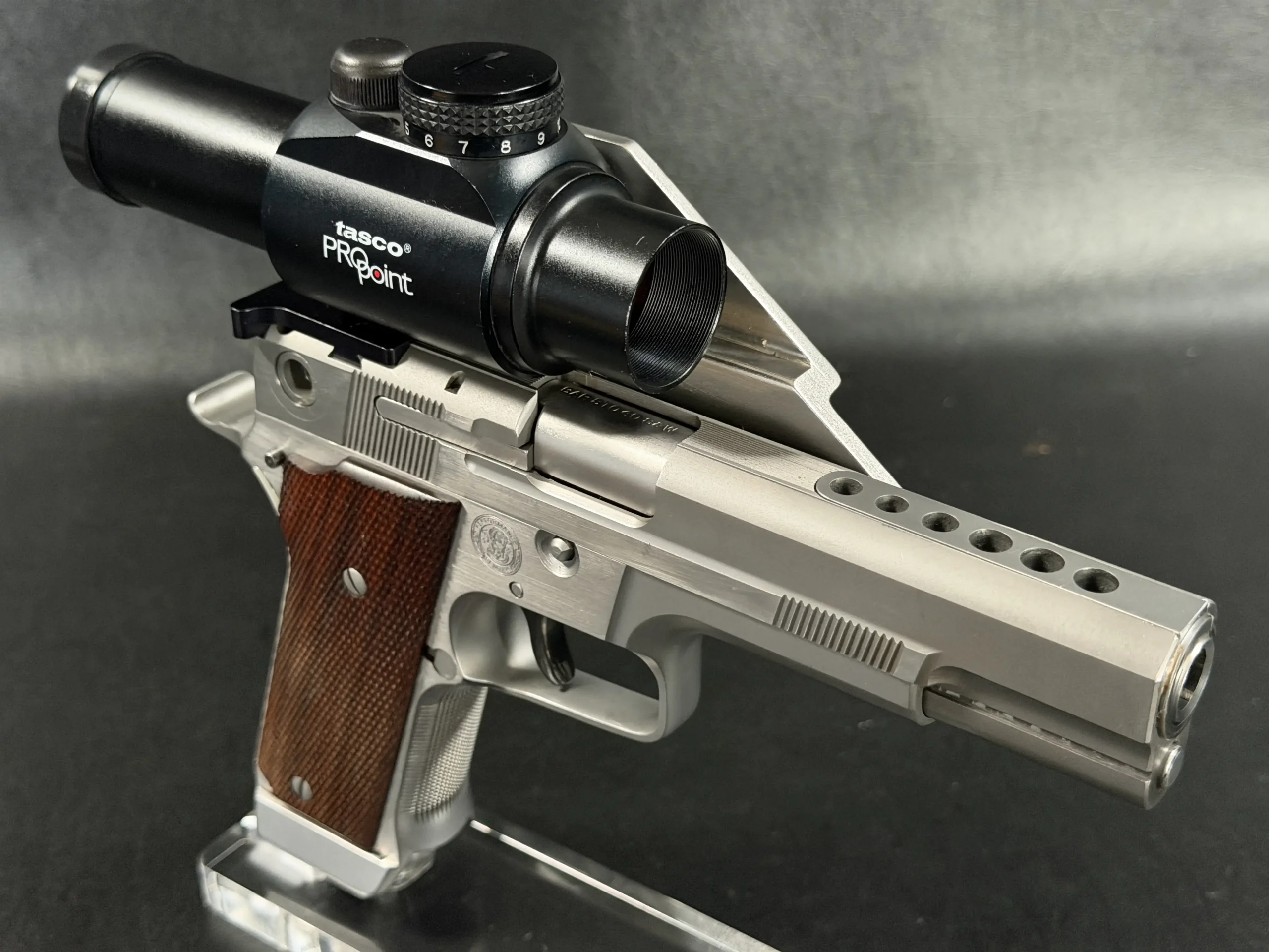 This pistol is equipped with a 5-inch barrel fitted with a Schuemann Hybrid compensator. The slide and frame have a satin stainless finish, and the pistol is also fitted with a B-Square steel mount and a Tasco ProPoint red dot sight, an optic setup characteristic of period competition handguns.