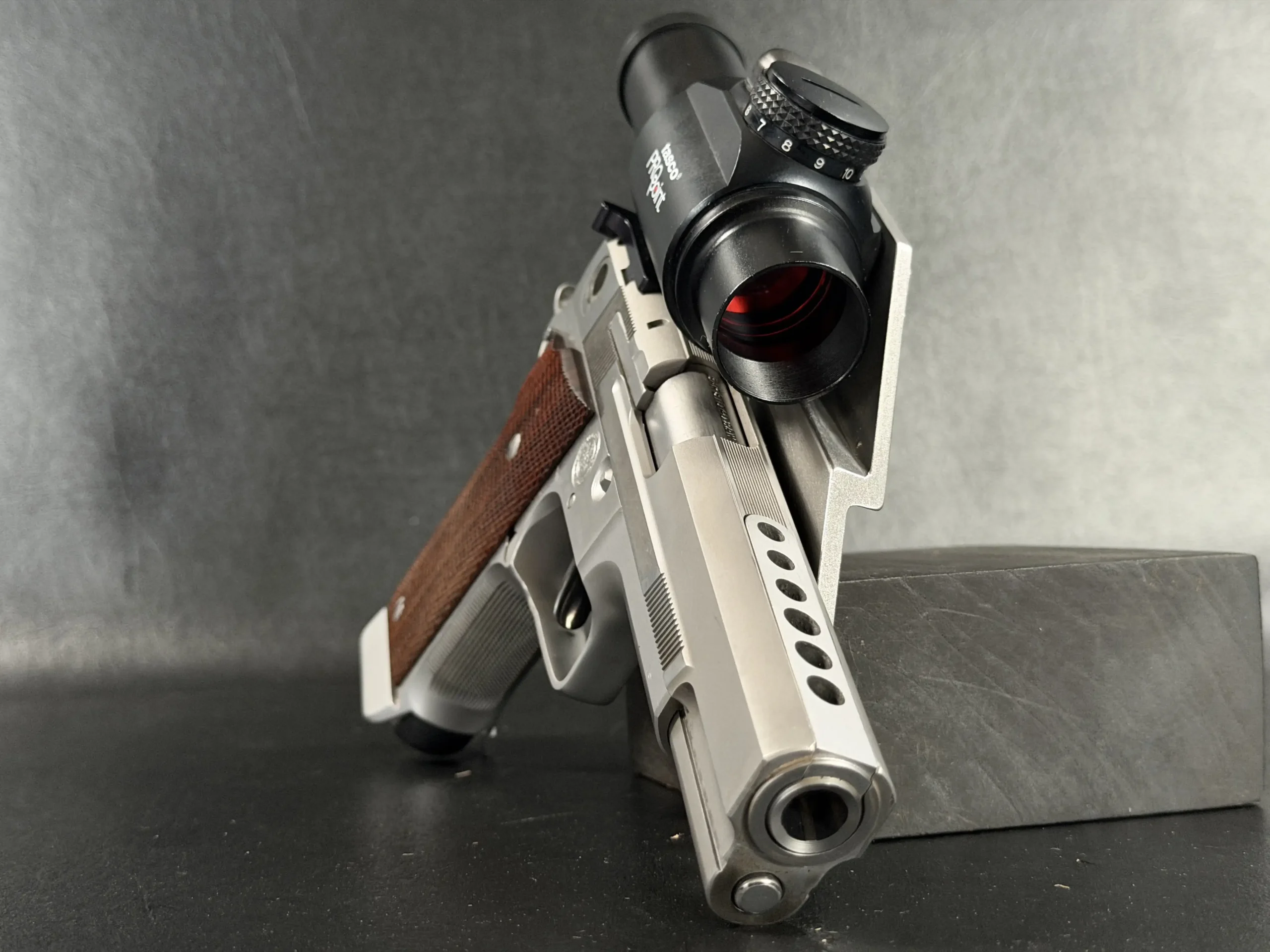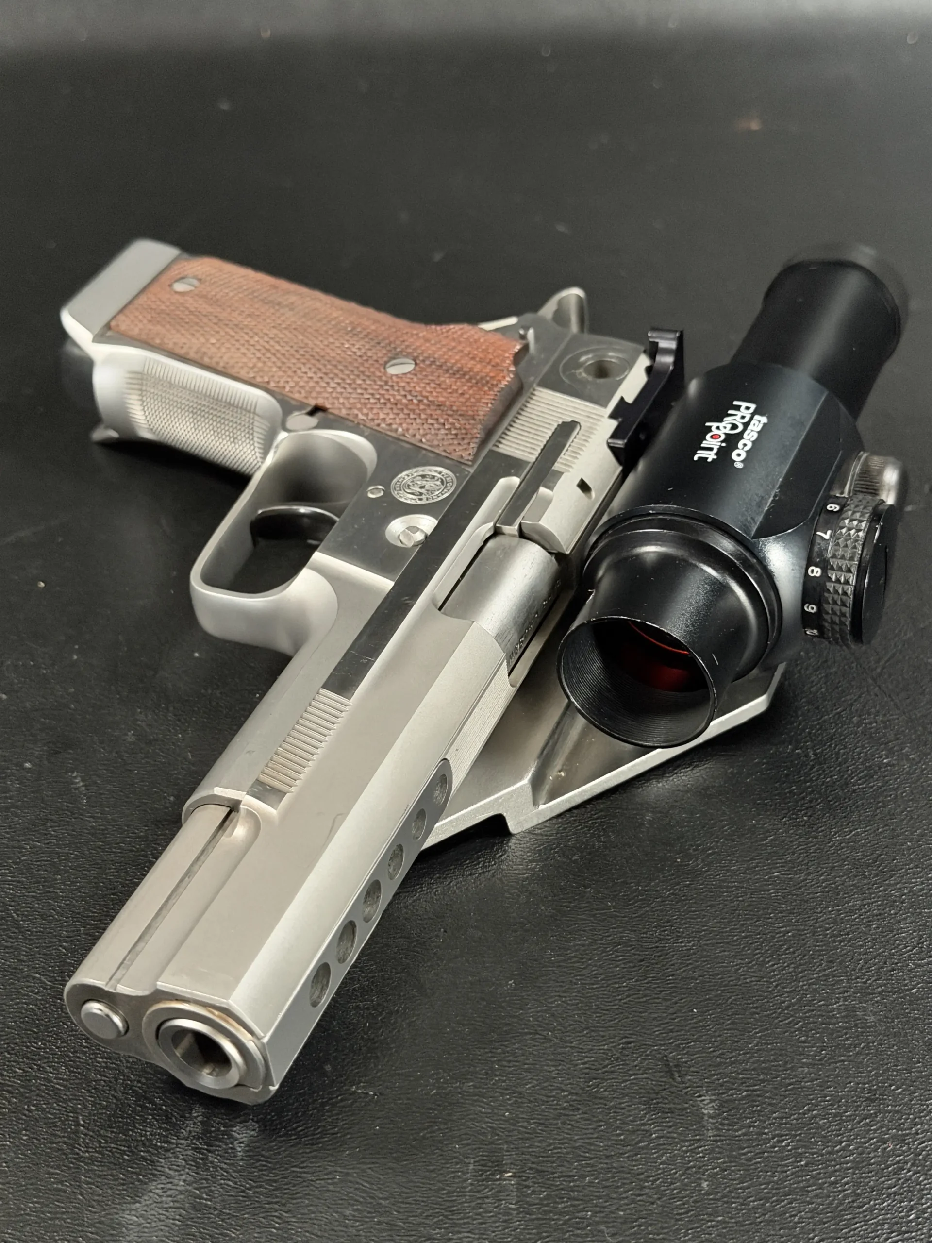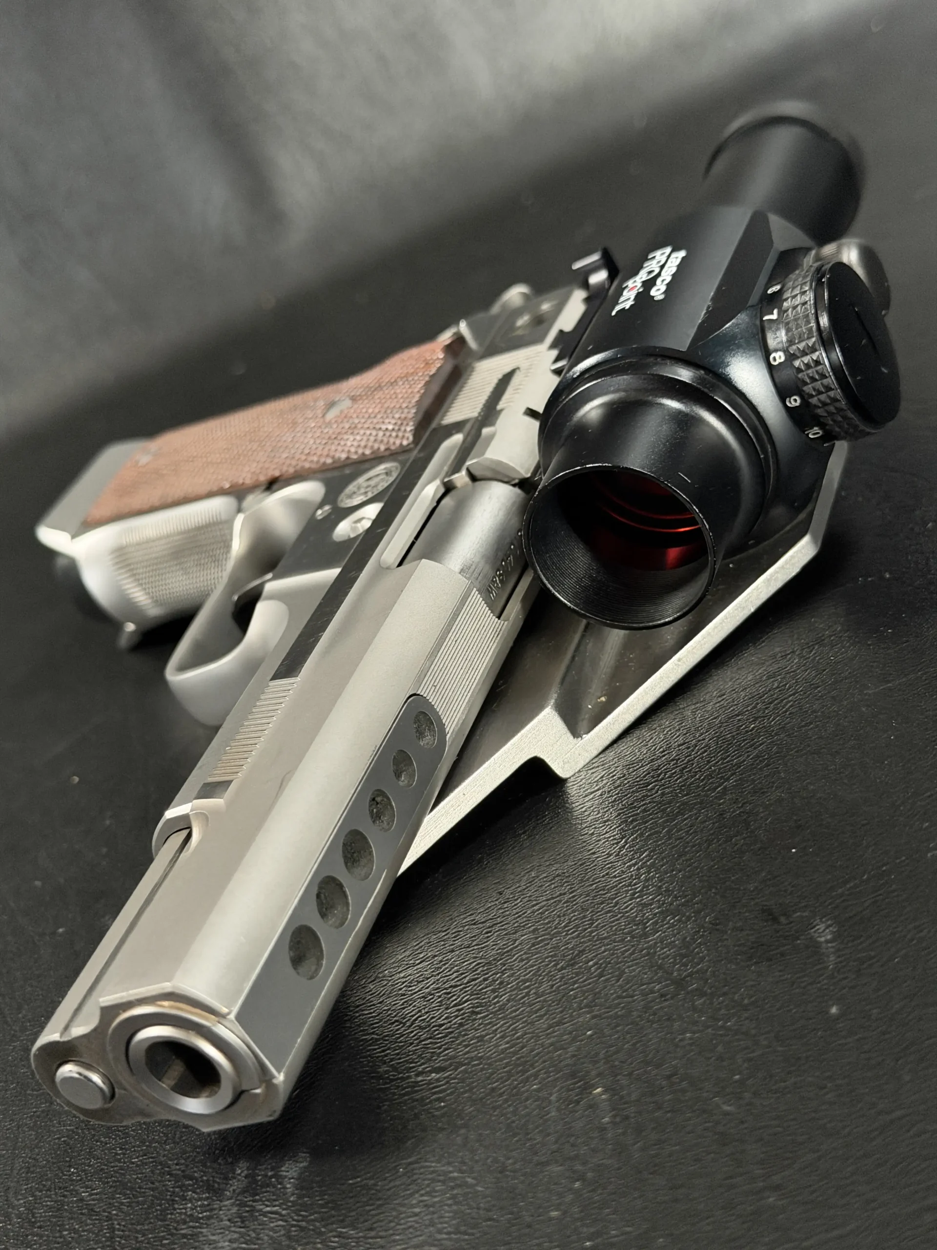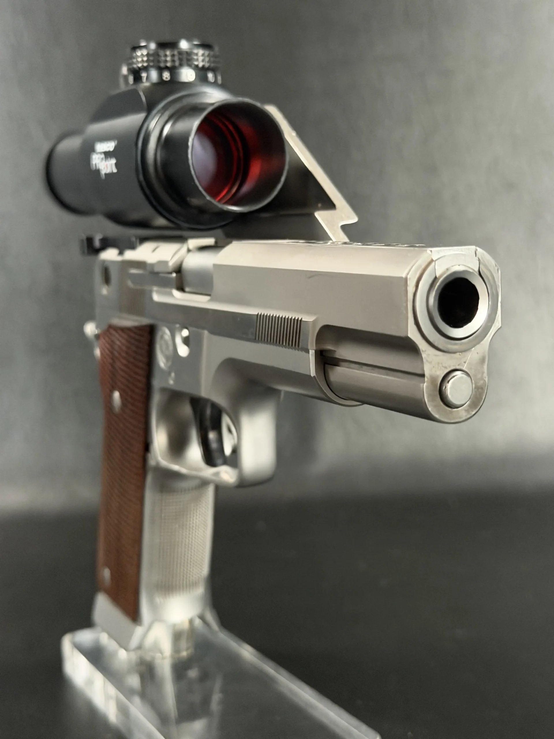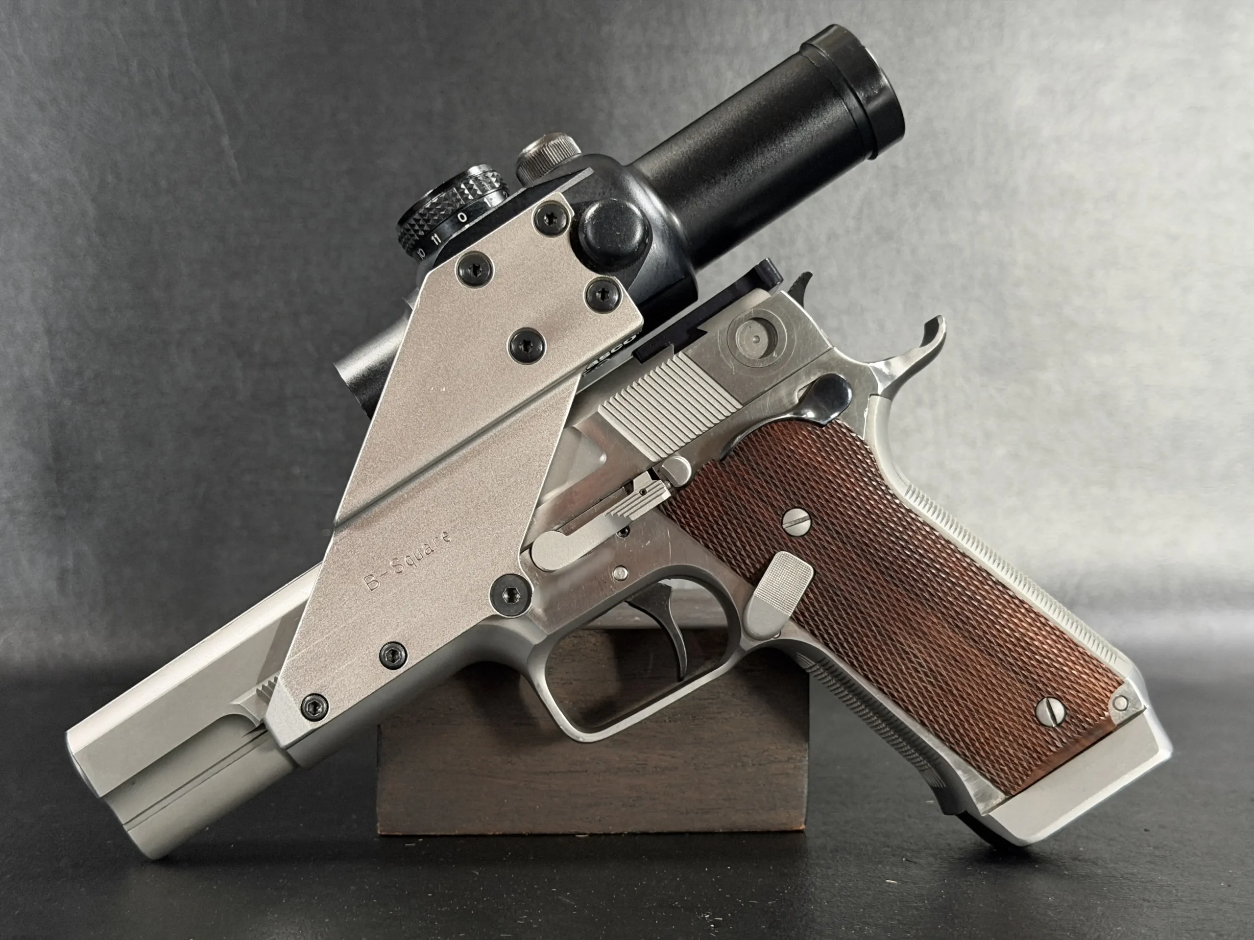 This pistol is equipped with a 5-inch barrel fitted with a Schuemann Hybrid compensator. The slide and frame have a satin stainless finish, and the pistol is also fitted with a B-Square steel mount and a Tasco ProPoint red dot sight, an optic setup characteristic of period competition handguns.