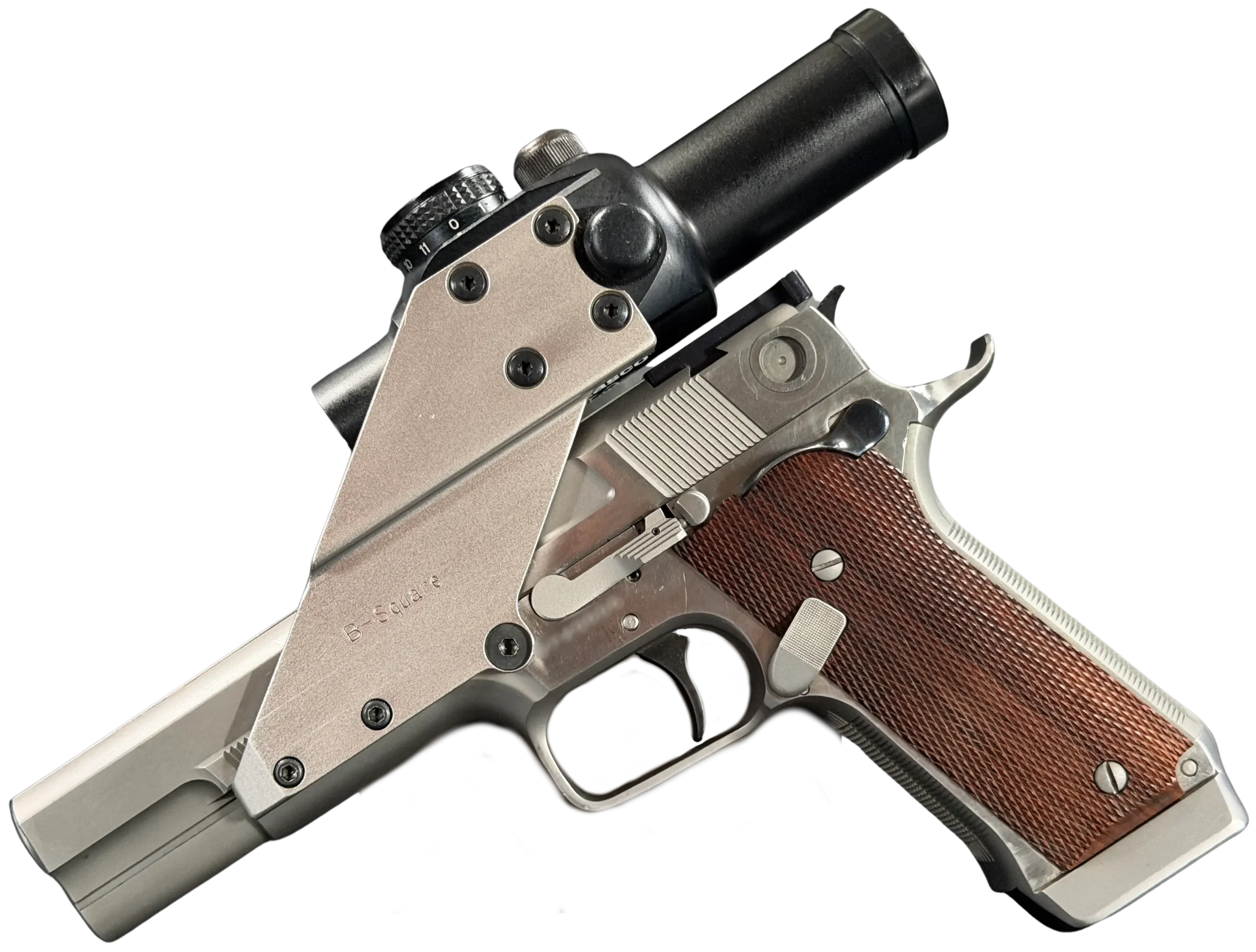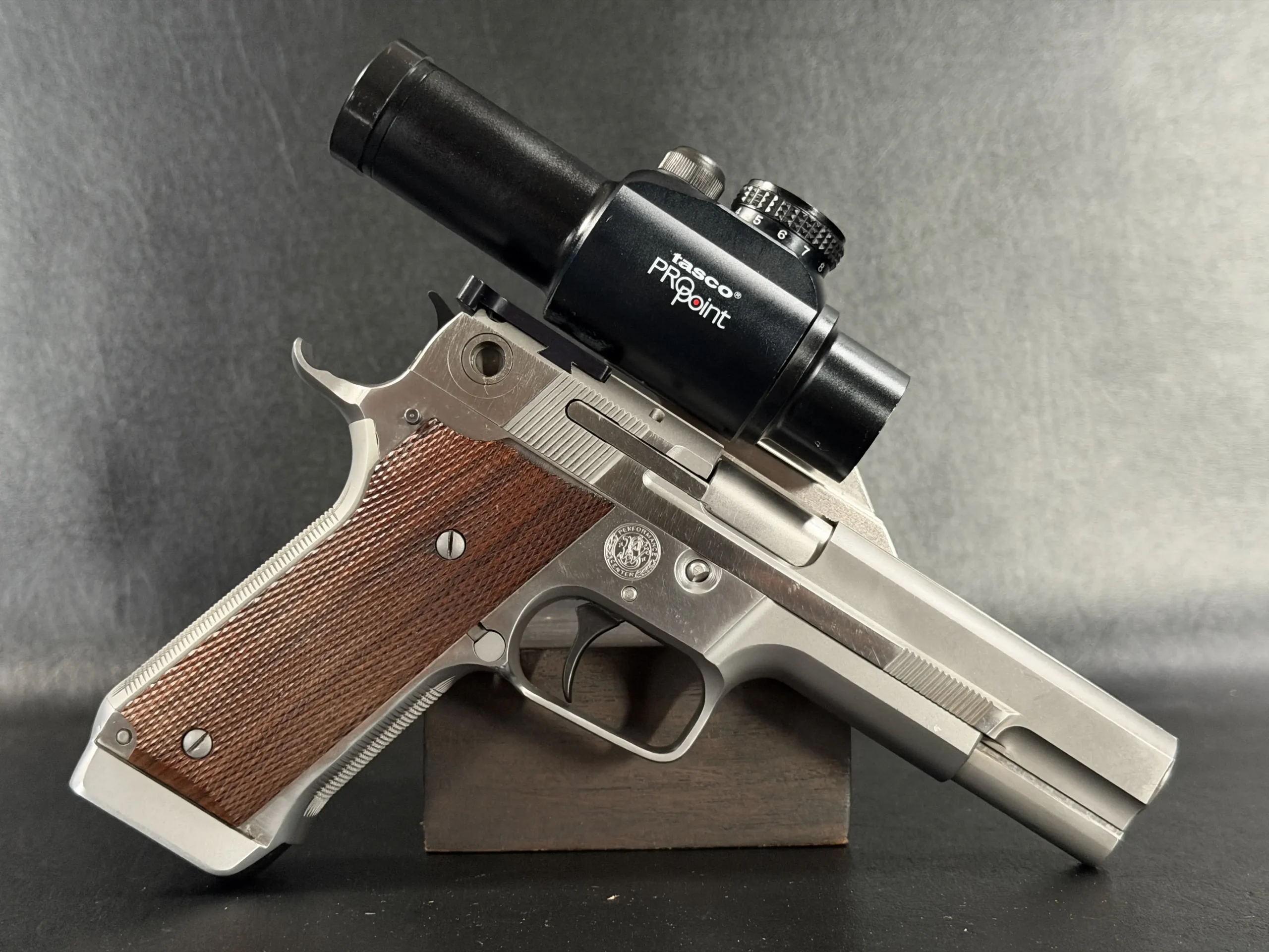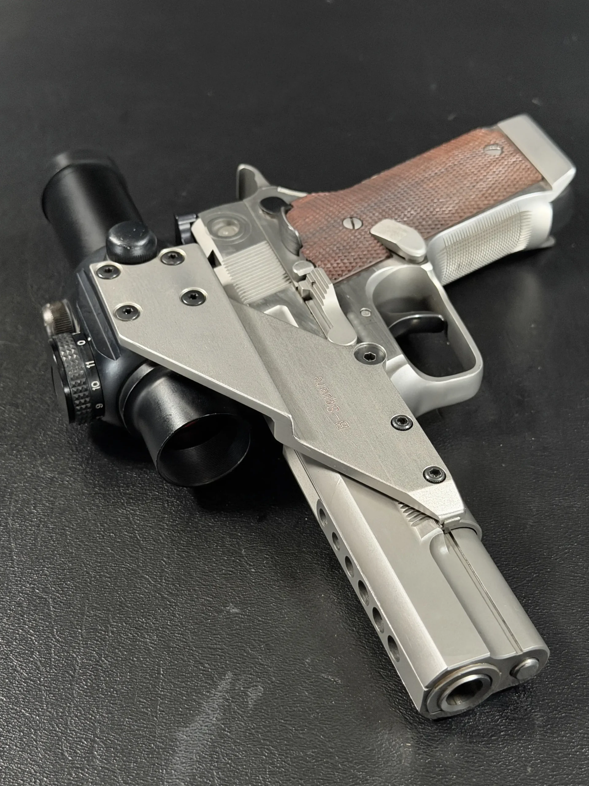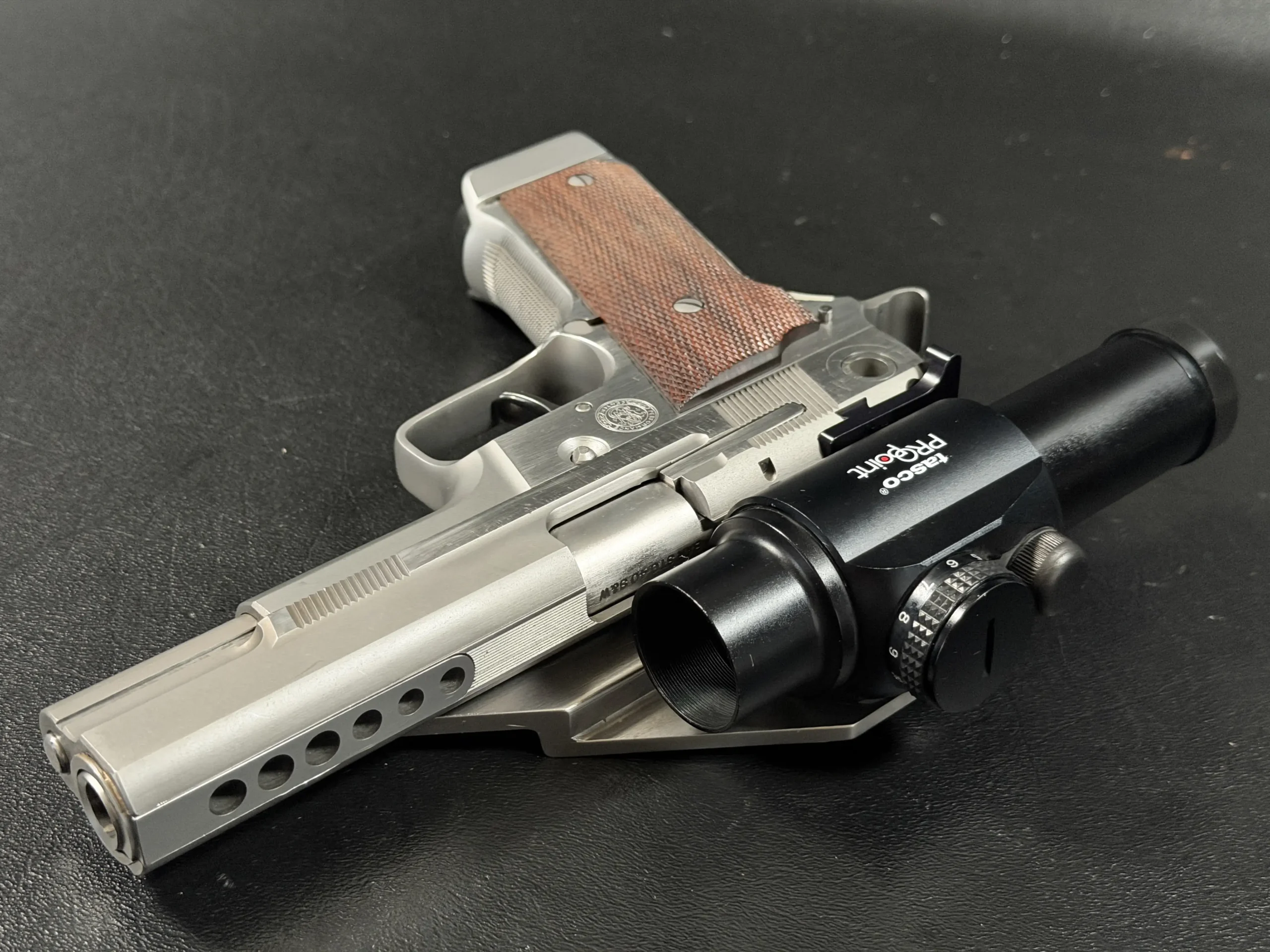 This pistol is equipped with a 5-inch barrel fitted with a Schuemann Hybrid compensator. The slide and frame have a satin stainless finish, and the pistol is also fitted with a B-Square steel mount and a Tasco ProPoint red dot sight, an optic setup characteristic of period competition handguns.
