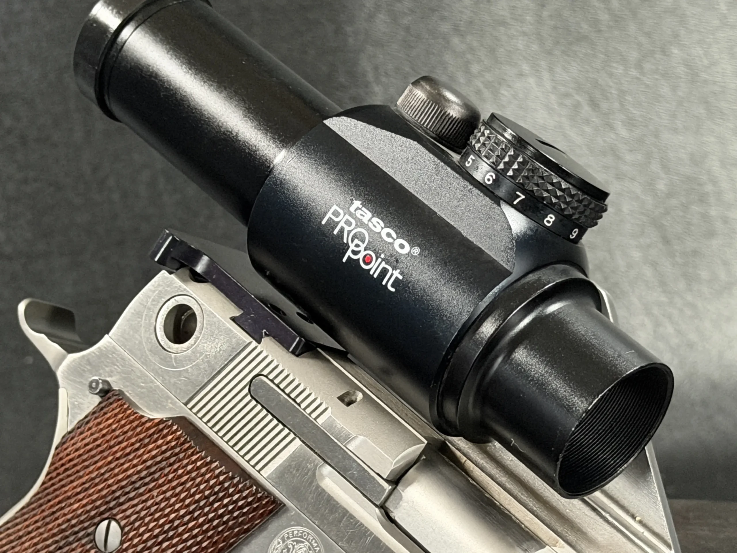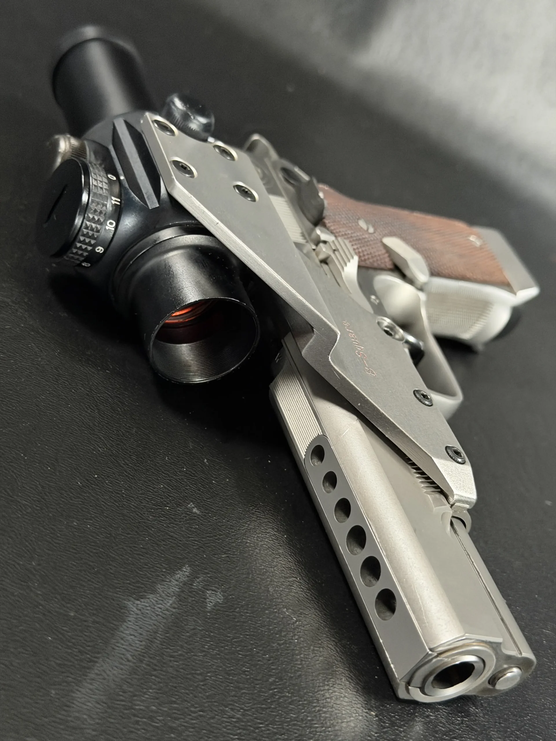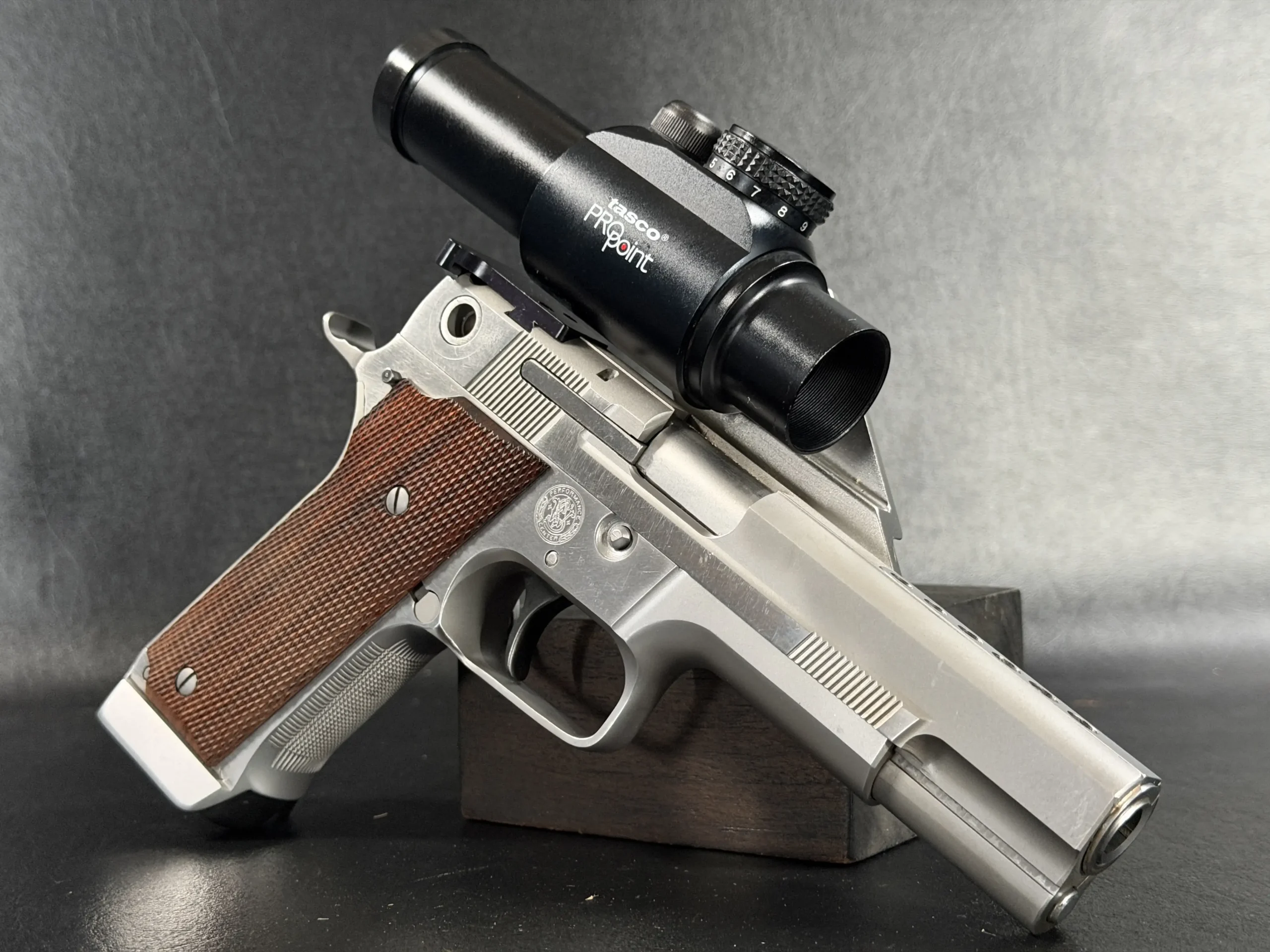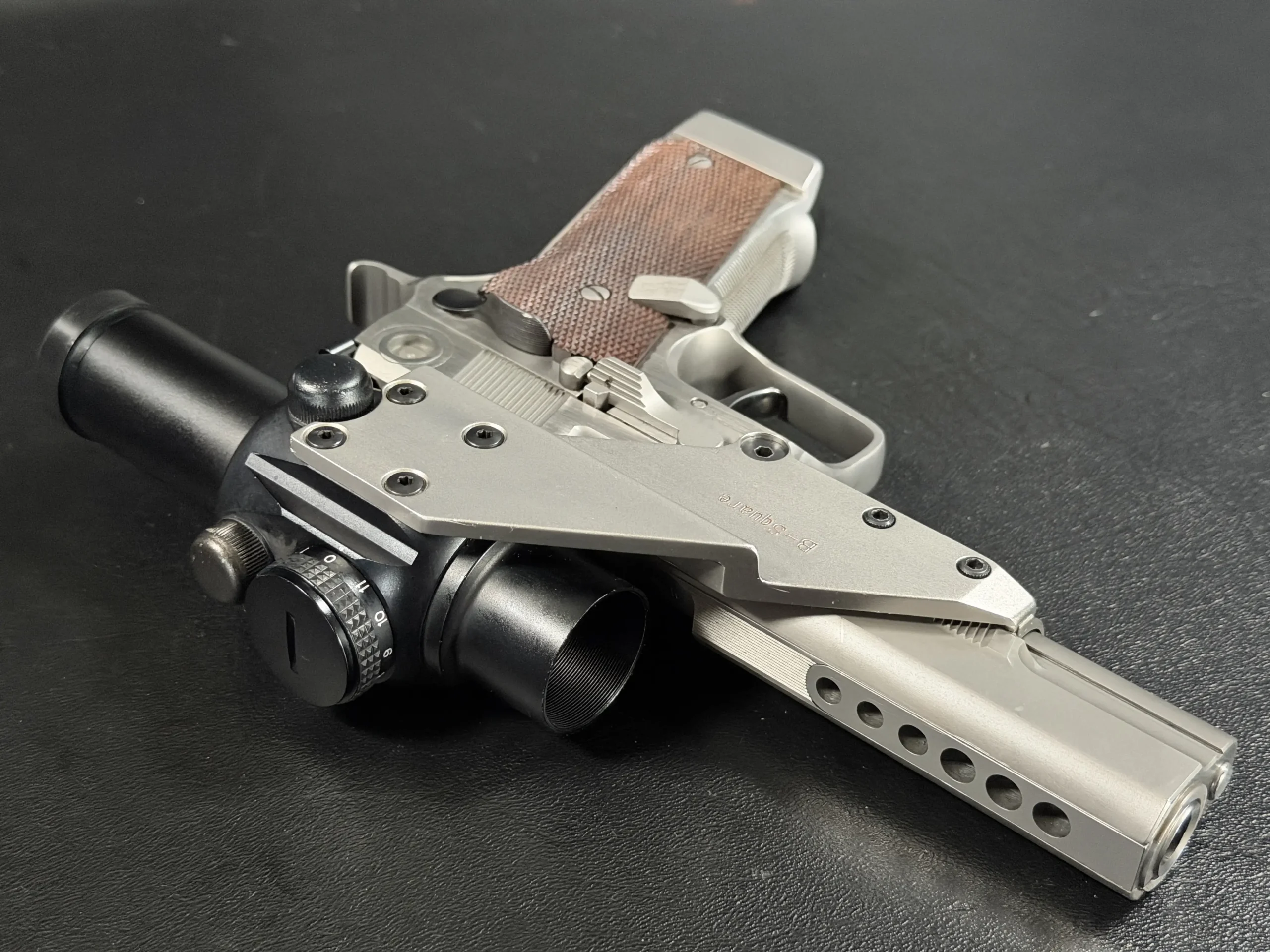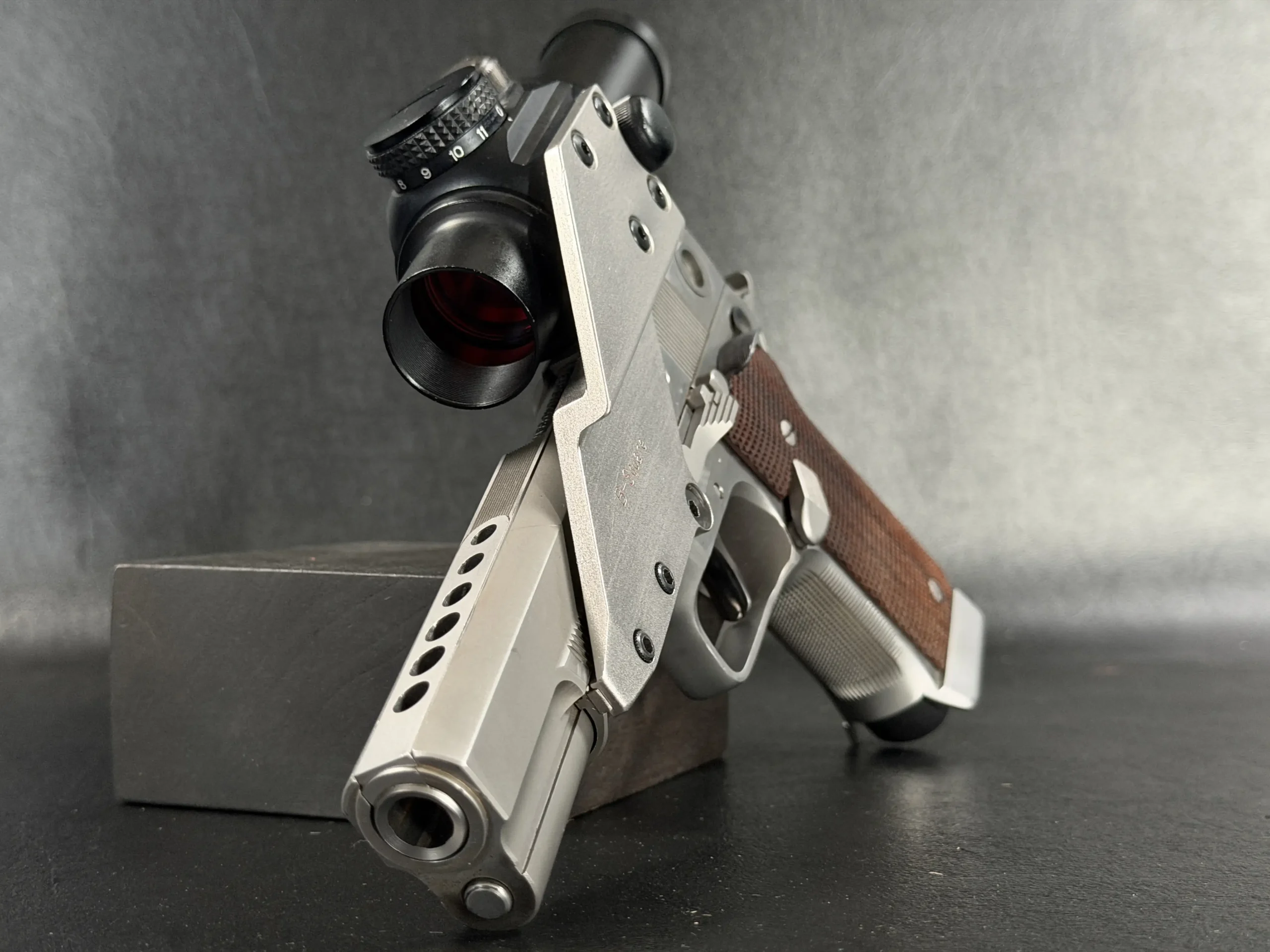 This pistol is equipped with a 5-inch barrel fitted with a Schuemann Hybrid compensator. The slide and frame have a satin stainless finish, and the pistol is also fitted with a B-Square steel mount and a Tasco ProPoint red dot sight, an optic setup characteristic of period competition handguns.