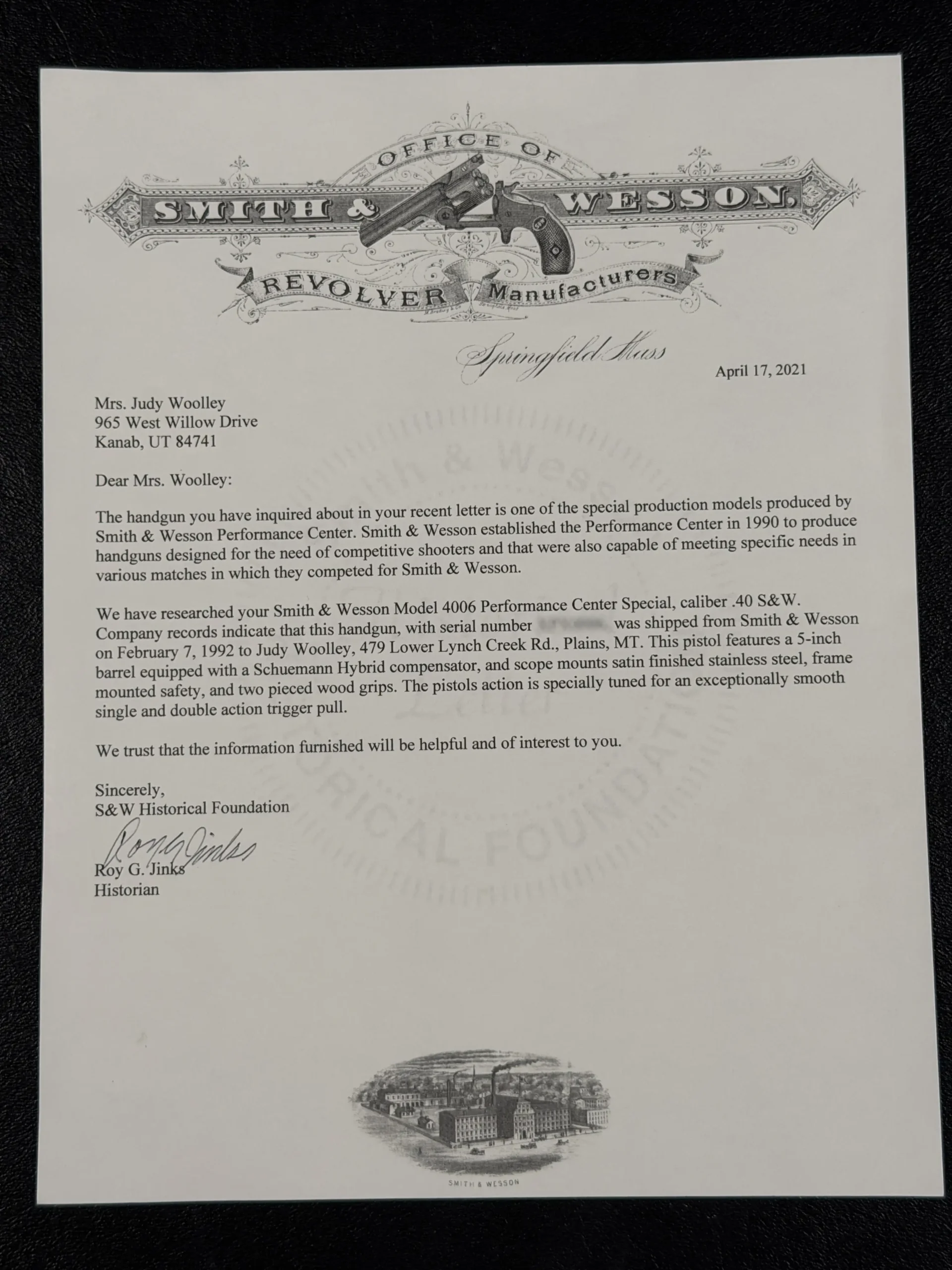 Factory historical documentation from the Smith & Wesson Historical Foundation states that the pistol was shipped directly to Judy Woolley on February 7, 1992, as a special Performance Center production model. Its configuration was tailored for Steel Challenge competition, with a focus on fast handling and competition-oriented features.