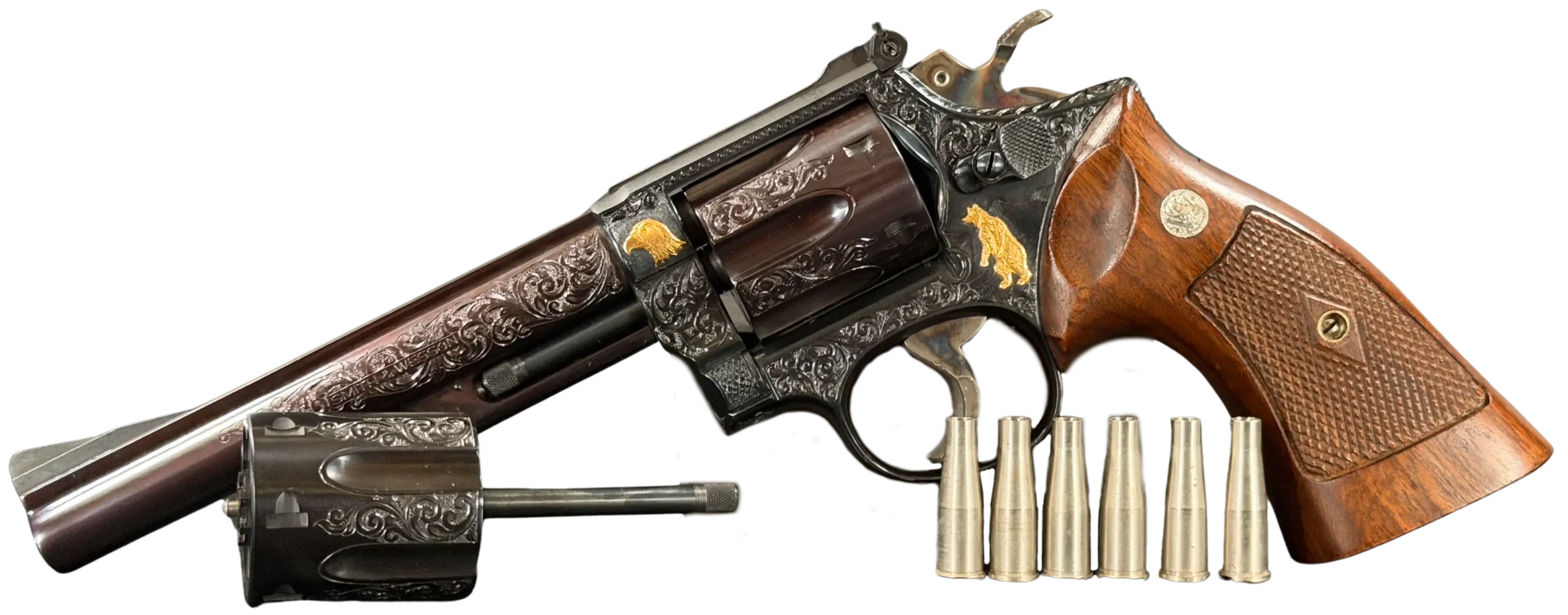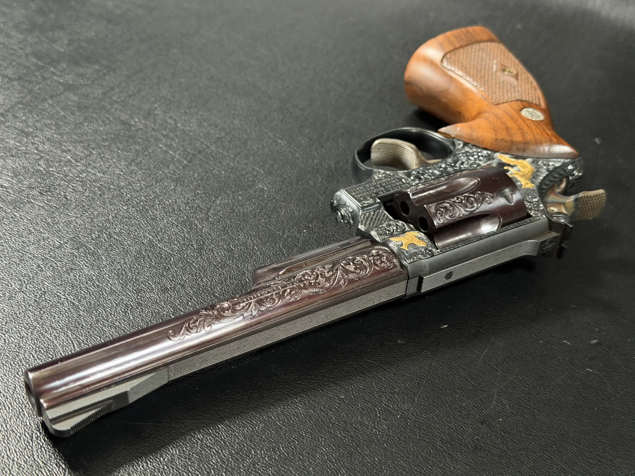 The Tuscano Engraved Smith & Wesson Model 53 brings together the distinctive engineering of this Smith & Wesson revolver with detailed decorative work that gives it a strong visual presence.