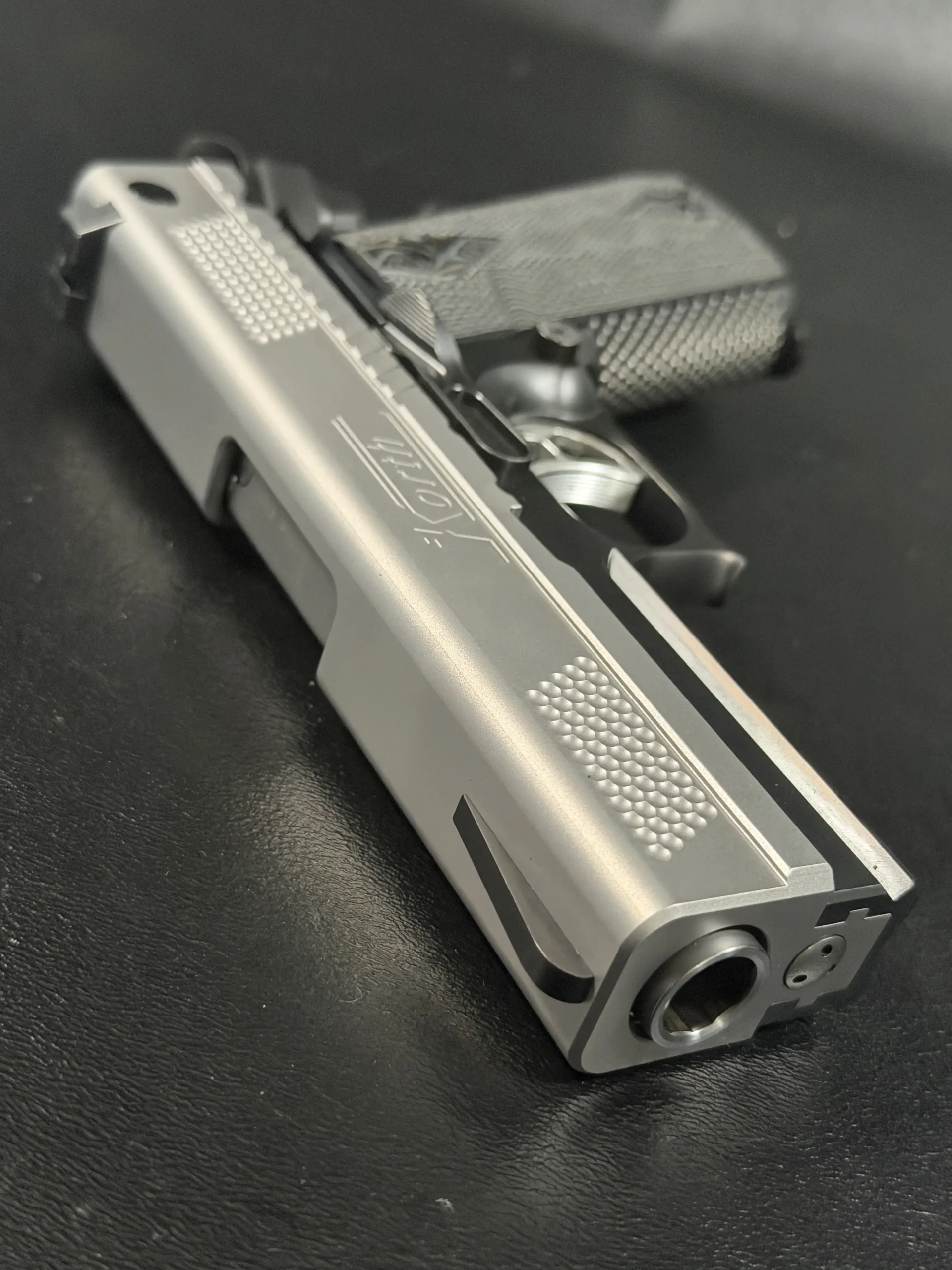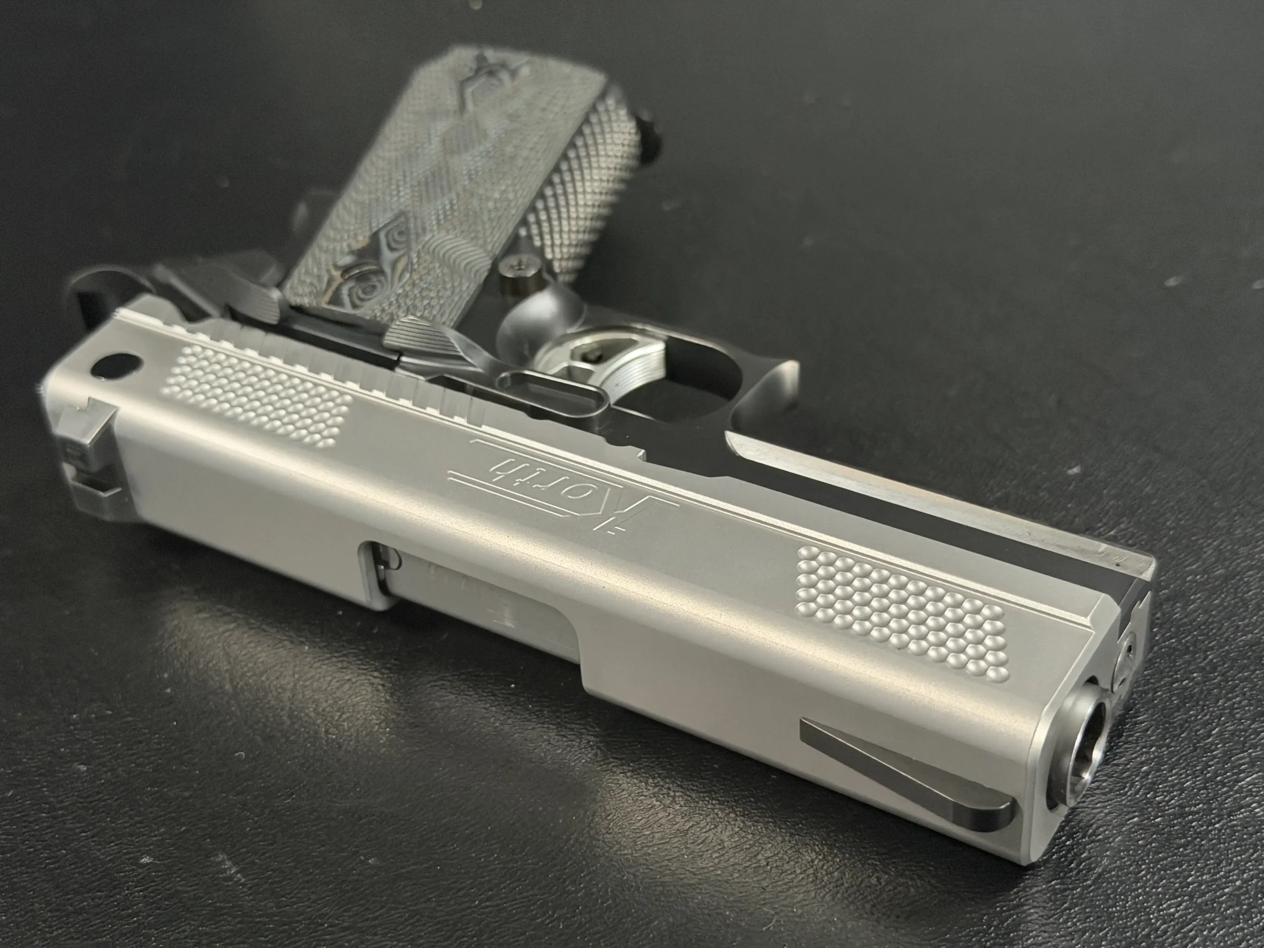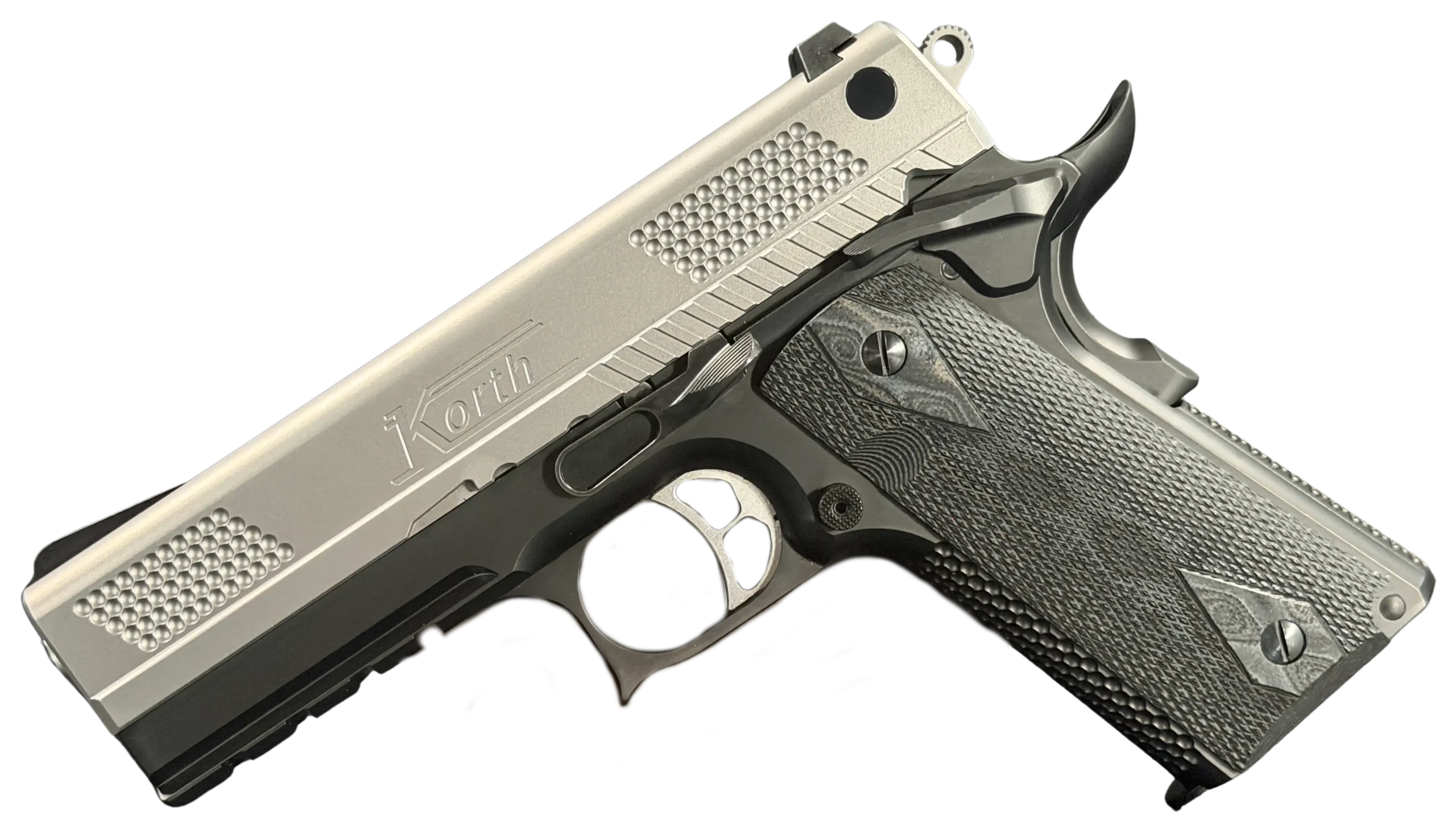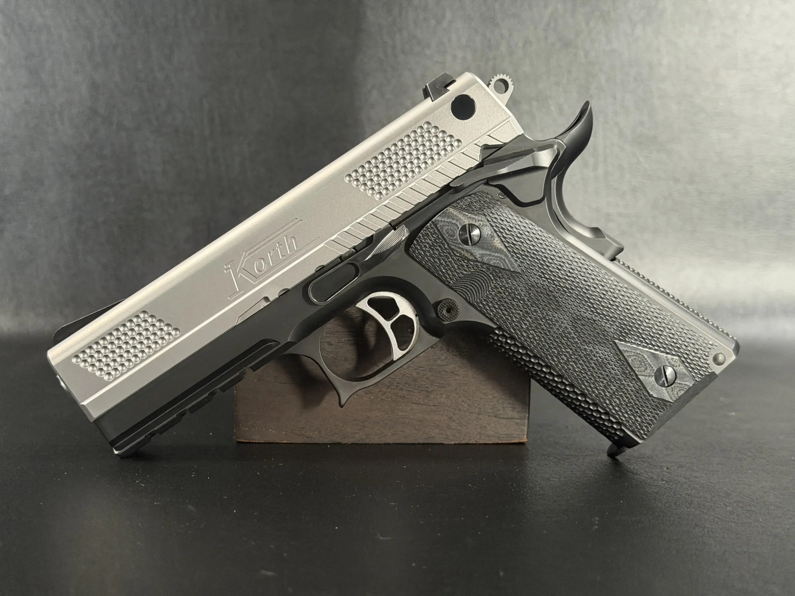 The Korth PRS 4" in .45 ACP brings German engineering to the classic 1911 platform in a refined two-tone configuration. This example pairs a matte stainless steel upper with a contrasting black finished frame and controls, creating a clean, modern look that still feels timeless.