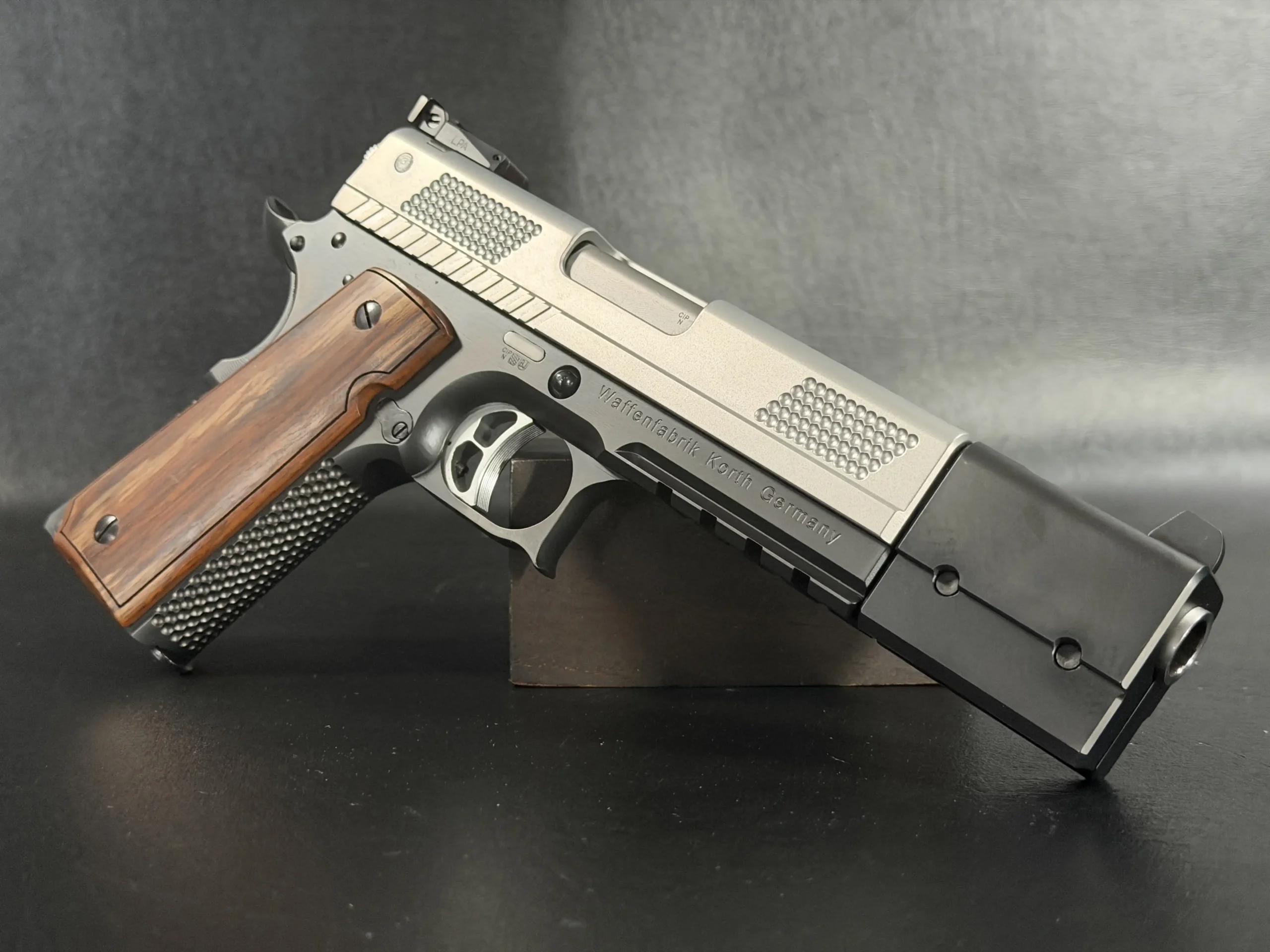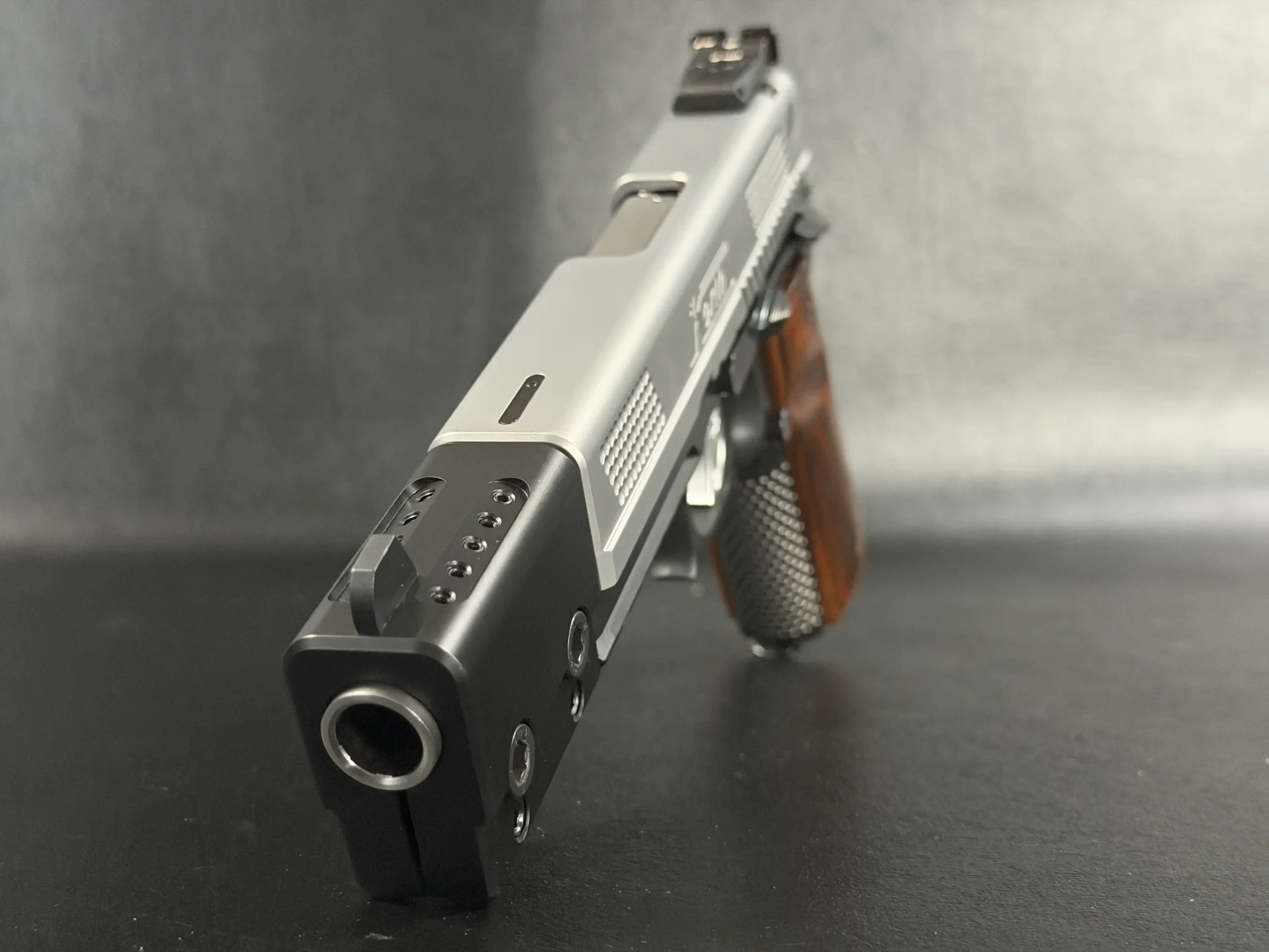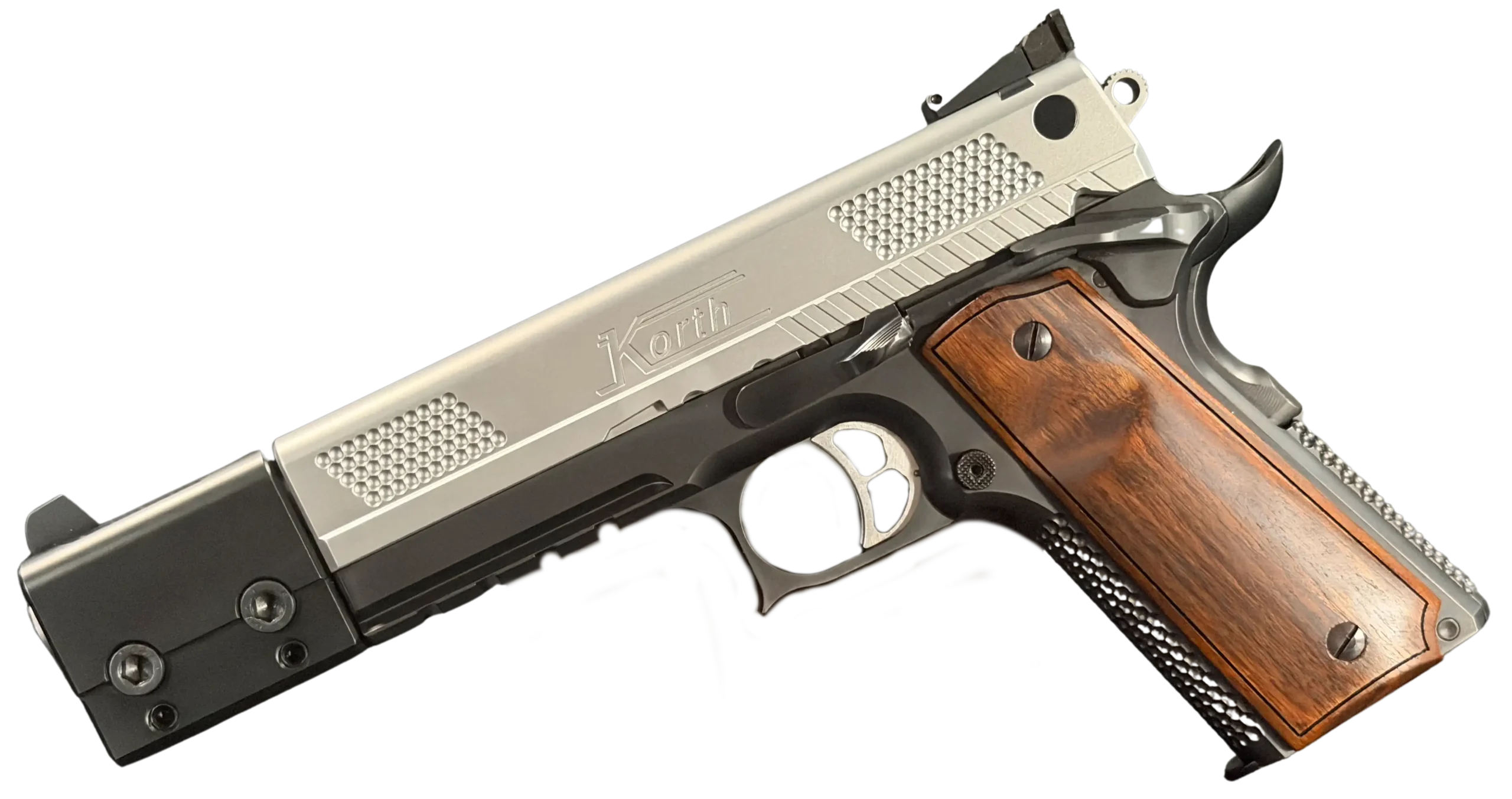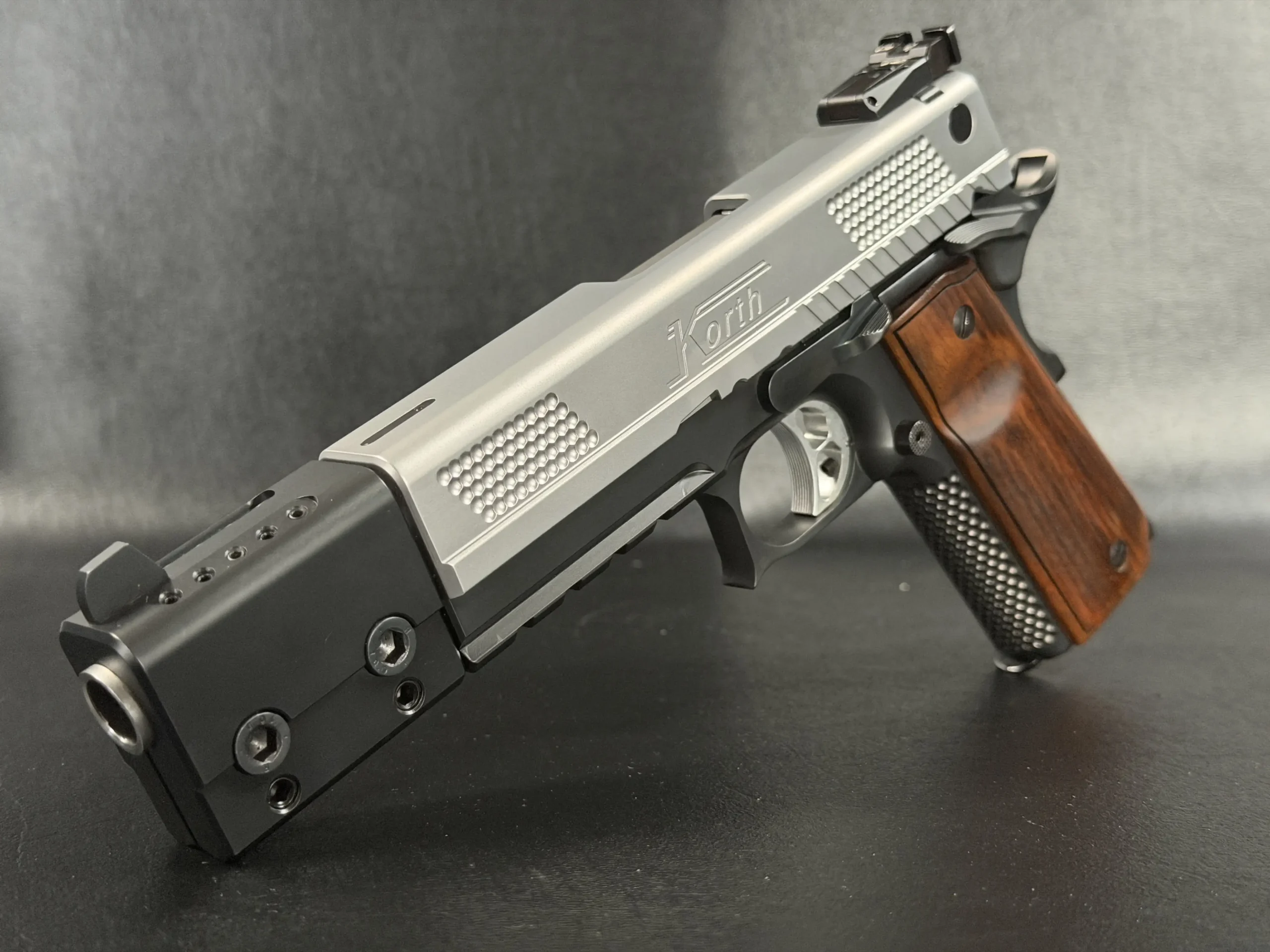 Korth’s machined slide texturing at the front and rear adds visual definition and subtle tactile reference points. At the muzzle, the 6-inch setup is complemented by a precision compensator system that continues the two-tone theme and integrates cleanly into the slide profile.