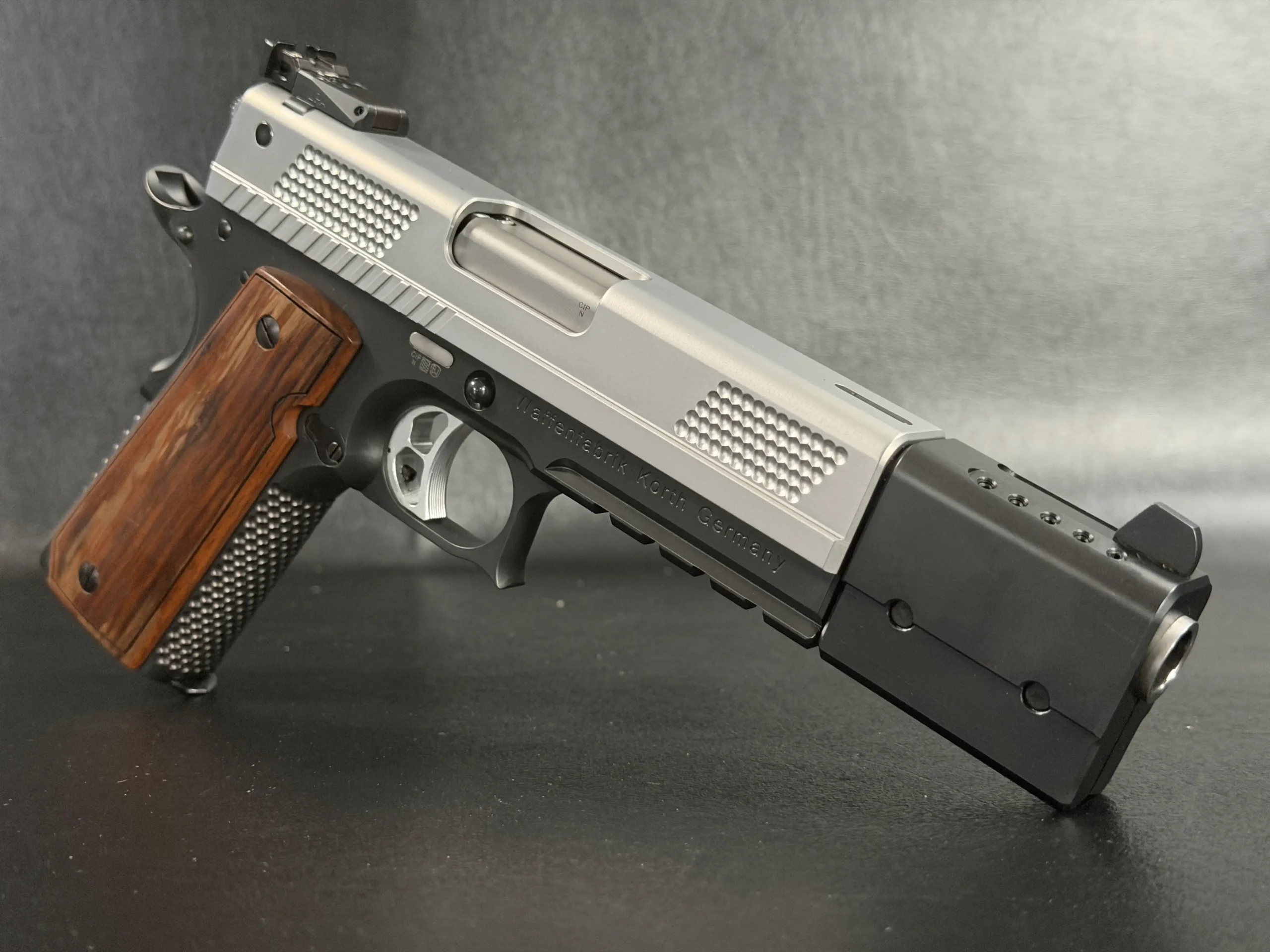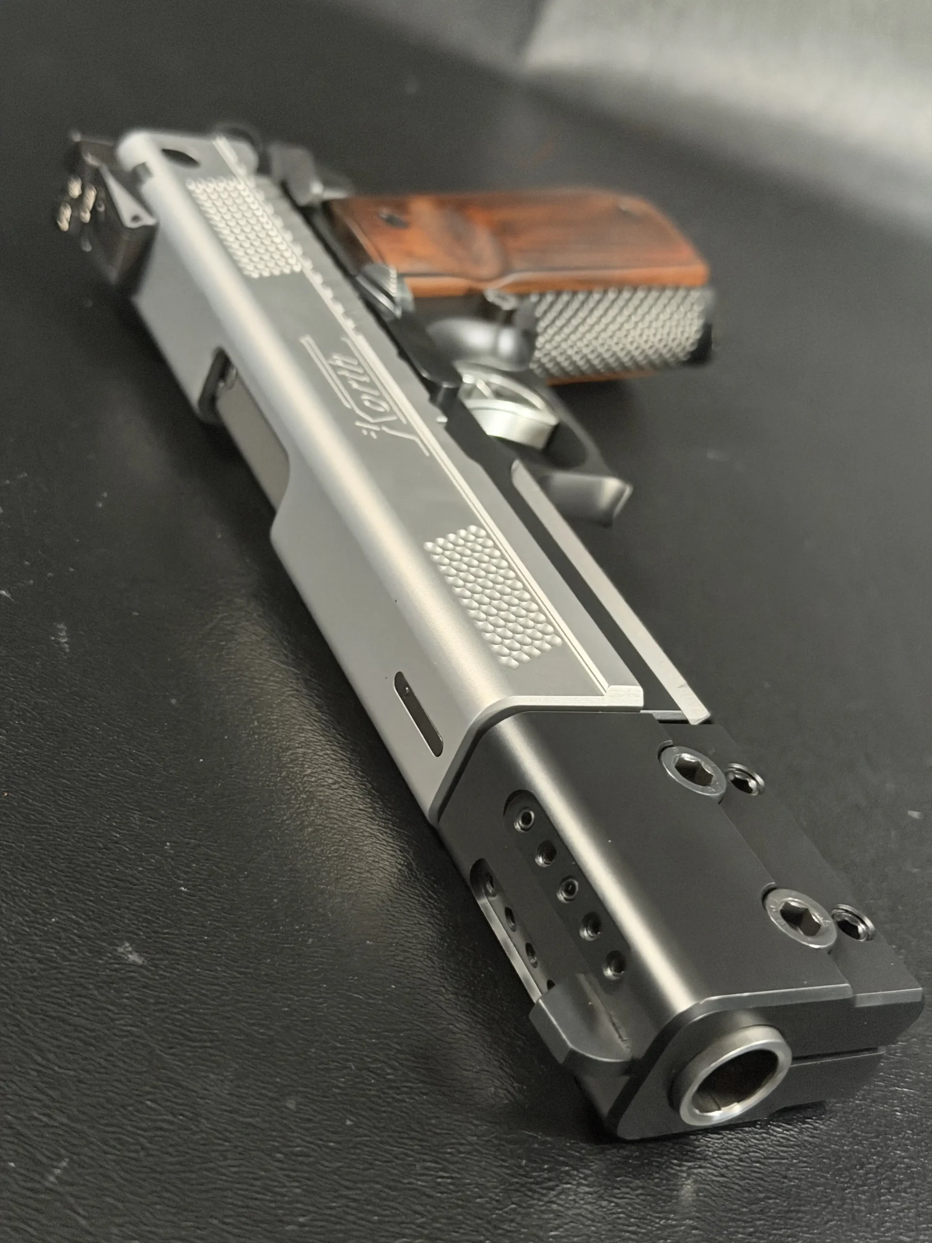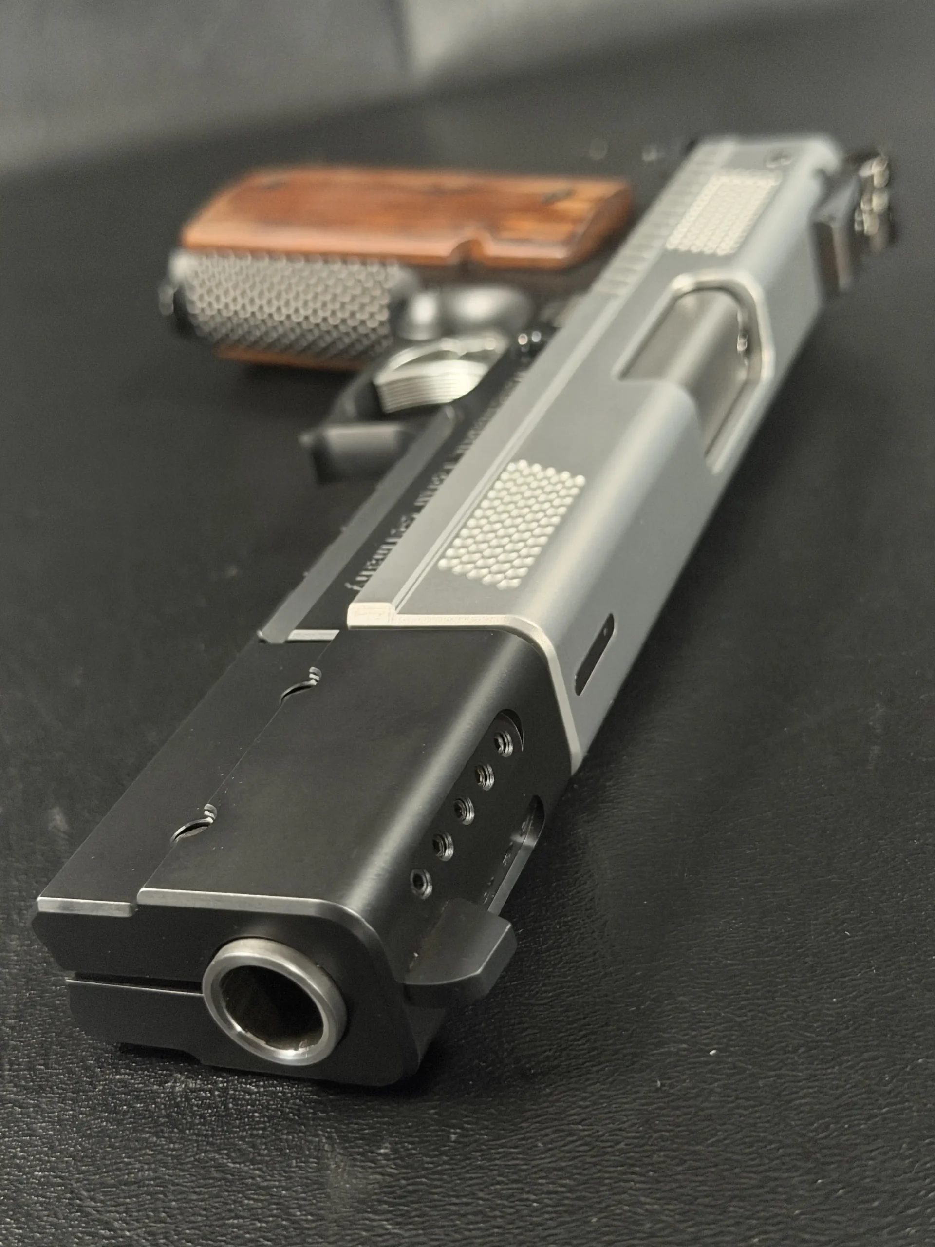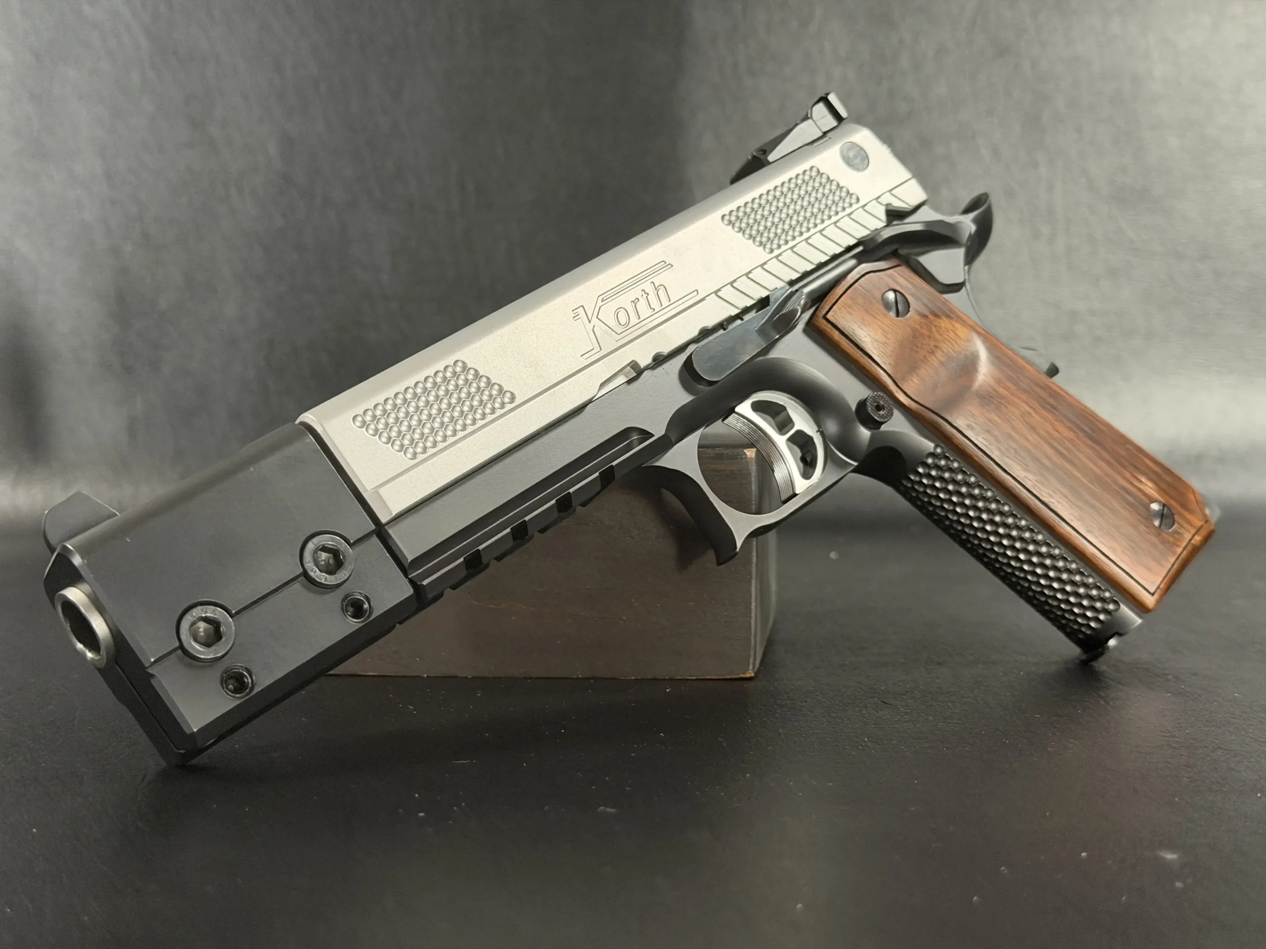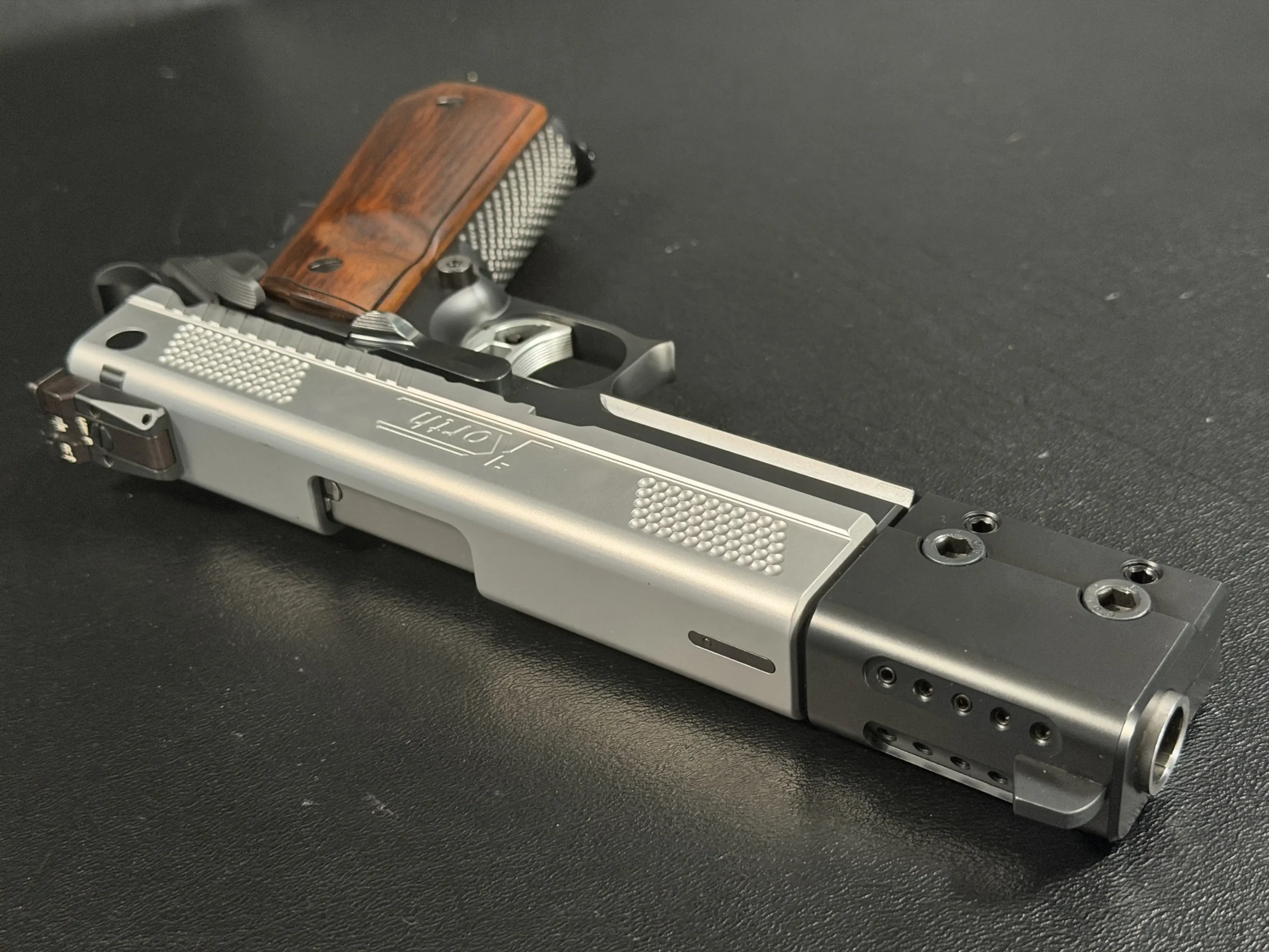 Korth’s machined slide texturing at the front and rear adds visual definition and subtle tactile reference points. At the muzzle, the 6-inch setup is complemented by a precision compensator system that continues the two-tone theme and integrates cleanly into the slide profile.