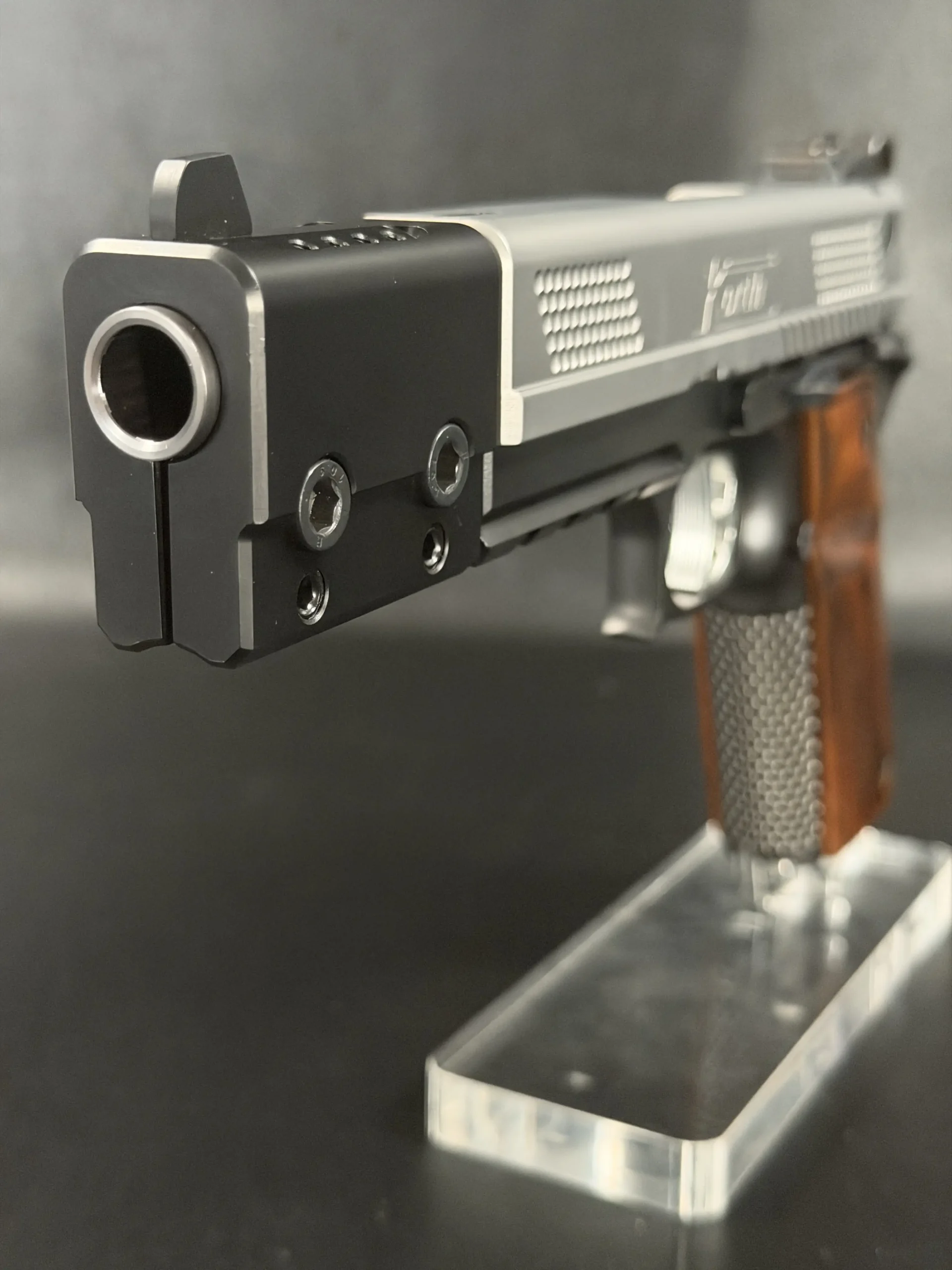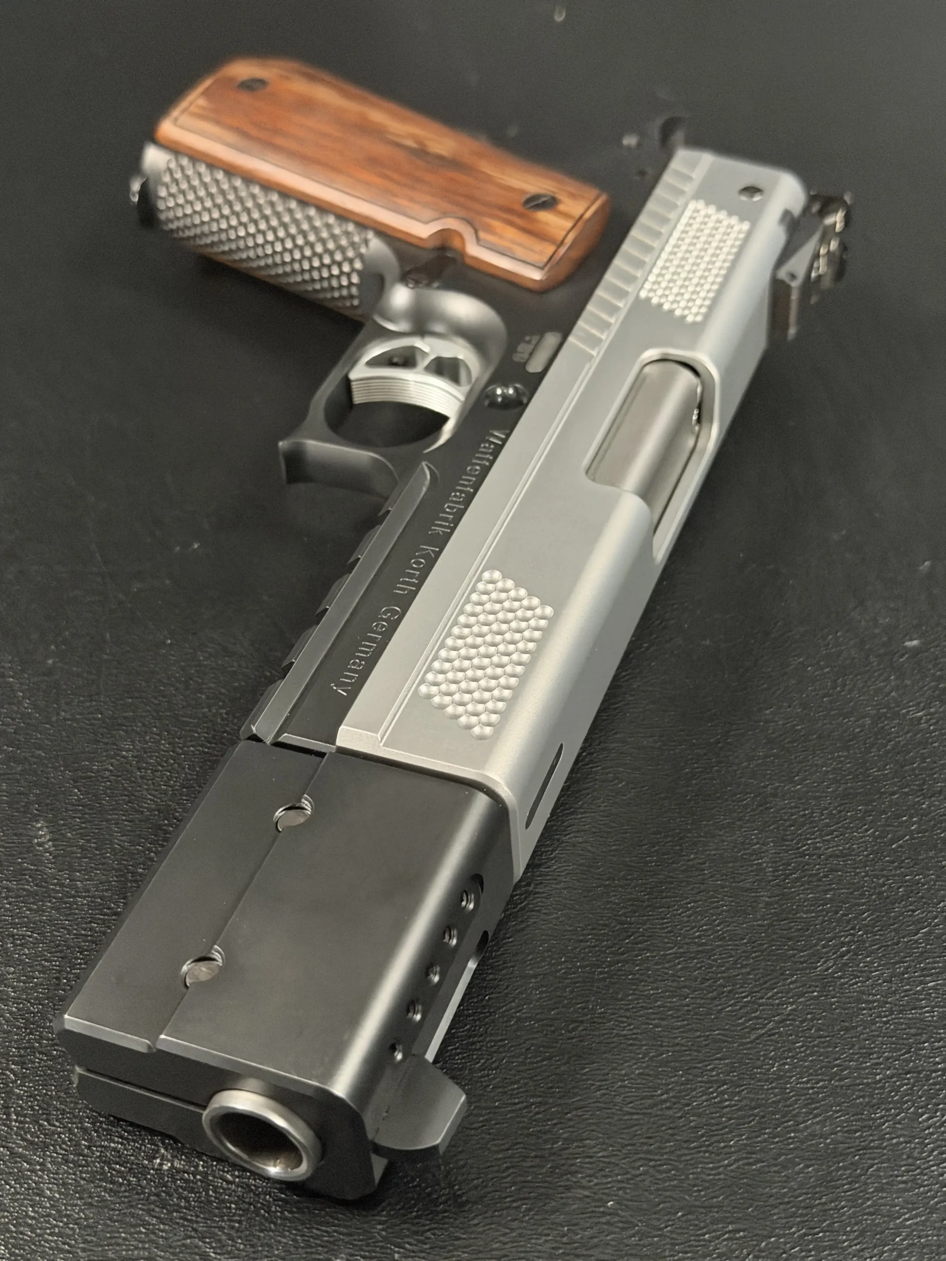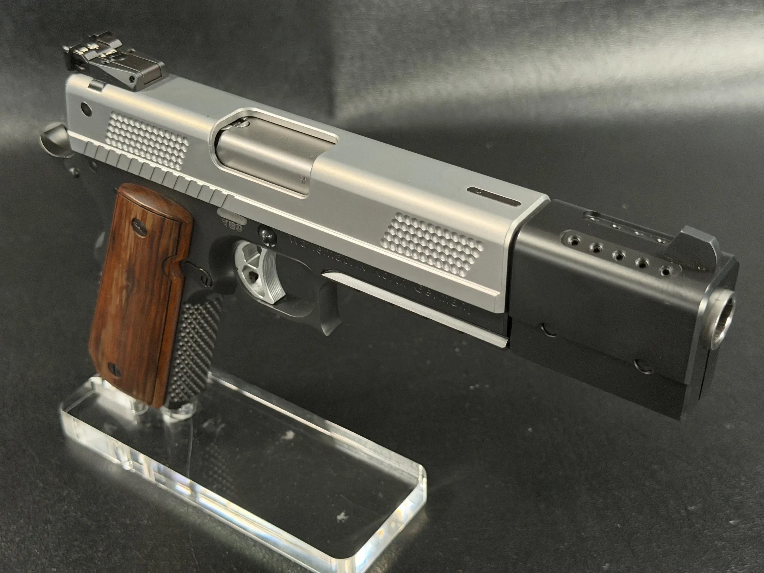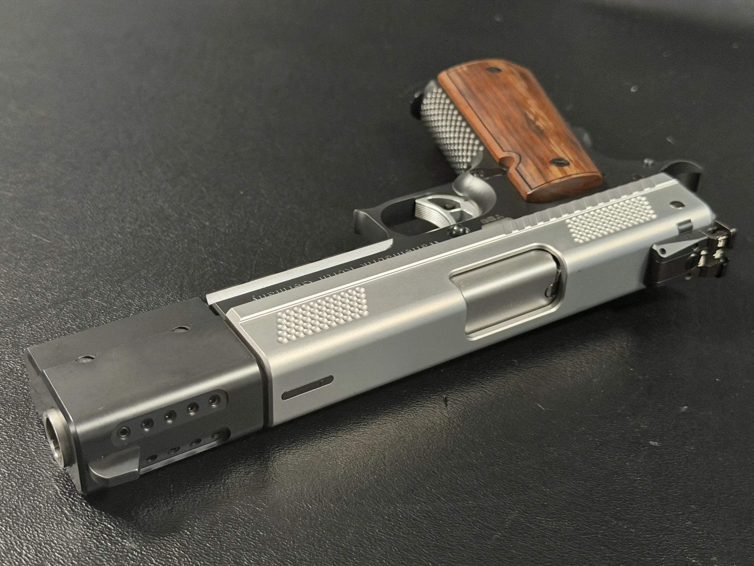 Korth’s machined slide texturing at the front and rear adds visual definition and subtle tactile reference points. At the muzzle, the 6-inch setup is complemented by a precision compensator system that continues the two-tone theme and integrates cleanly into the slide profile.