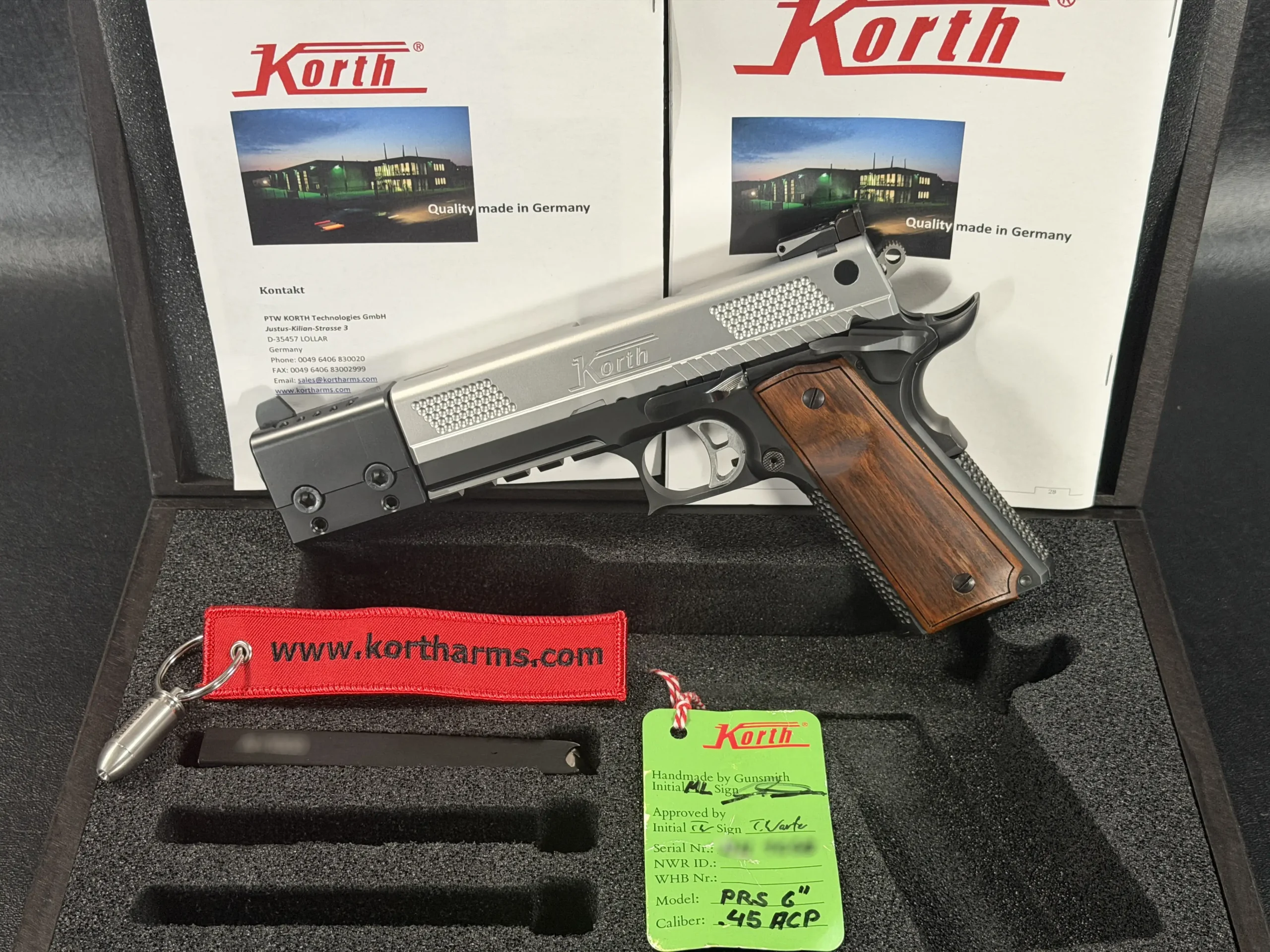 A two-tone Korth PRS 6″ chambered in .45 ACP, featuring a satin stainless upper, black finished frame, and integrated compensator system. Checkered frame surfaces, hand-fitted walnut grips, and a skeletonized trigger complete this polished long-slide presentation.