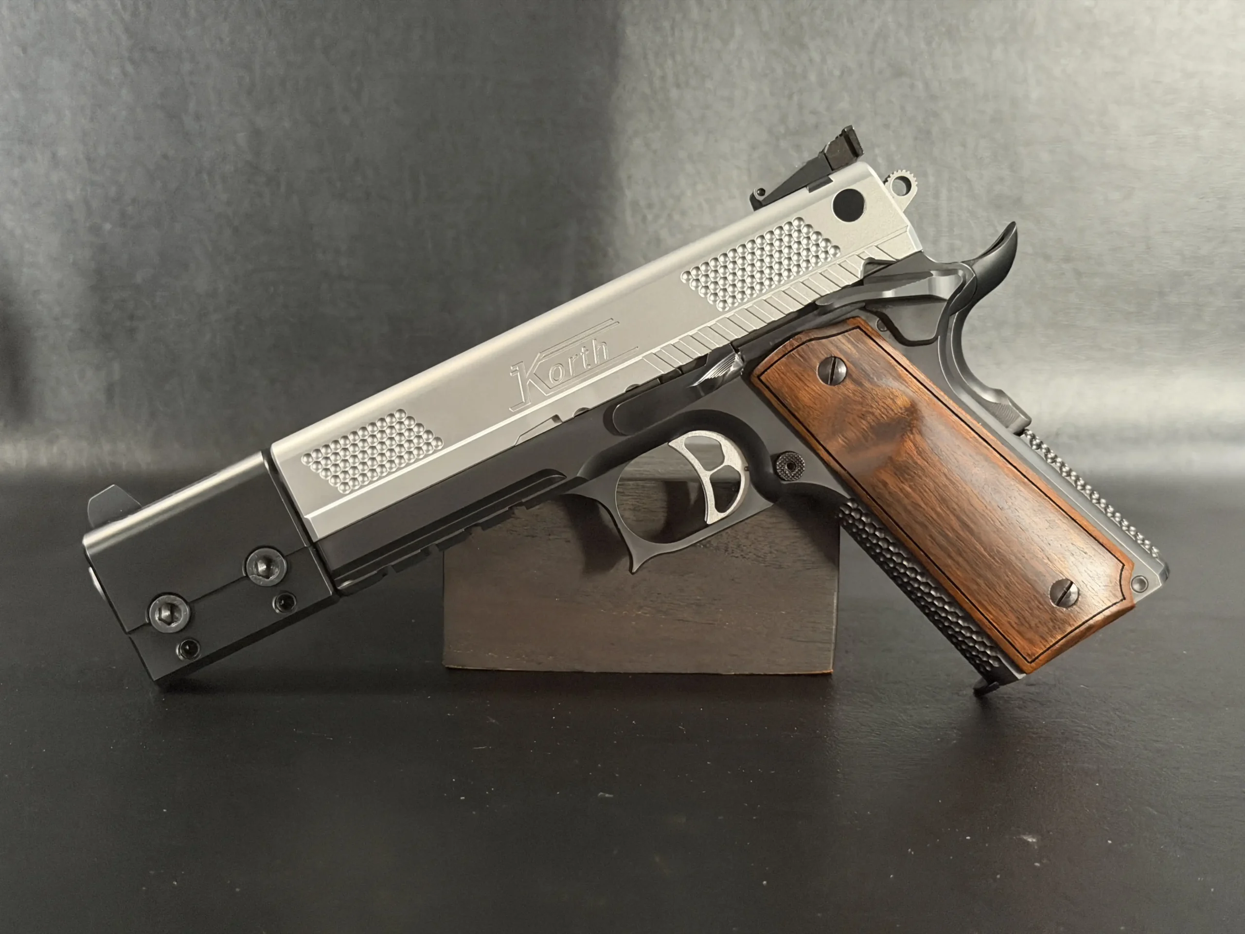 The Two Tone Korth PRS 6″ .45 ACP pairs a satin stainless upper with a black finished frame for a sharp, architectural presentation. Chambered in .45 ACP, this long-slide configuration highlights the PRS platform’s extended sight radius and distinctive structural lines.
